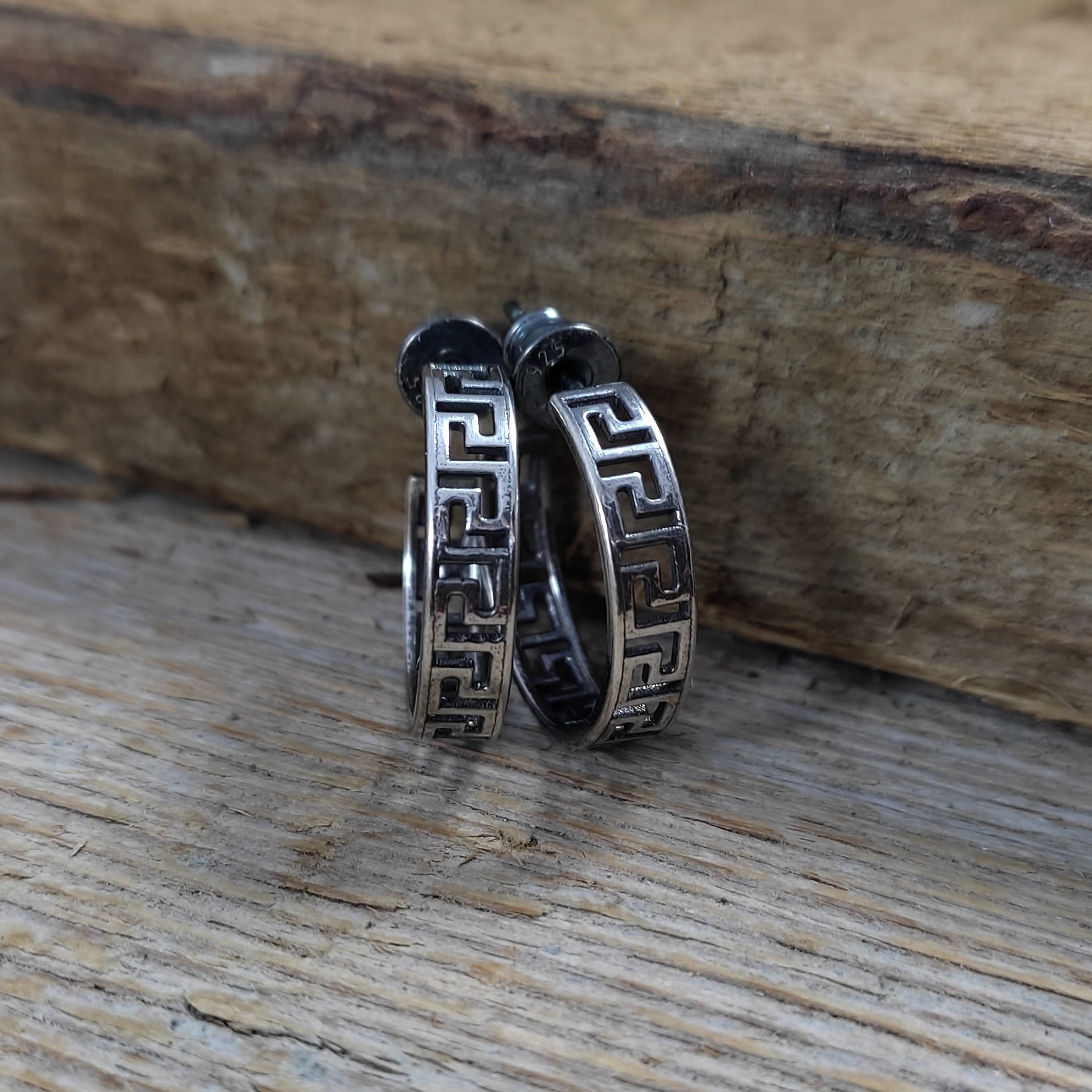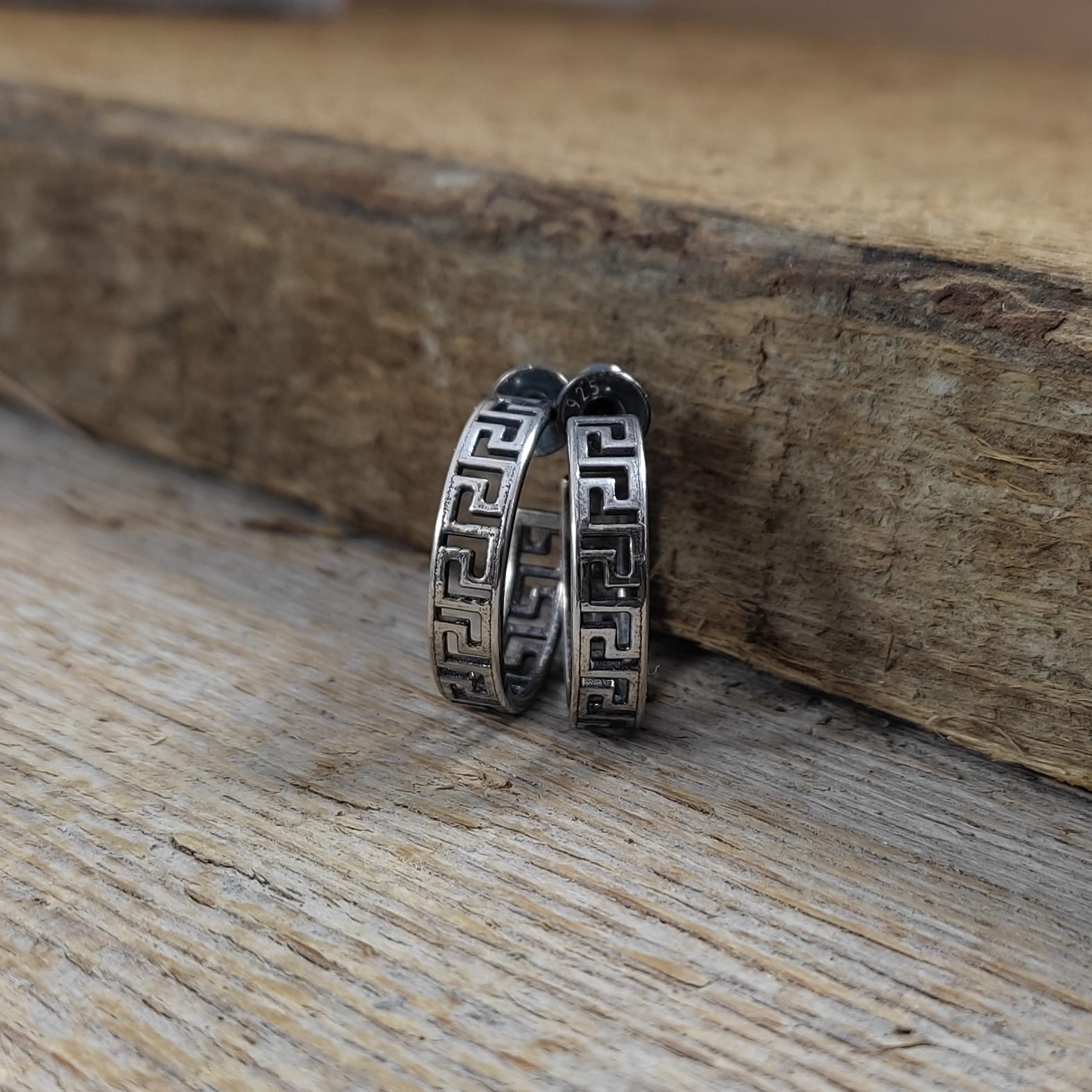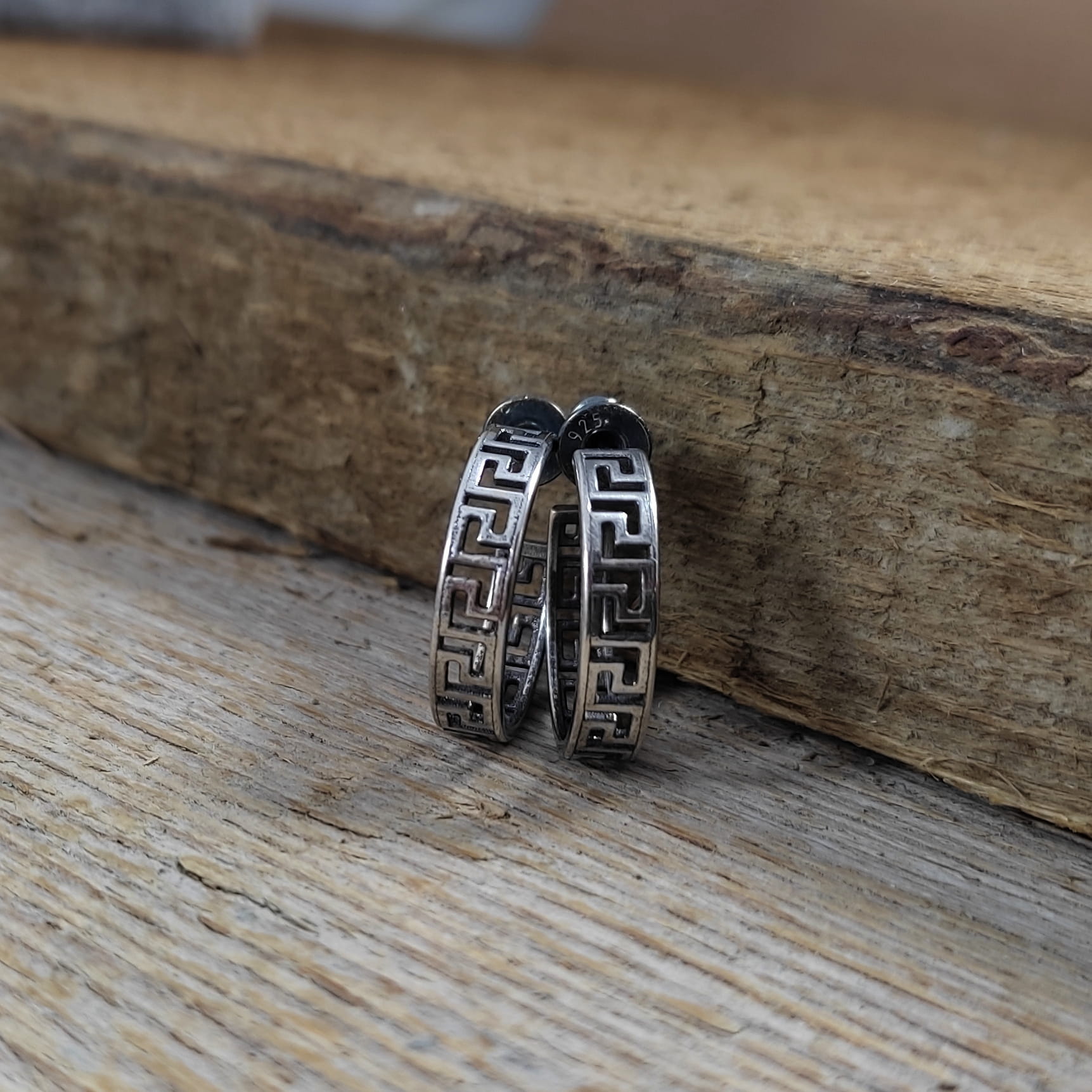 Kolczyki ze ślicznym greckim starożytnym ornamentem. Przywołaj wspomnienia letnich podróży. Mocowanie typu sztyft. Długość całkowita kolczyków wynosi ok. 18 mm. Kolczyki zostały wykonane w całości ze srebra 925, srebro oksydowane. Zapakowane w eleganckie pudełko.
