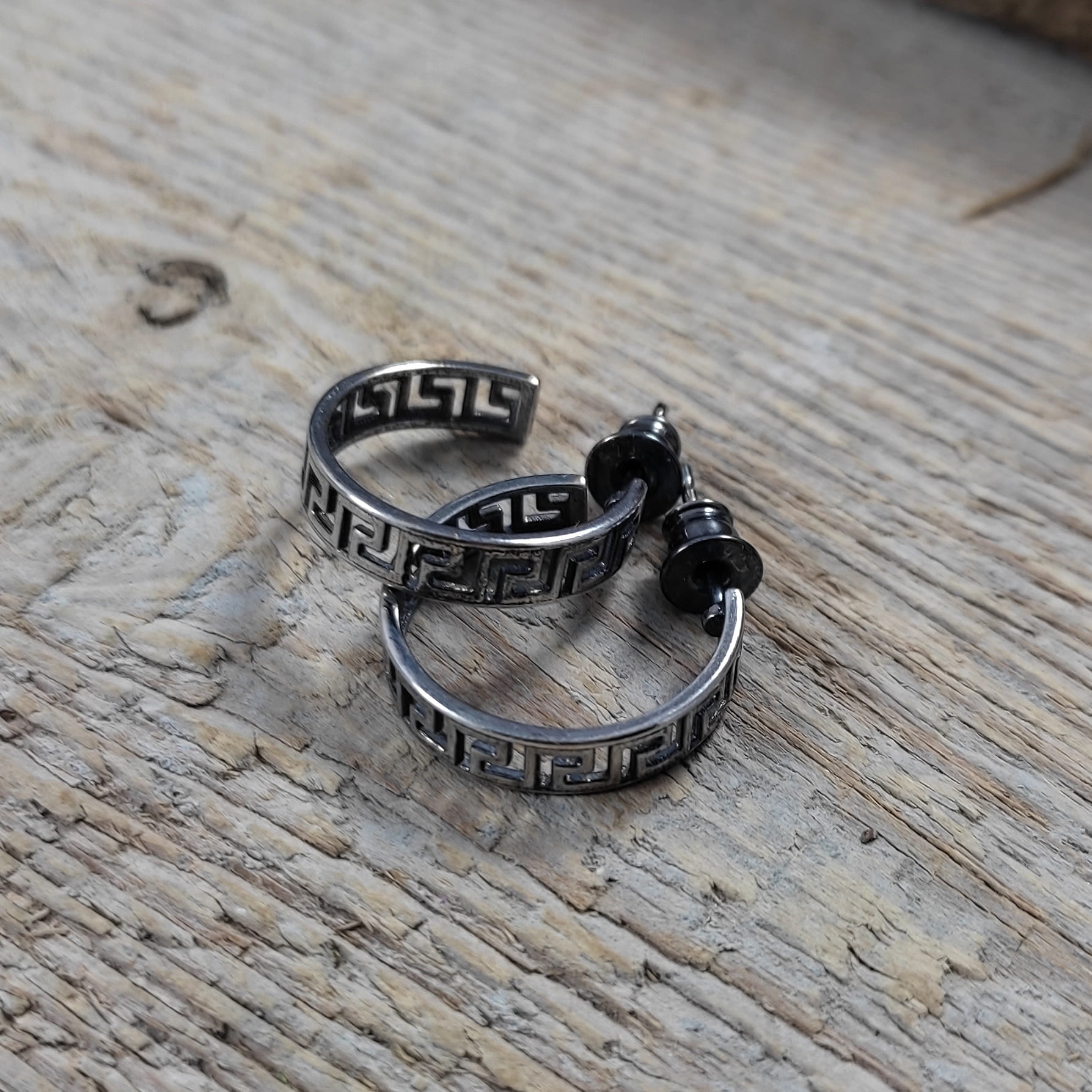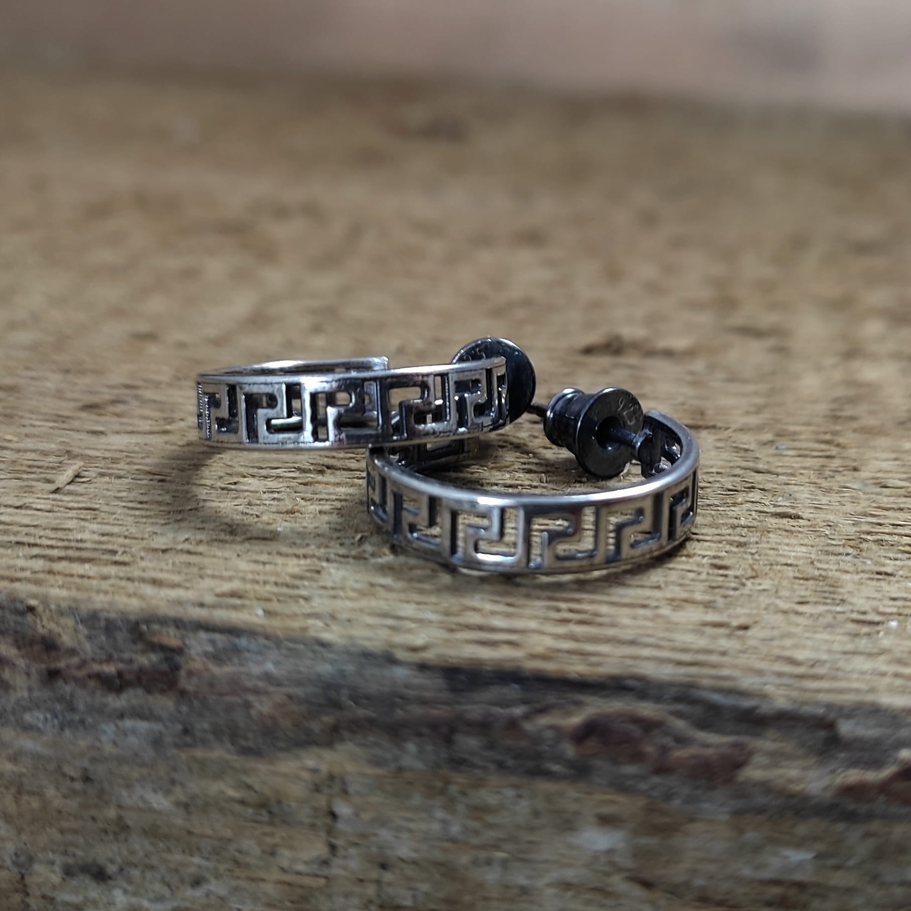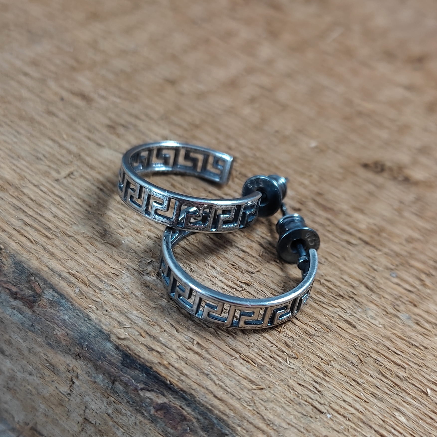 Kolczyki ze ślicznym greckim starożytnym ornamentem. Przywołaj wspomnienia letnich podróży. Mocowanie typu sztyft. Długość całkowita kolczyków wynosi ok. 18 mm. Kolczyki zostały wykonane w całości ze srebra 925, srebro oksydowane. Zapakowane w eleganckie pudełko.