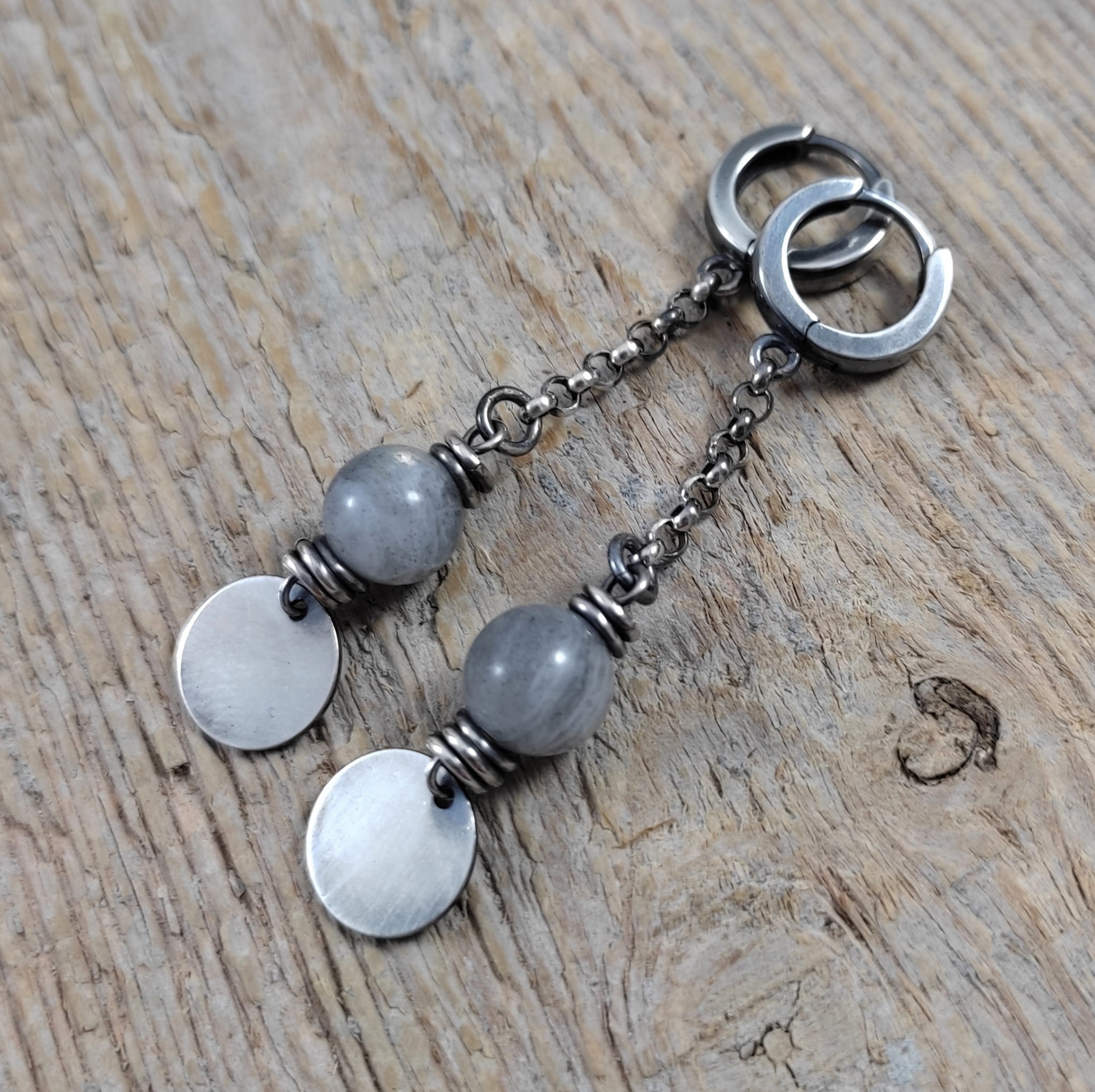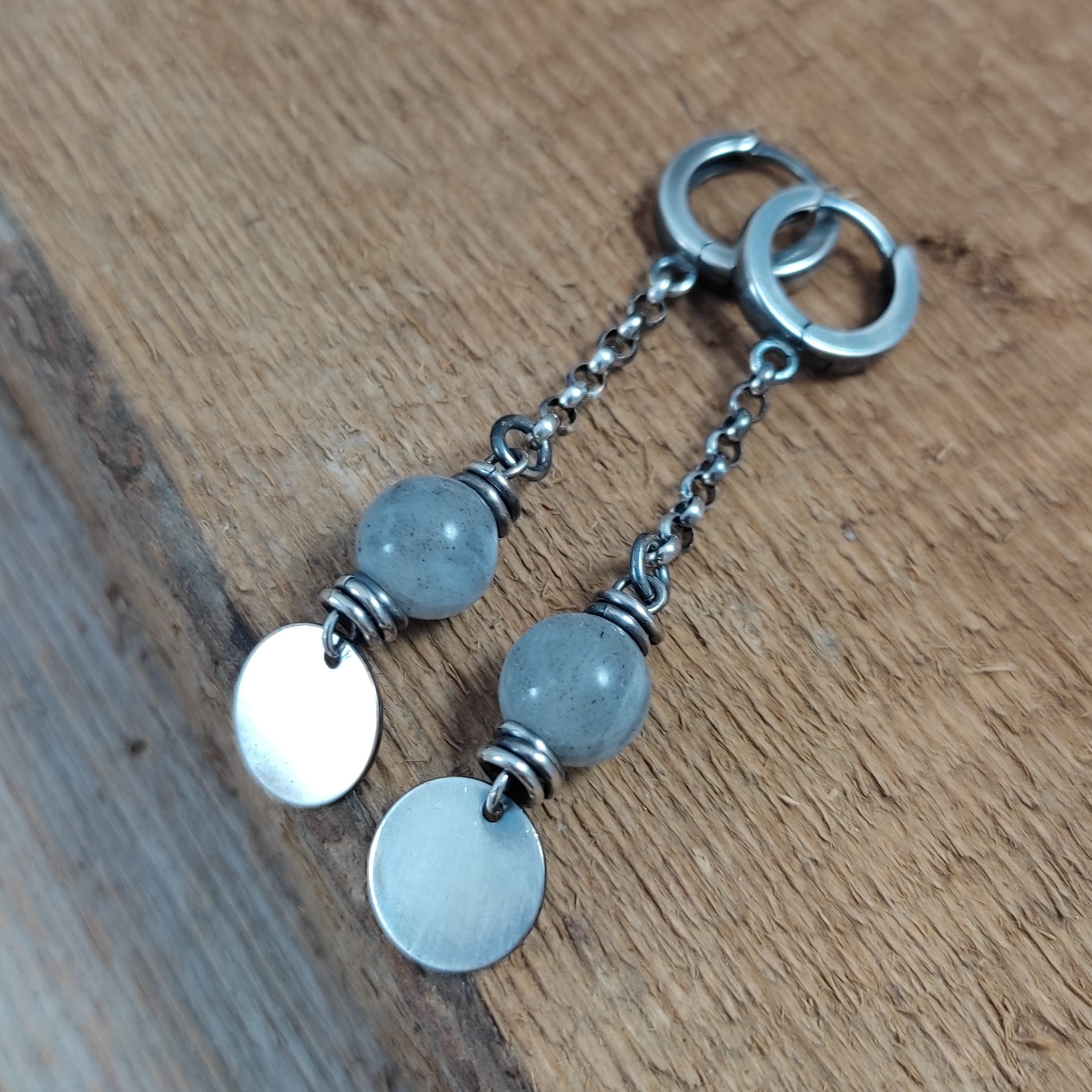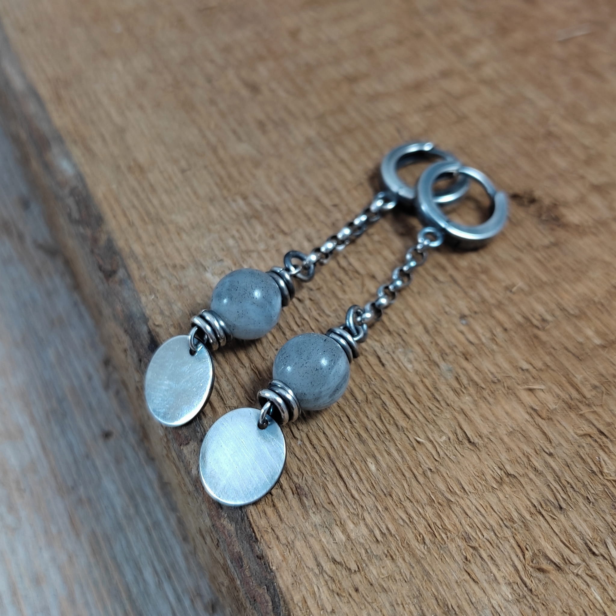 Kolczyki z kulą labradorytu i srebrnym kołem. Kula labradorytu o średnicy 8 mm. Długość całkowita kolczyków wynosi ok. 57mm. Kolczyki zostały wykonane w całości ze srebra 925, srebro oksydowane. Zapakowane w eleganckie pudełko.