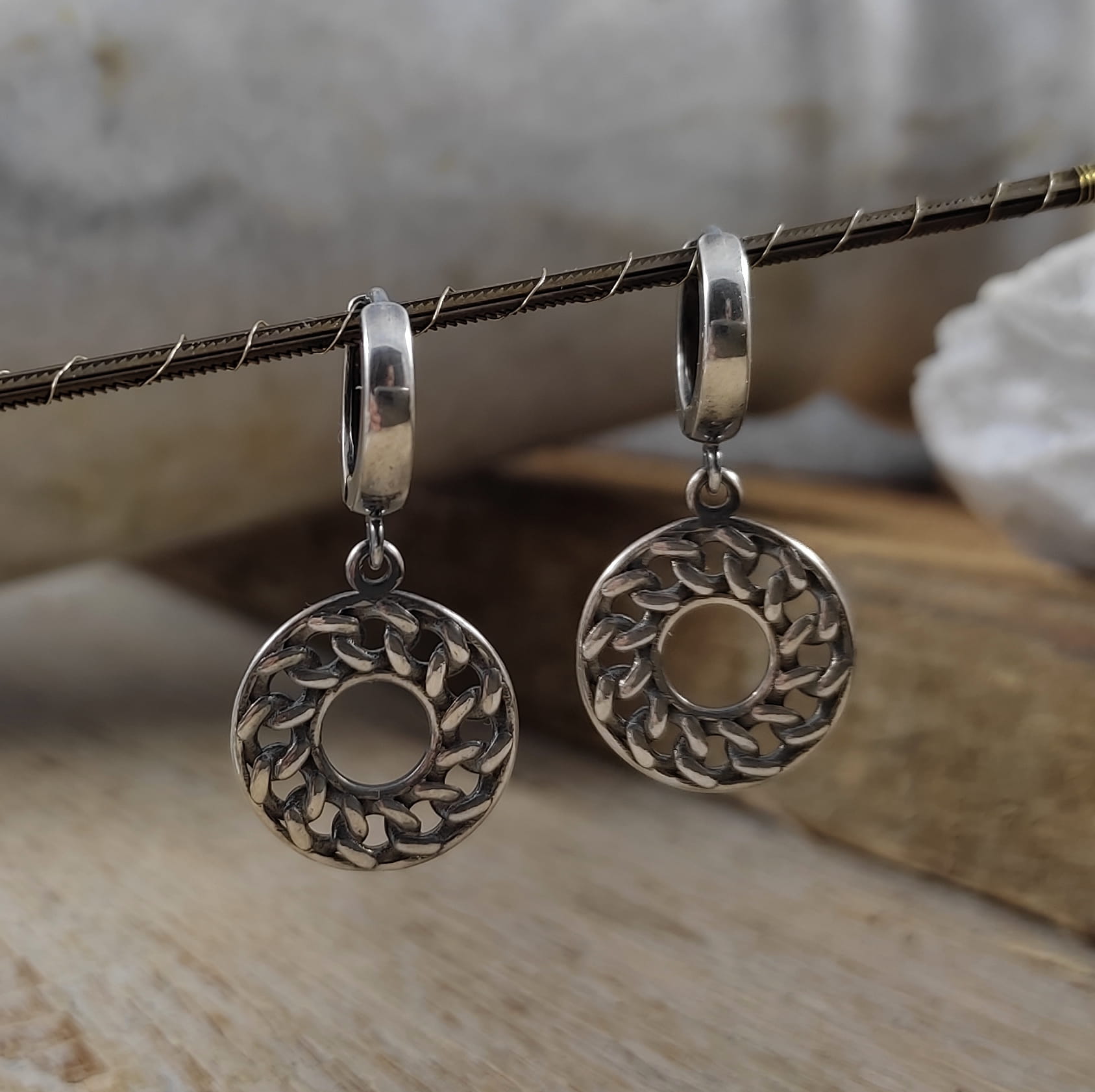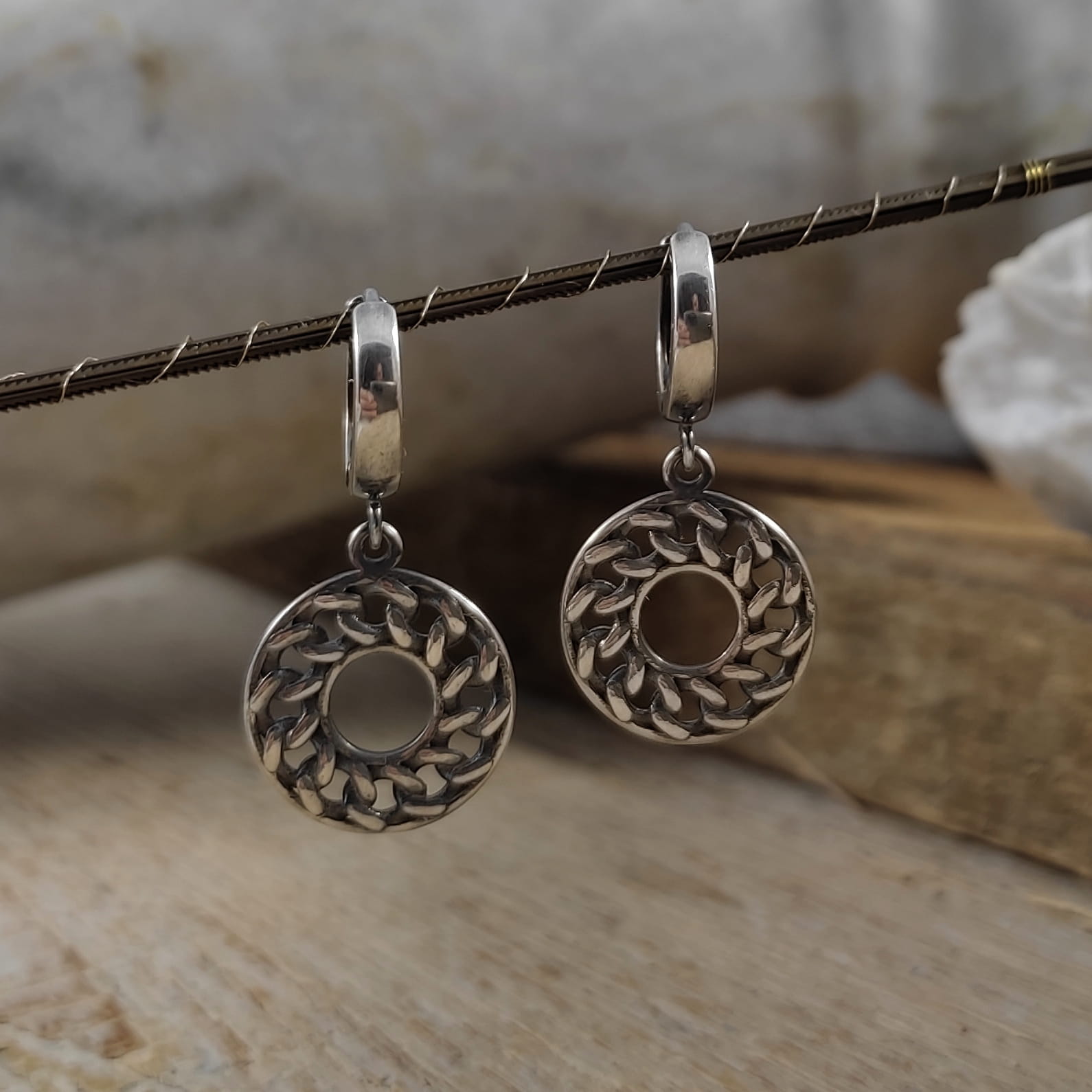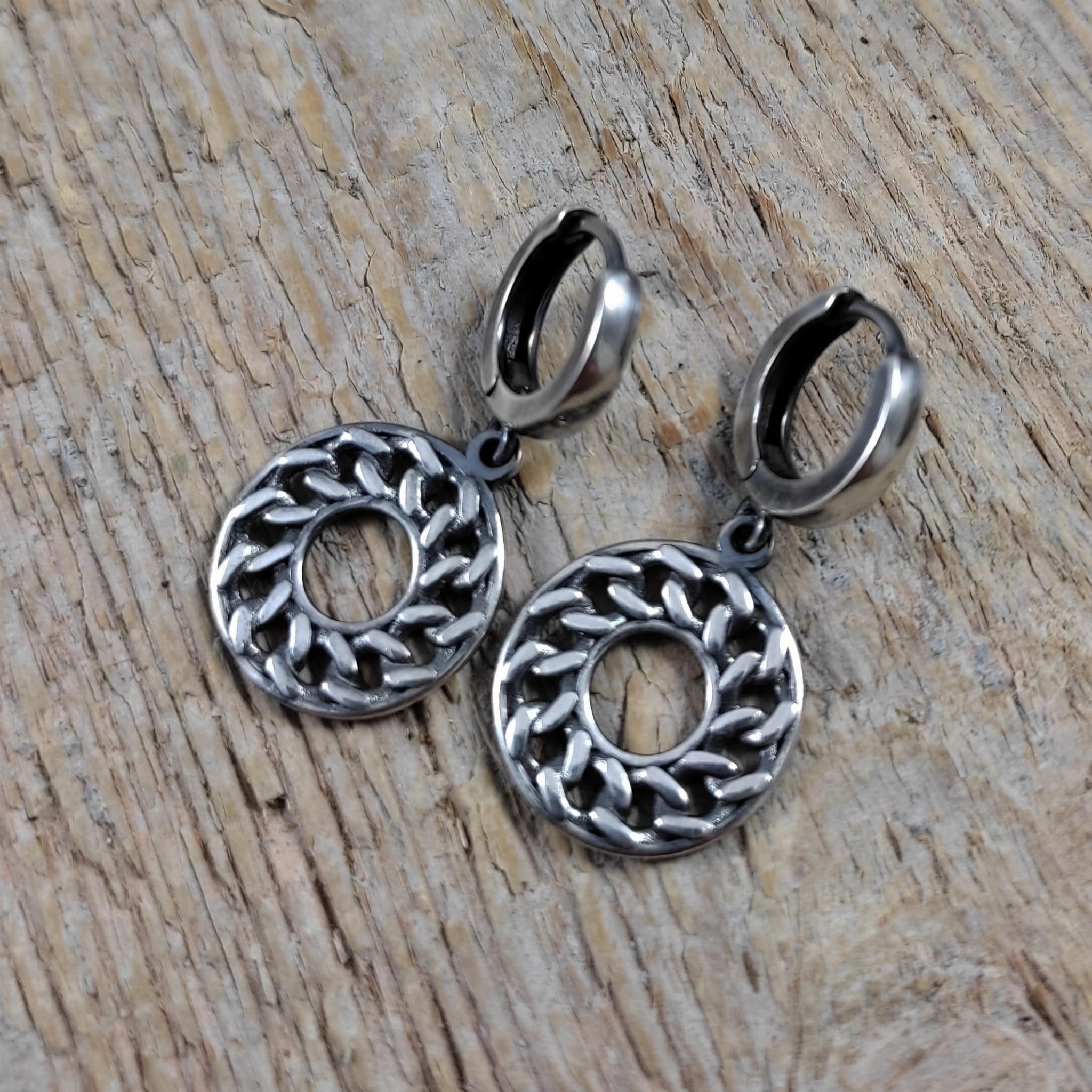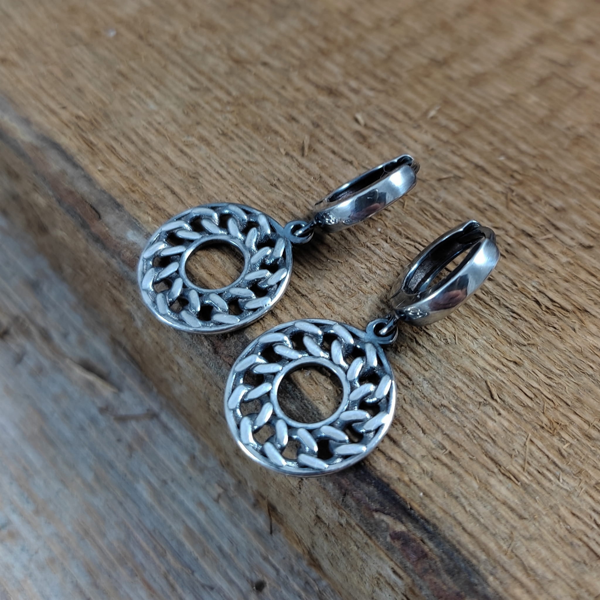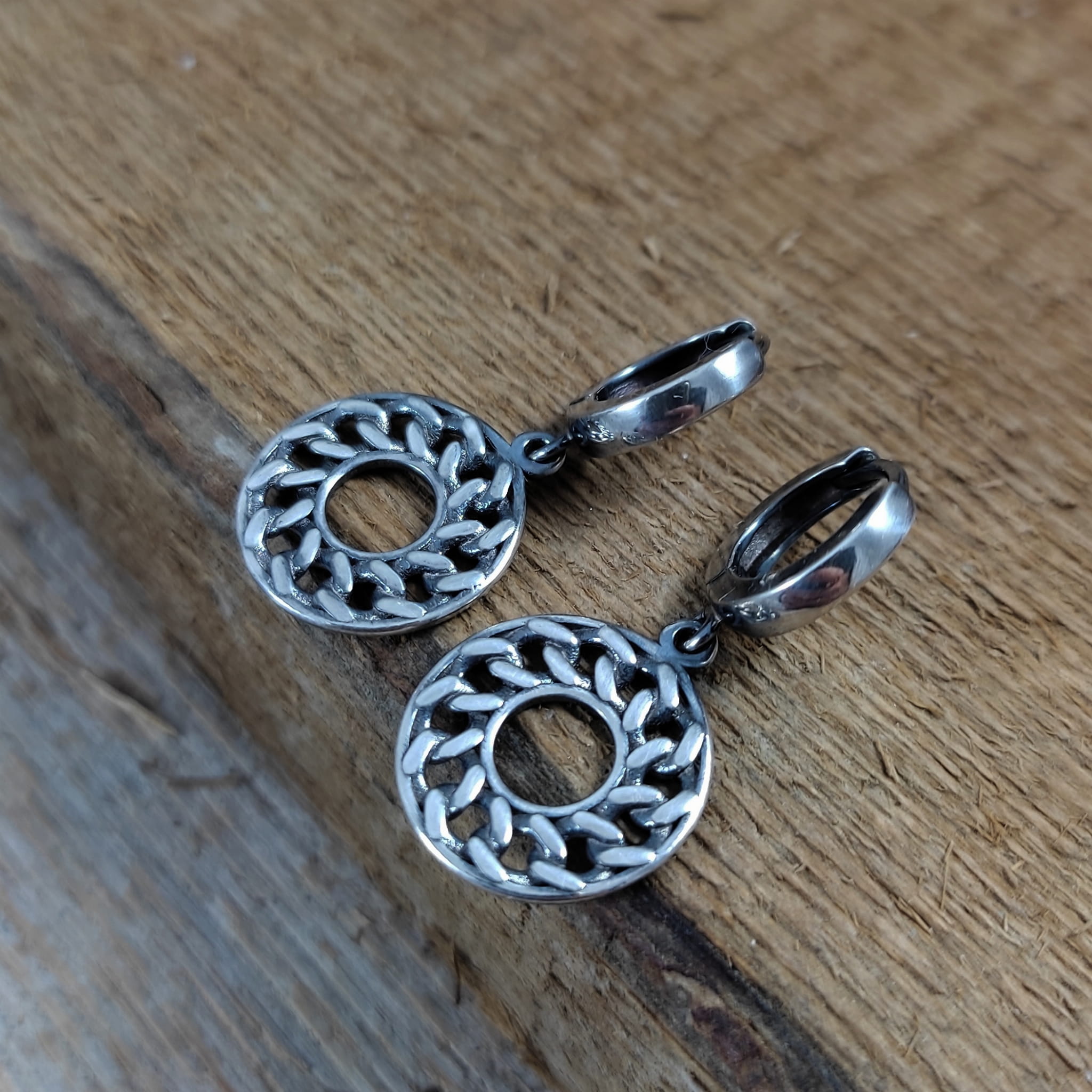 Kolczyki z intrygującym wzorem skręconych ogniw łańcucha ułożonych w koło. Długość całkowita kolczyków wynosi ok. 31 mm. Kolczyki zostały wykonane w całości ze srebra 925, srebro oksydowane. Zapakowane w eleganckie pudełko.