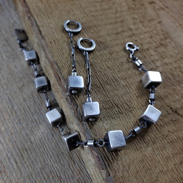 Kolczyki wykonane ze srebra 925, oksydowanego i wypolerowanego. Całkowita długość kolczyków wynosi ok. 6 cm. Wielkość sześciana 8 mm. Elegancko zapakowane.