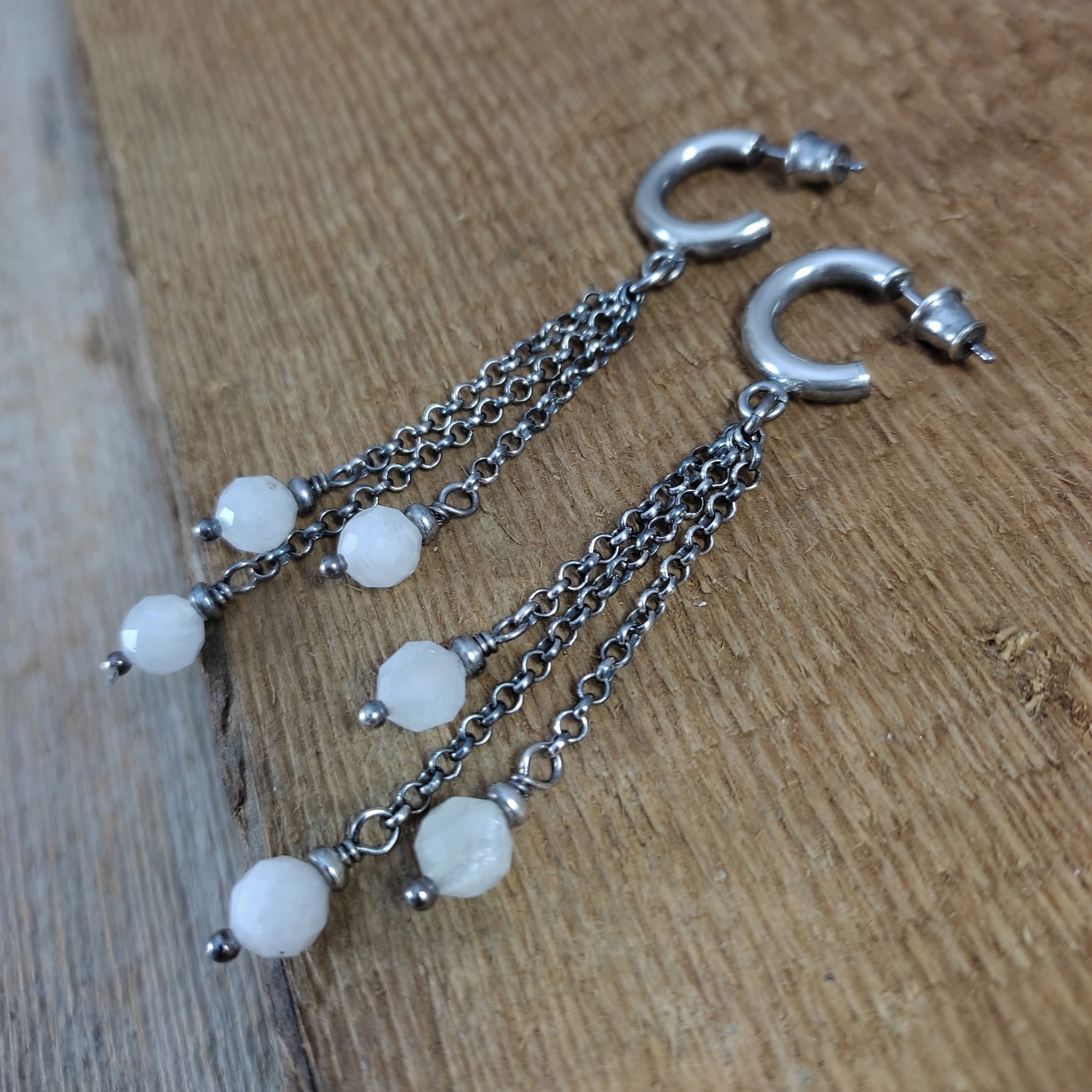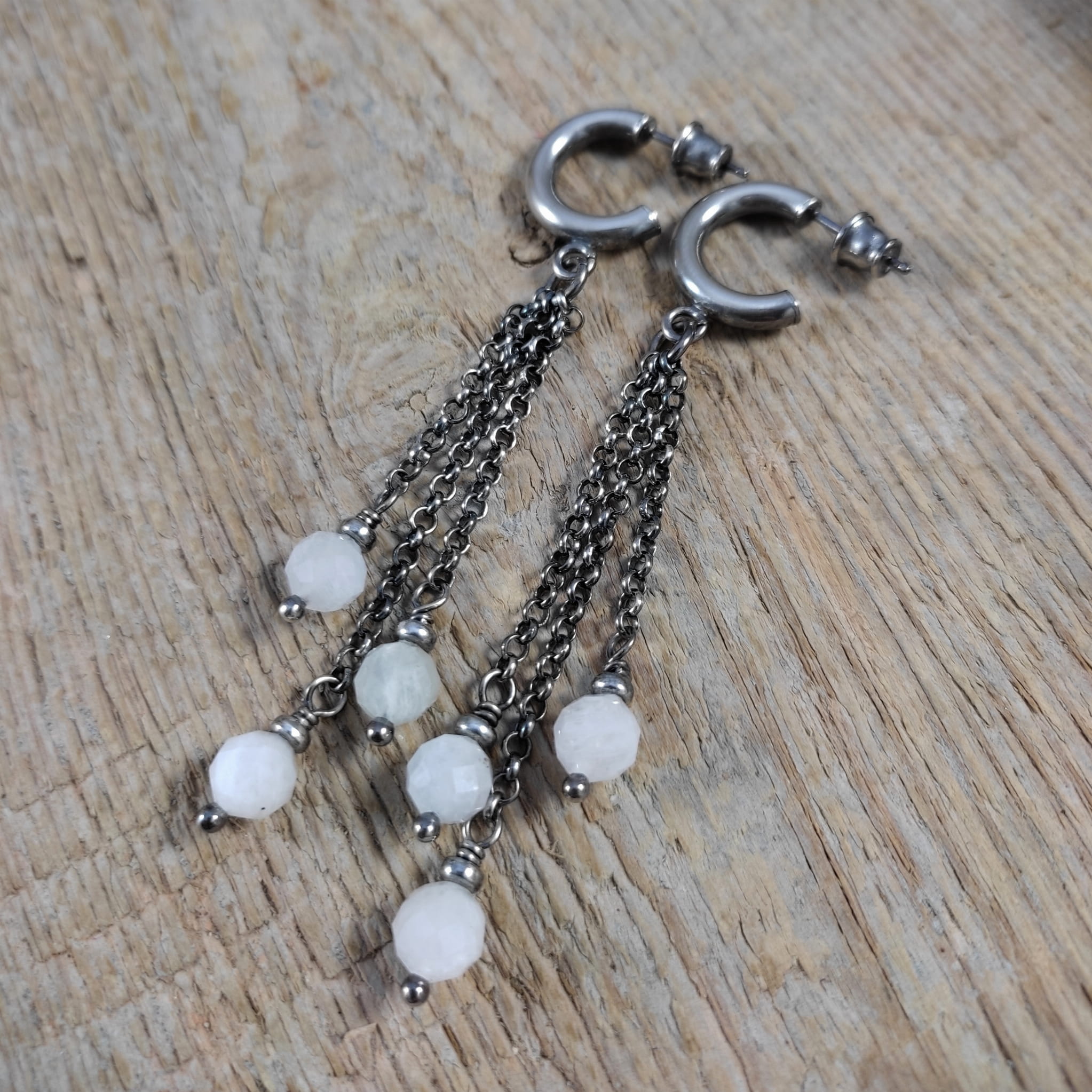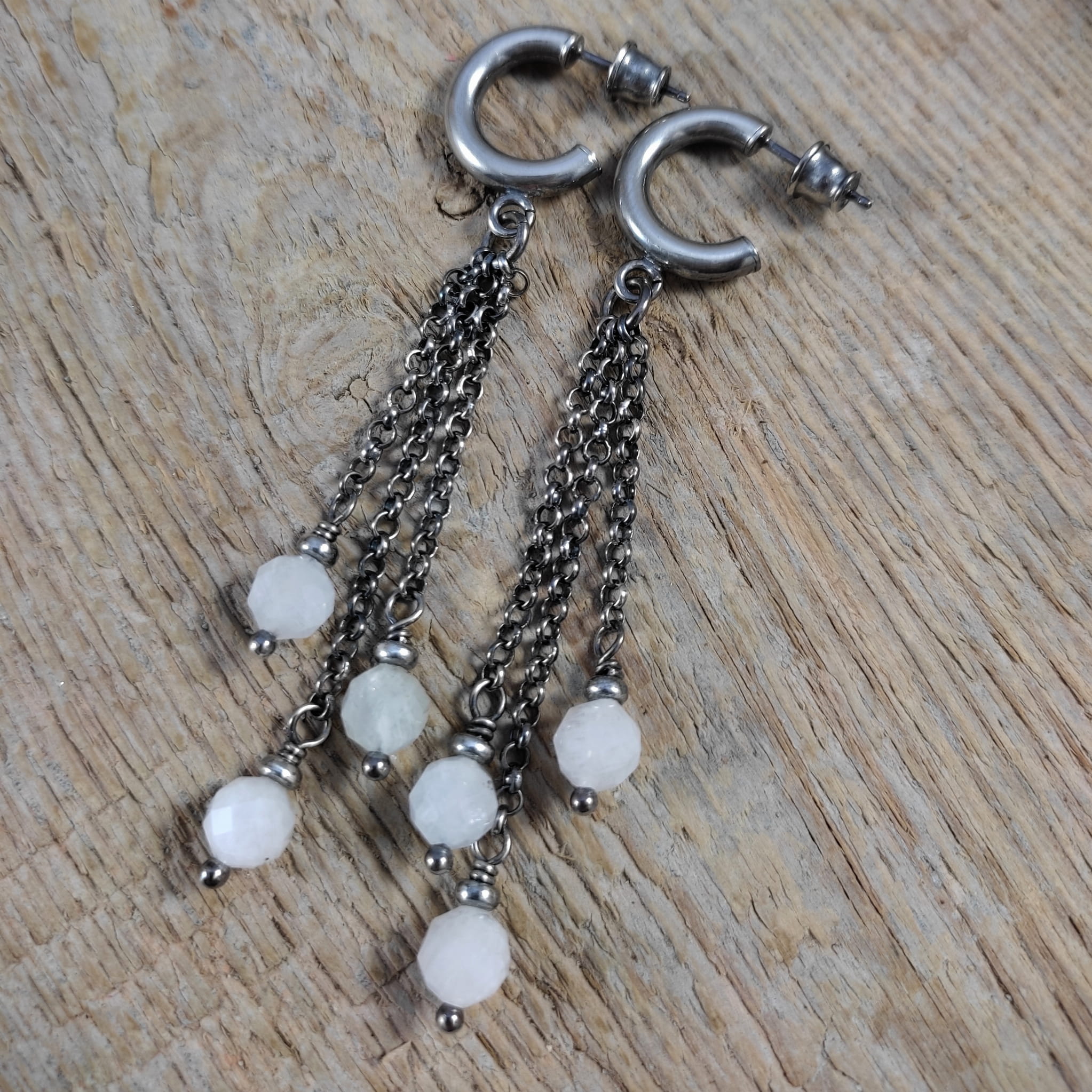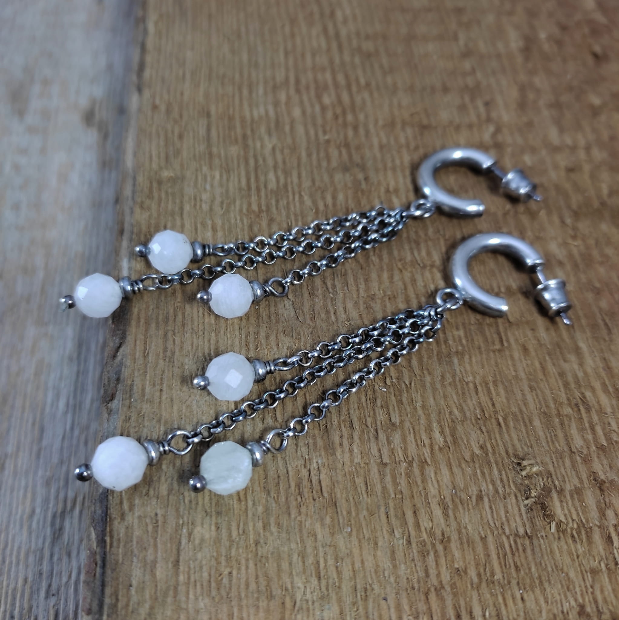 Kolczyki z kulą fasetowanego kamienia księżycowego. Fasetowany kamień księżycowy o średnicy 6,5 mm. Kamienie mogą posiadać delikatne niedoskonałości. Długość całkowita kolczyków wynosi ok. 73 mm. Kolczyki zostały wykonane w całości ze srebra 925, srebro oksydowane. Zapakowane w eleganckie pudełko.