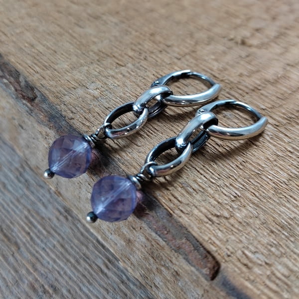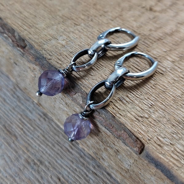 Kolczyki z kulami ametystu o średnicy 8 mm. Kamienie posiadają niedoskonałości. Długość całkowita kolczyków wynosi ok. 4,5 cm. Kolczyki zostały wykonane w całości ze srebra 925, srebro oksydowane. Zapakowane w eleganckie pudełko.
