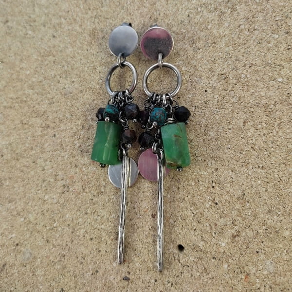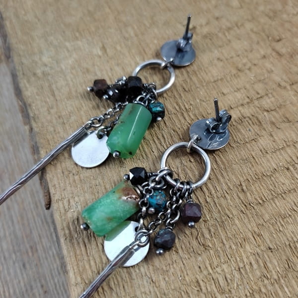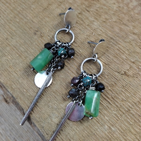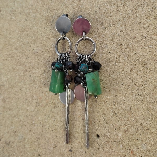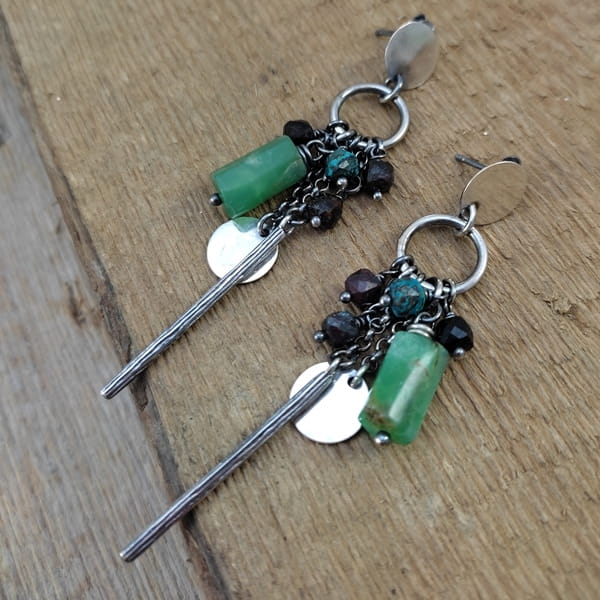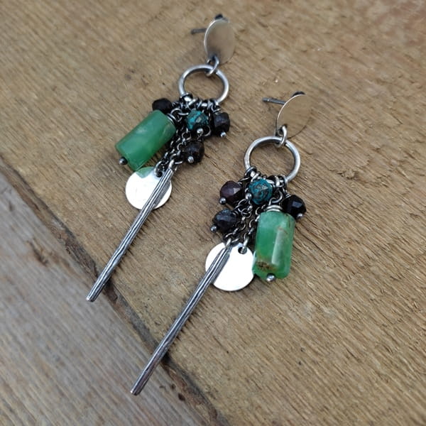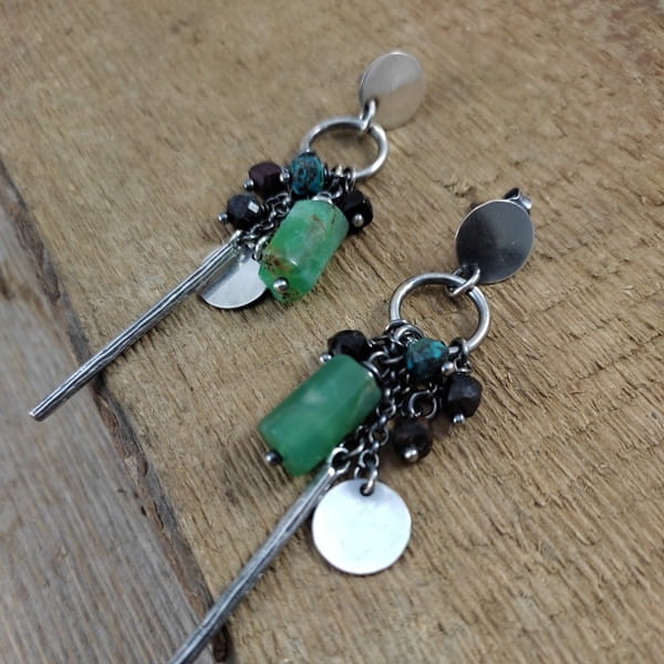 Kolczyki z bryłkami chryzoprazu (1,2/0,8 mm) i kostkami chryzokoli (4 mm). Kamienie posiadają niedoskonałości. Długość całkowita kolczyków wynosi ok. 7 cm. Kolczyki zostały wykonane w całości ze srebra 925, srebro oksydowane. Zapakowane w eleganckie pudełko.