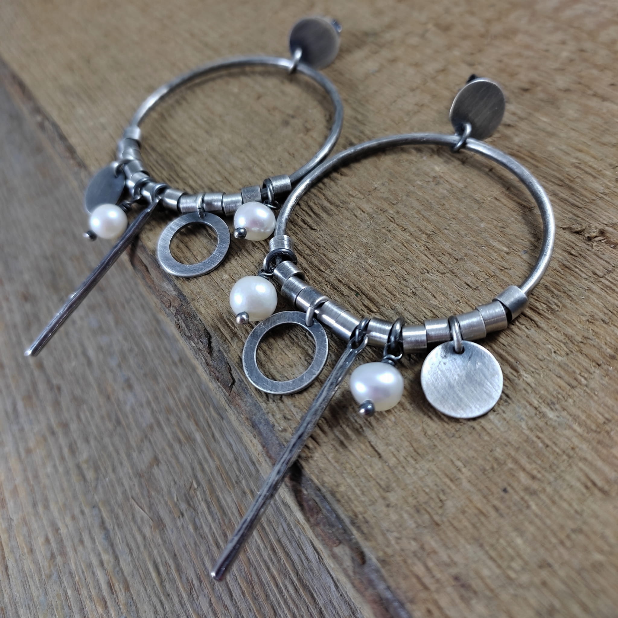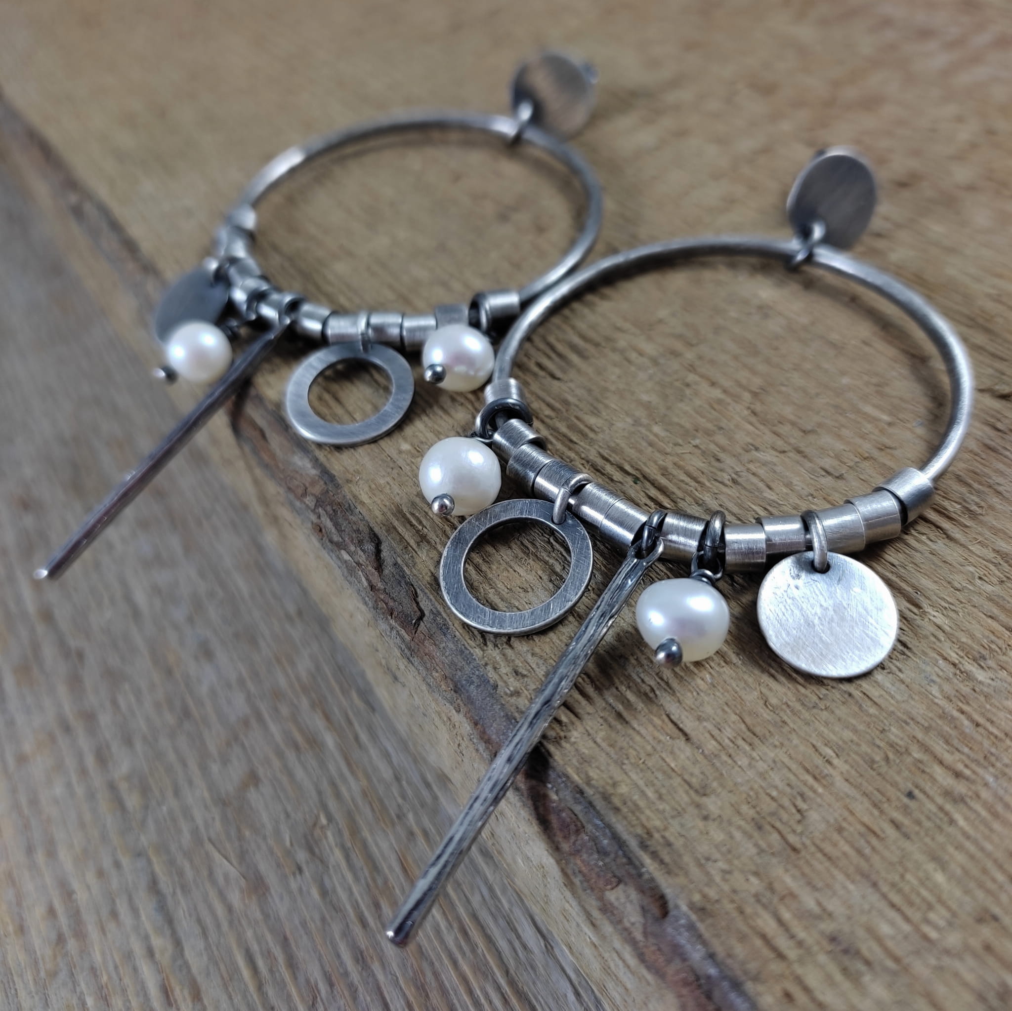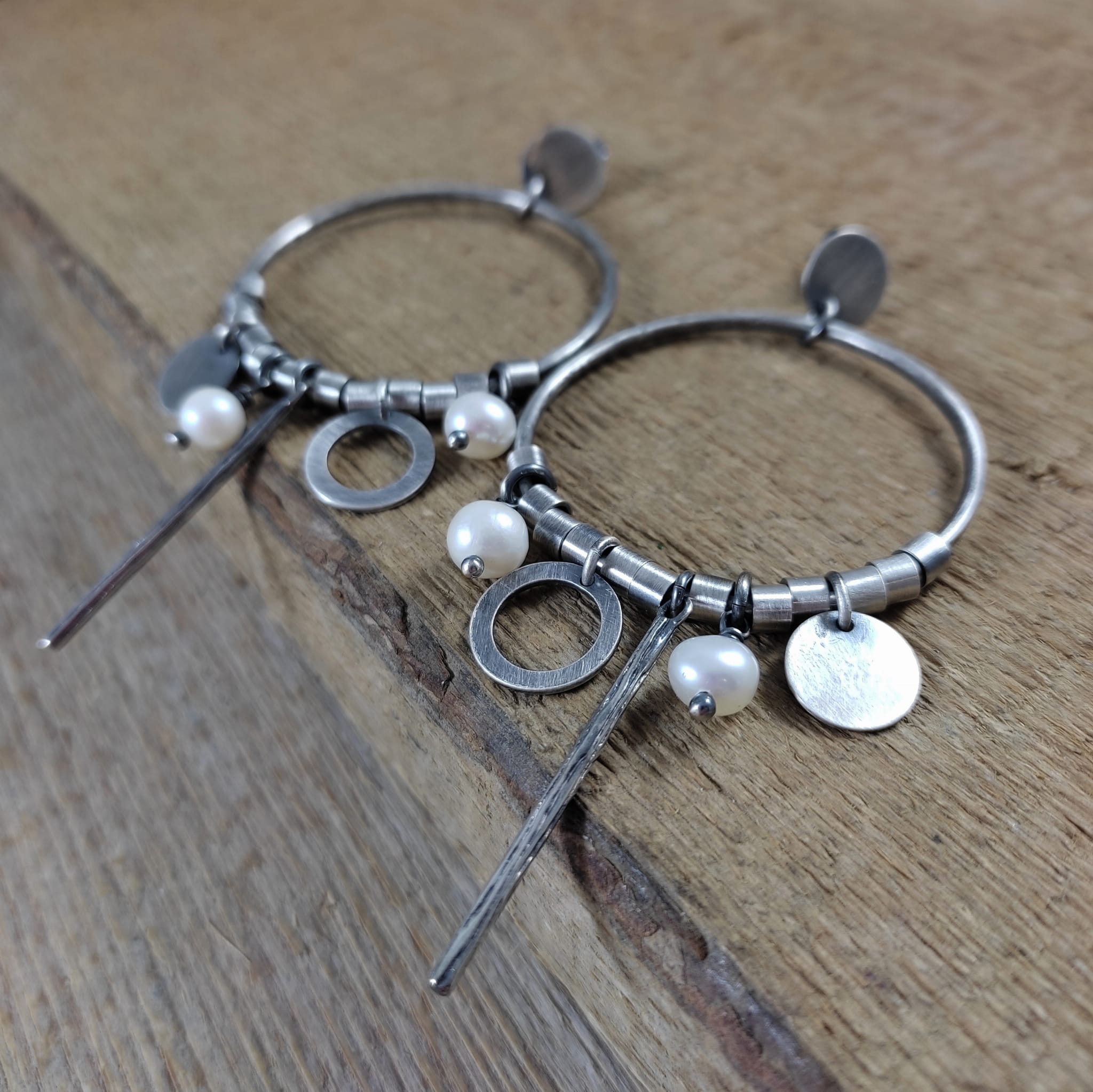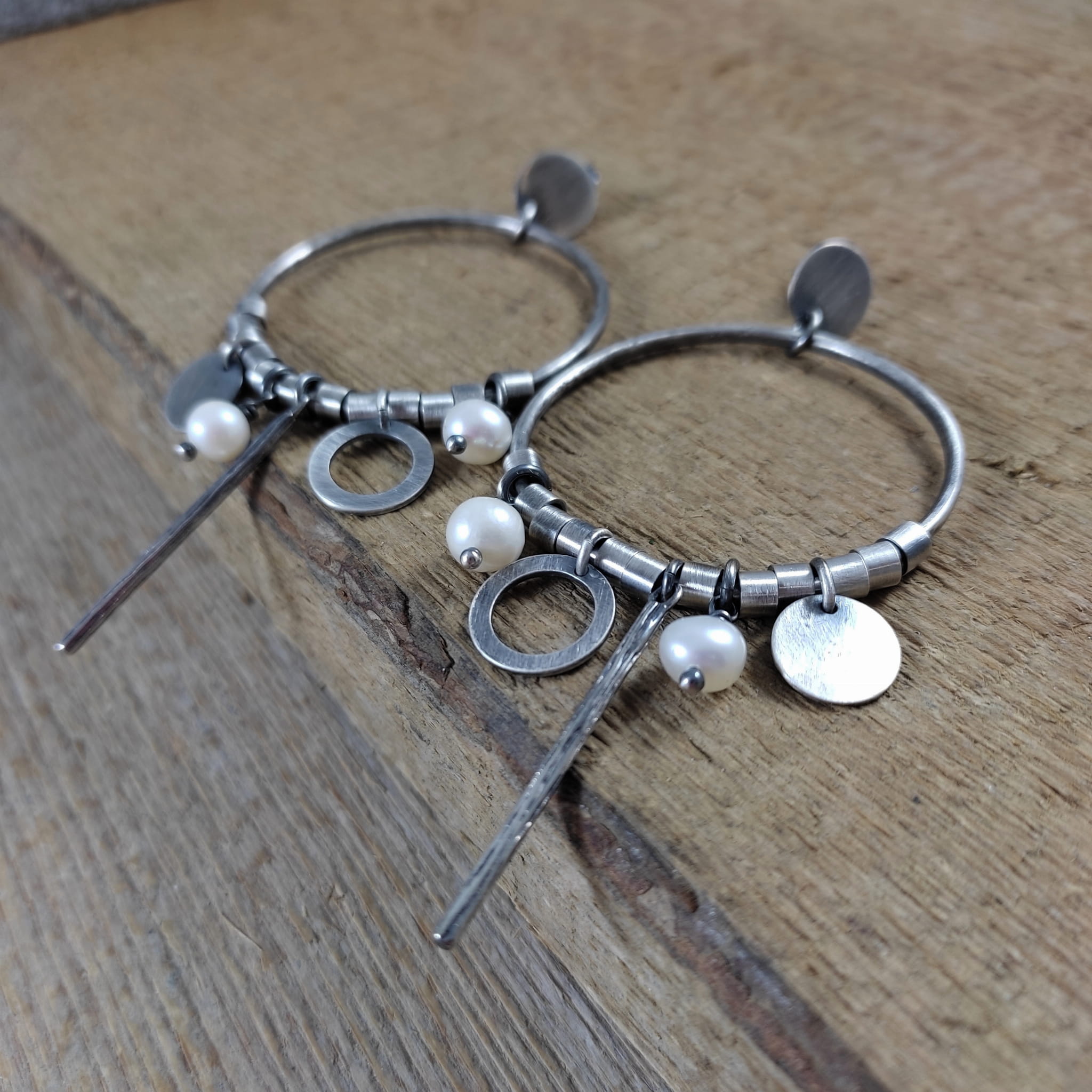 Kolczyki wykonane ze srebra 925 oraz naturalnych pereł ok 6,5 mm. Srebro oksydowane i wypolerowane. Całkowita długość kolczyków wynosi ok. 8.6 cm. Wielkość srebrnych elementów