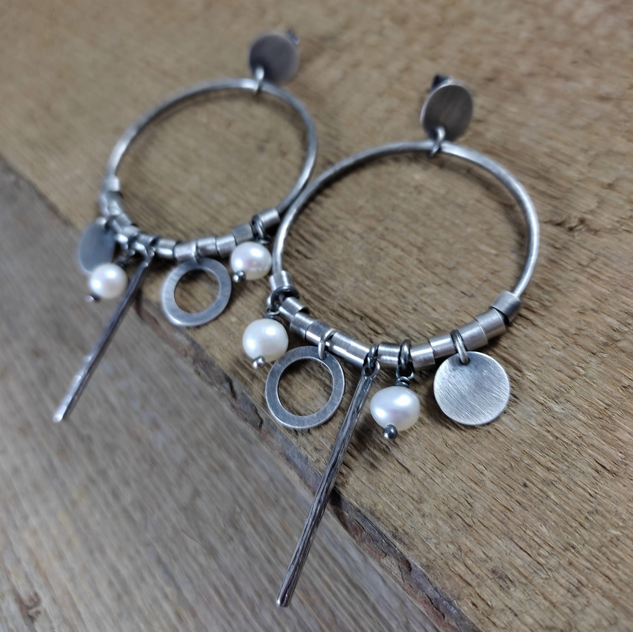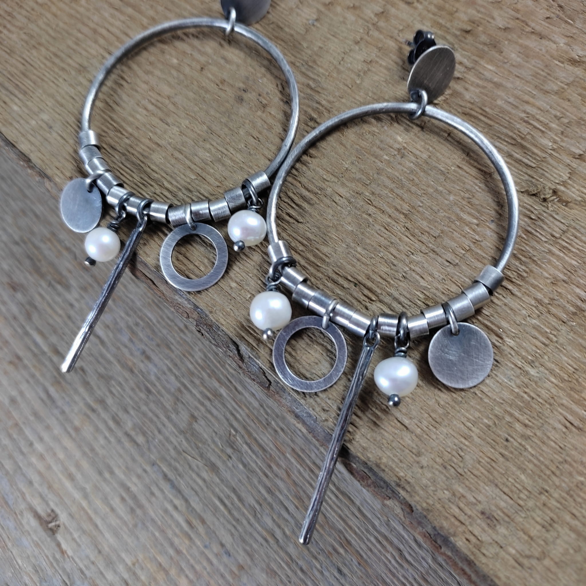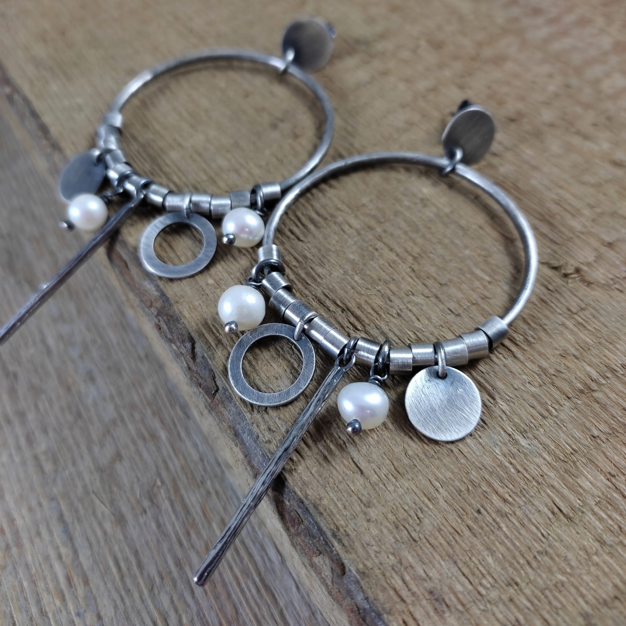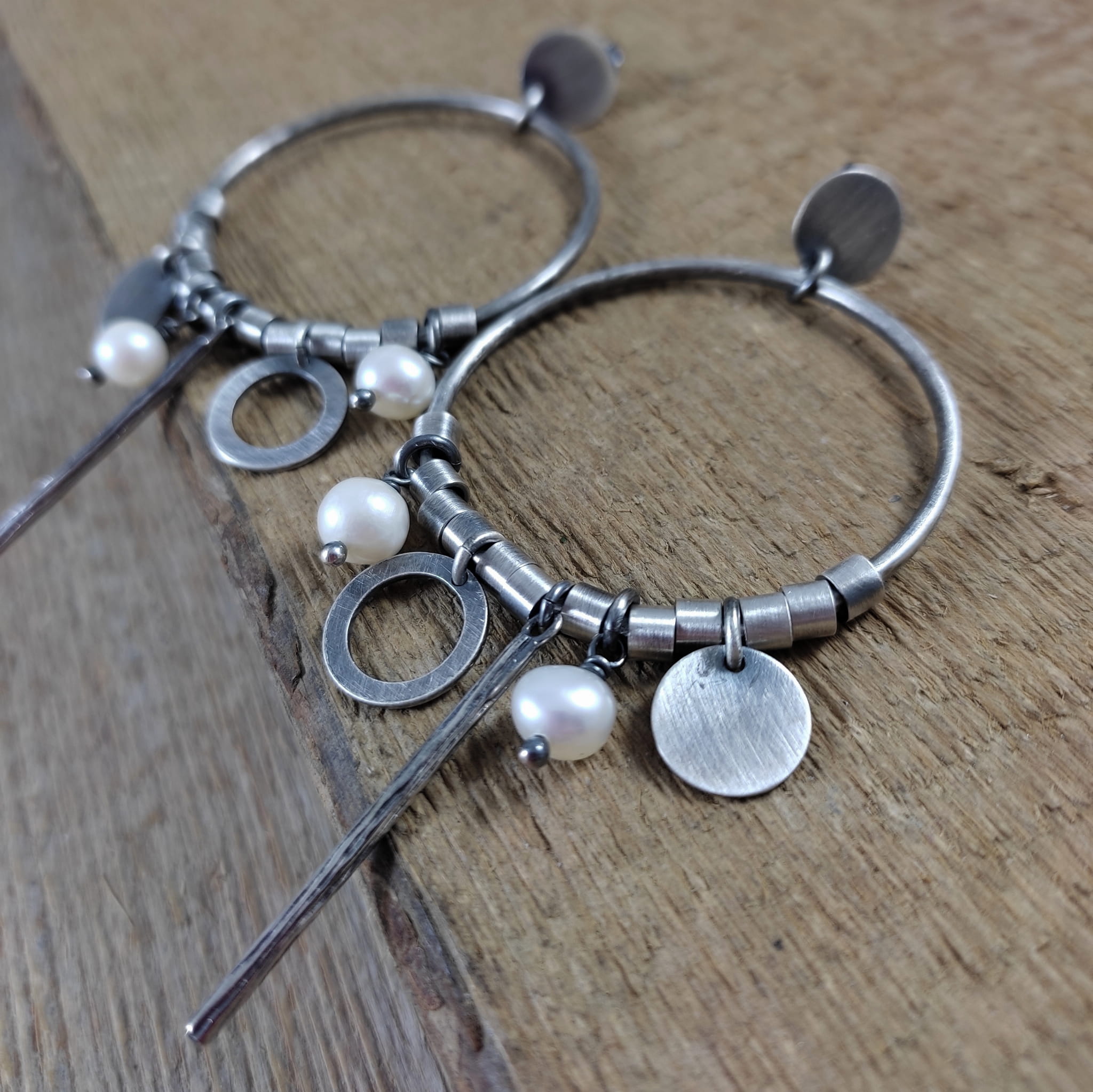 Kolczyki wykonane ze srebra 925 oraz naturalnych pereł ok 6,5 mm. Srebro oksydowane i wypolerowane. Całkowita długość kolczyków wynosi ok. 8.6 cm. Wielkość srebrnych elementów