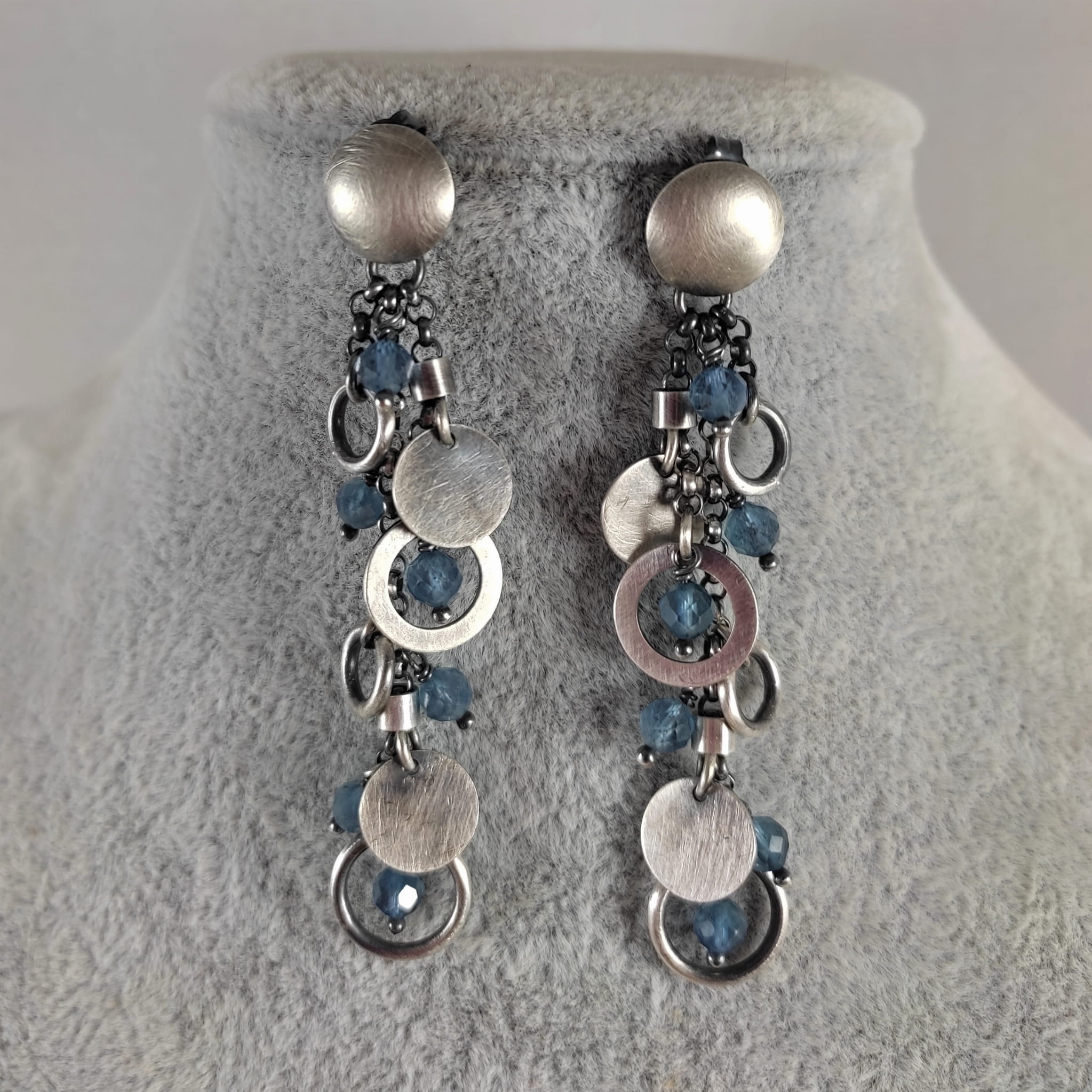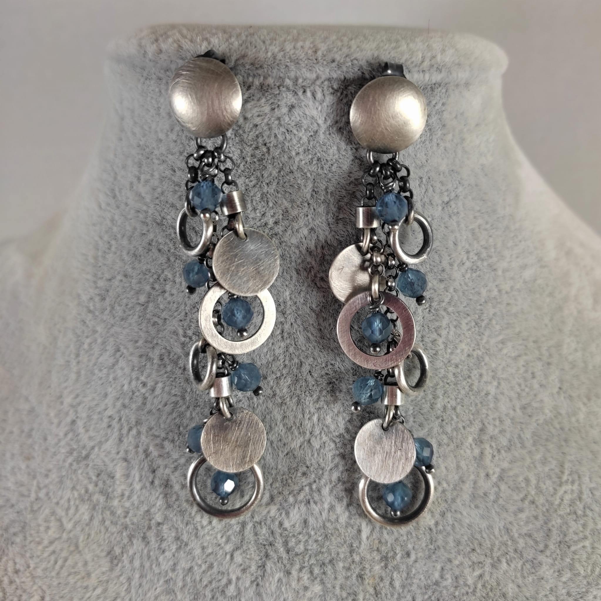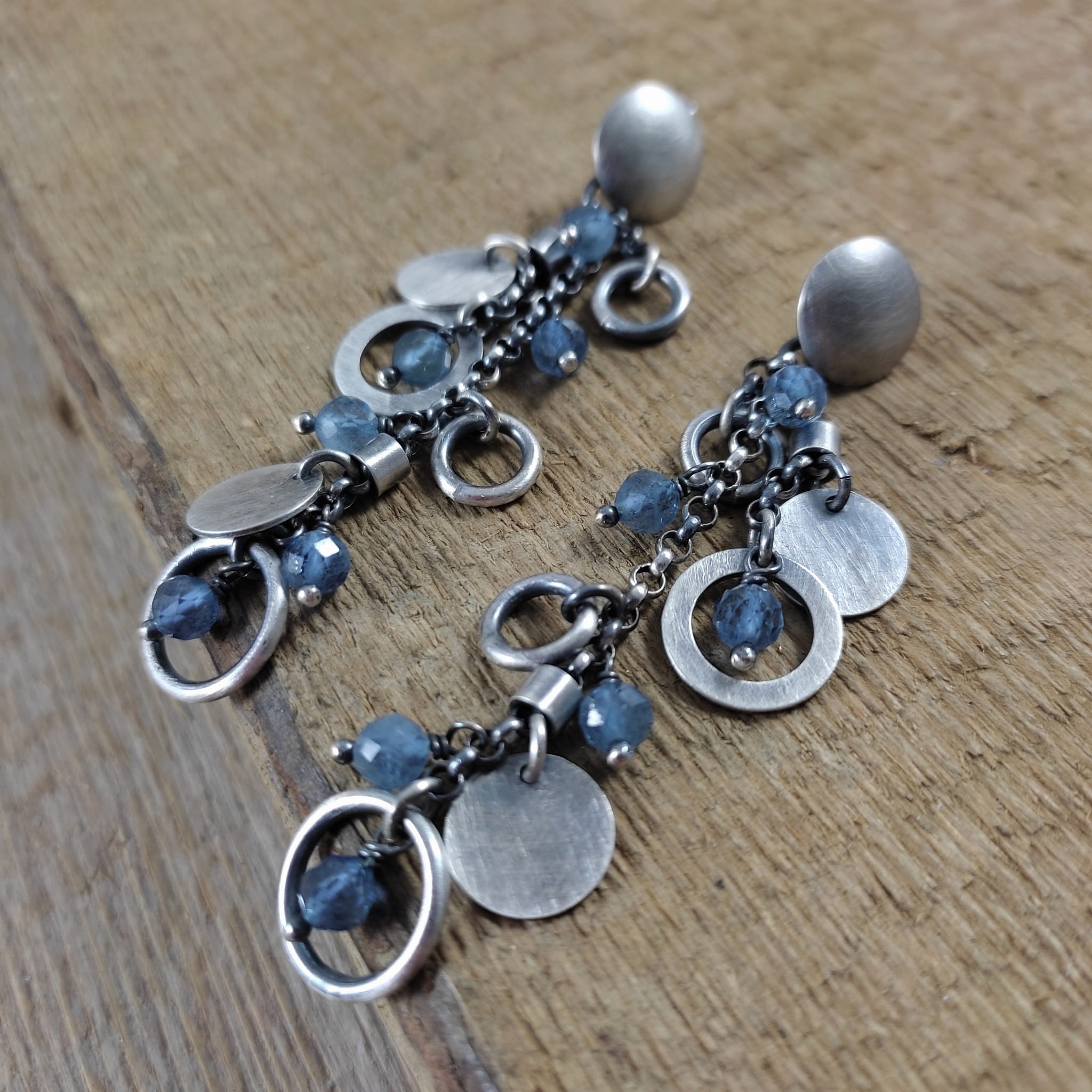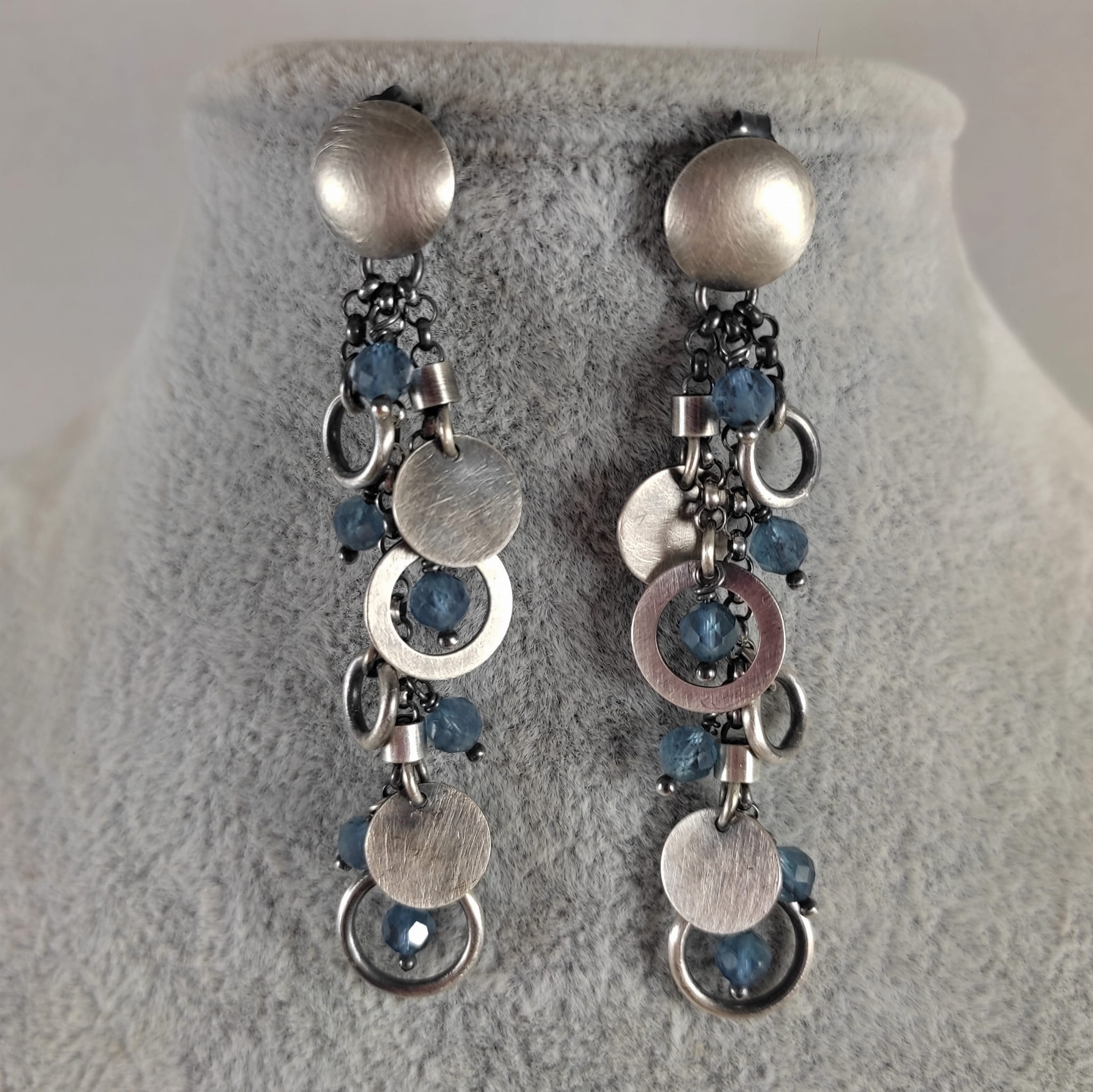 Kolczyki z kulami fasetowanego akwamarynu. Fasetowany akwamaryn o średnicy 4,5 mm. Kamienie posiadają niedoskonałości. Długość całkowita kolczyków wynosi ok. 7 cm. Kolczyki zostały wykonane w całości ze srebra 925, srebro oksydowane. Zapakowane w eleganckie pudełko.
