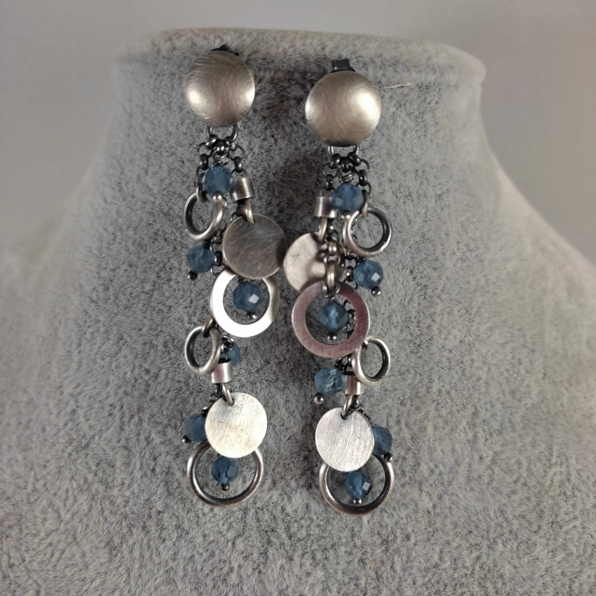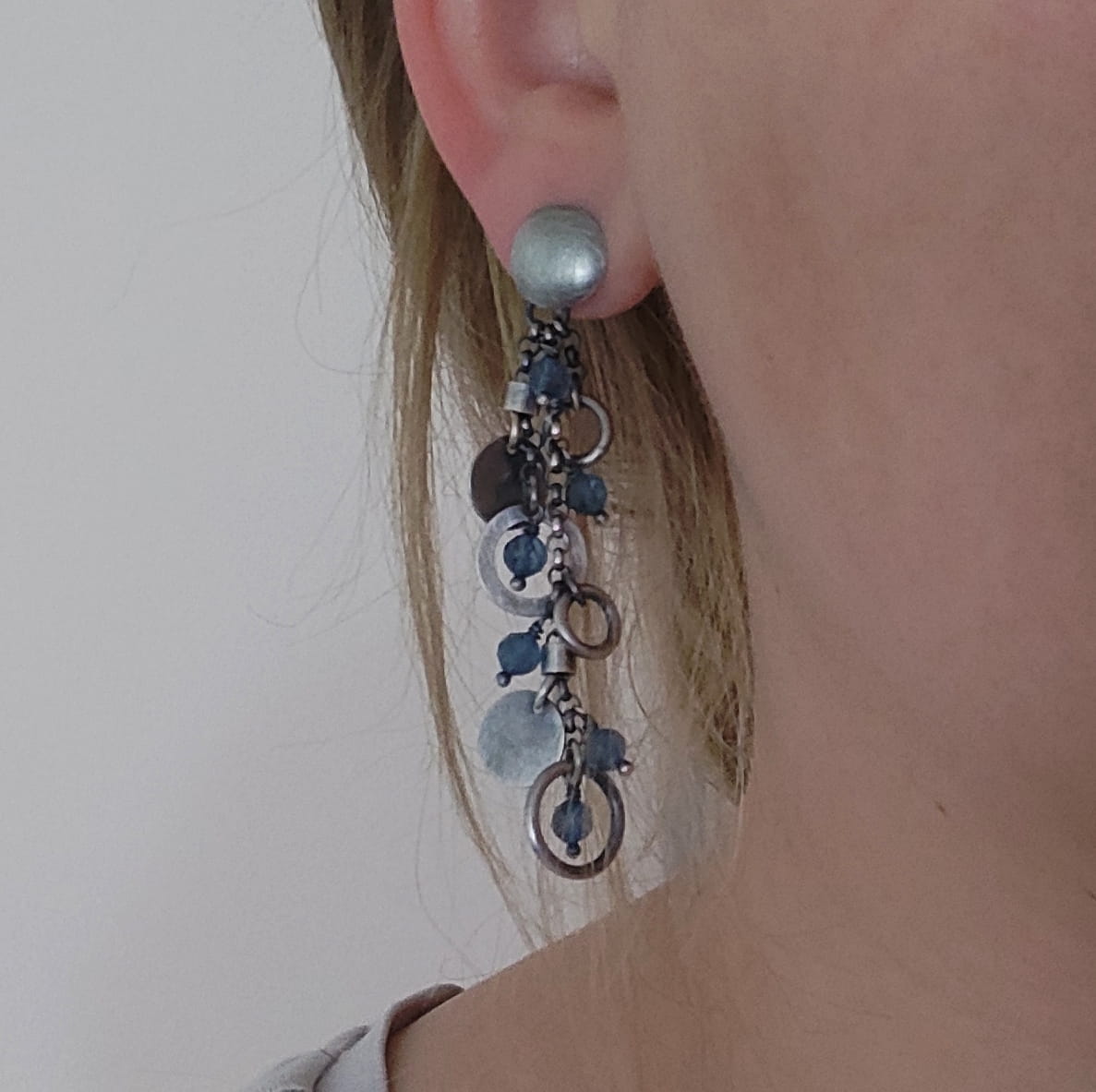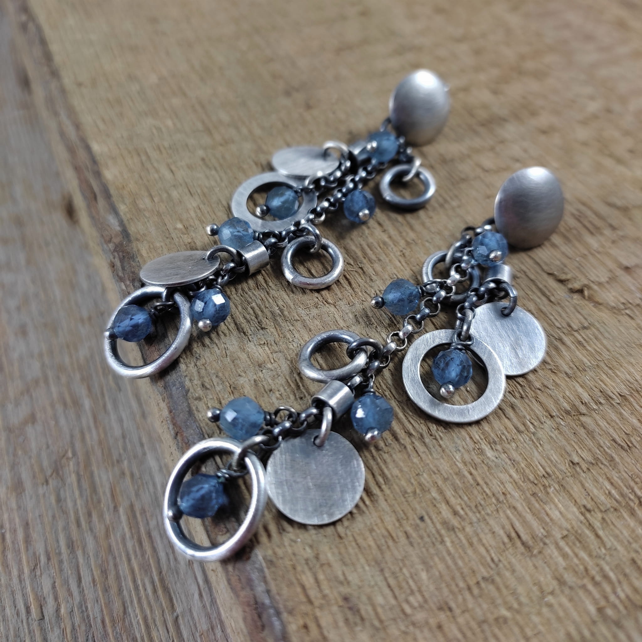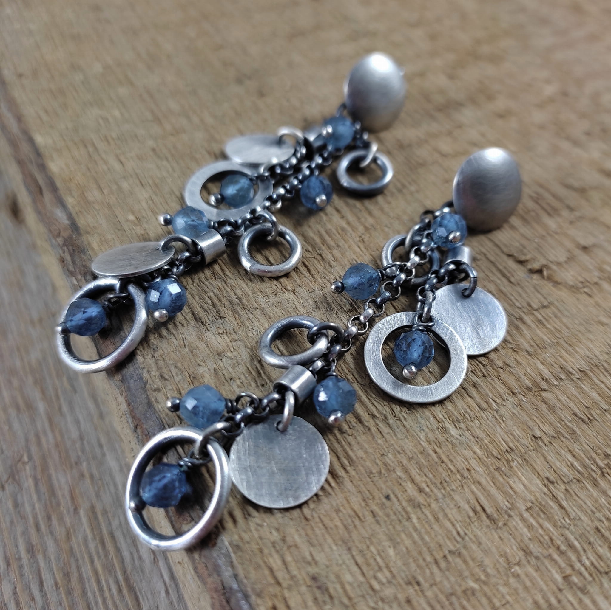 Kolczyki z kulami fasetowanego akwamarynu. Fasetowany akwamaryn o średnicy 4,5 mm. Kamienie posiadają niedoskonałości. Długość całkowita kolczyków wynosi ok. 7 cm. Kolczyki zostały wykonane w całości ze srebra 925, srebro oksydowane. Zapakowane w eleganckie pudełko.