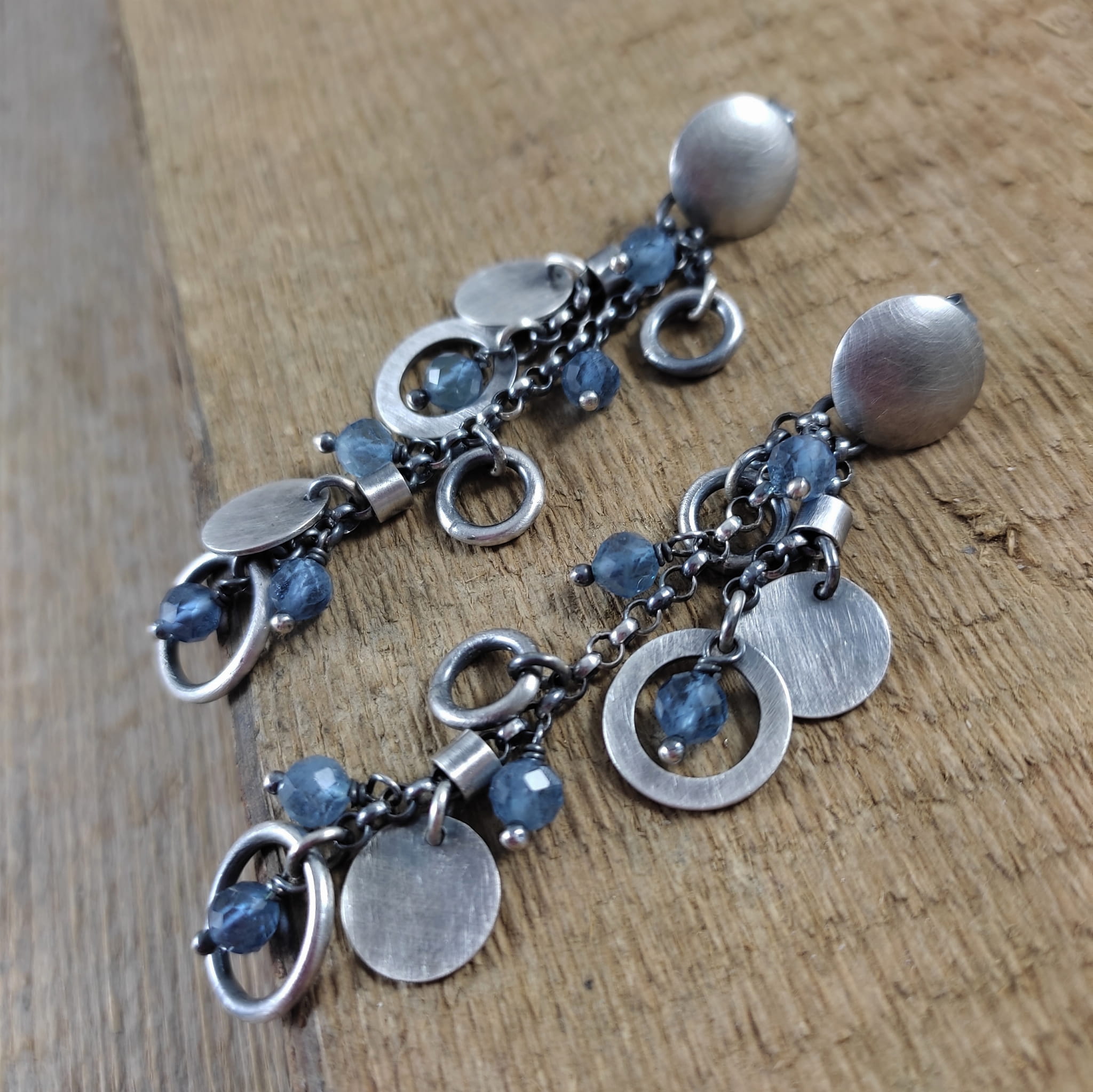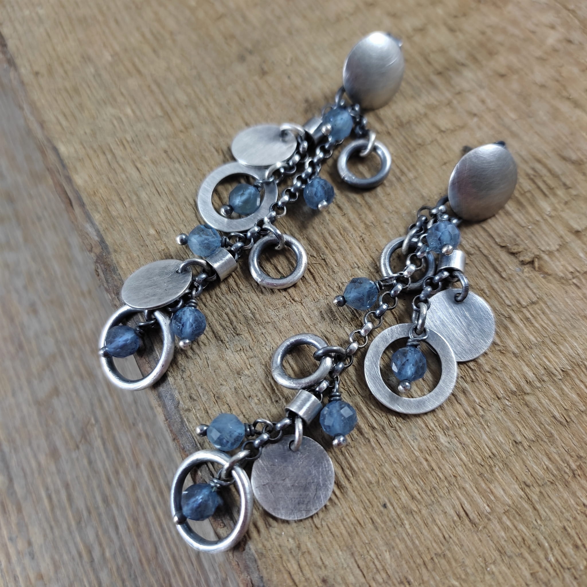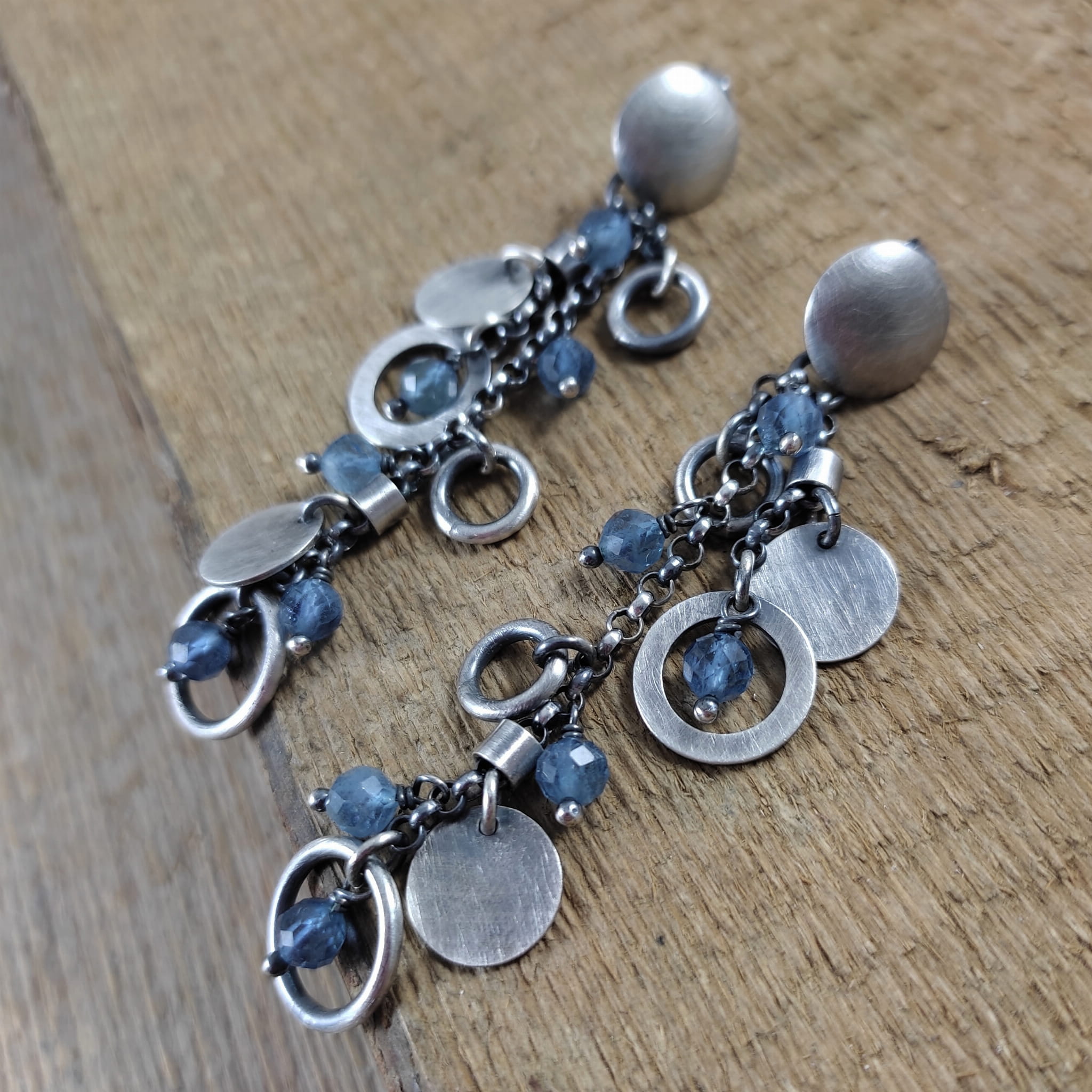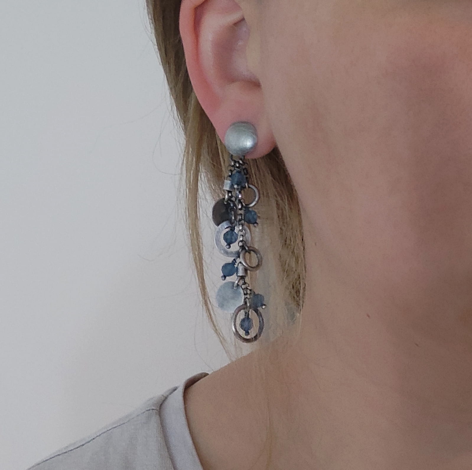 Kolczyki z kulami fasetowanego akwamarynu. Fasetowany akwamaryn o średnicy 4,5 mm. Kamienie posiadają niedoskonałości. Długość całkowita kolczyków wynosi ok. 7 cm. Kolczyki zostały wykonane w całości ze srebra 925, srebro oksydowane. Zapakowane w eleganckie pudełko.