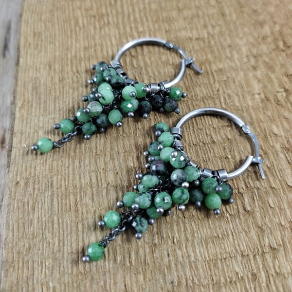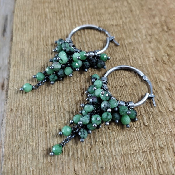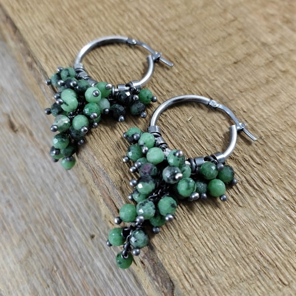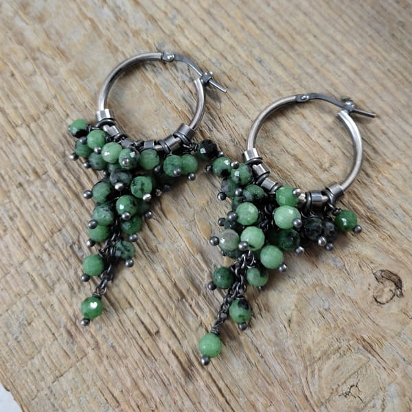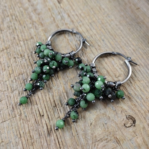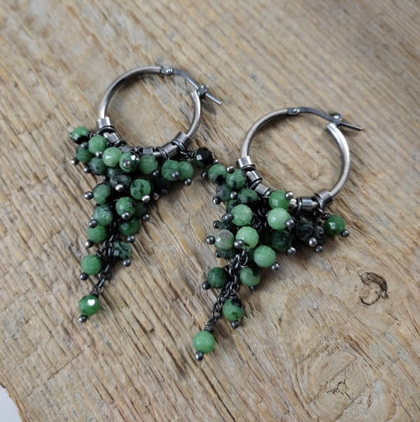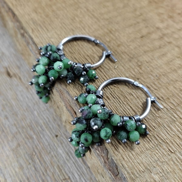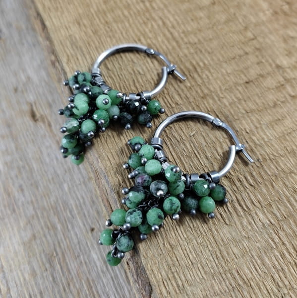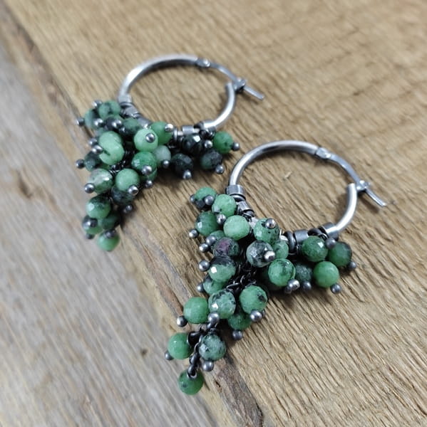 Kolczyki z kulami fasetowanego zoisytu. Fasetowany zoisyt o średnicy 4 mm. Kamienie posiadają niedoskonałości. Długość całkowita kolczyków wynosi ok. 5.9 cm. Kolczyki zostały wykonane w całości ze srebra 925, srebro oksydowane. Zapakowane w eleganckie pudełko.