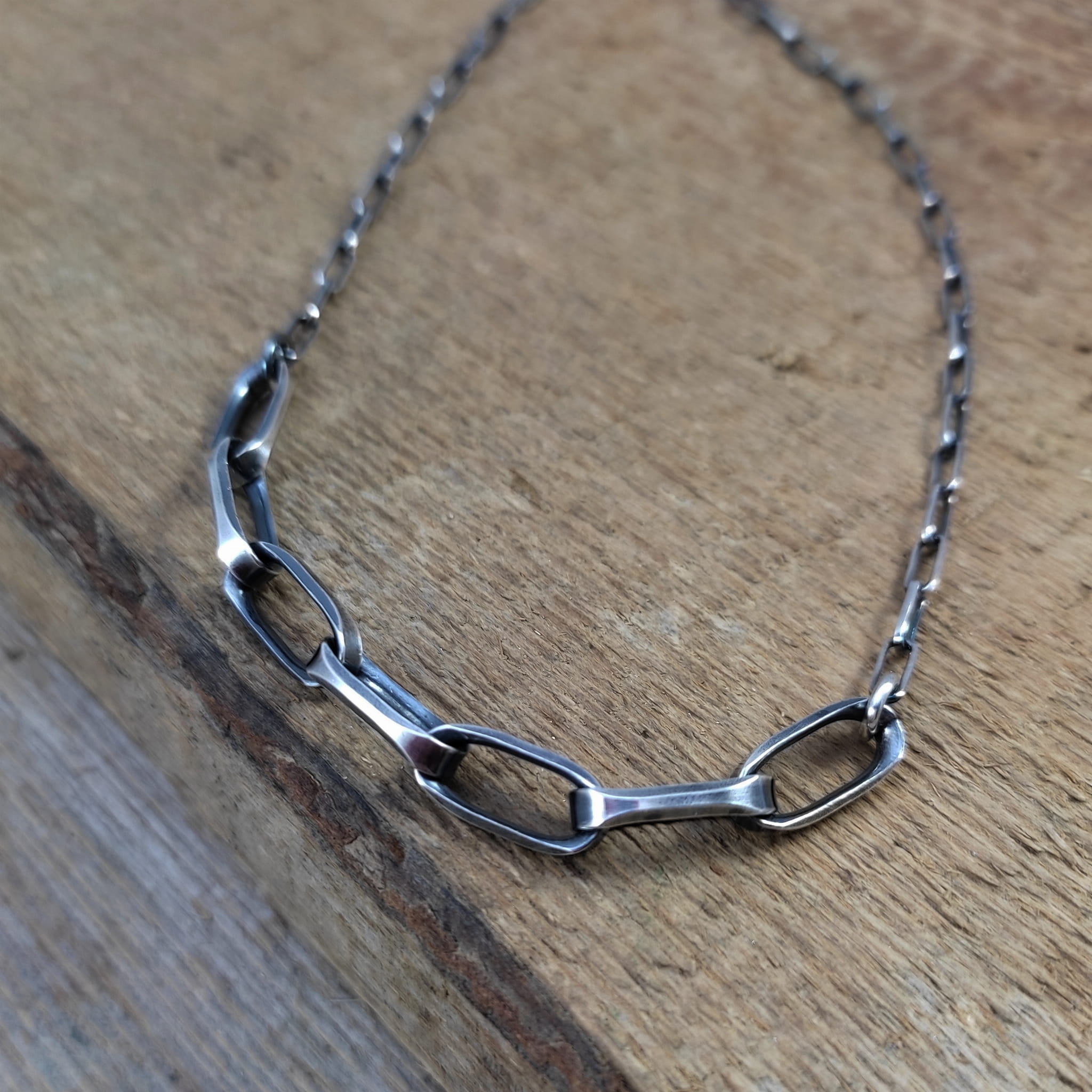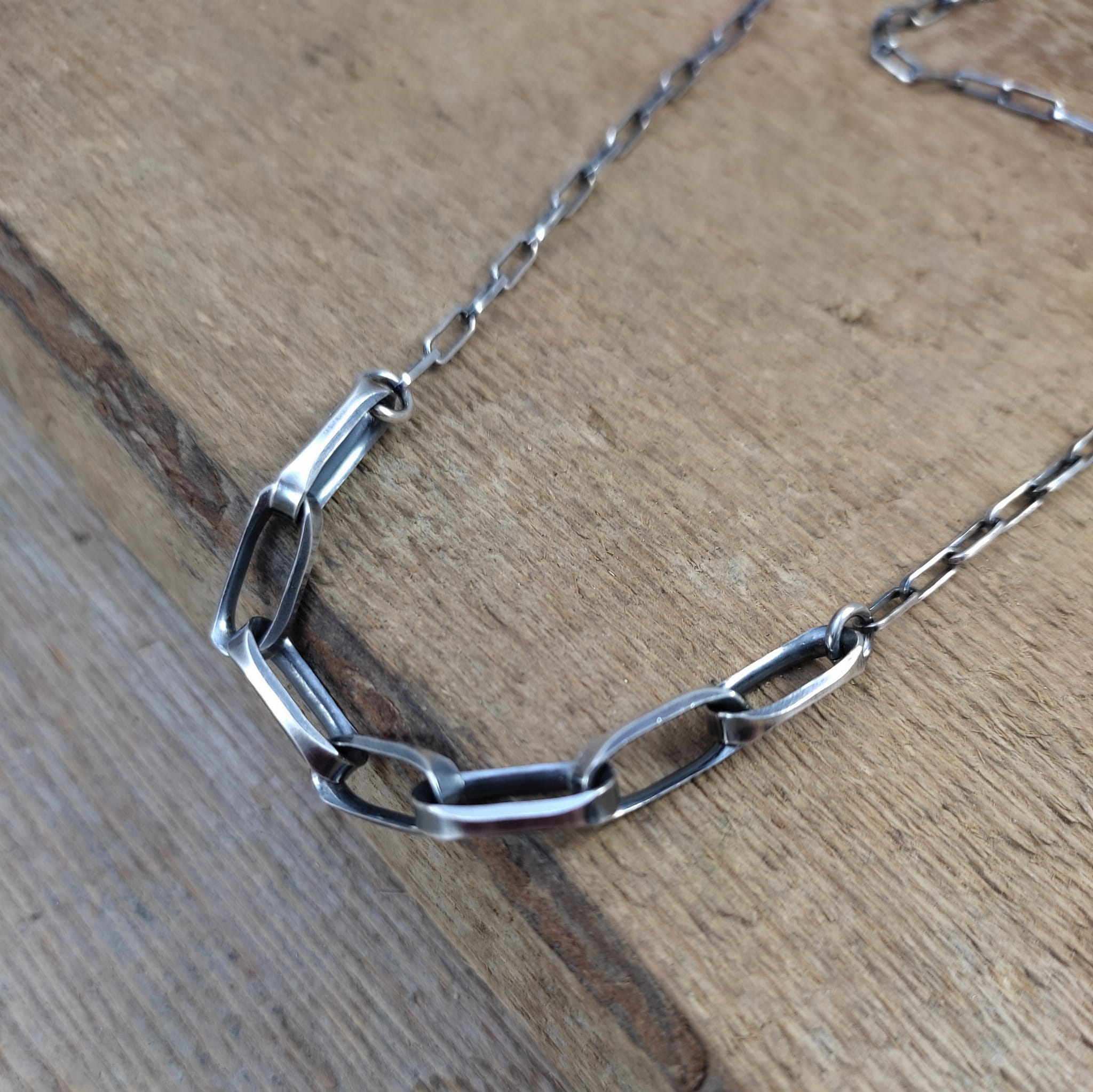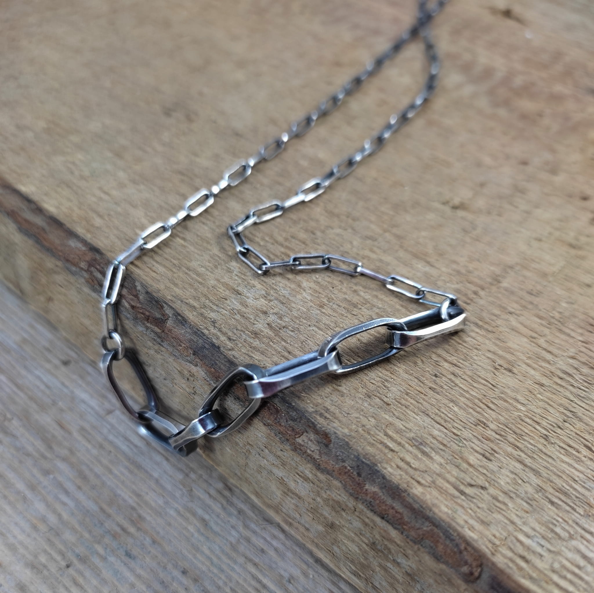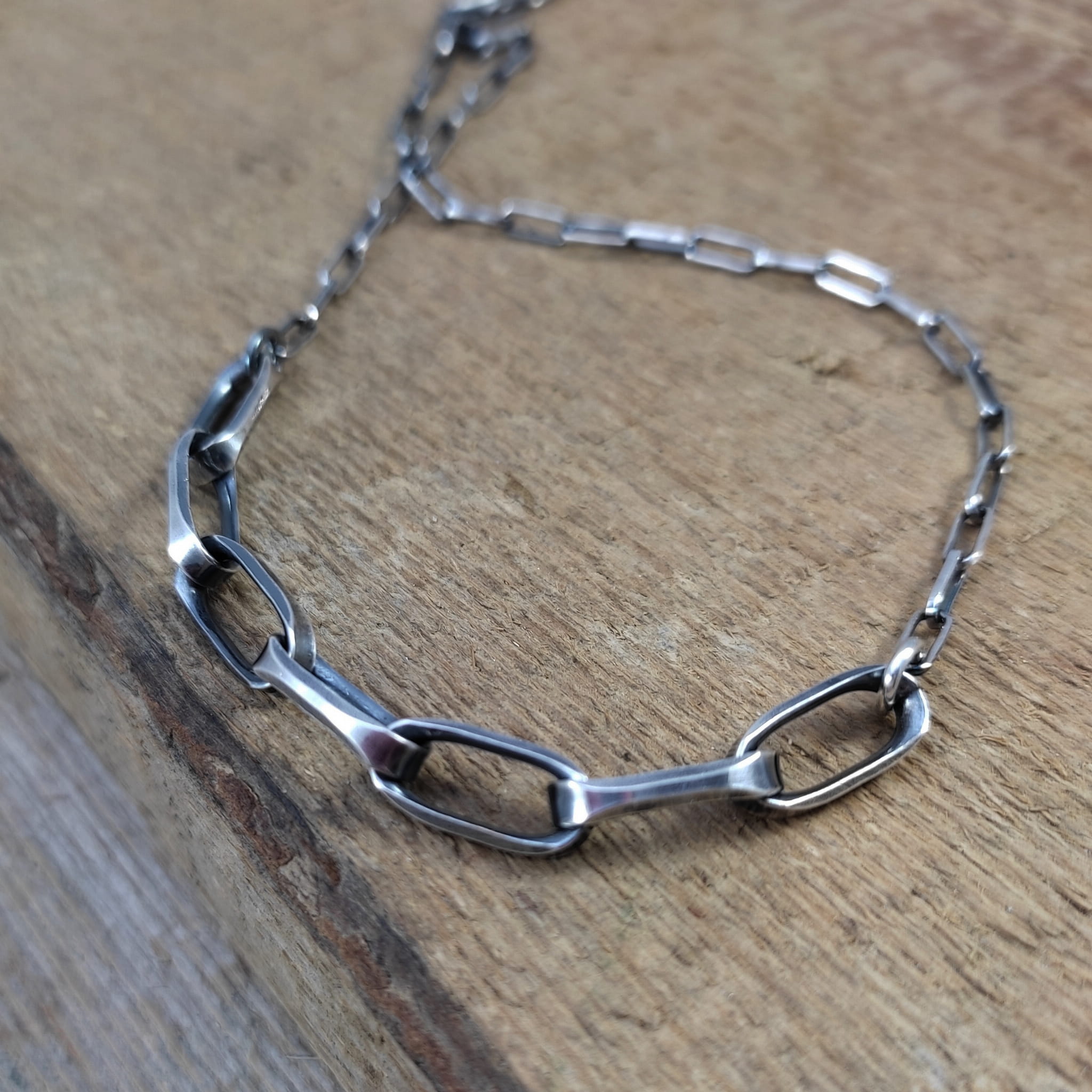 Naszyjnik wykonany ze srebra 925, oksydowanego i wypolerowanego.