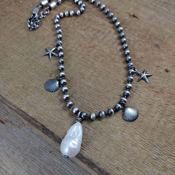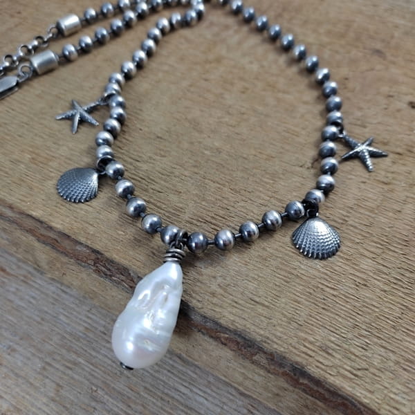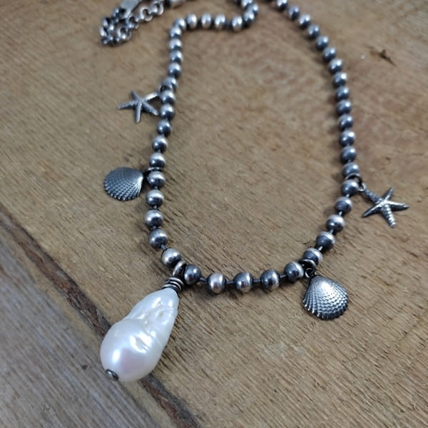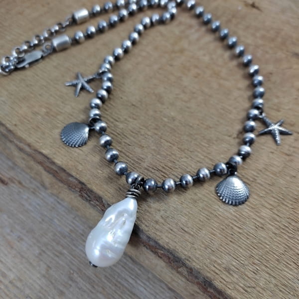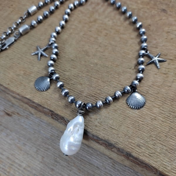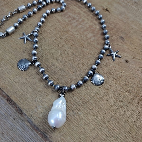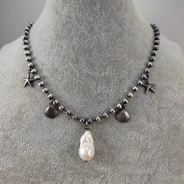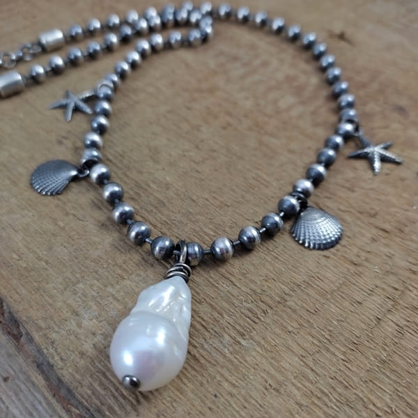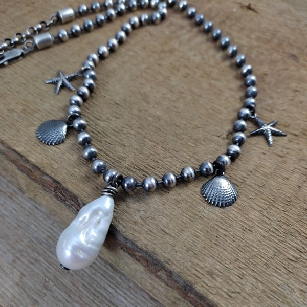 Naszyjnik wykonany ze srebra 925, oksydowanego i wypolerowanego. Długość naszyjnika wynosi ok. 45 cm, plus łańcuszek regulacyjny 5 cm. Średnica łańcuszka 5 mm.