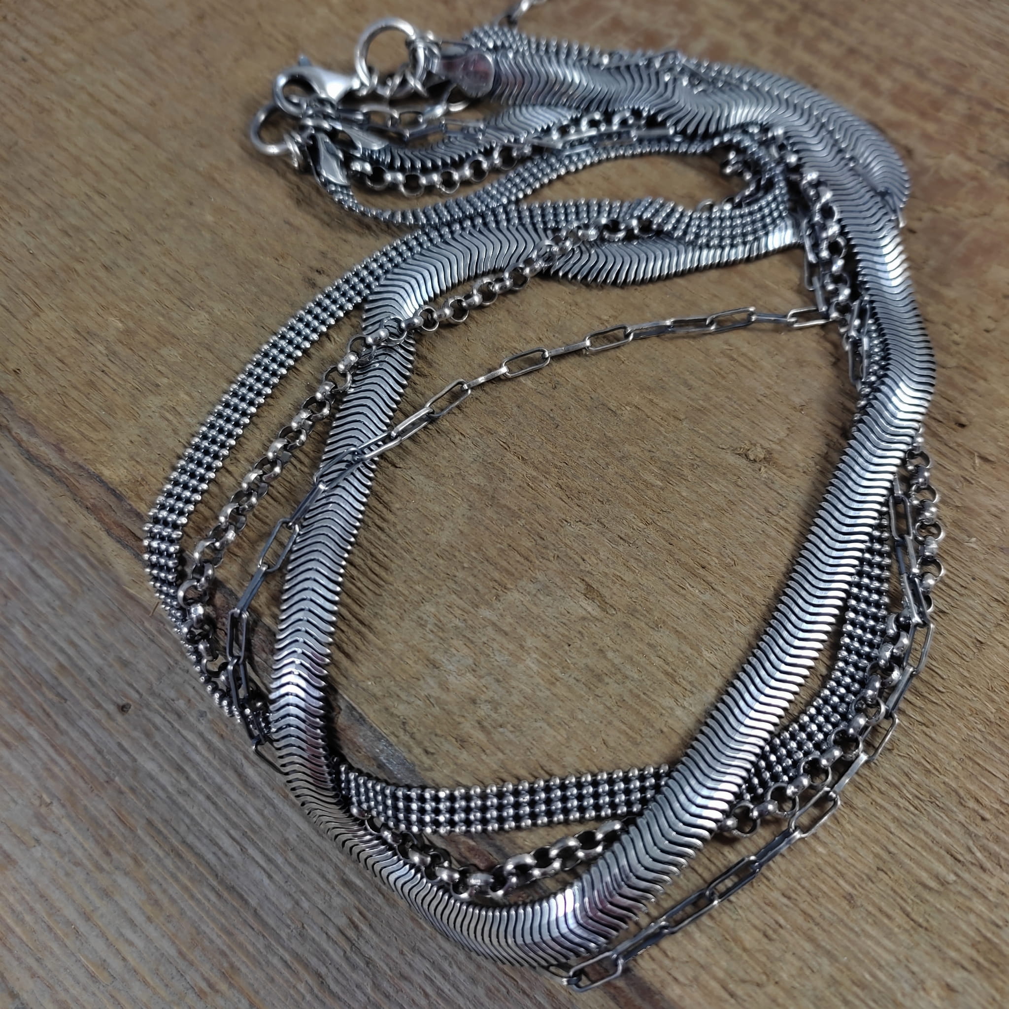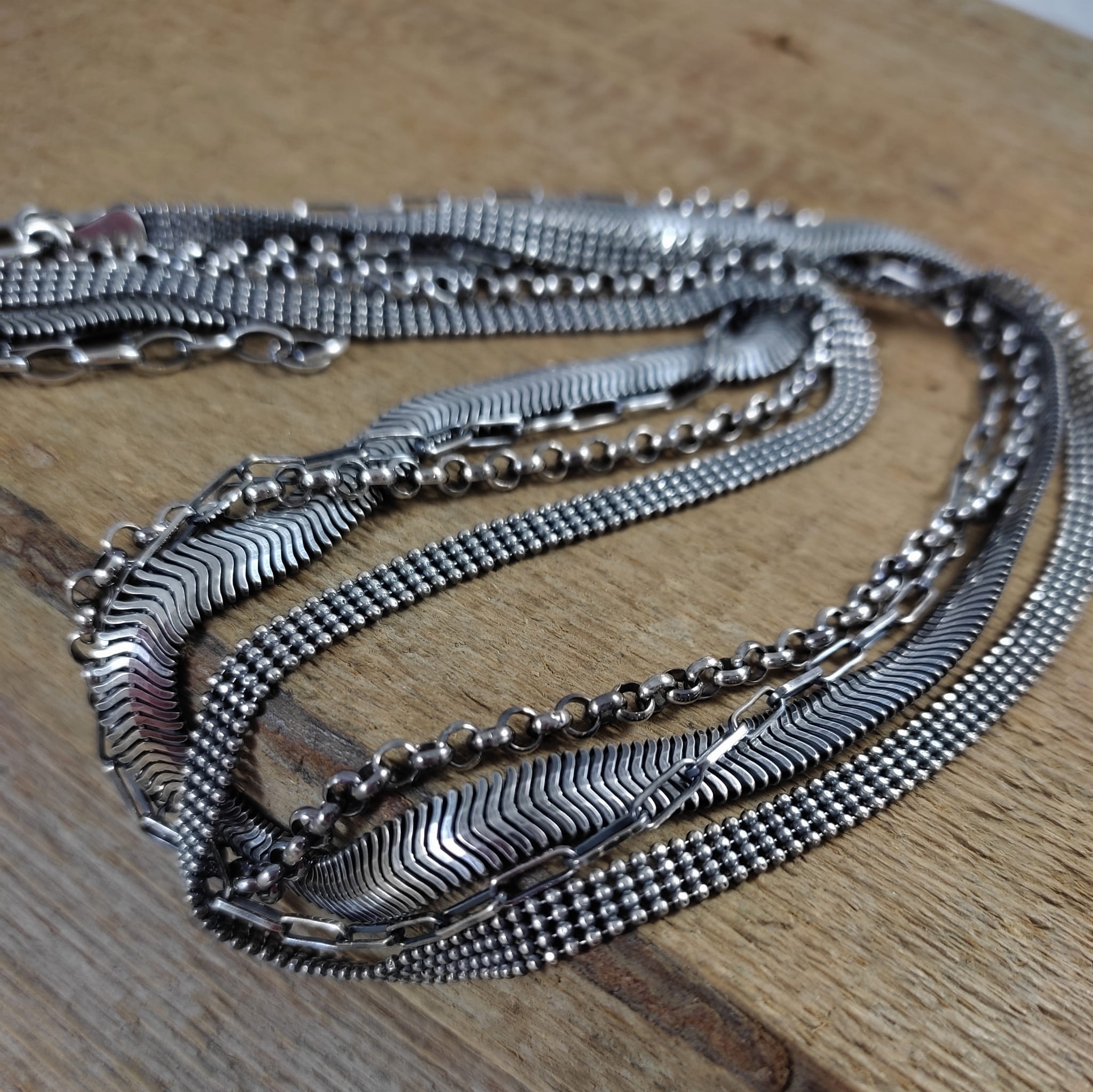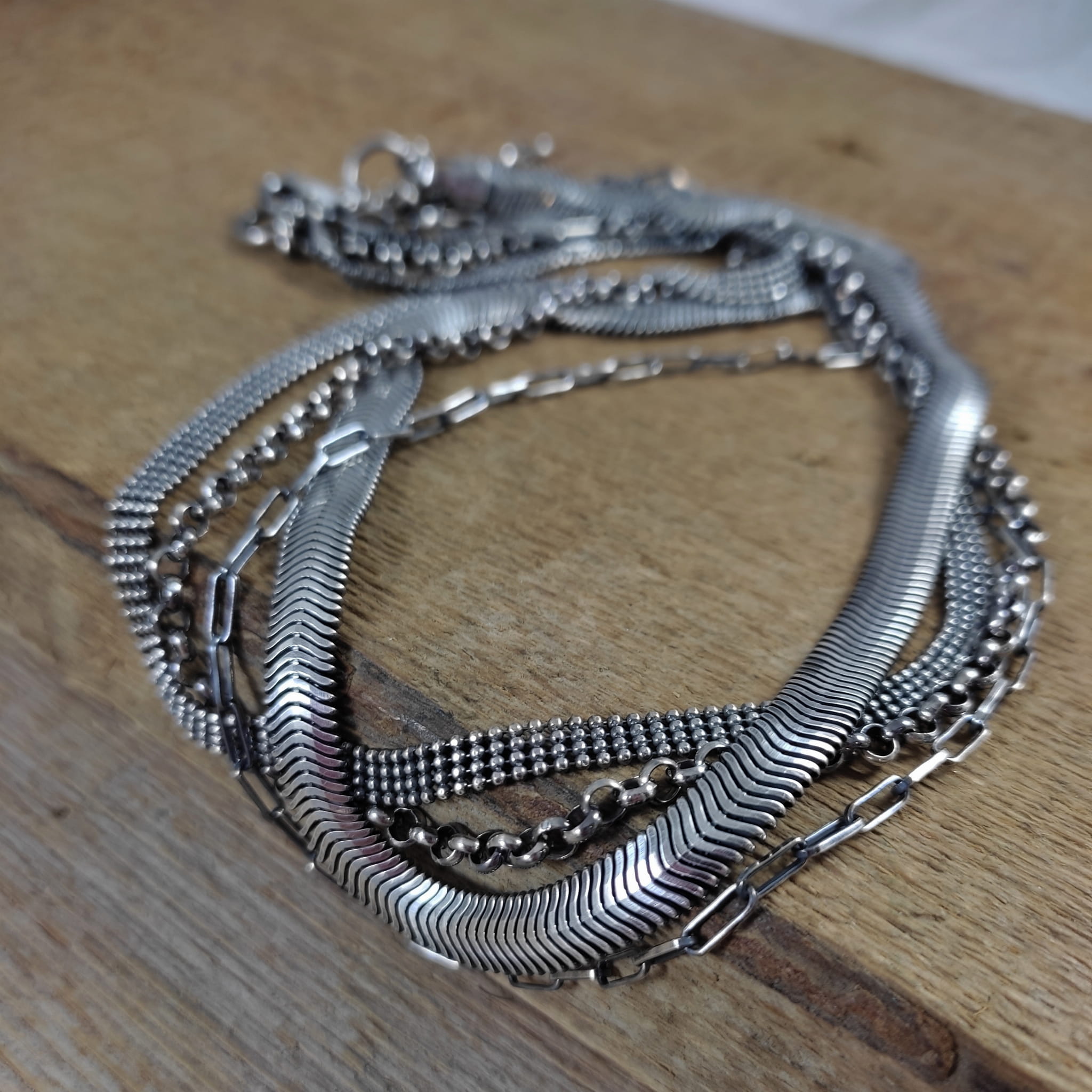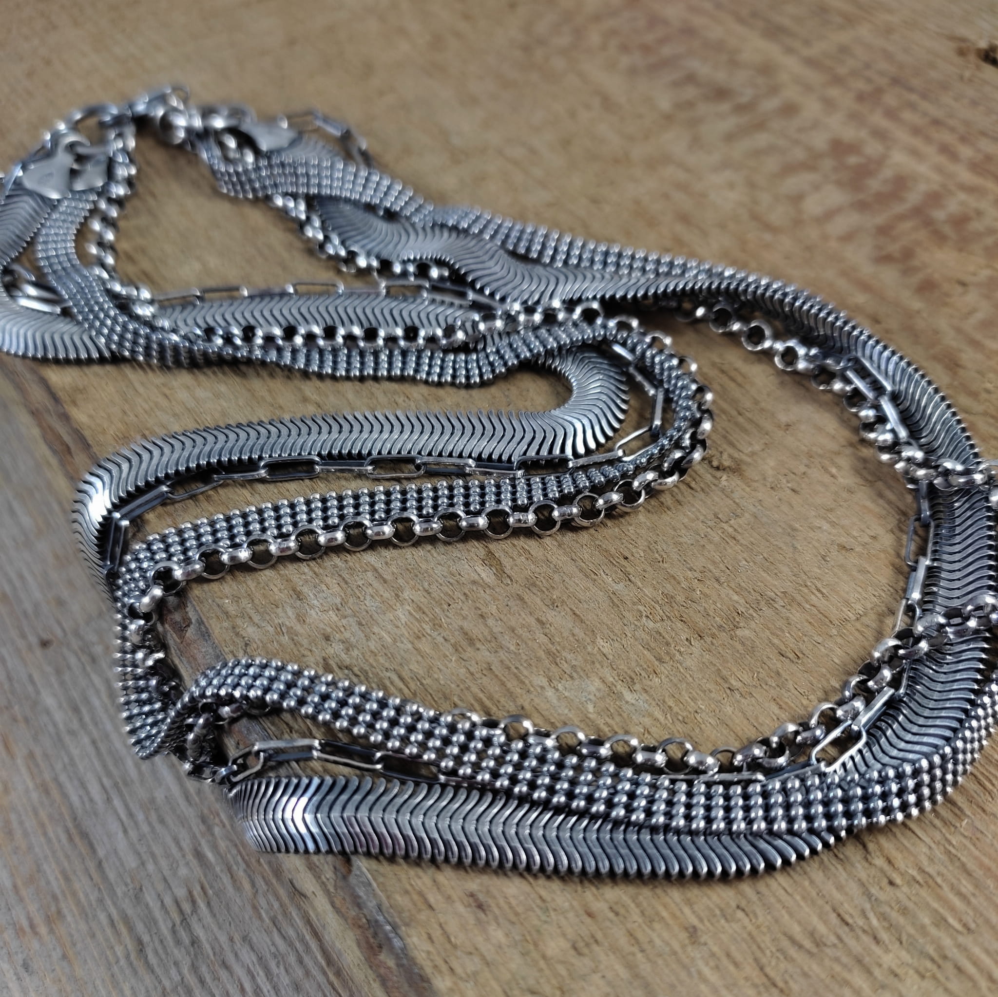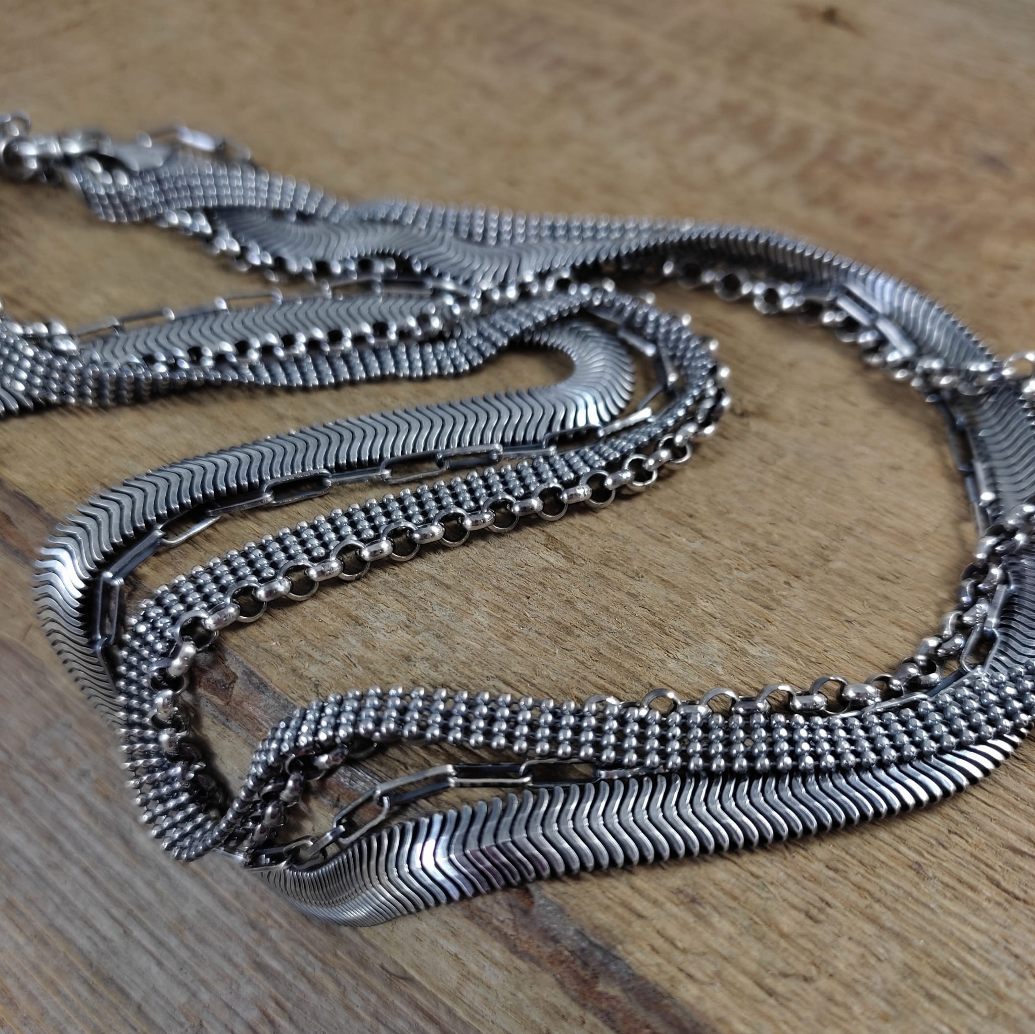 Naszyjnik wykonany ze srebra 925, oksydowanego i wypolerowanego (możliwość zamówienie w czystym srebrze, proszę o kontakt). Długość naszyjnika wynosi ok. 48 cm, plus łańcuszek regulacyjny 5 cm. Średnica łańcuszków 2.4-6.4 mm. Elegancko zapakowany.