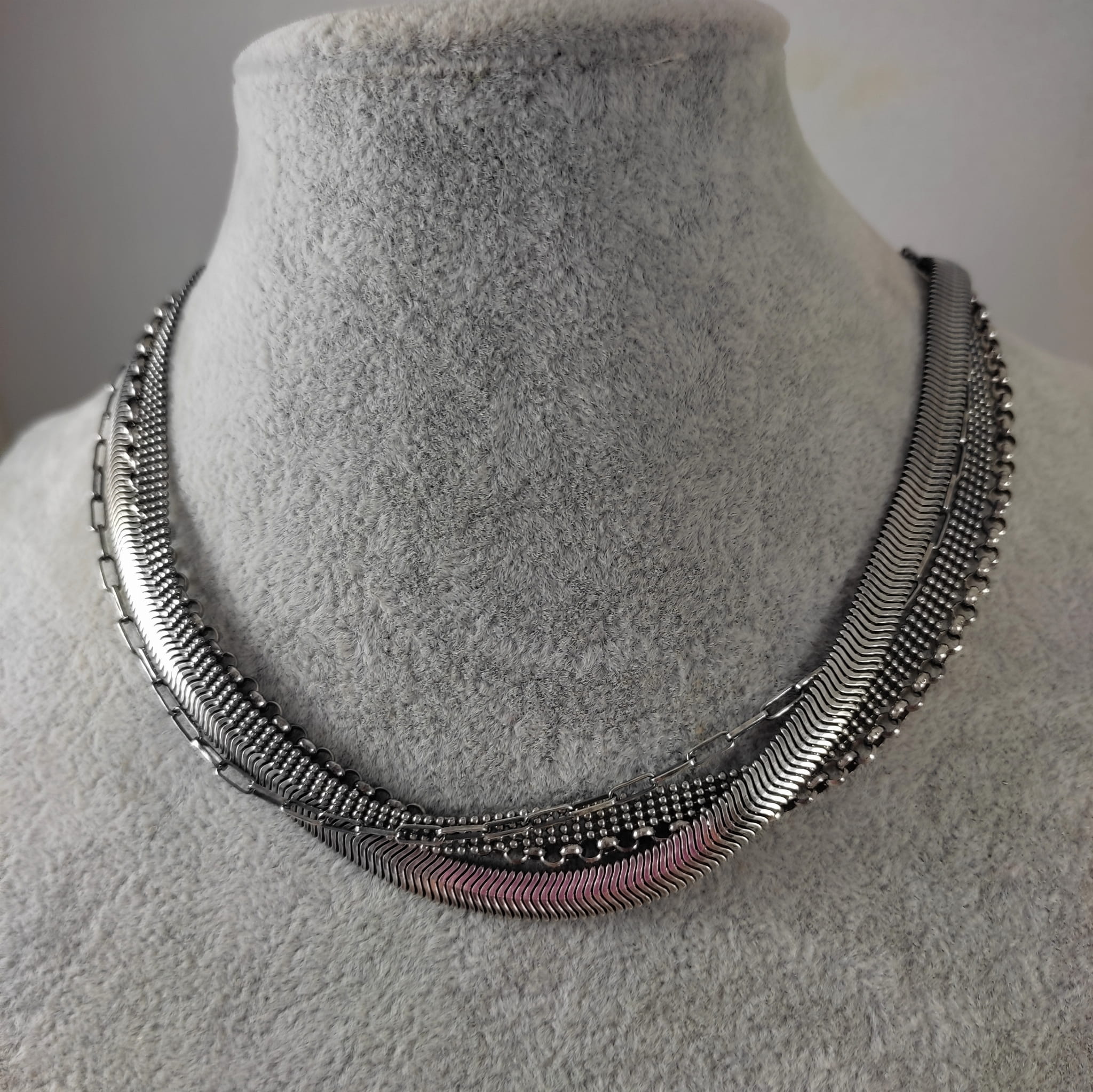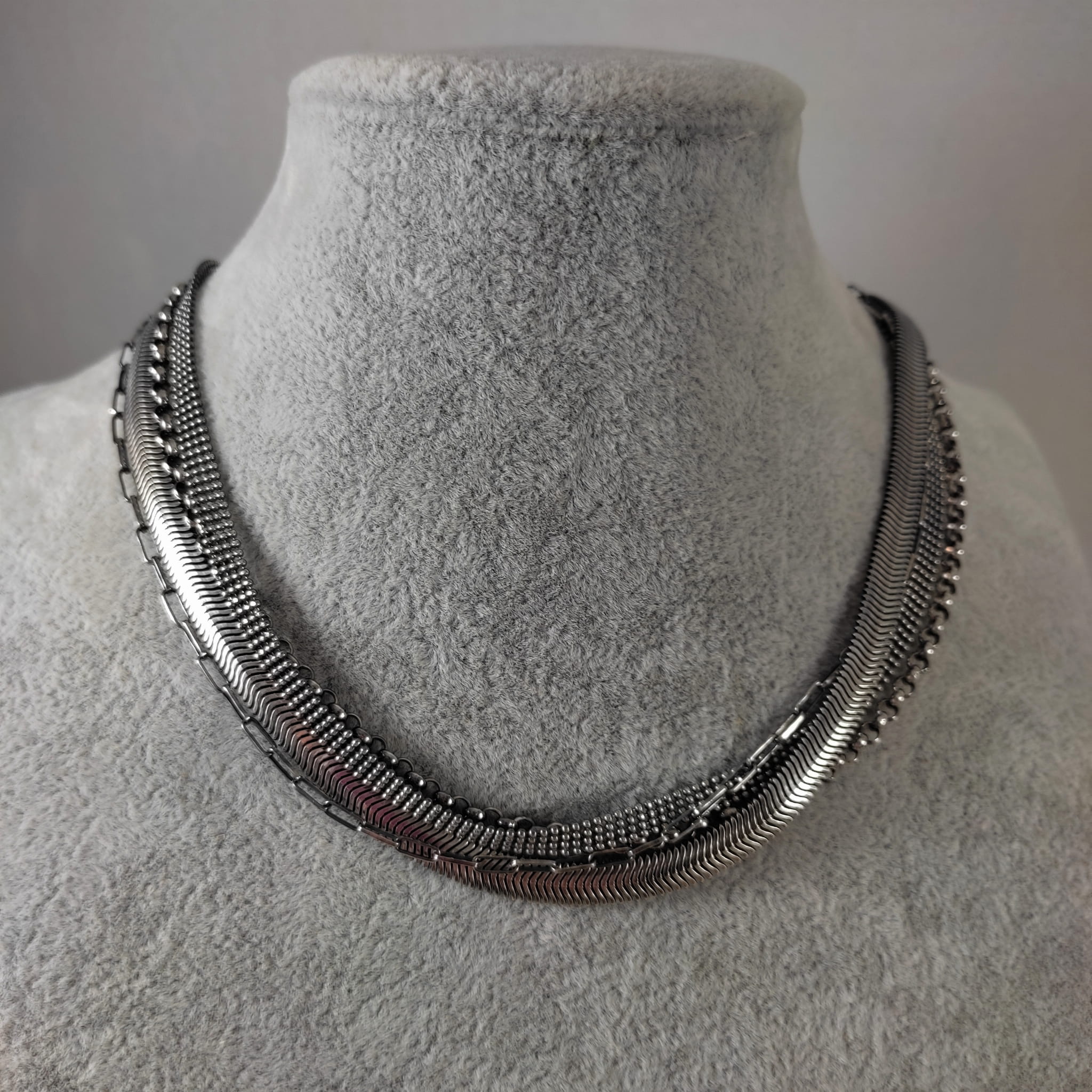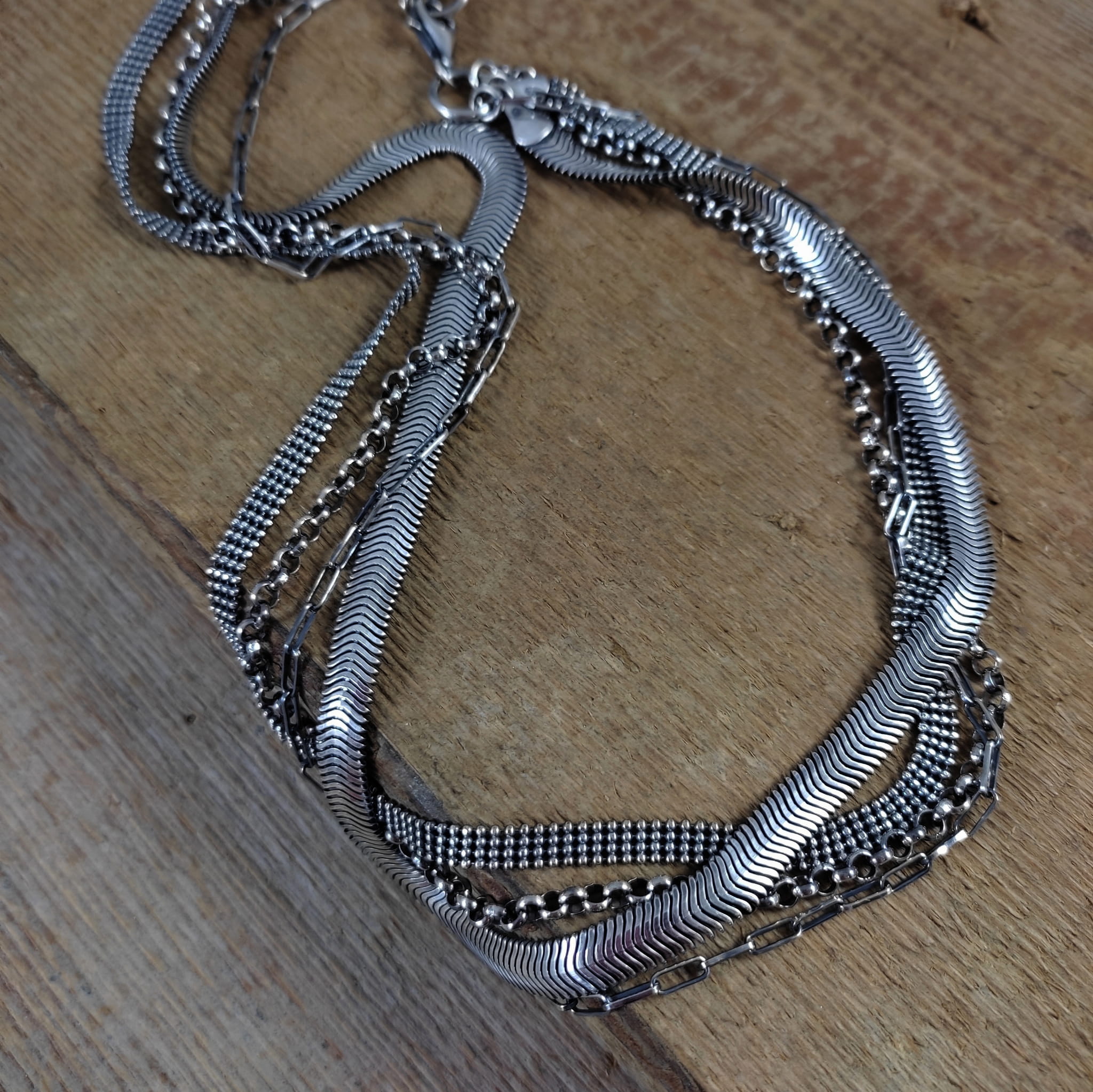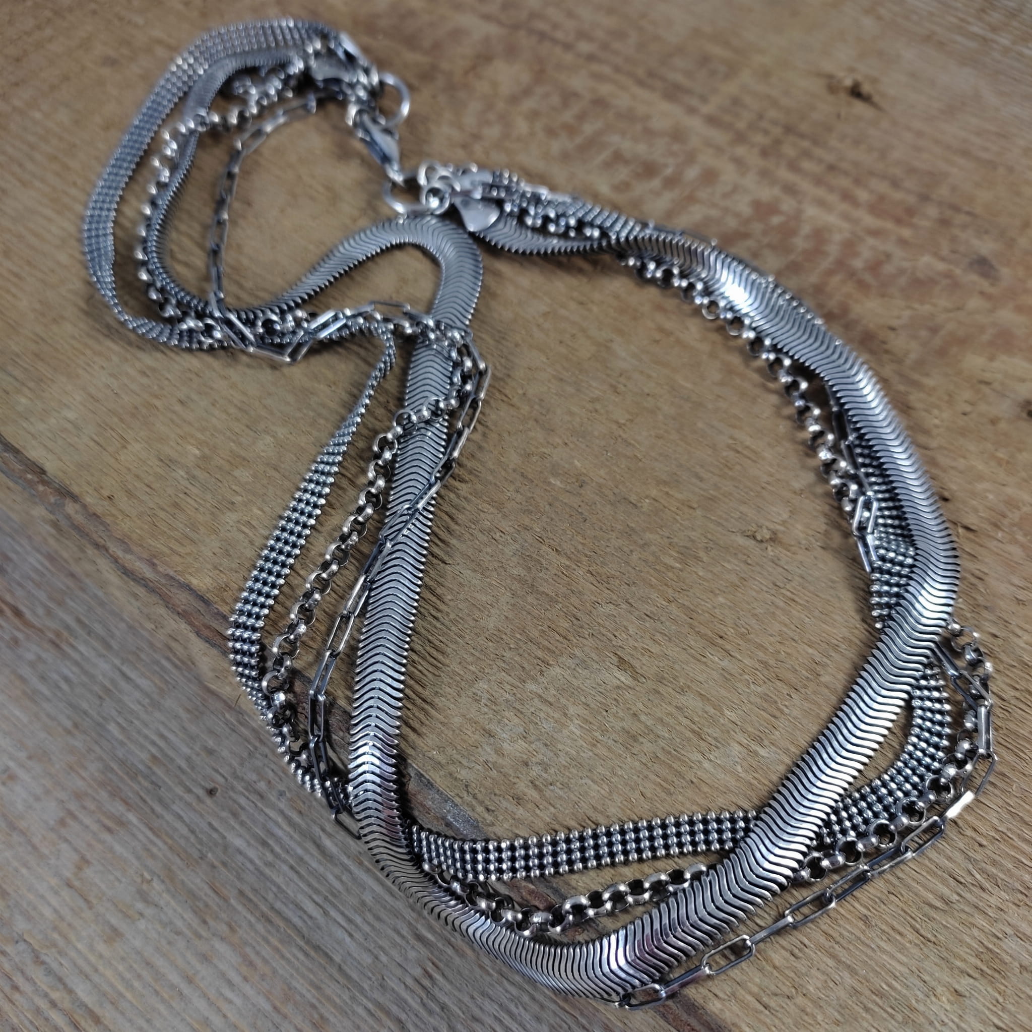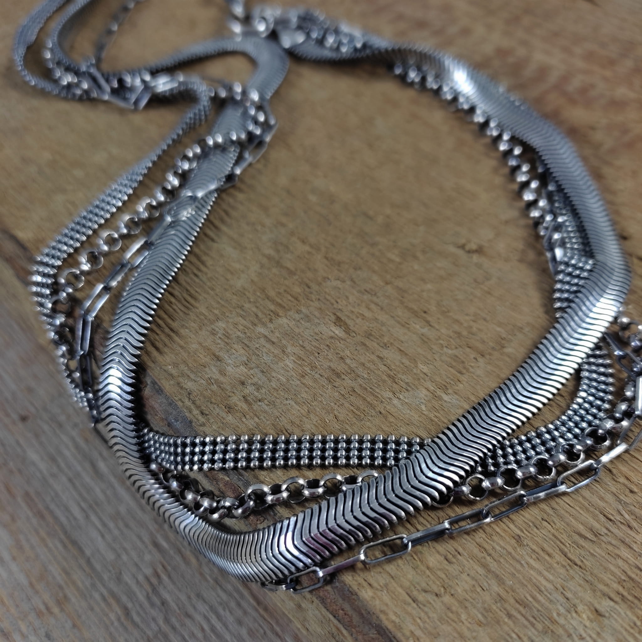 Naszyjnik wykonany ze srebra 925, oksydowanego i wypolerowanego (możliwość zamówienie w czystym srebrze, proszę o kontakt). Długość naszyjnika wynosi ok. 48 cm, plus łańcuszek regulacyjny 5 cm. Średnica łańcuszków 2.4-6.4 mm. Elegancko zapakowany.