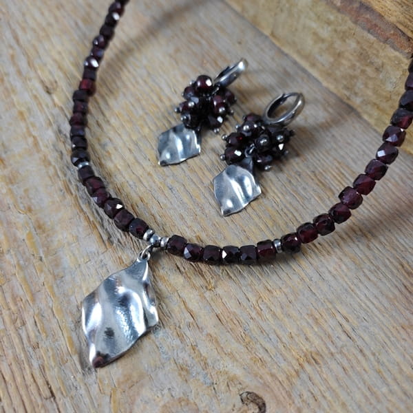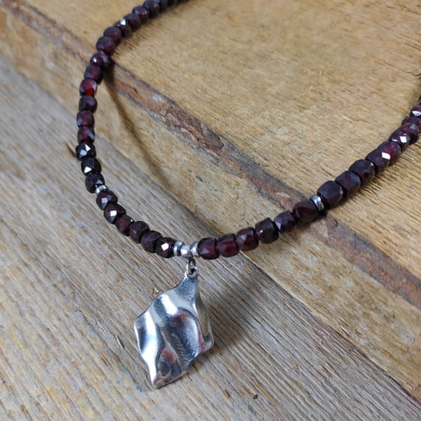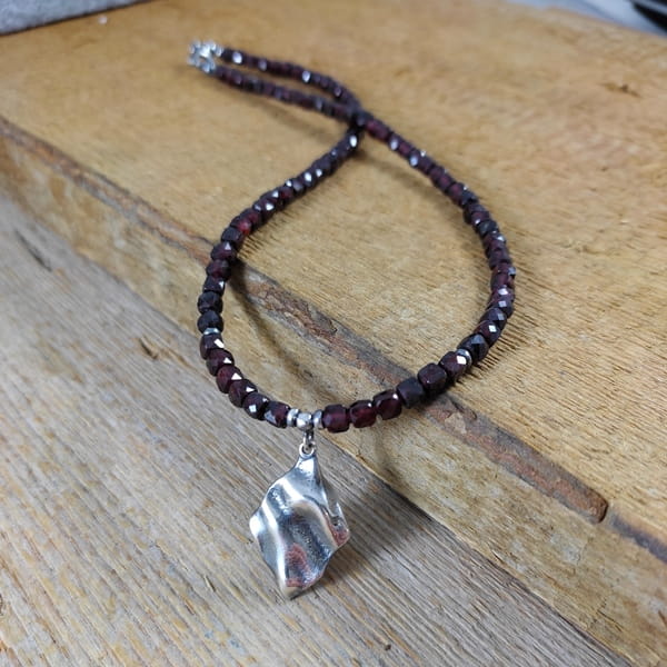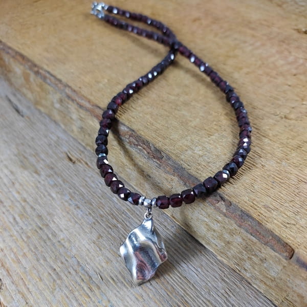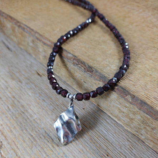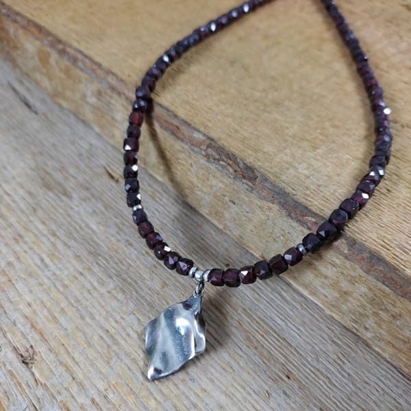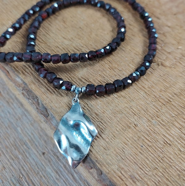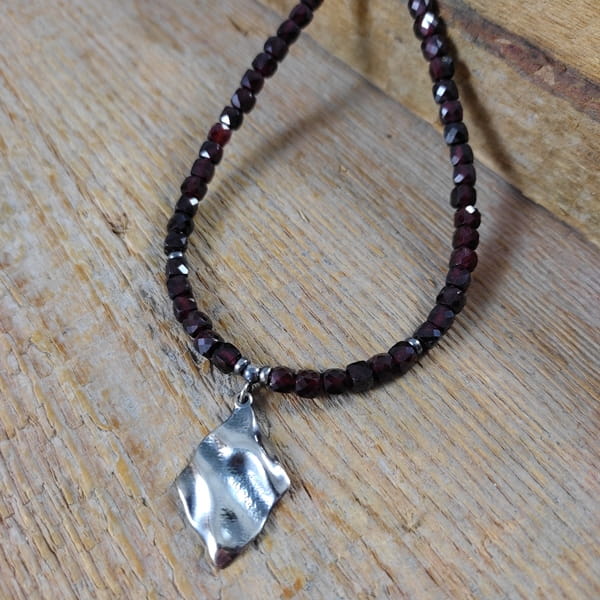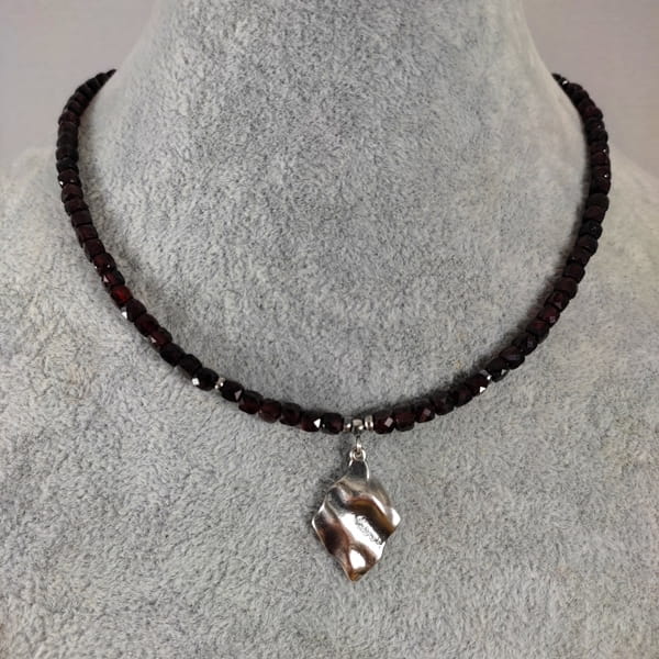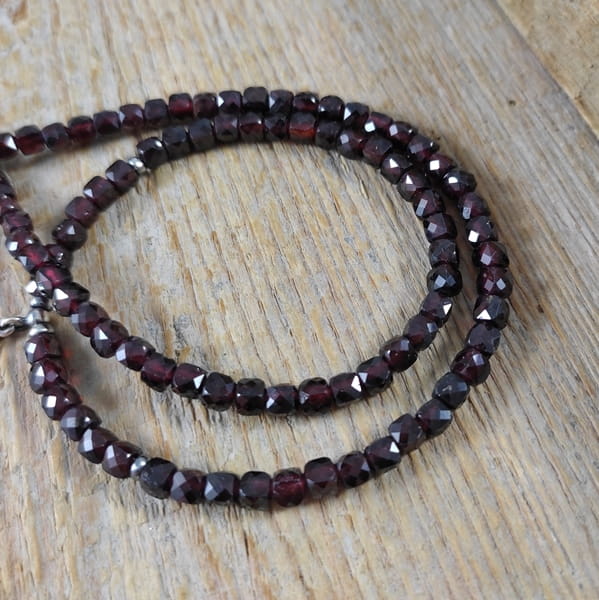 Delikatny naszyjnik wykonany z fasetowanych sześcianów granatu 3,5-4 mm. Całość wykończona w srebrze 925, oksydowanym i wypolerowanym. Długość naszyjnika wynosi ok. 39 cm, plus łańcuszek regulacyjny 5 cm. Elegancko zapakowany. Kamienie posiadają delikatne niedoskonałości.