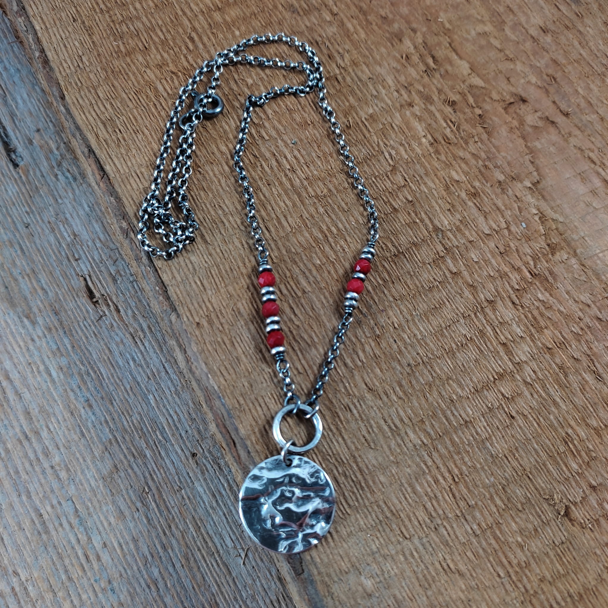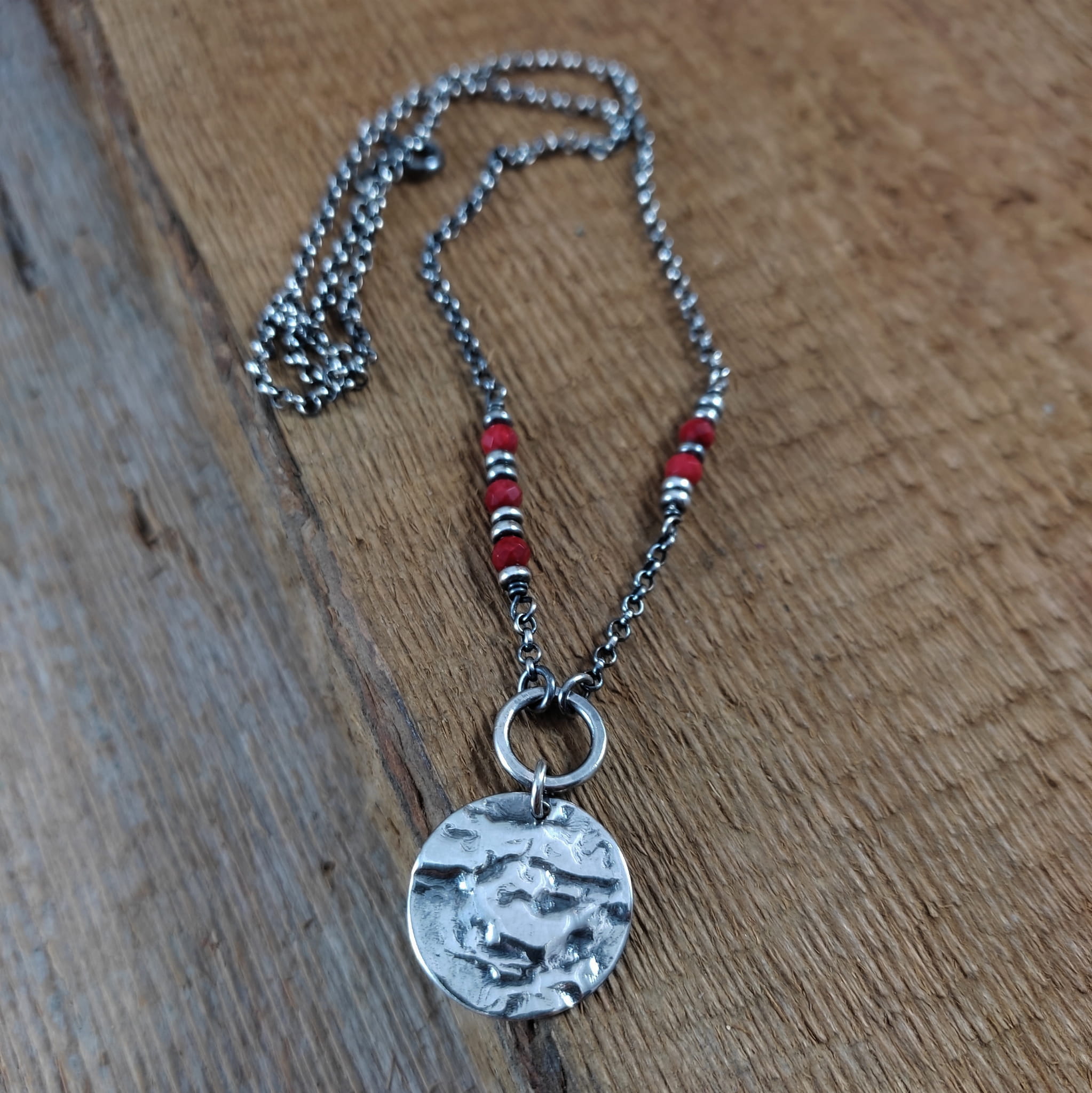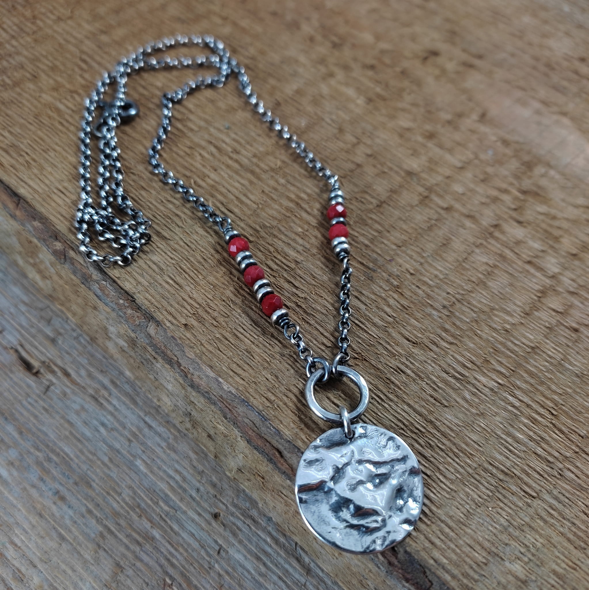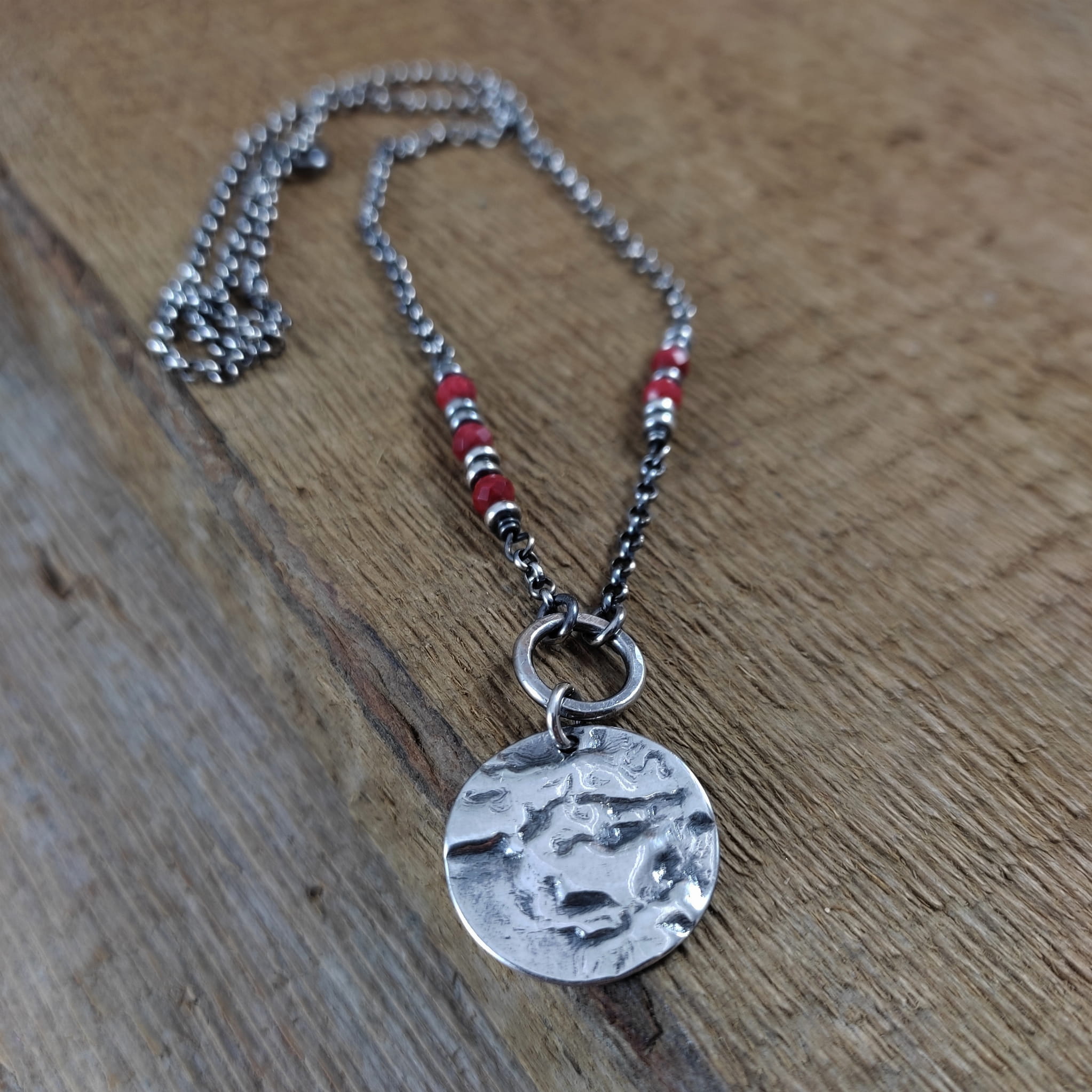 Naszyjnik wykonany ze srebra 925, oksydowanego i wypolerowanego (w tym blaszka 19 mm) oraz fasetowanych kul korala 4 mm.