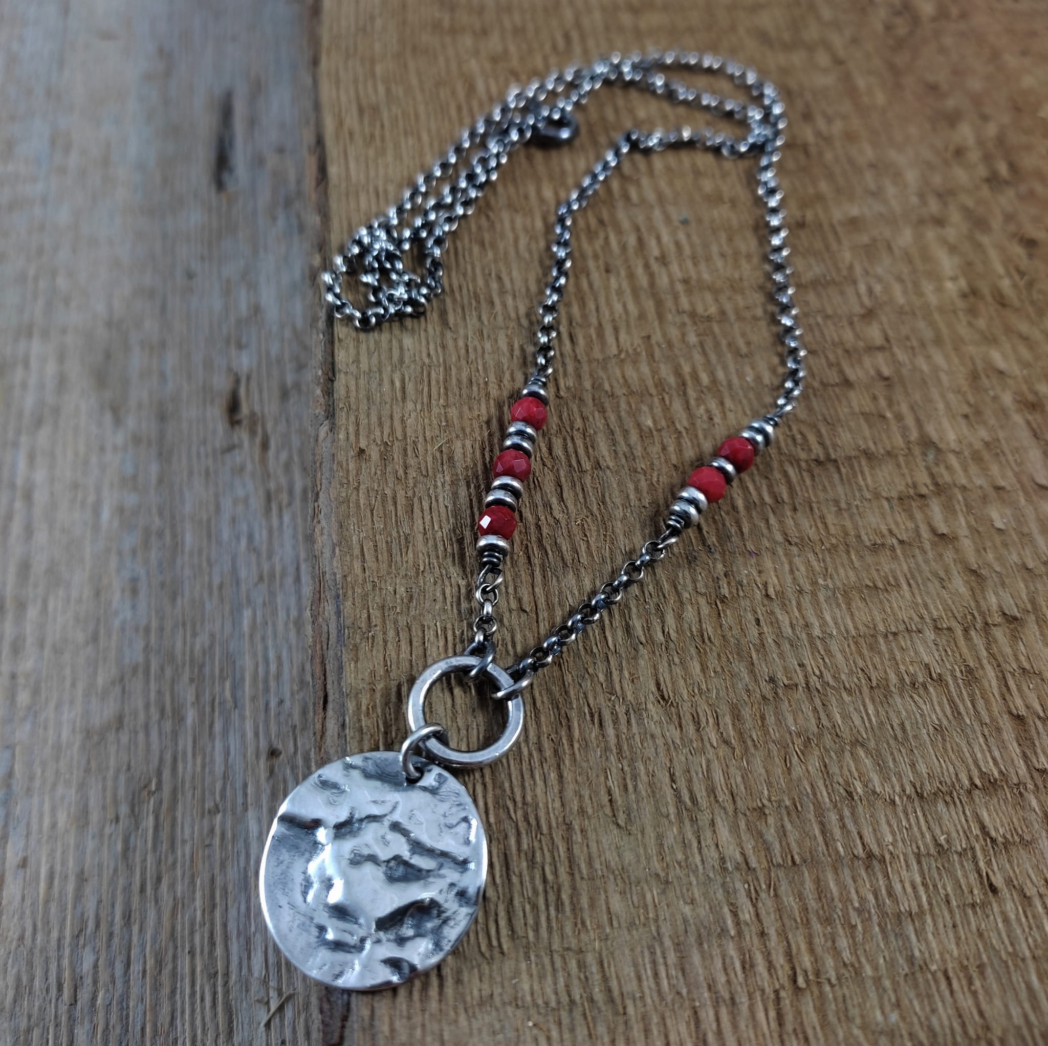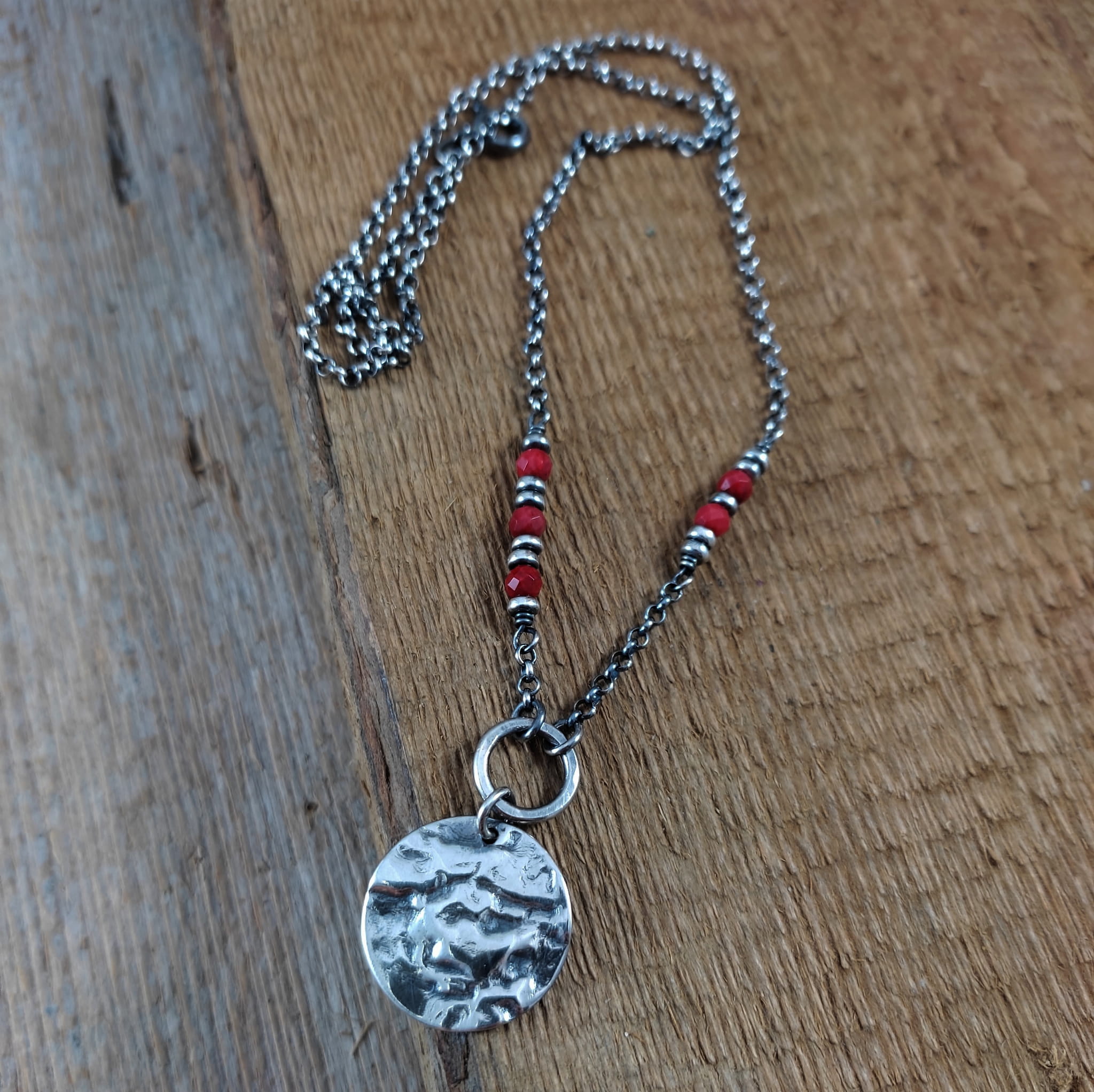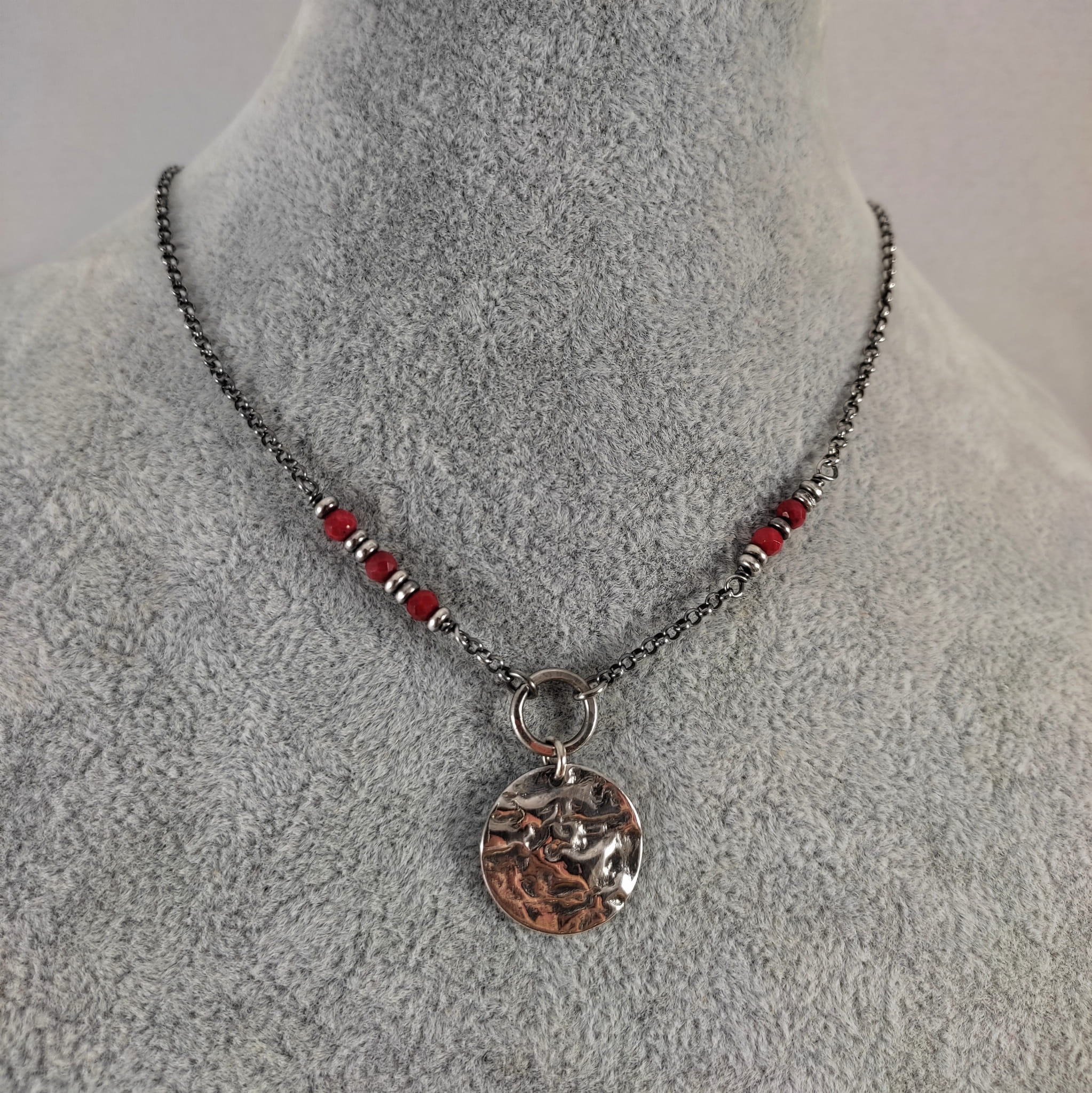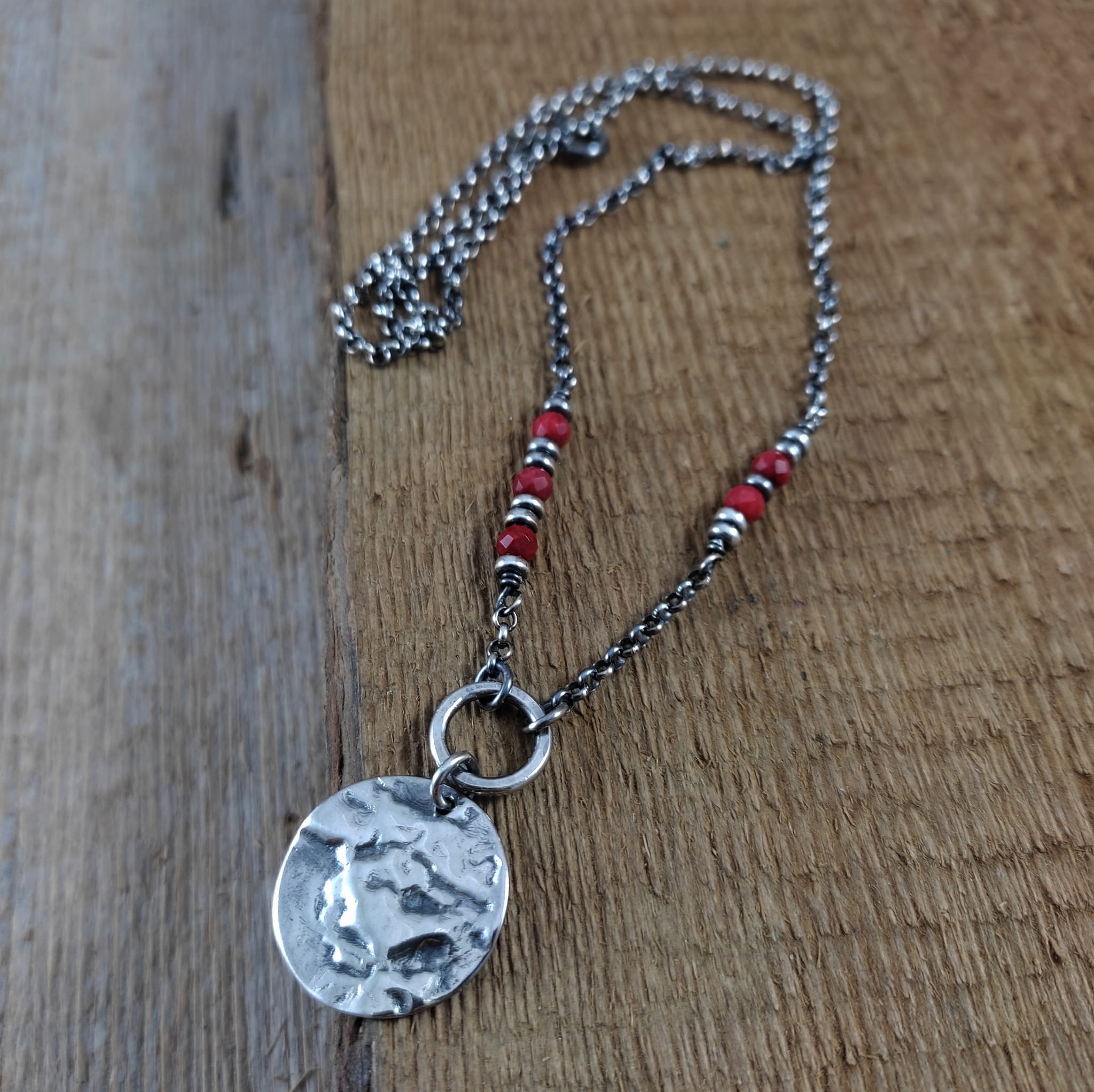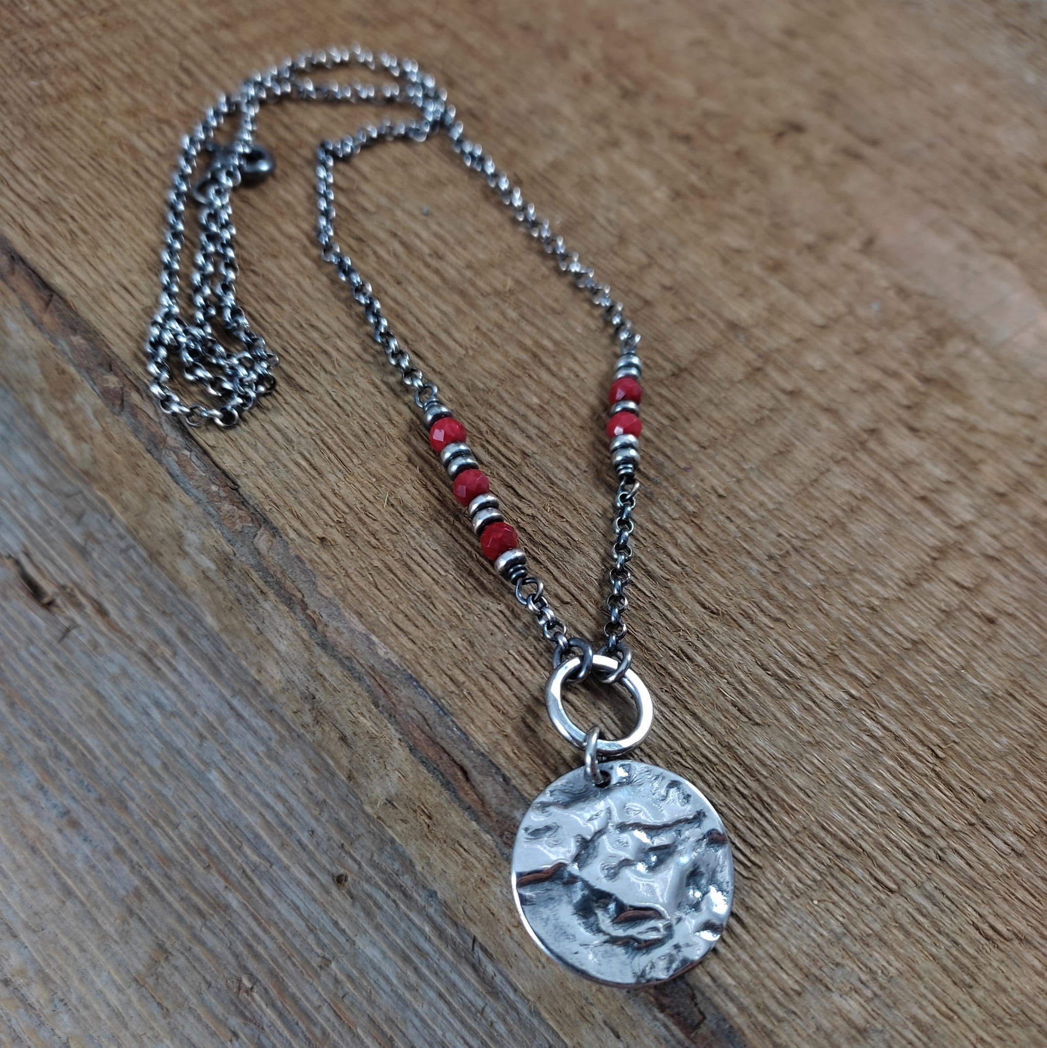 Naszyjnik wykonany ze srebra 925, oksydowanego i wypolerowanego (w tym blaszka 19 mm) oraz fasetowanych kul korala 4 mm.