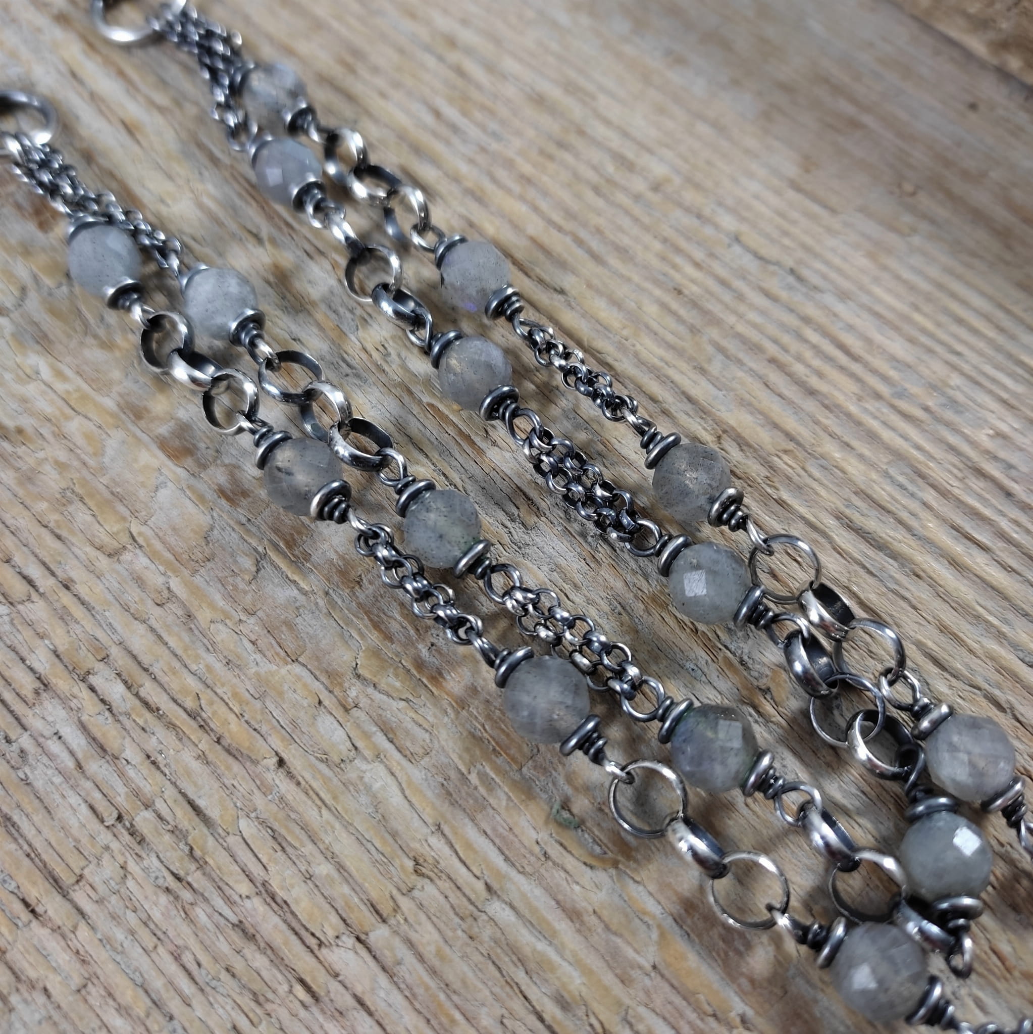 Naszyjnik wykonany z fasetowanych kul labradorytu 6 mm. Całość dopełniona srebrem 925, oksydowanym i wypolerowanym.