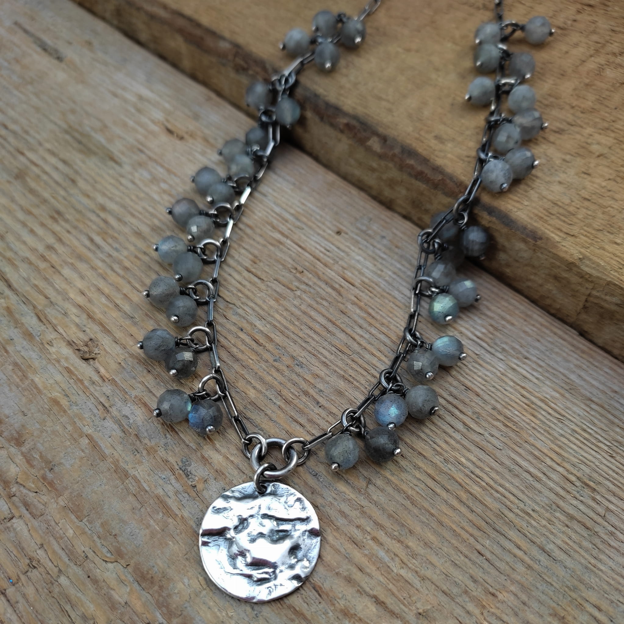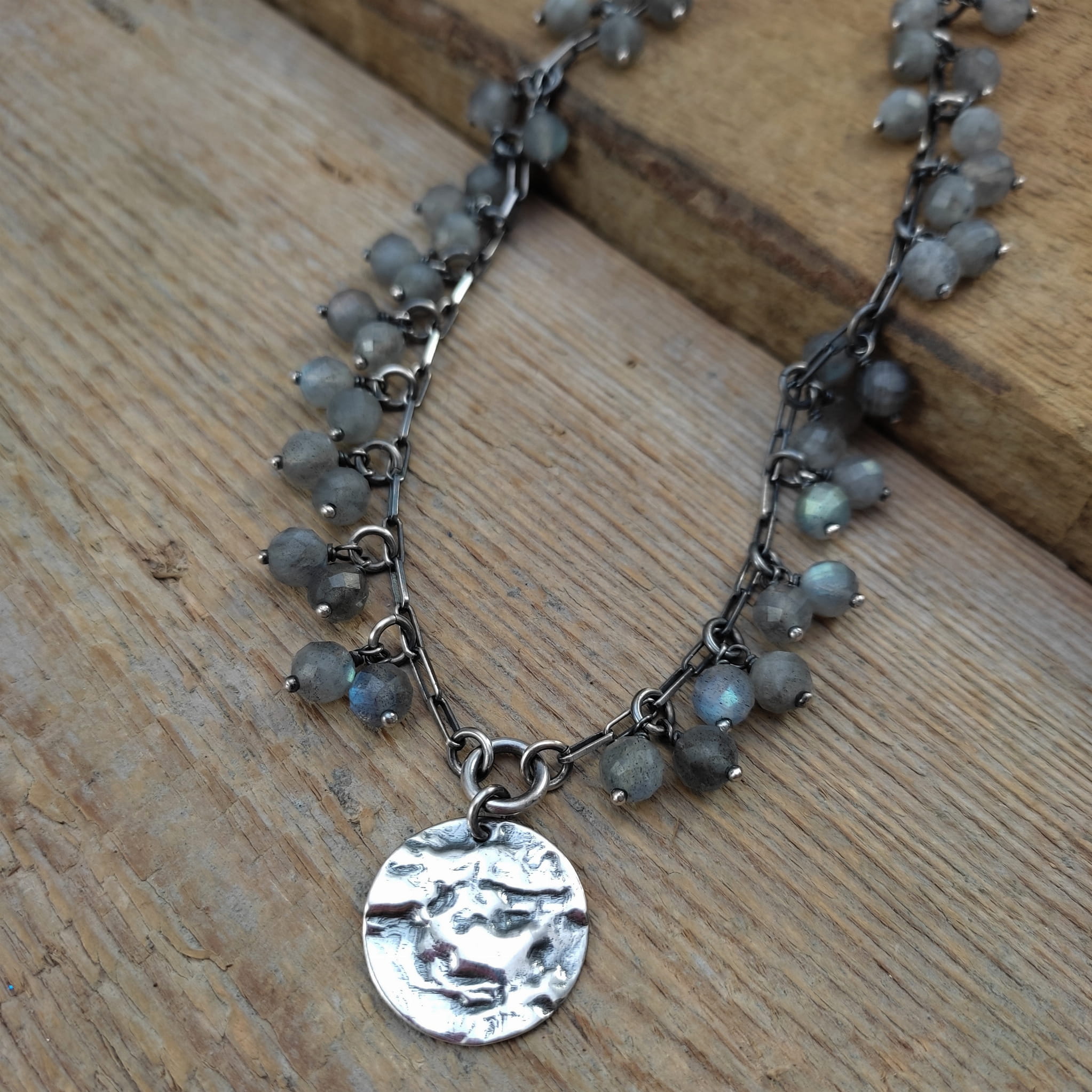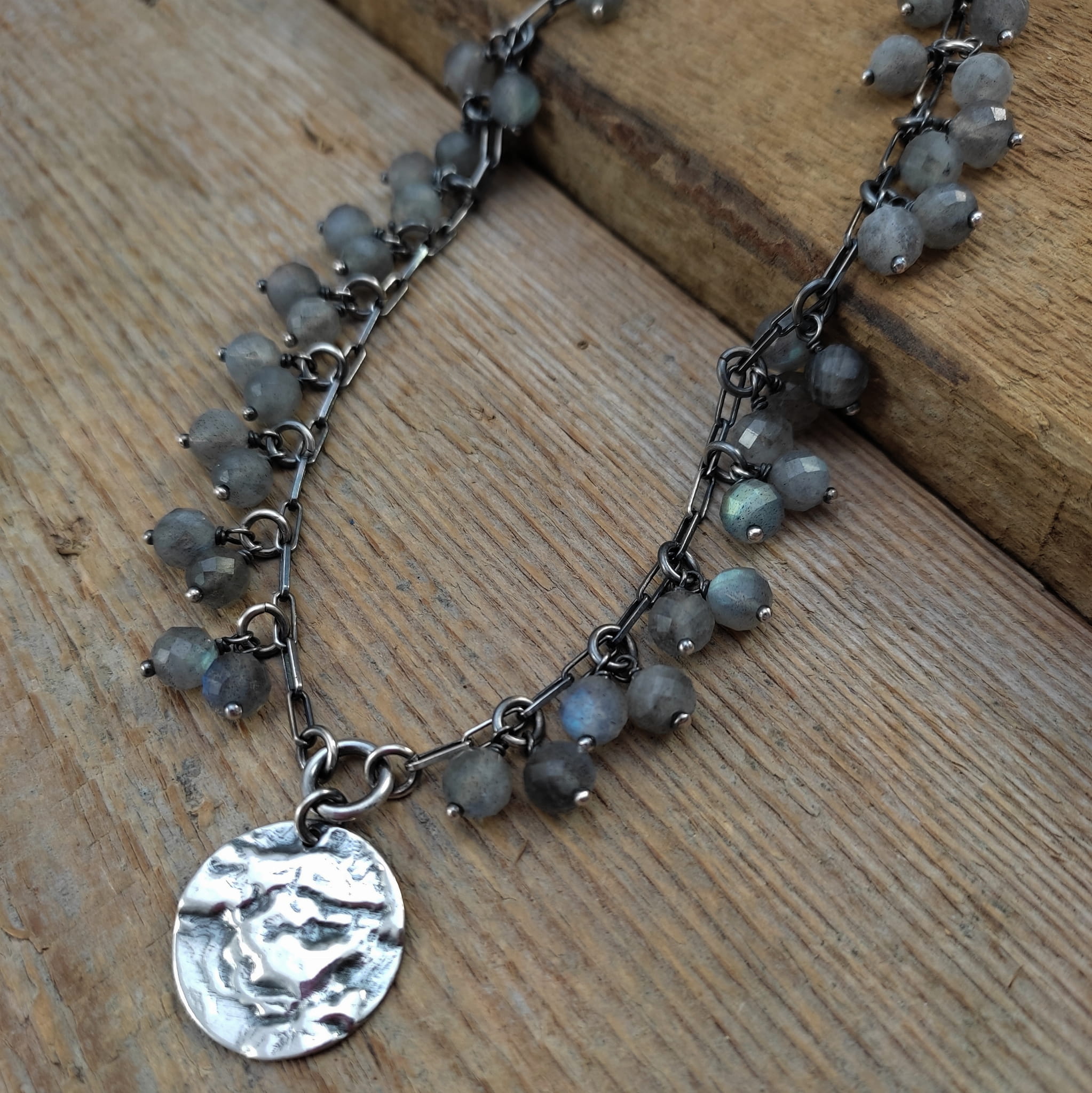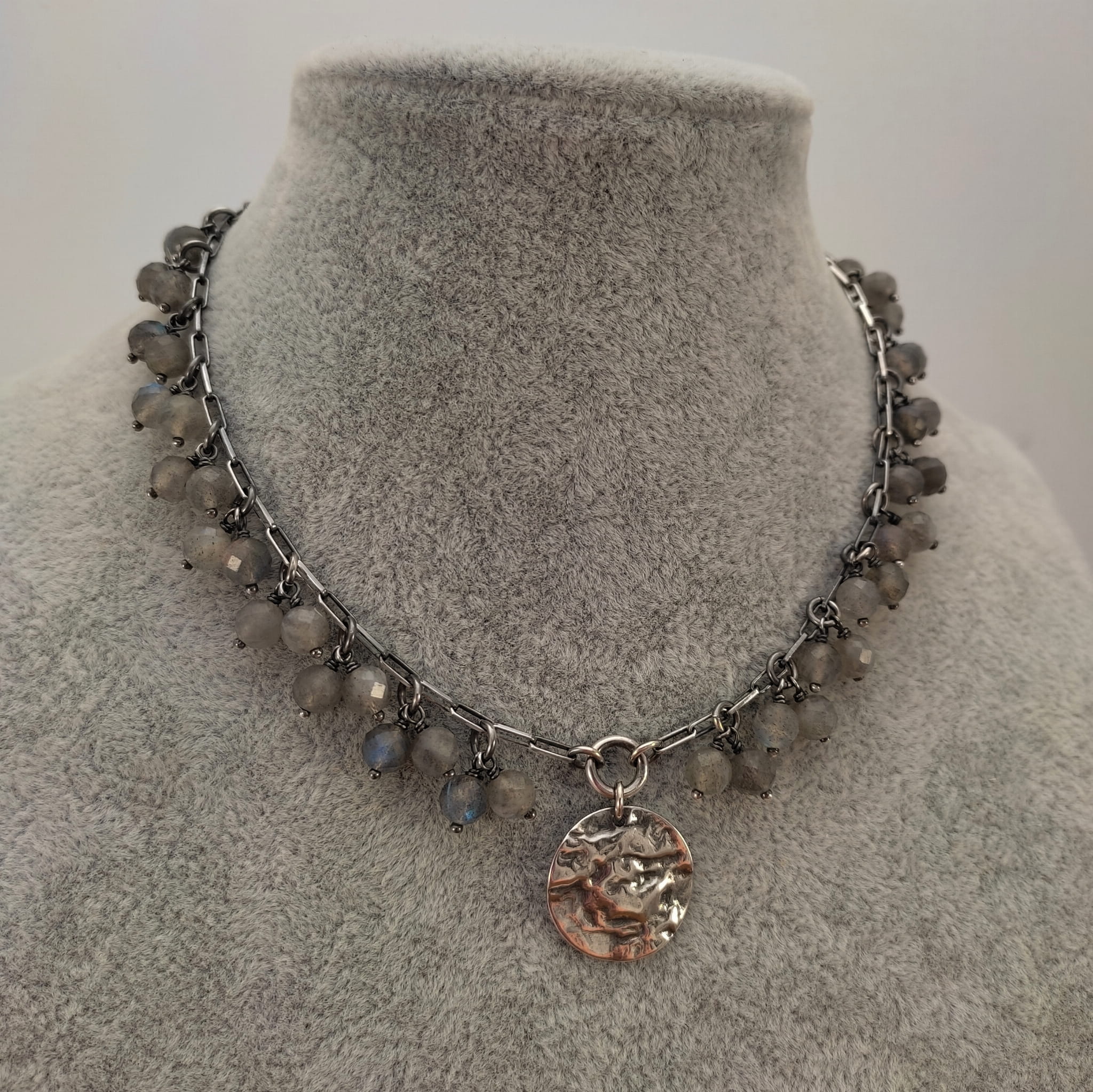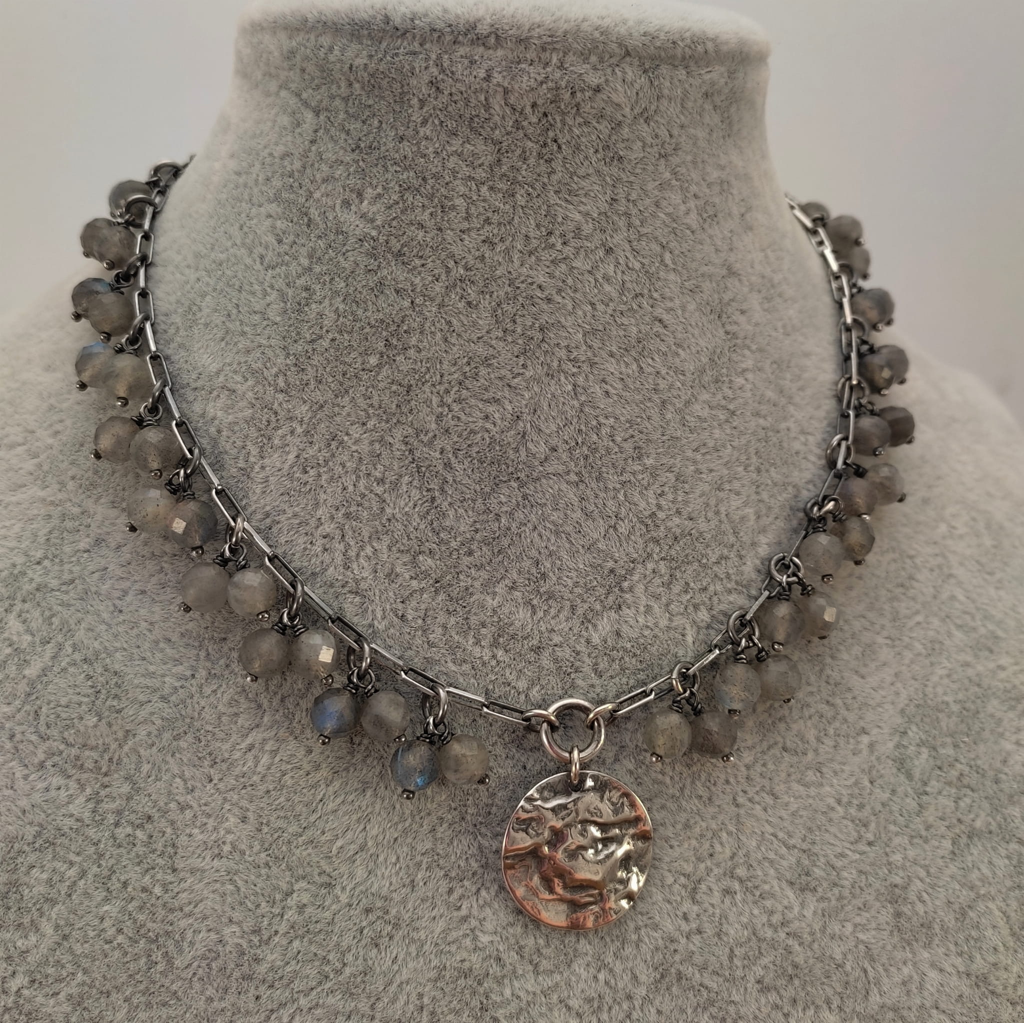 Naszyjnik wykonany z fasetowanych kul labradorytu 6 mm. Całość wykończona w srebrze 925, oksydowanym i wypolerowanym. Długość naszyjnika wynosi ok. 40/45/50 cm, plus łańcuszek regulacyjny 5 cm. (Proszę wpisać w komentarzu, w przypadku braku wysyłamy 45 cm). Wielkość blaszki ok. 19 mm.