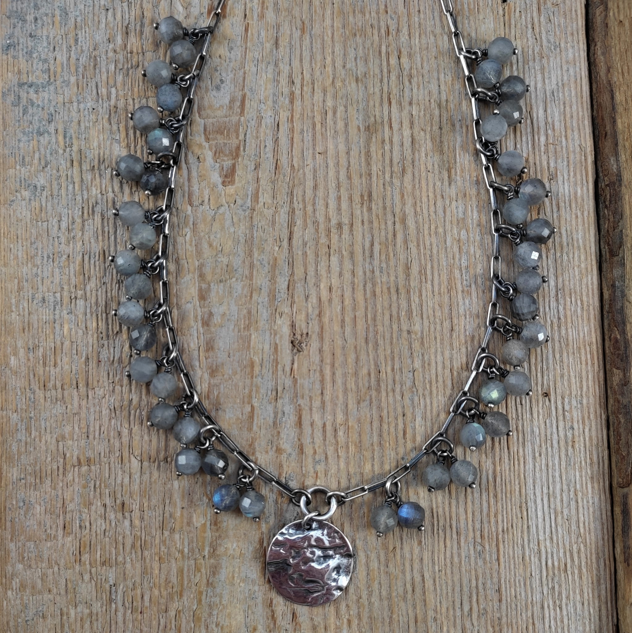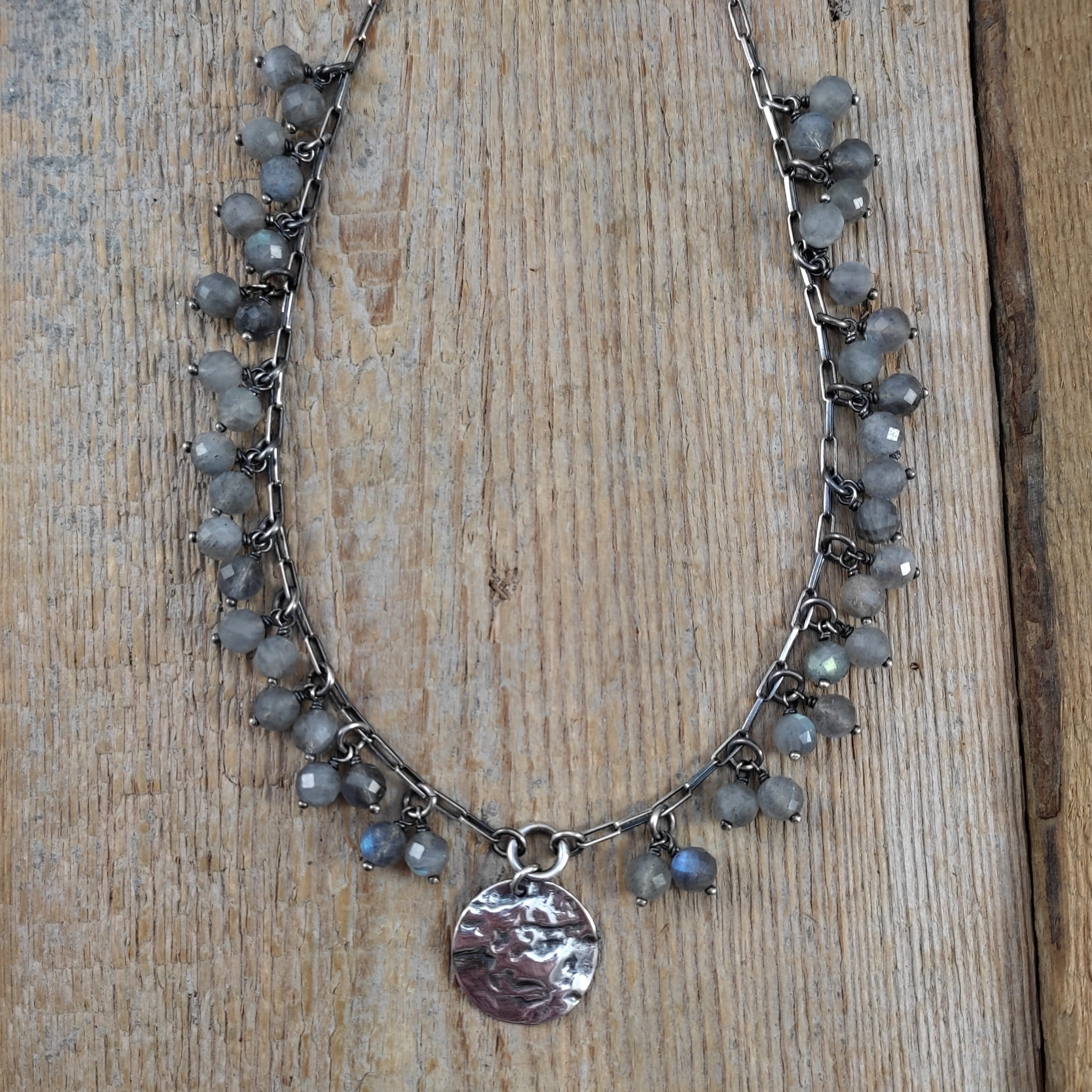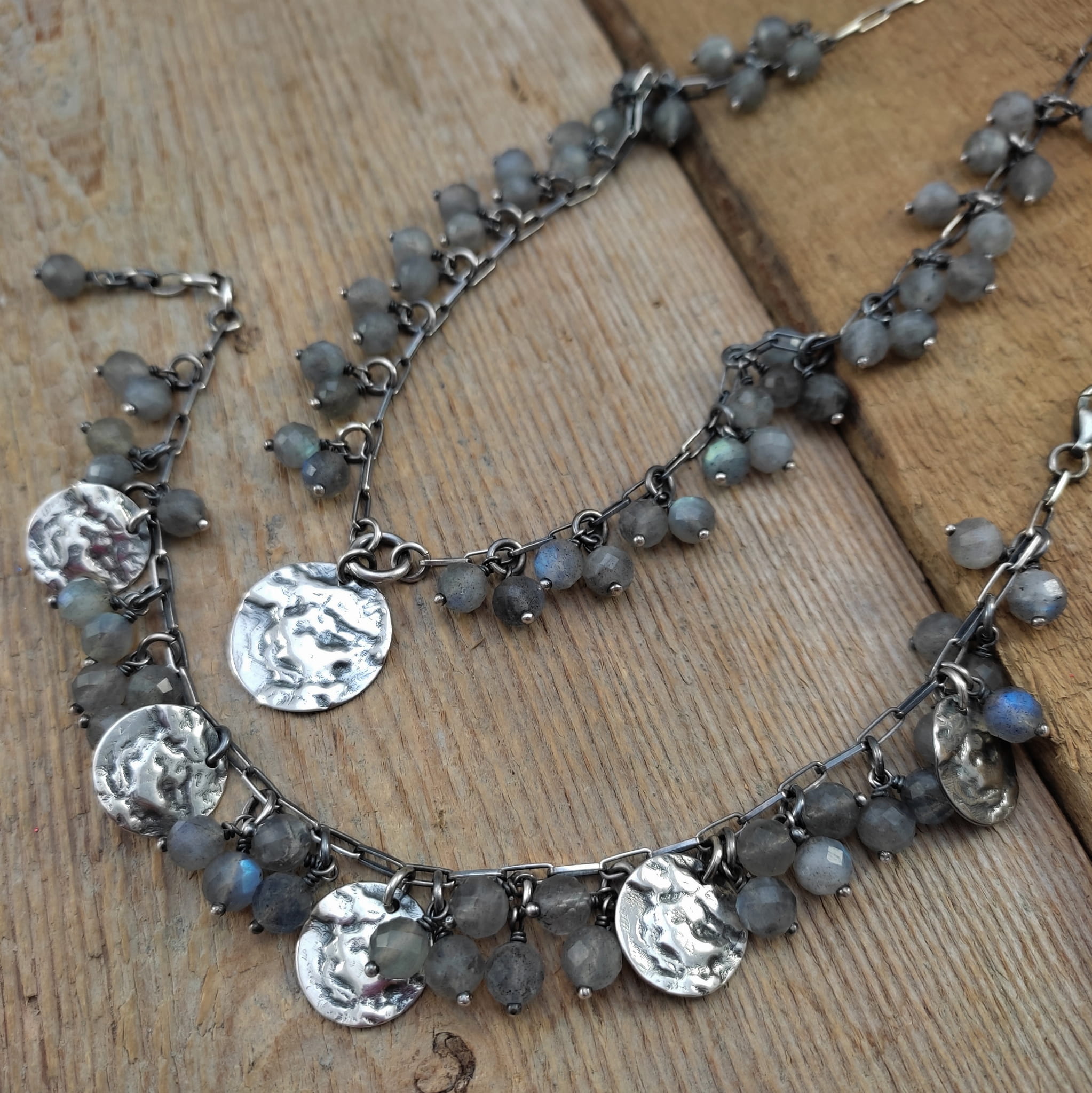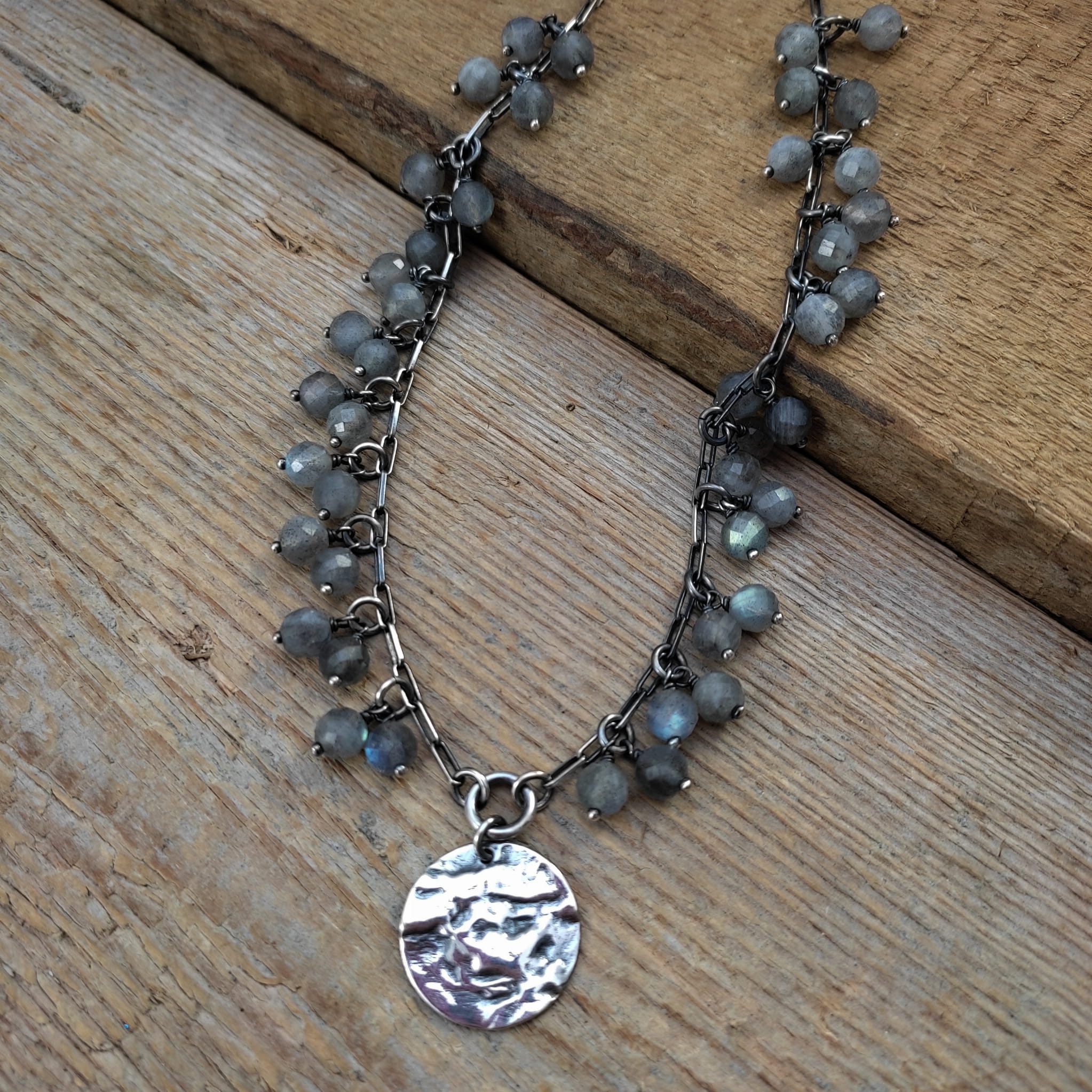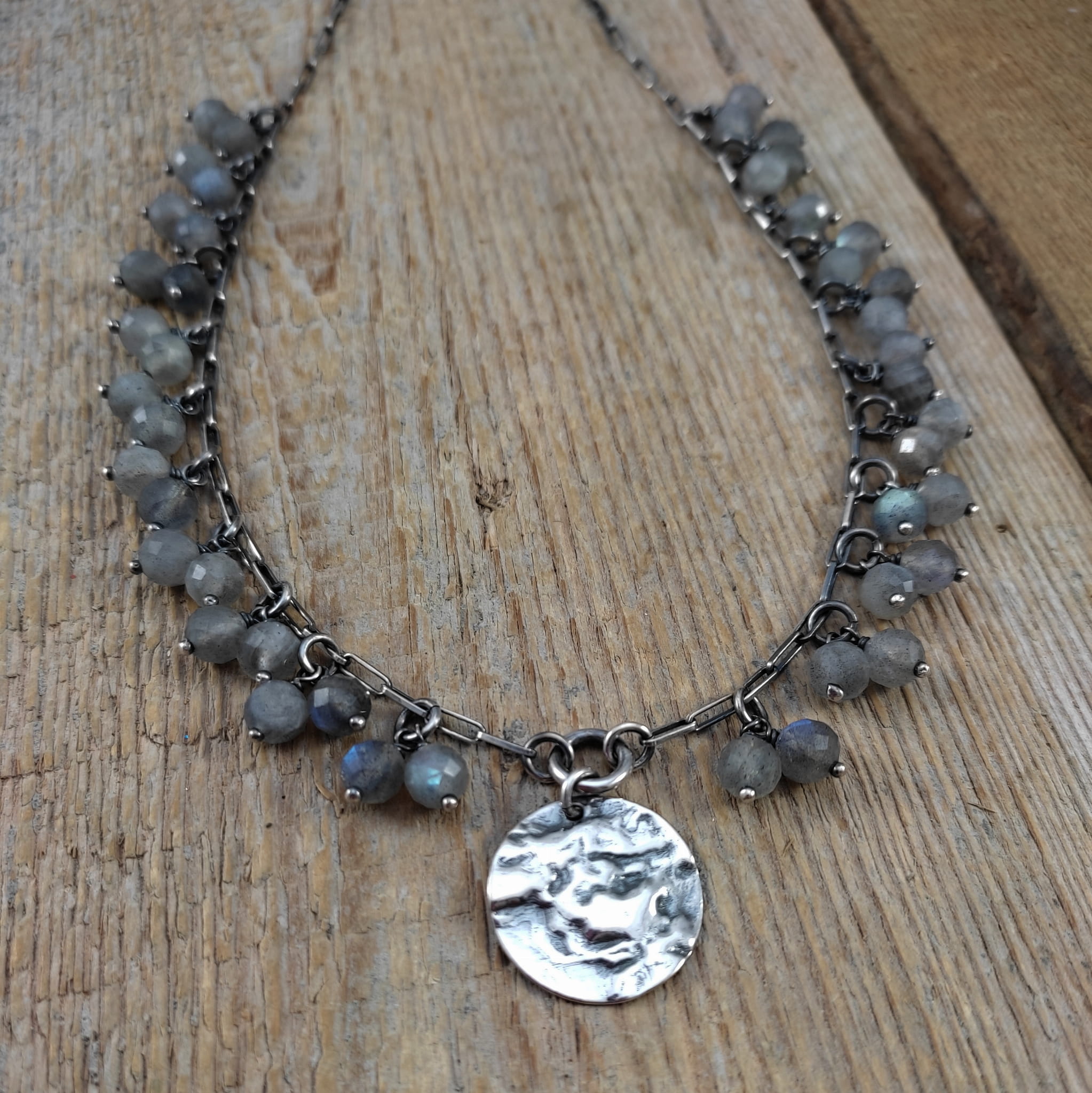 Naszyjnik wykonany z fasetowanych kul labradorytu 6 mm. Całość wykończona w srebrze 925, oksydowanym i wypolerowanym. Długość naszyjnika wynosi ok. 40/45/50 cm, plus łańcuszek regulacyjny 5 cm. (Proszę wpisać w komentarzu, w przypadku braku wysyłamy 45 cm). Wielkość blaszki ok. 19 mm.