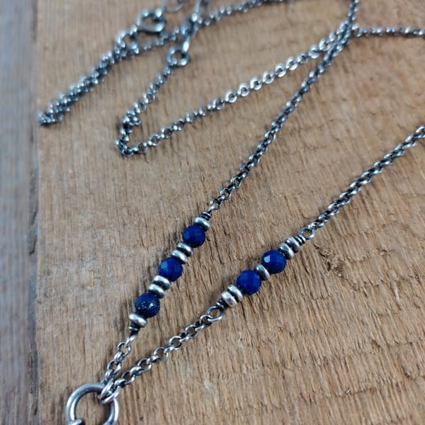 Naszyjnik wykonany ze srebra 925, oksydowanego i wypolerowanego (w tym zawieszka 15 mm) oraz fasetowanych kul lapis lazuli 4 mm.
