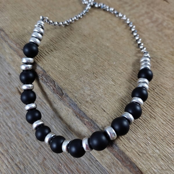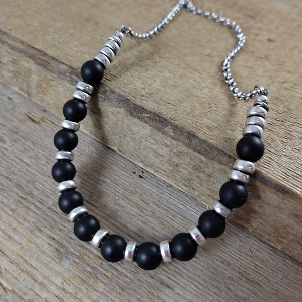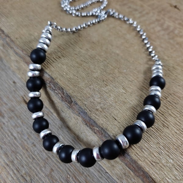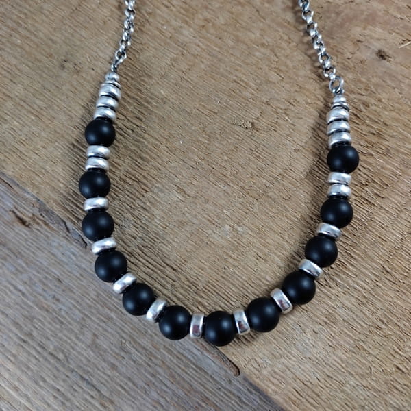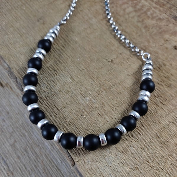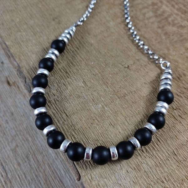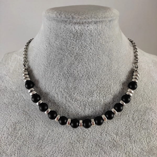 Naszyjnik wykonany z kul onyksu 8 mm. Całość dopełniona srebrem 925, oksydowanym i wypolerowanym.