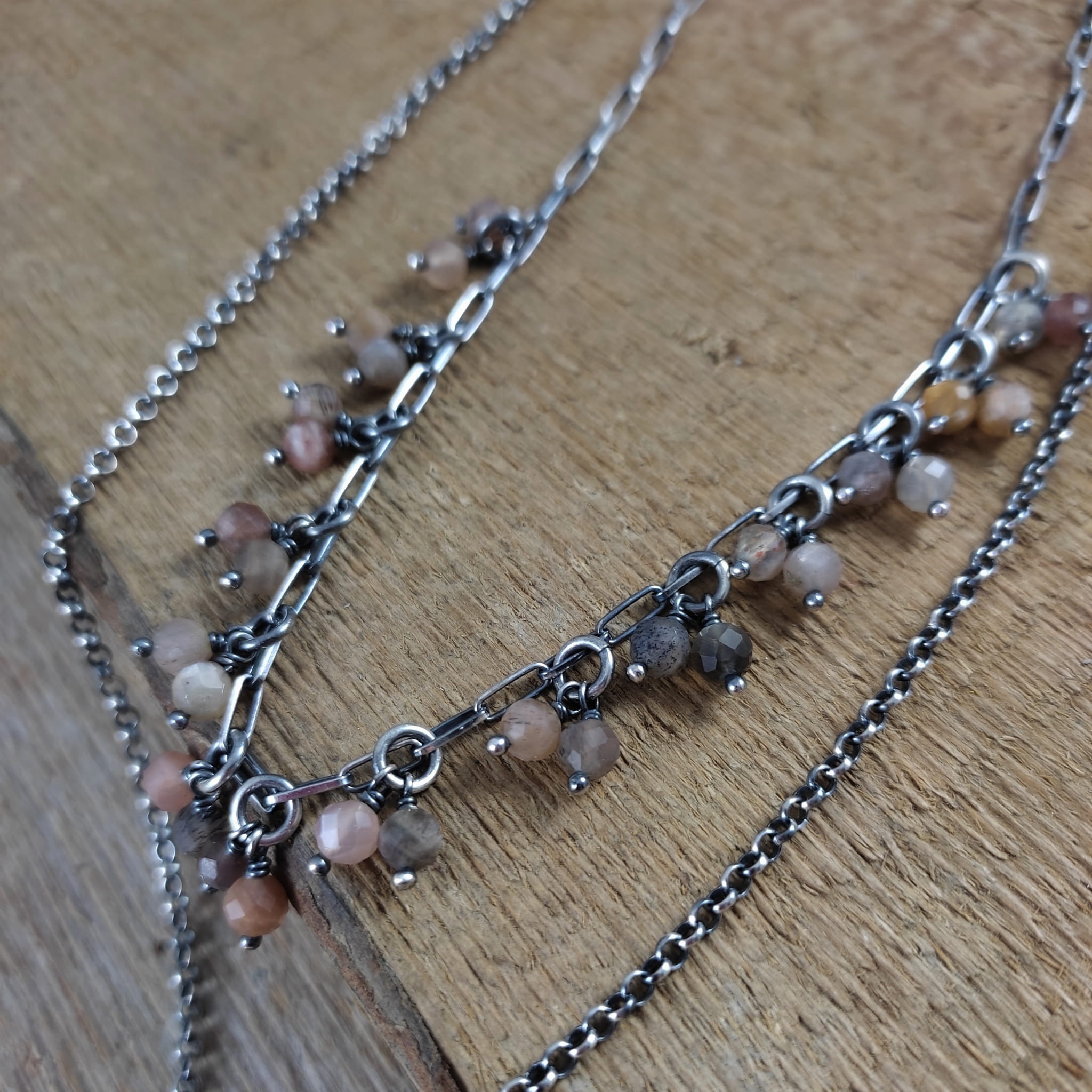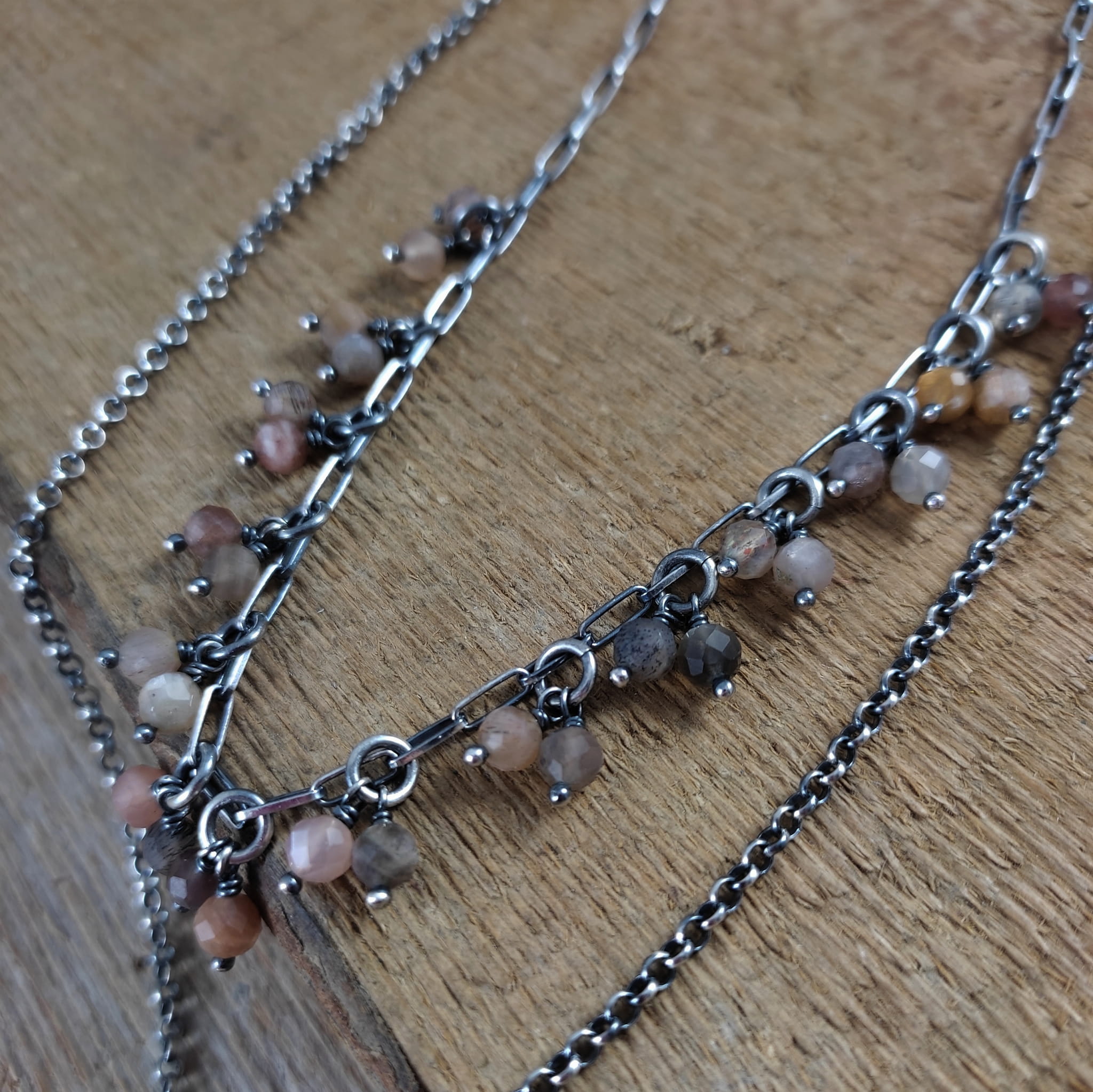 Naszyjnik wykonany z fasetowanych kul kamienia słonecznego 4,5 mm. Całość dopełniona srebrem 925, oksydowanym i wypolerowanym.