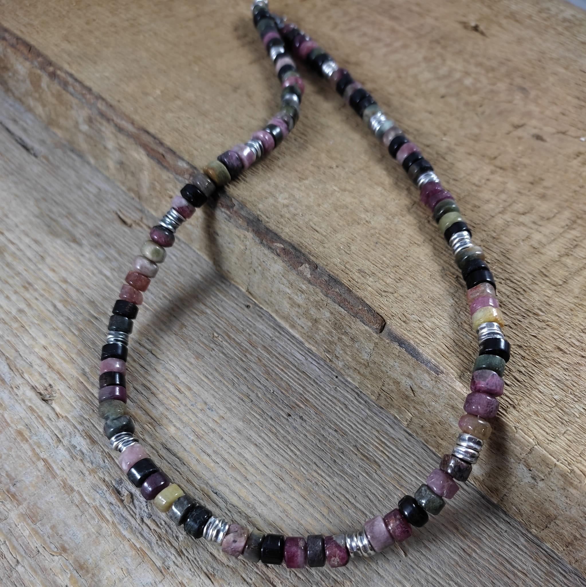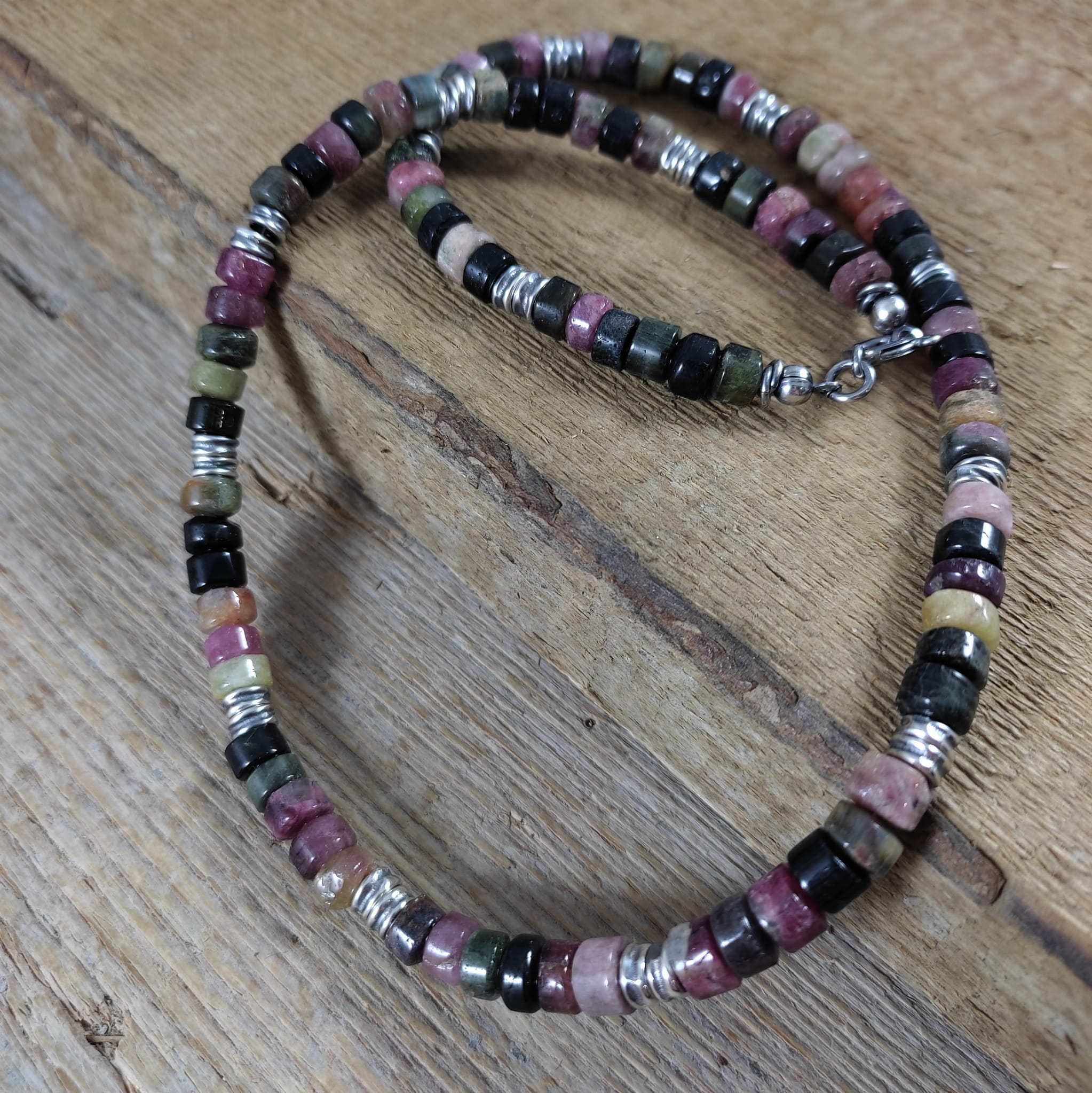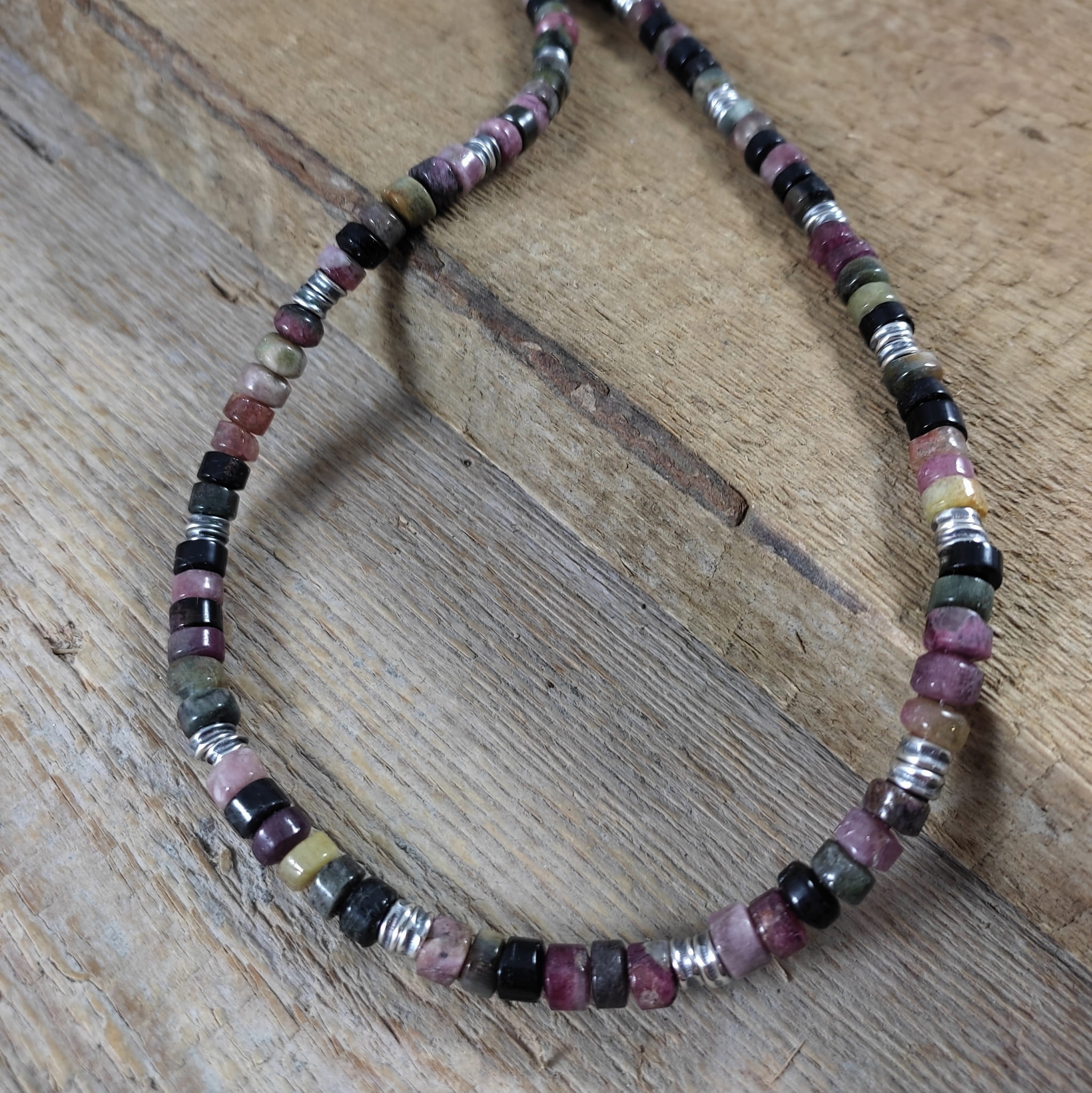 Naszyjnik wykonany z surowych bryłek turmalinu o średnicy ok. 6 mm. Całość wykończona w srebrze 925, oksydowanym i wypolerowanym. Długość naszyjnika wynosi ok. 47 cm, plus łańcuszek regulacyjny 5 cm. Elegancko zapakowany. Kamienie naturalne, surowe, różnią się wielkością i kształtem między sobą, z niedoskonałościami.