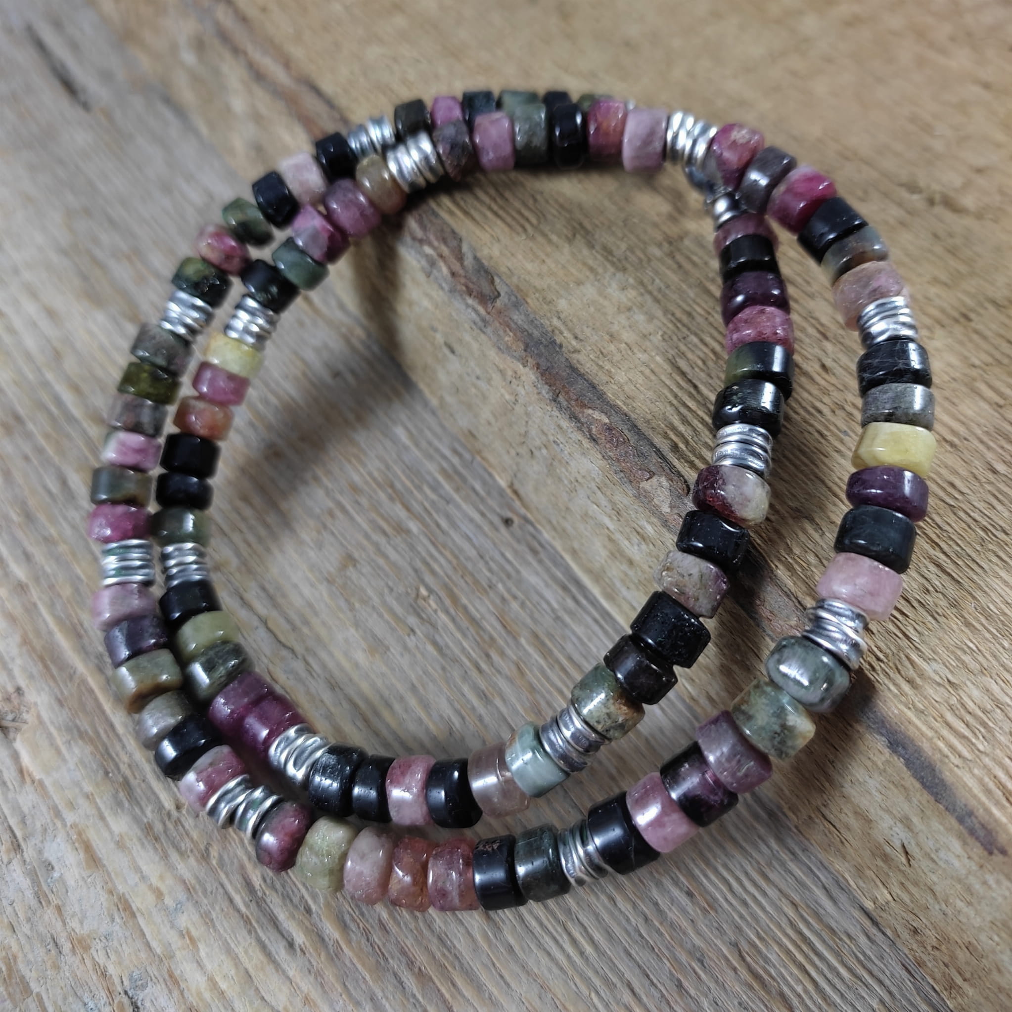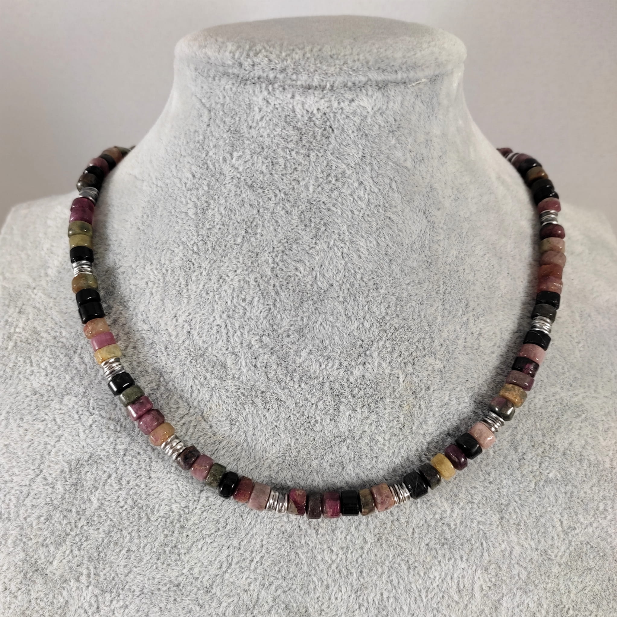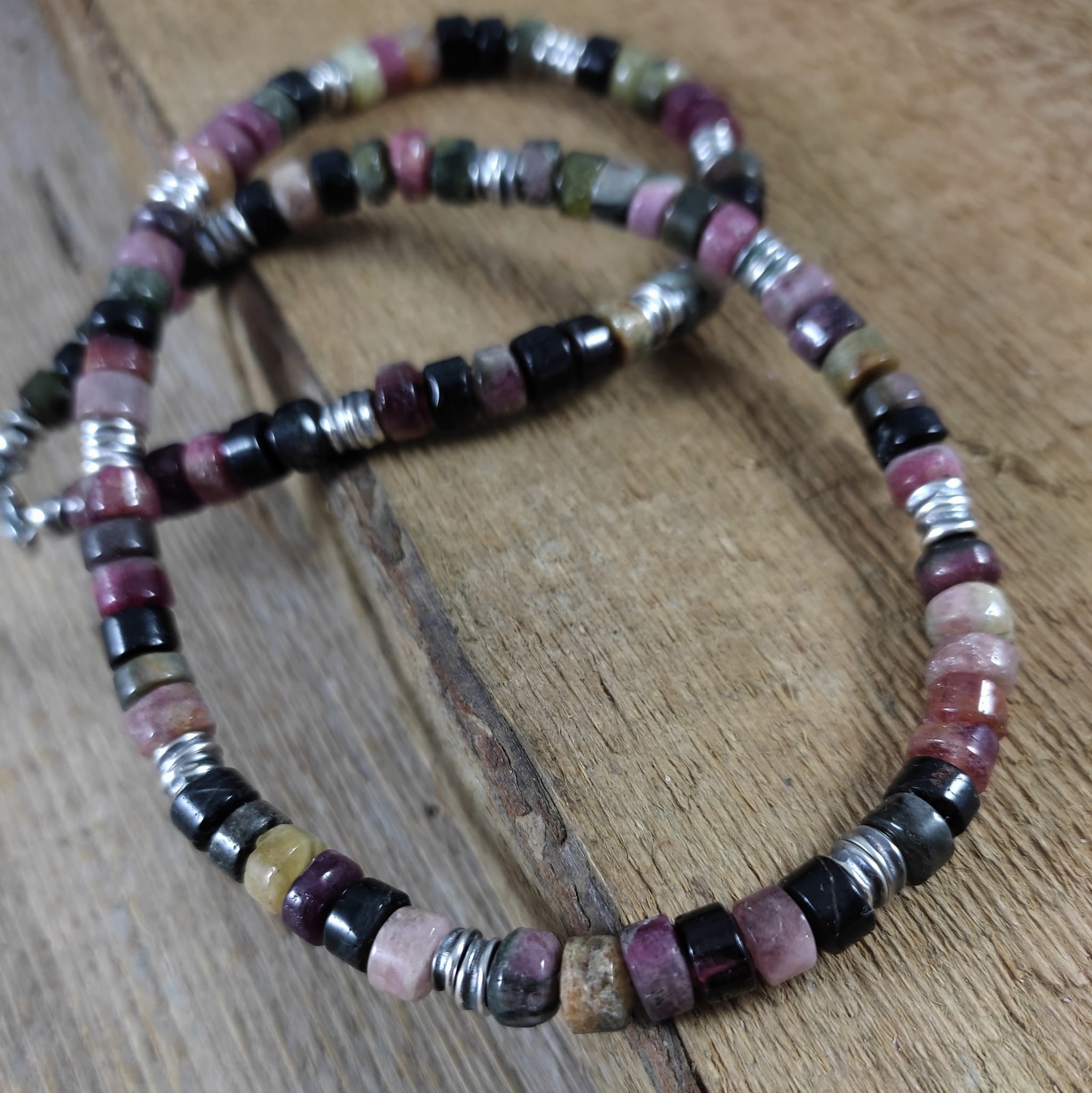 Naszyjnik wykonany z surowych bryłek turmalinu o średnicy ok. 6 mm. Całość wykończona w srebrze 925, oksydowanym i wypolerowanym. Długość naszyjnika wynosi ok. 47 cm, plus łańcuszek regulacyjny 5 cm. Elegancko zapakowany. Kamienie naturalne, surowe, różnią się wielkością i kształtem między sobą, z niedoskonałościami.