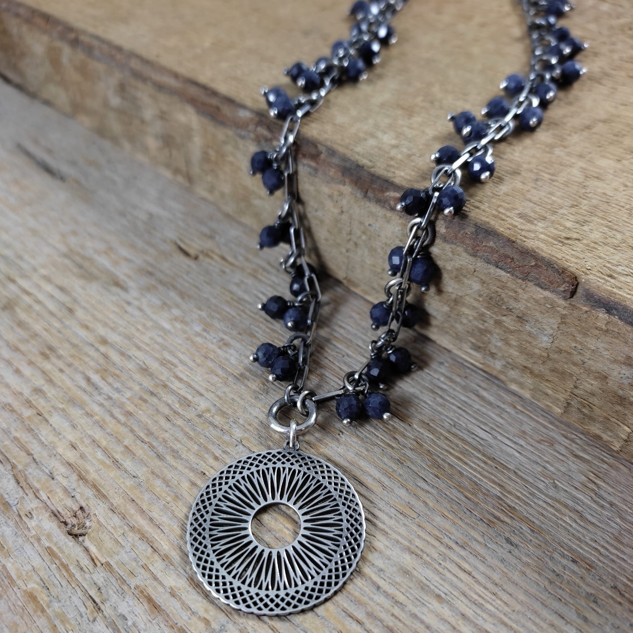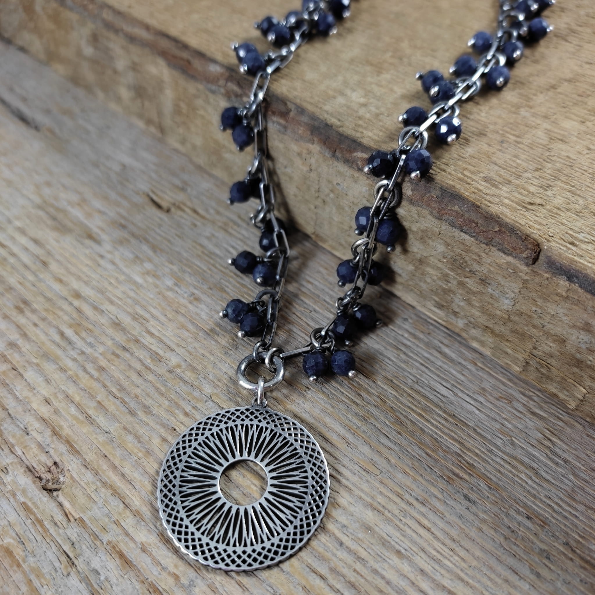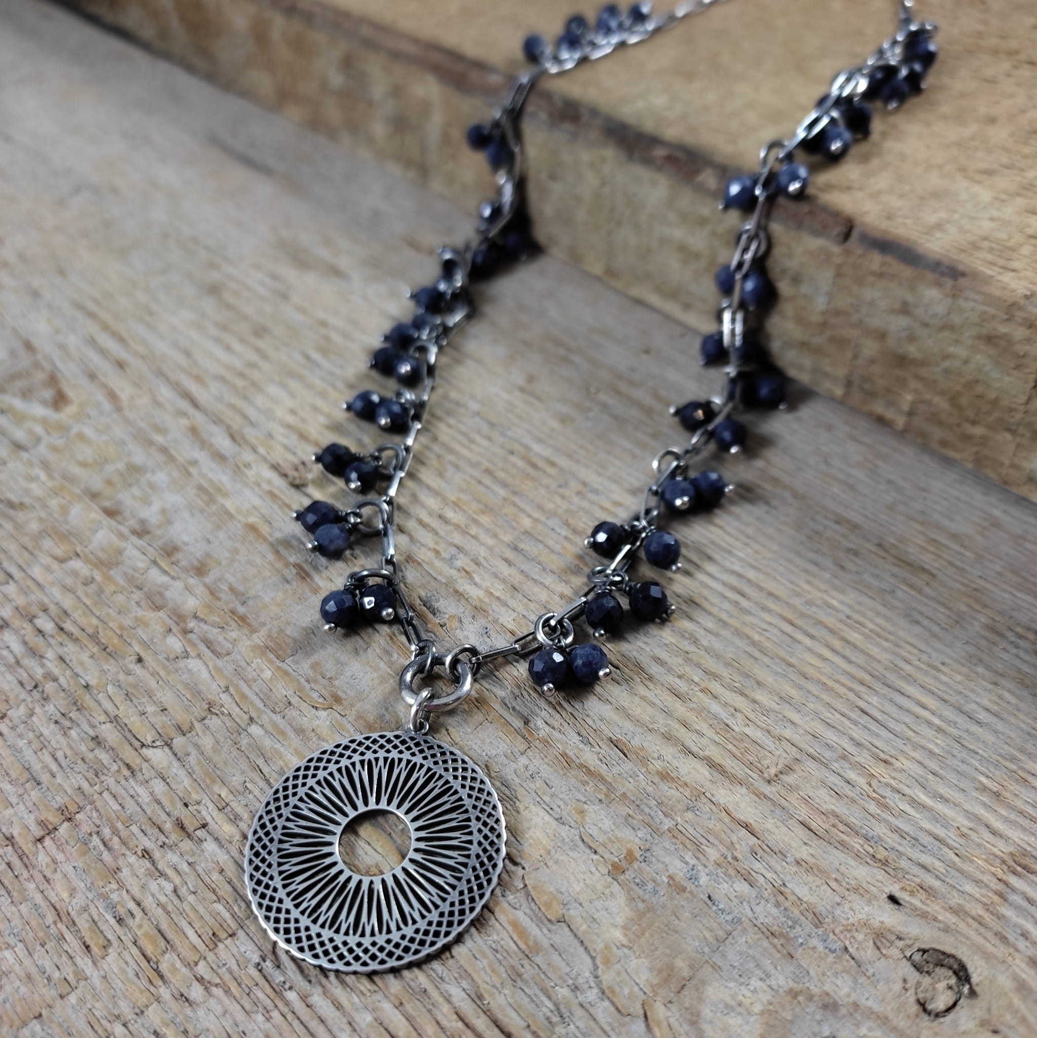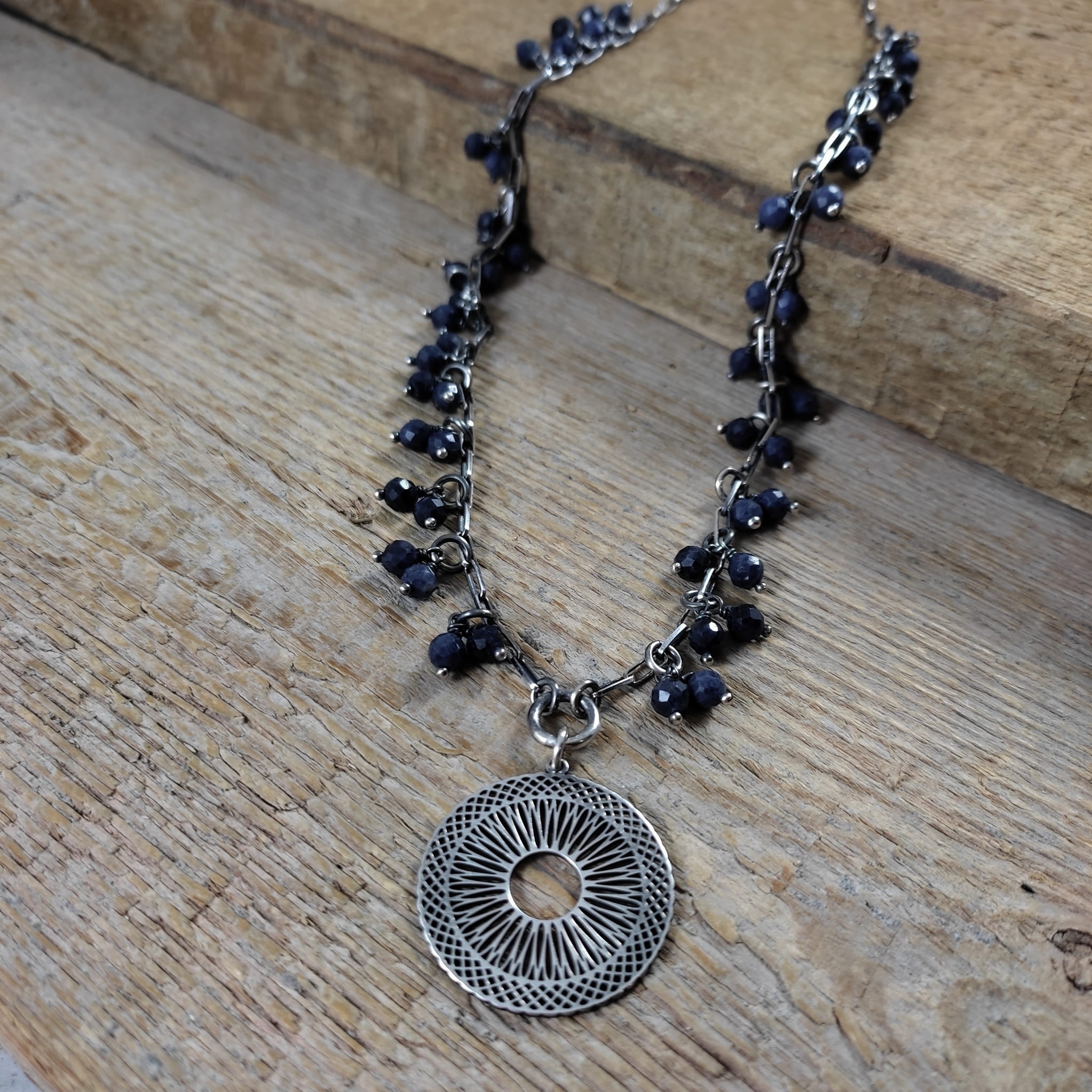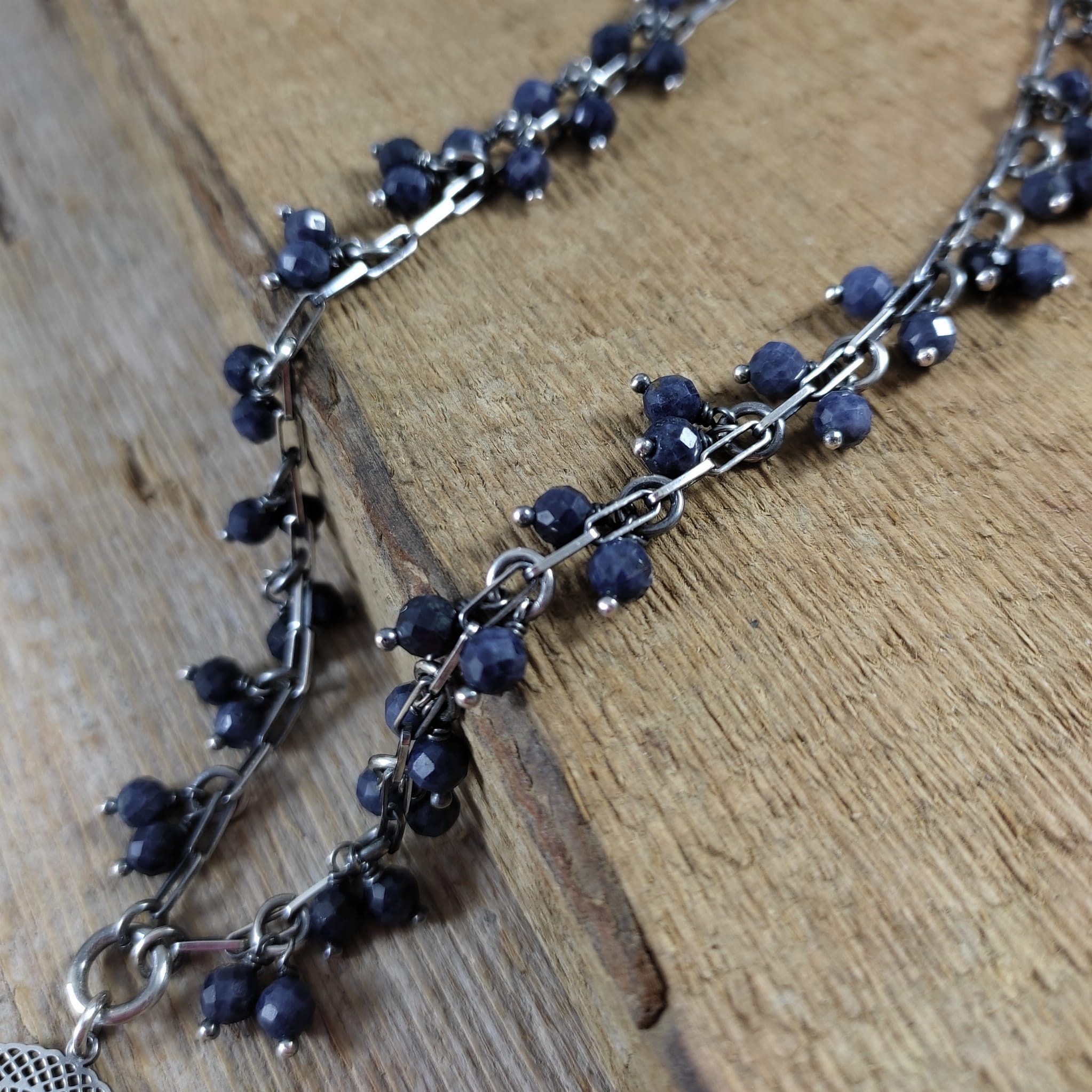 Naszyjnik wykonany z fasetowanych kul szafiru 4,5 mm. Całość wykończona w srebrze 925, oksydowanym i wypolerowanym. Długość naszyjnika wynosi ok. 50/55/60 cm, plus łańcuszek regulacyjny 5 cm. (Proszę wpisać w komentarzu, w przypadku braku wysyłamy 50 cm). Wielkość zawieszki 27,9/25,7 mm.
