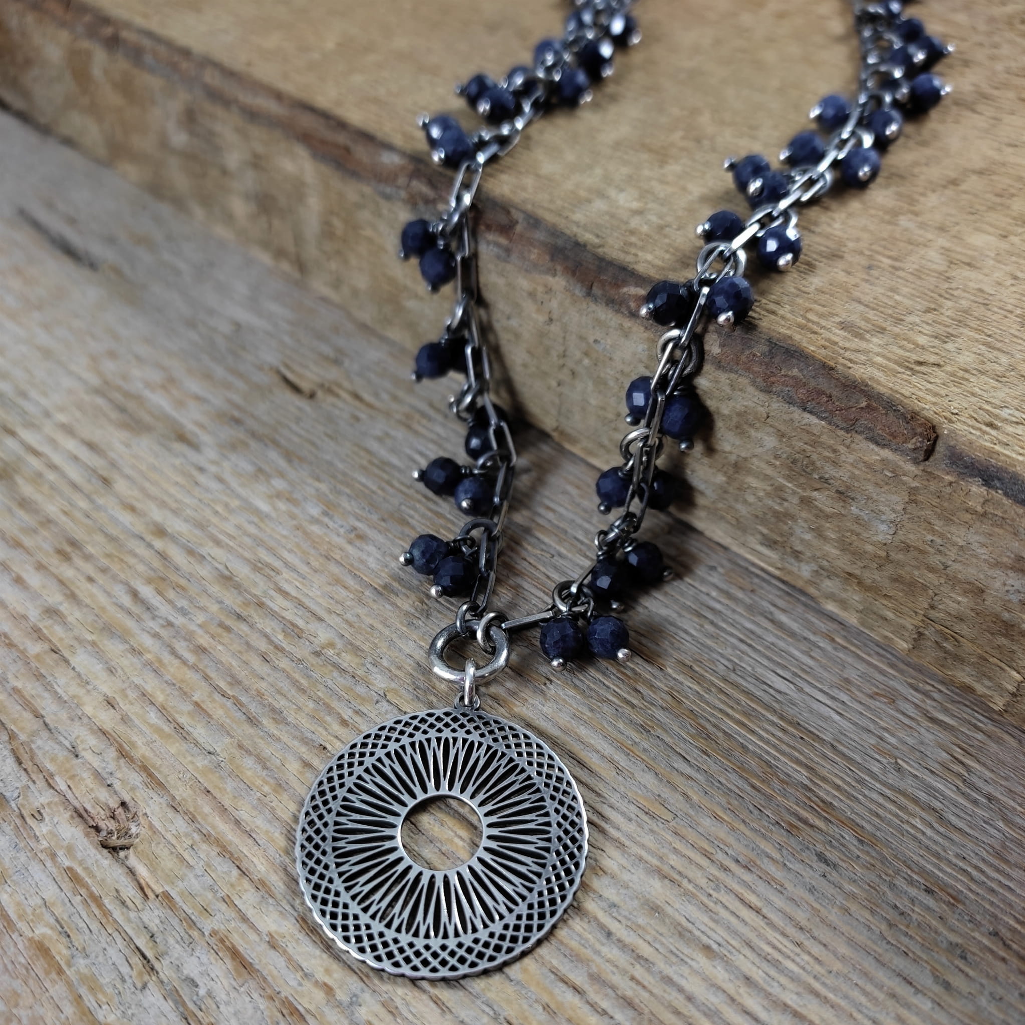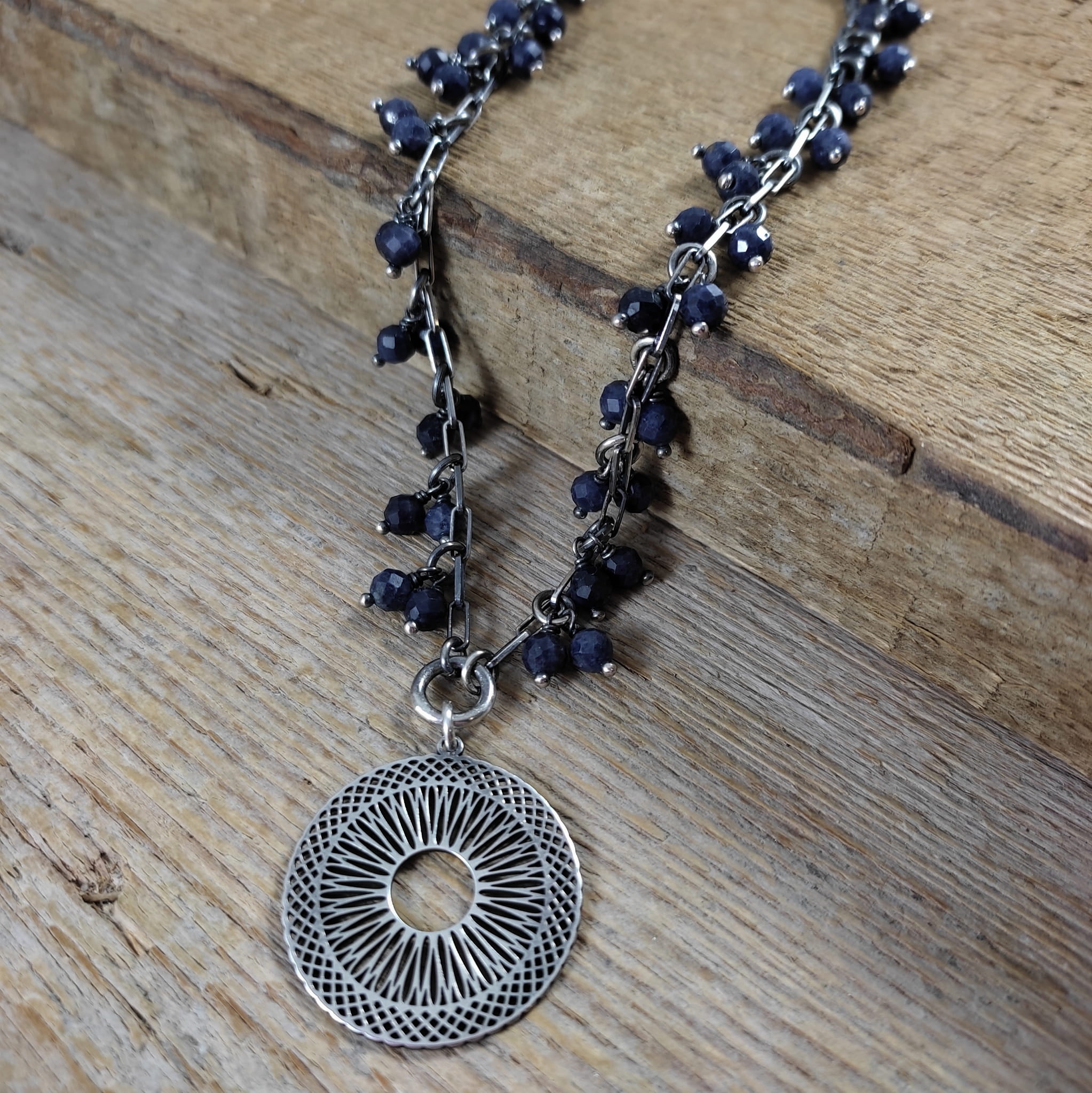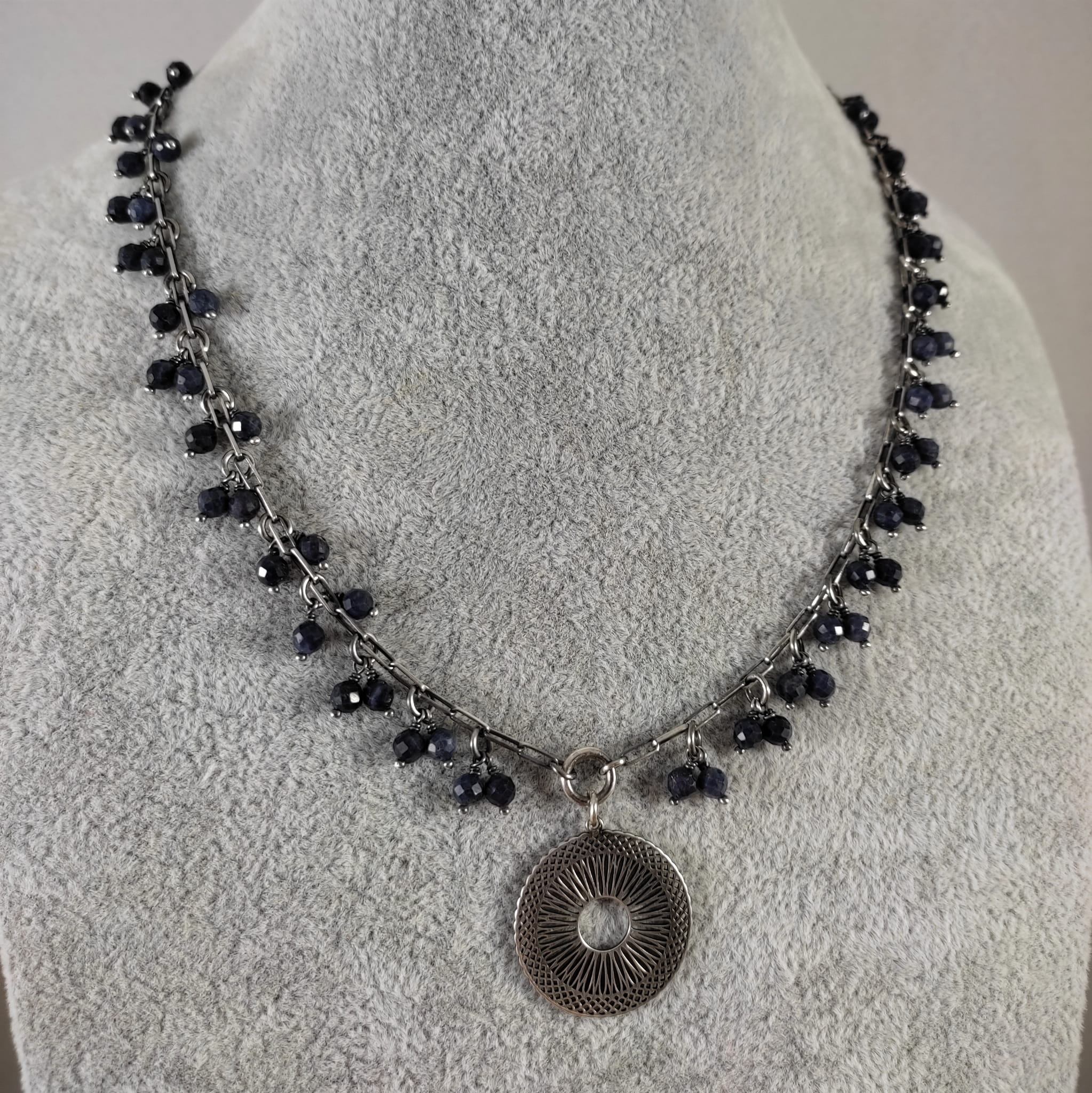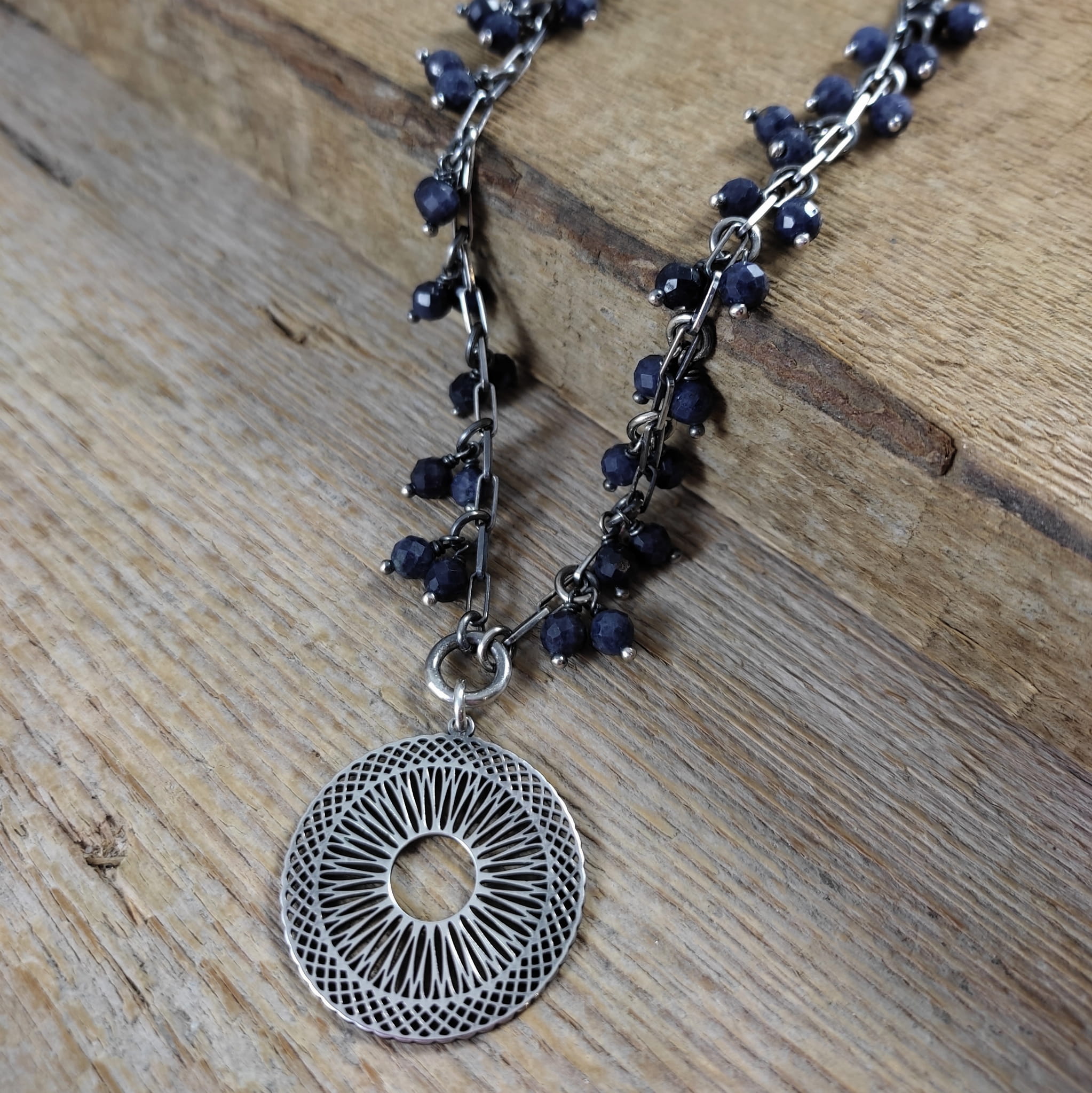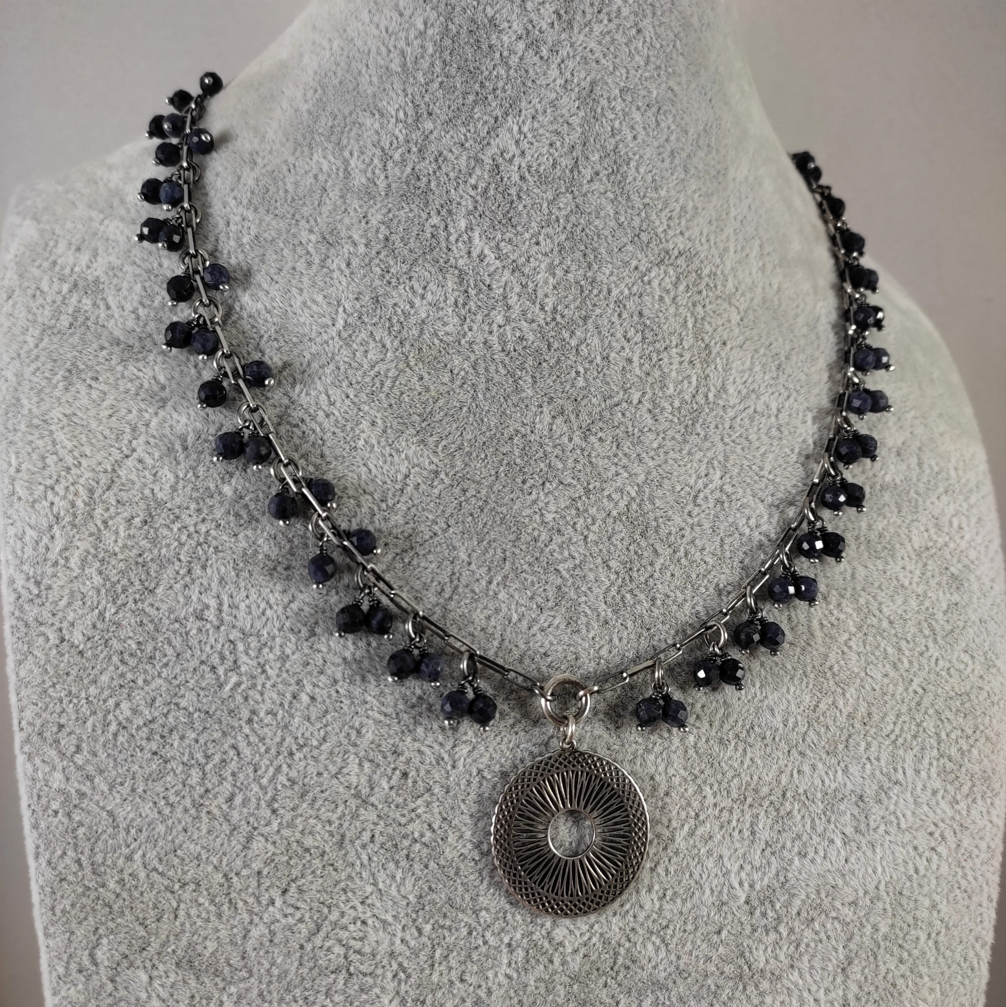 Naszyjnik wykonany z fasetowanych kul szafiru 4,5 mm. Całość wykończona w srebrze 925, oksydowanym i wypolerowanym. Długość naszyjnika wynosi ok. 50/55/60 cm, plus łańcuszek regulacyjny 5 cm. (Proszę wpisać w komentarzu, w przypadku braku wysyłamy 50 cm). Wielkość zawieszki 27,9/25,7 mm.