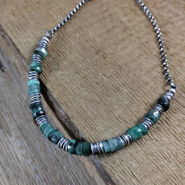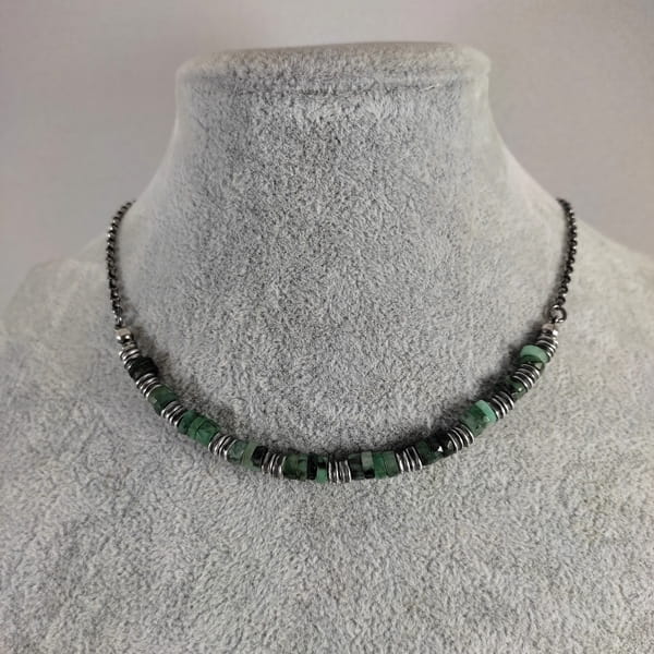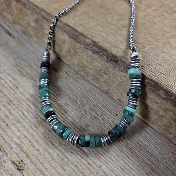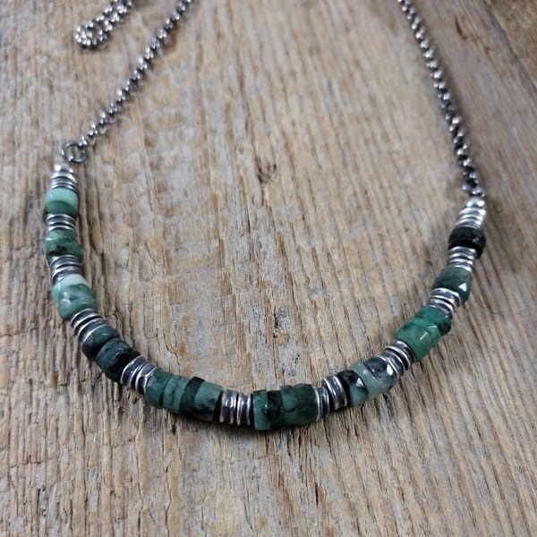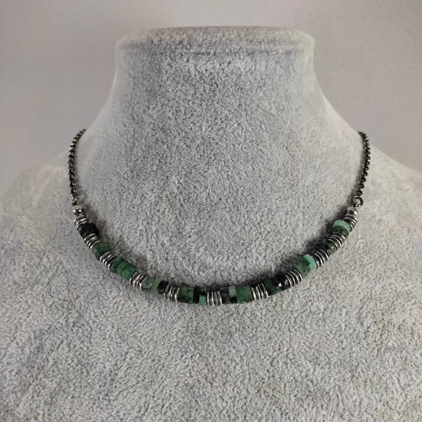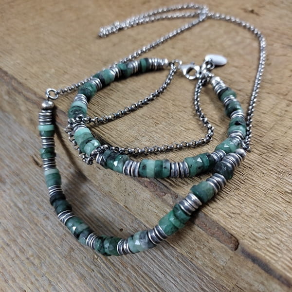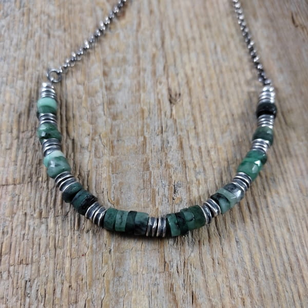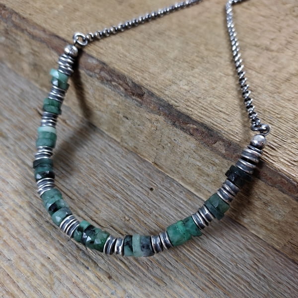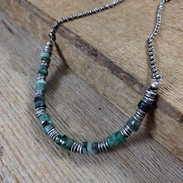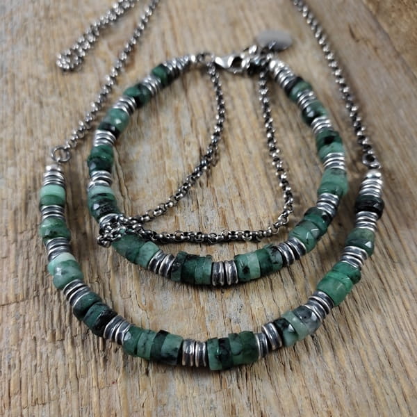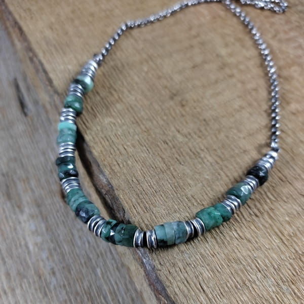 Naszyjnik wykonany z talarków szmaragdu 6 mm. Całość wykończona w srebrze 925, oksydowanym i wypolerowanym. Długość naszyjnika wynosi ok. 40/45/50 cm, plus łańcuszek regulacyjny 5 cm. (Proszę wpisać w komentarzu, w przypadku braku wysyłamy 45 cm).