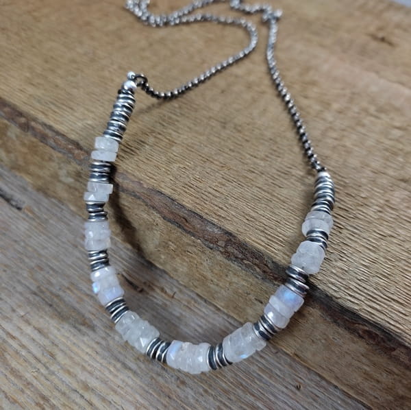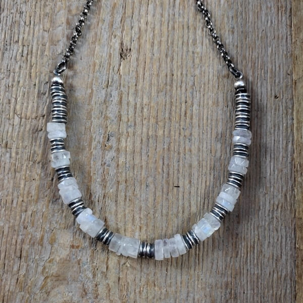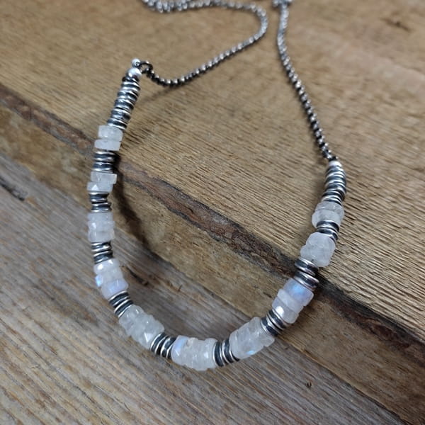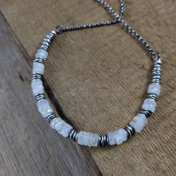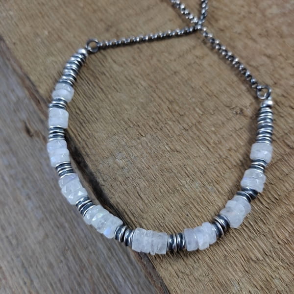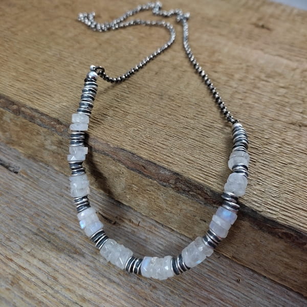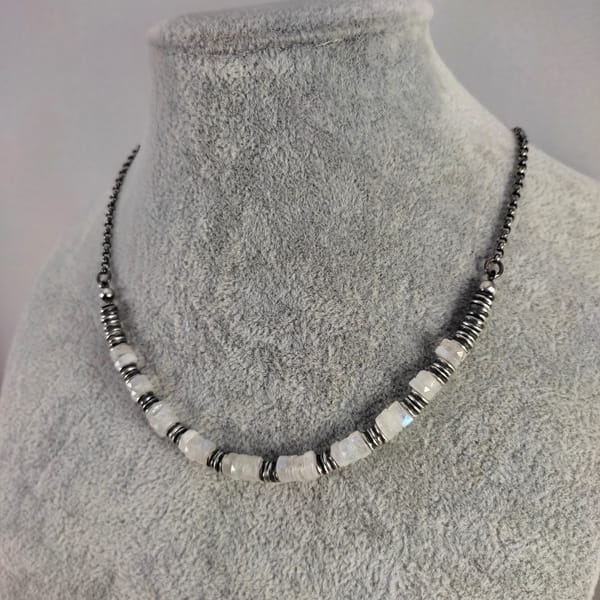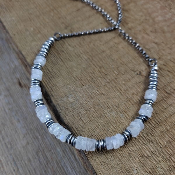 Naszyjnik wykonany z talarków kamienia księżycowego 7 mm. Całość wykończona w srebrze 925, oksydowanym i wypolerowanym. Długość naszyjnika wynosi ok. 40/45/50 cm, plus łańcuszek regulacyjny 5 cm. (Proszę wpisać w komentarzu, w przypadku braku wysyłamy 45 cm).