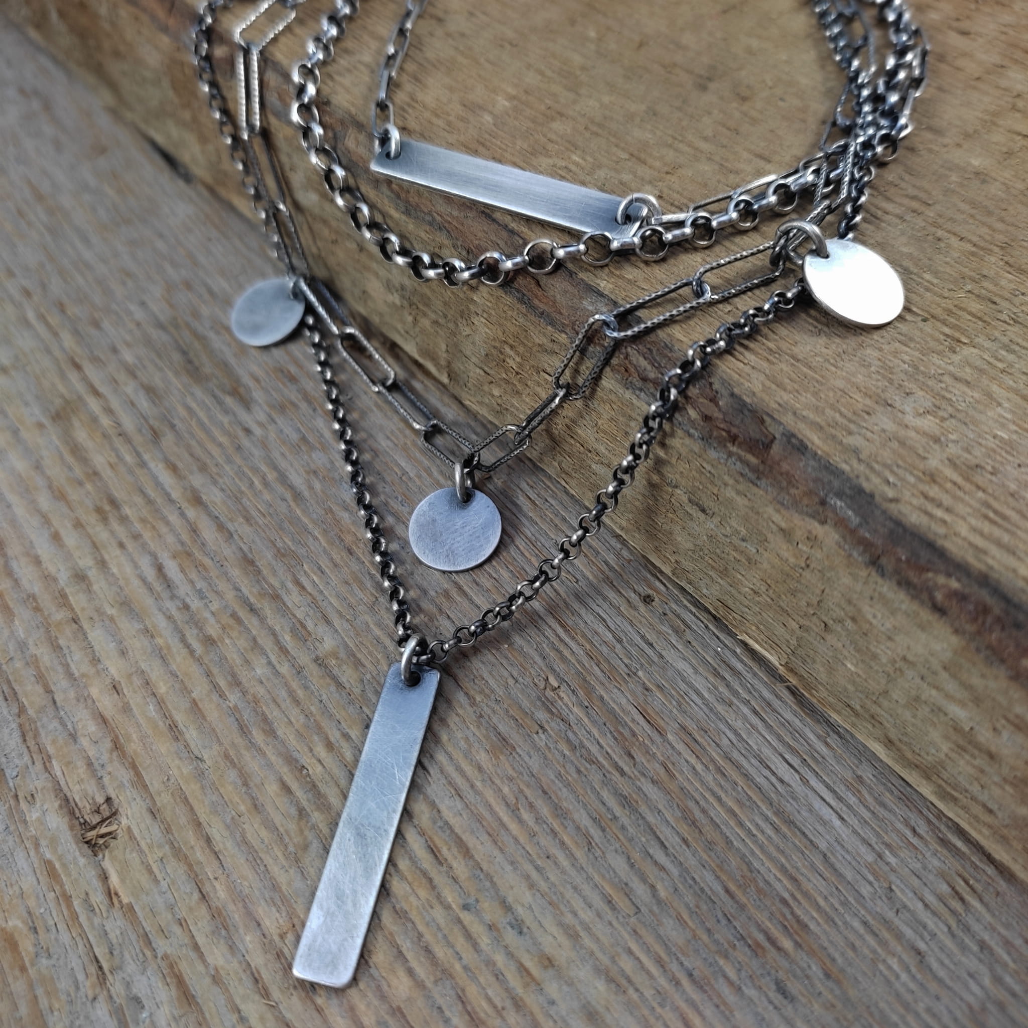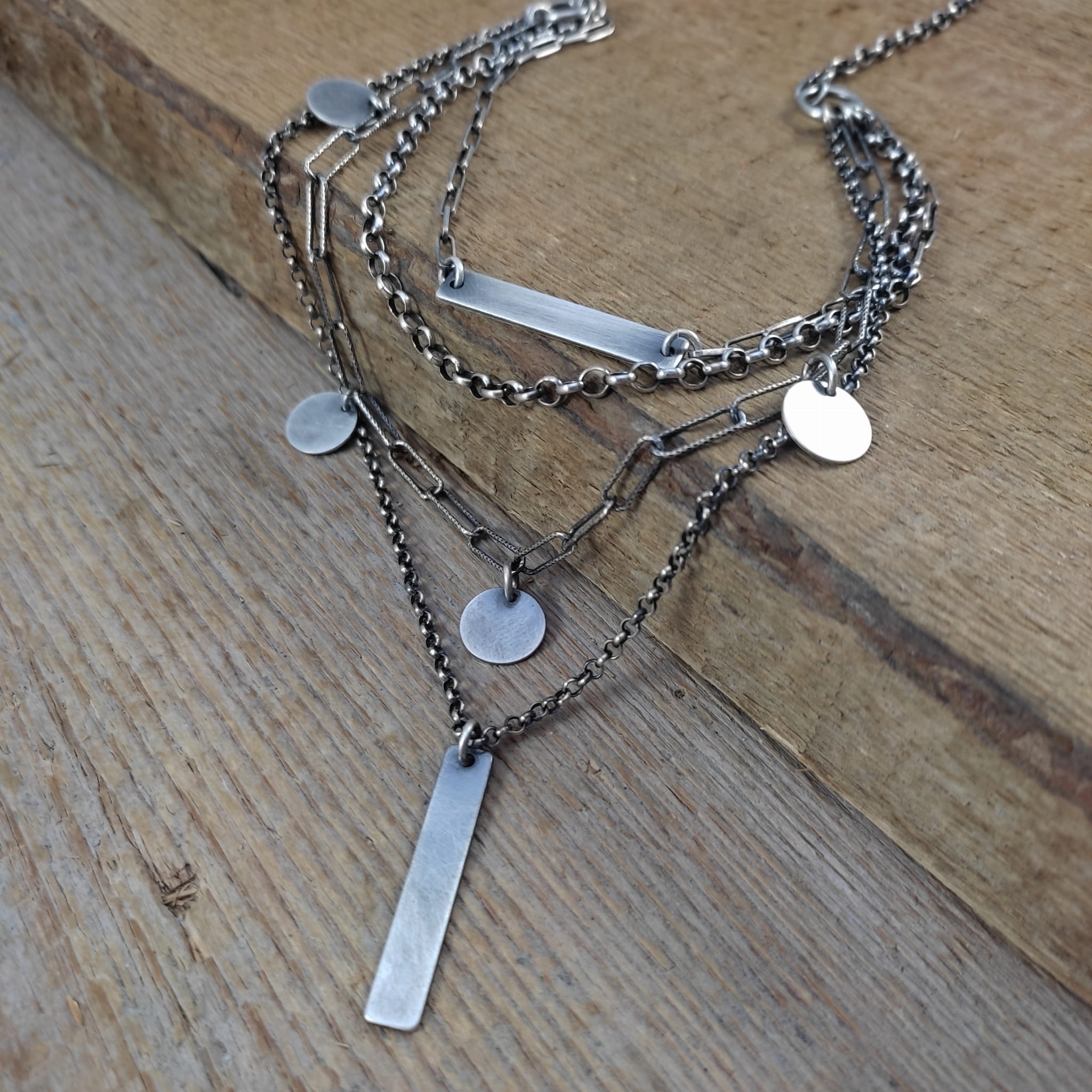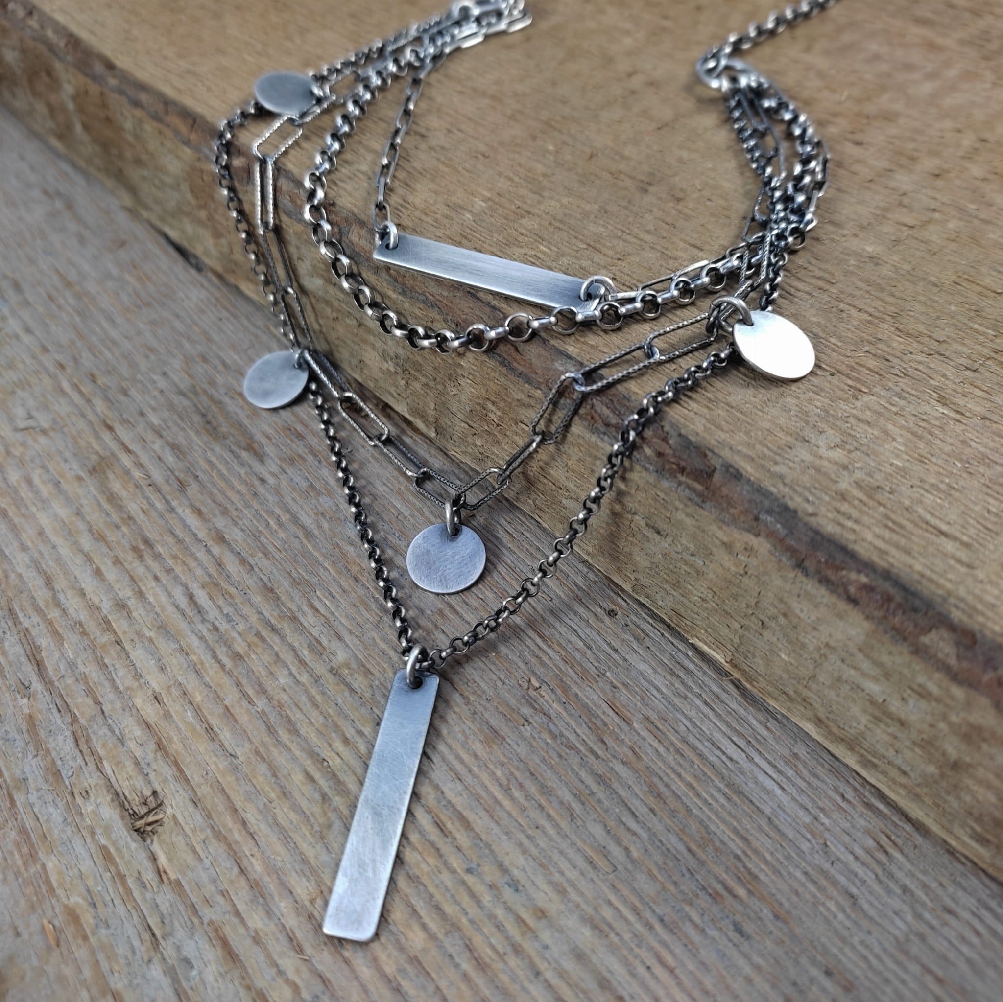 Naszyjnik wykonany ze srebra 925, oksydowanego i wypolerowanego (w tym kółka 10 mm i blaszki prostokątne 30/6 mm). Długość naszyjnika wynosi ok. 40/45/50 cm, plus łańcuszek regulacyjny 5 cm. (Proszę wpisać w komentarzu, w przypadku braku wysyłamy 45 cm). Elegancko zapakowany.