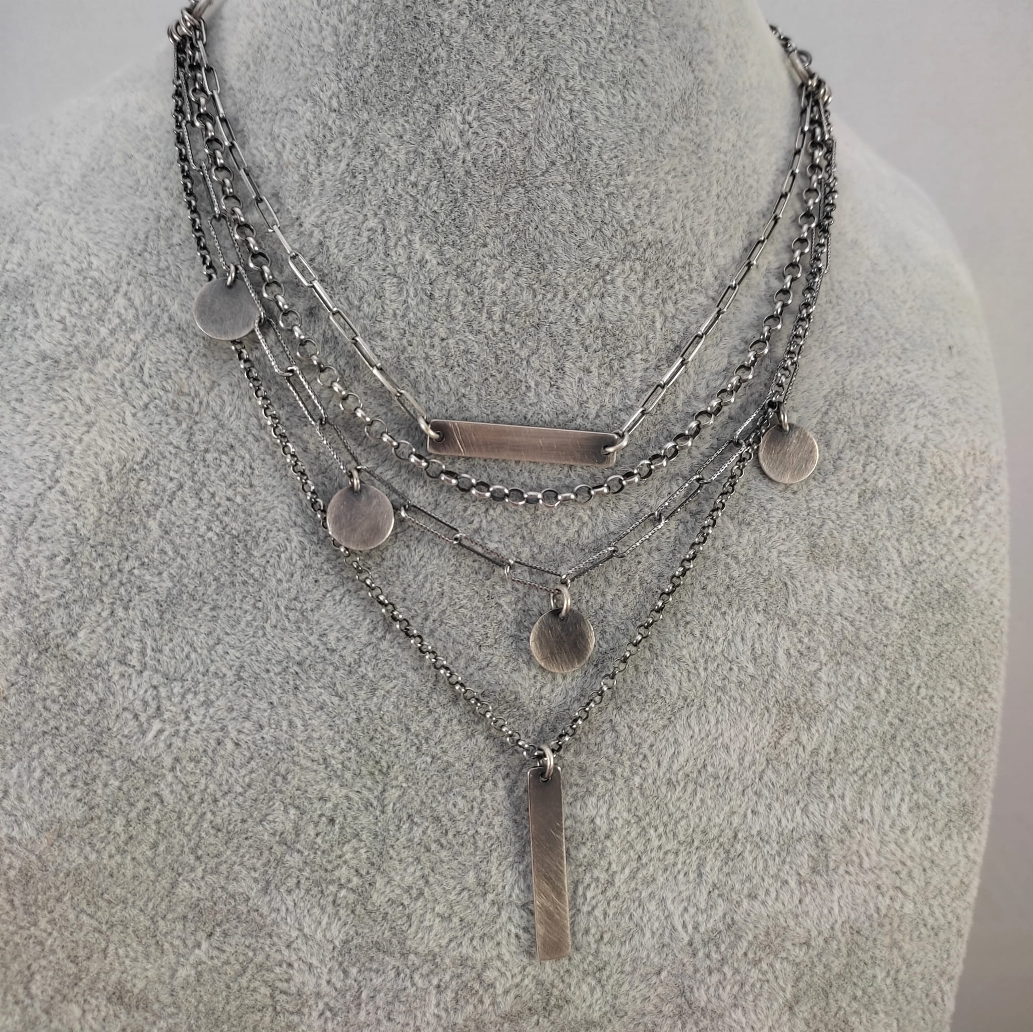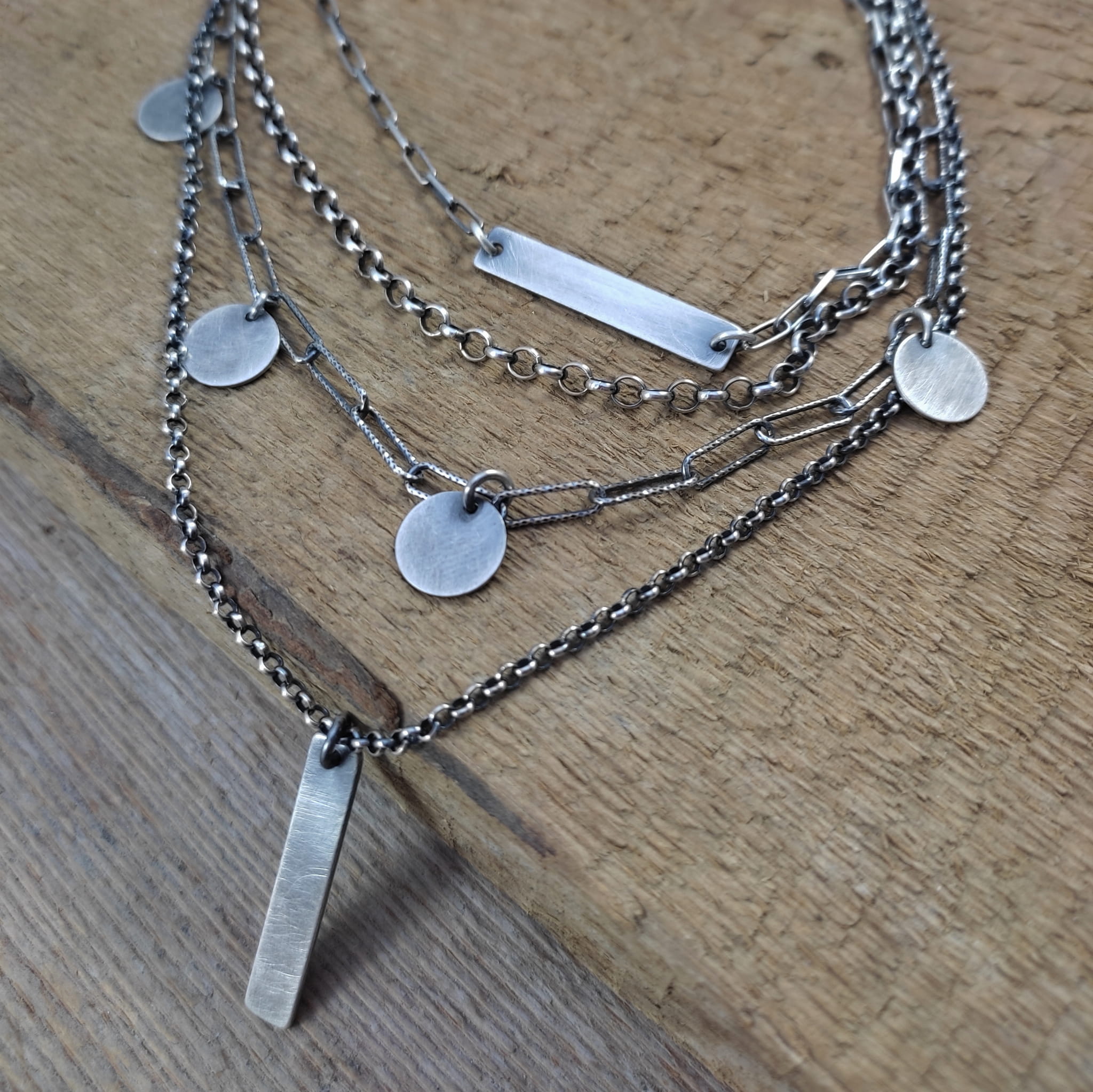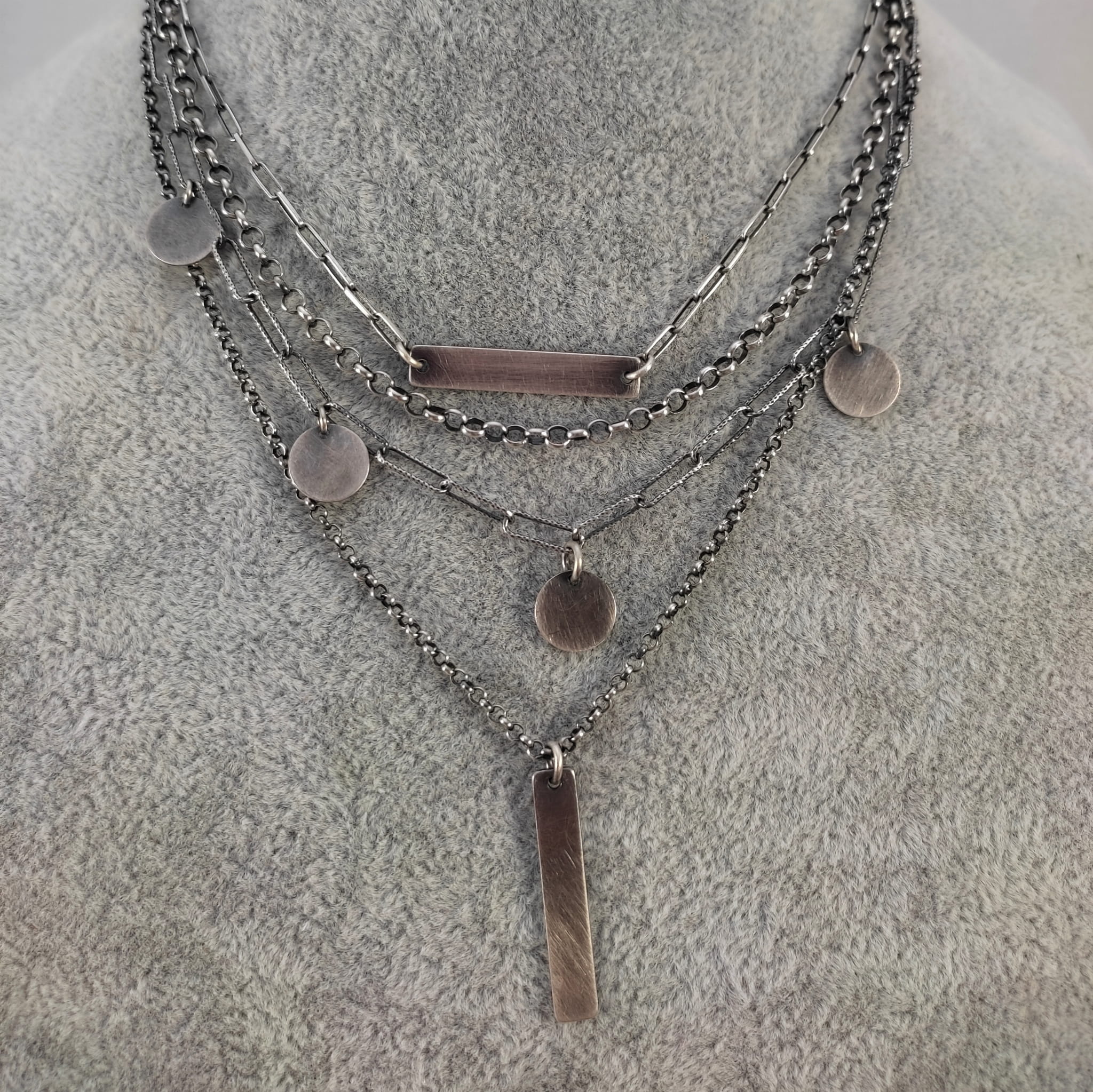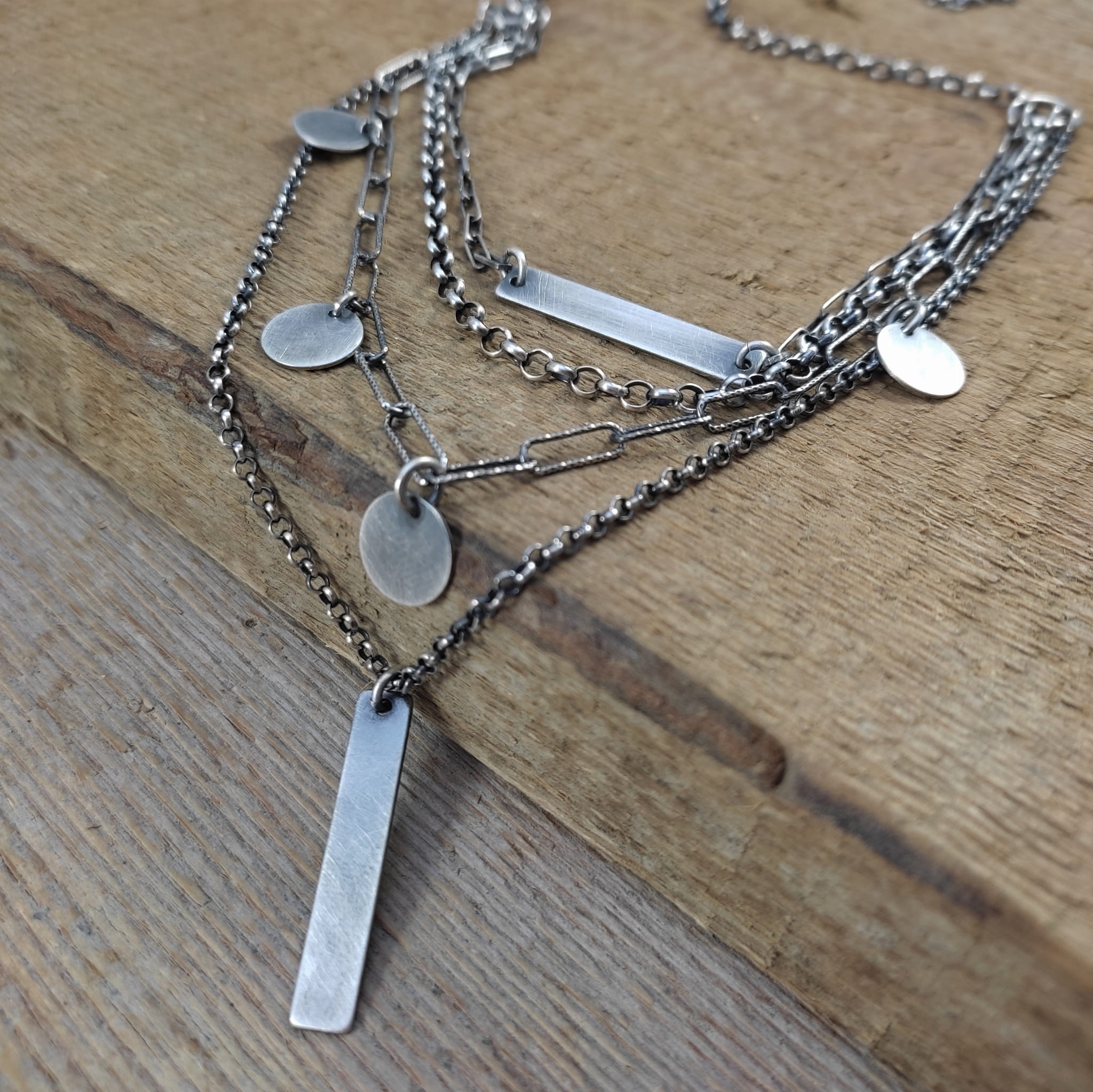 Naszyjnik wykonany ze srebra 925, oksydowanego i wypolerowanego (w tym kółka 10 mm i blaszki prostokątne 30/6 mm). Długość naszyjnika wynosi ok. 40/45/50 cm, plus łańcuszek regulacyjny 5 cm. (Proszę wpisać w komentarzu, w przypadku braku wysyłamy 45 cm). Elegancko zapakowany.