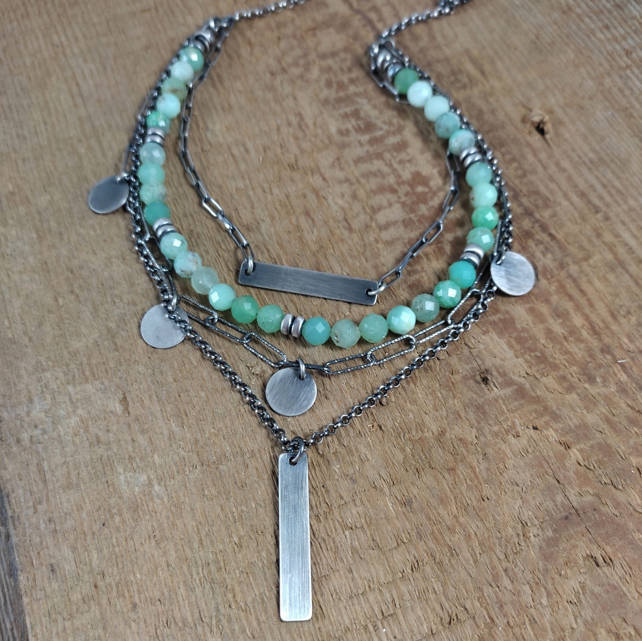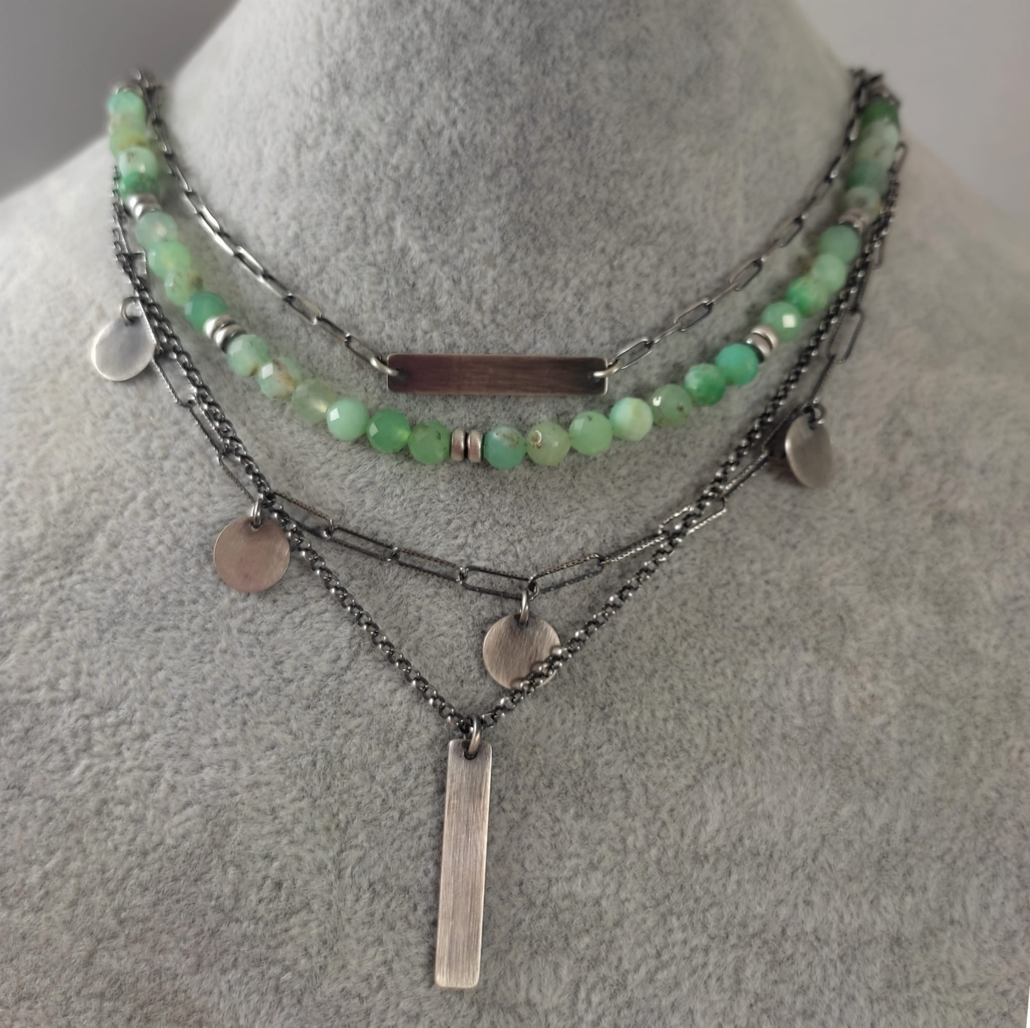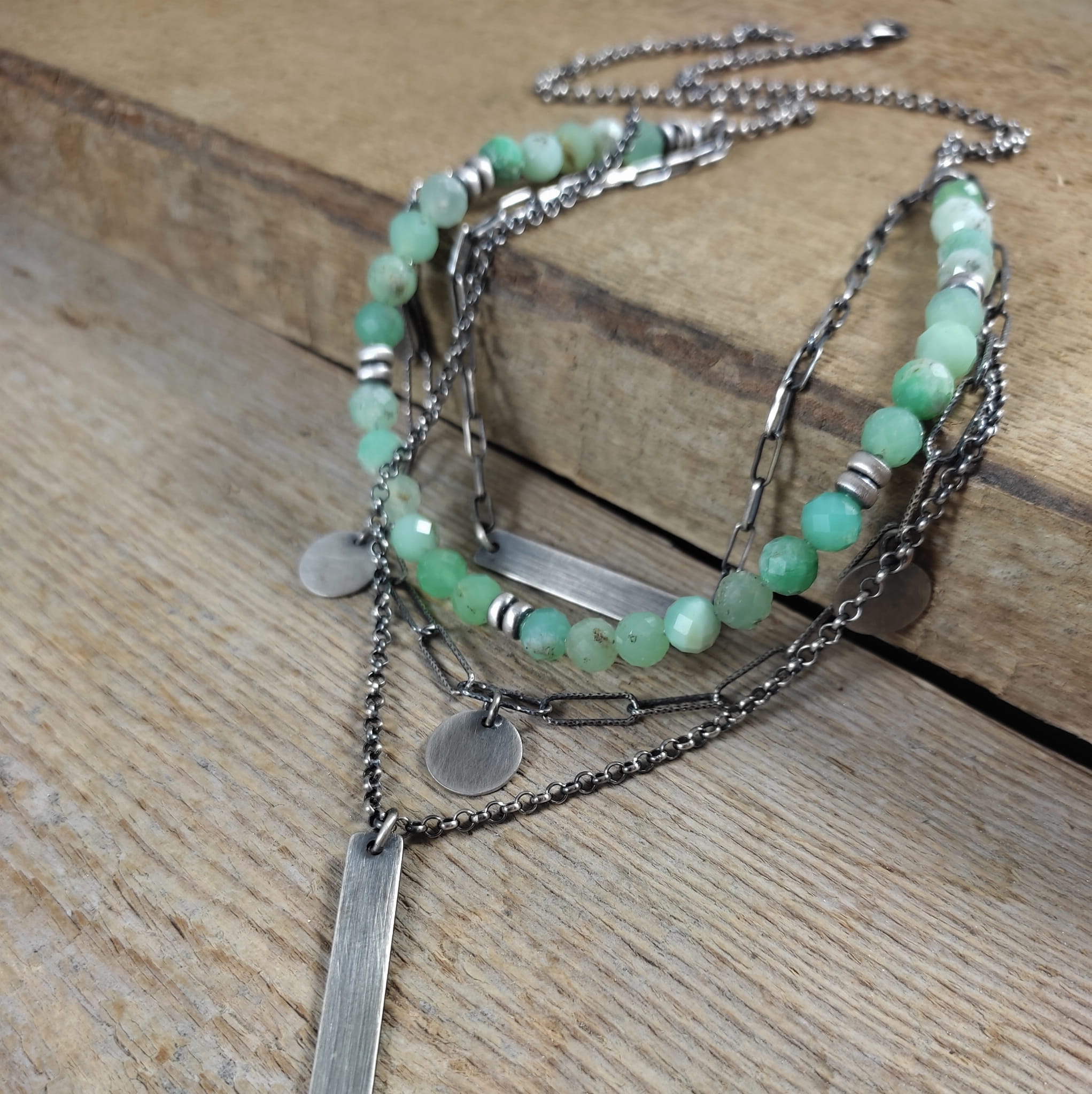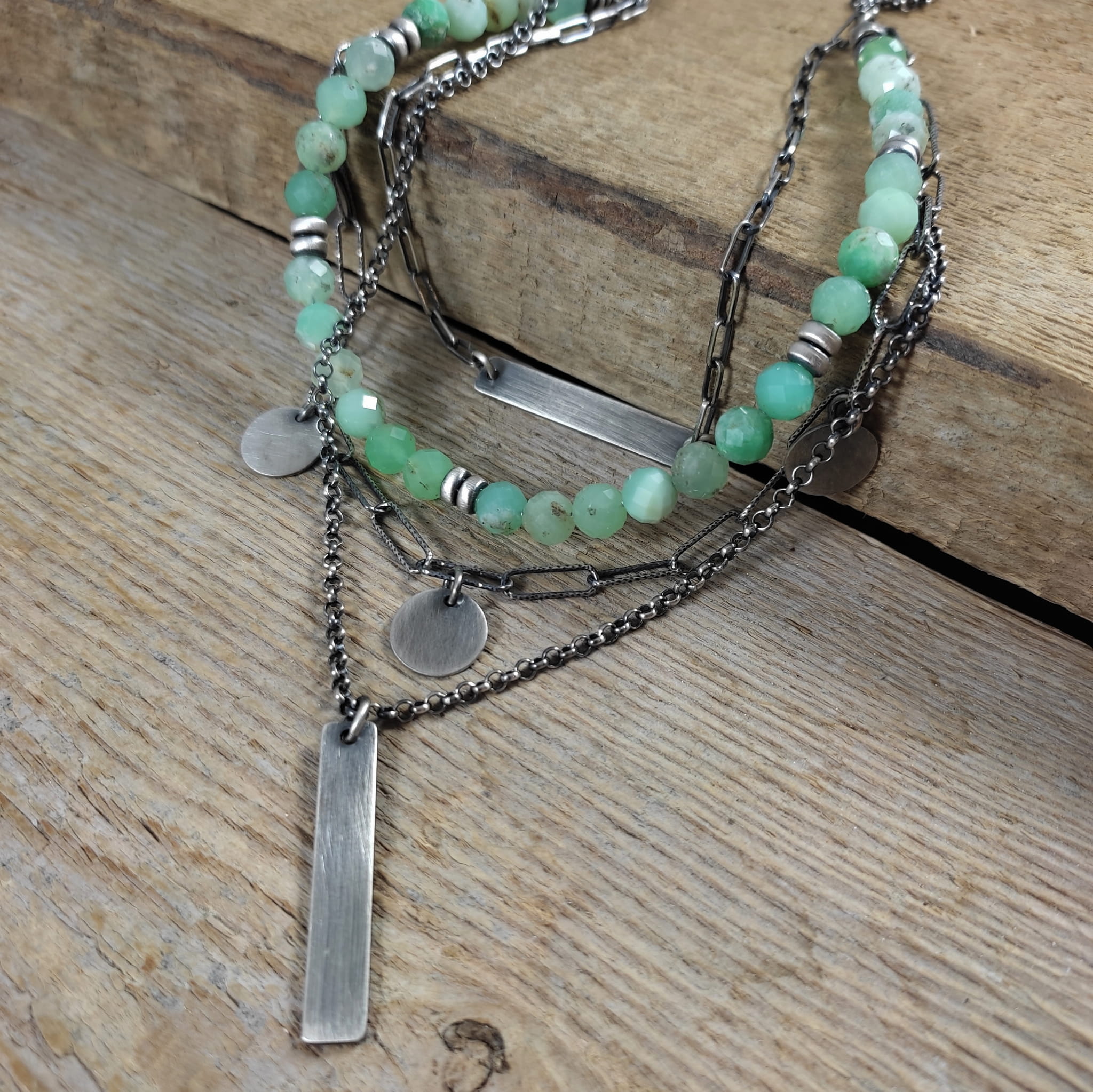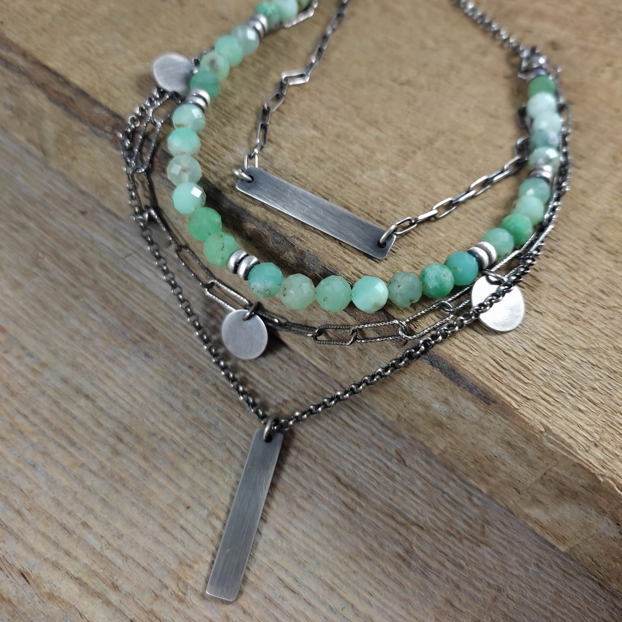 Naszyjnik wykonany z surowych kul chryzoprazu 5.5 mm. Całość wykończona w srebrze 925, oksydowanym i wypolerowanym. Długość naszyjnika wynosi ok. 40/45/50 cm, plus łańcuszek regulacyjny 5 cm. (Proszę wpisać w komentarzu, w przypadku braku wysyłamy 45 cm).