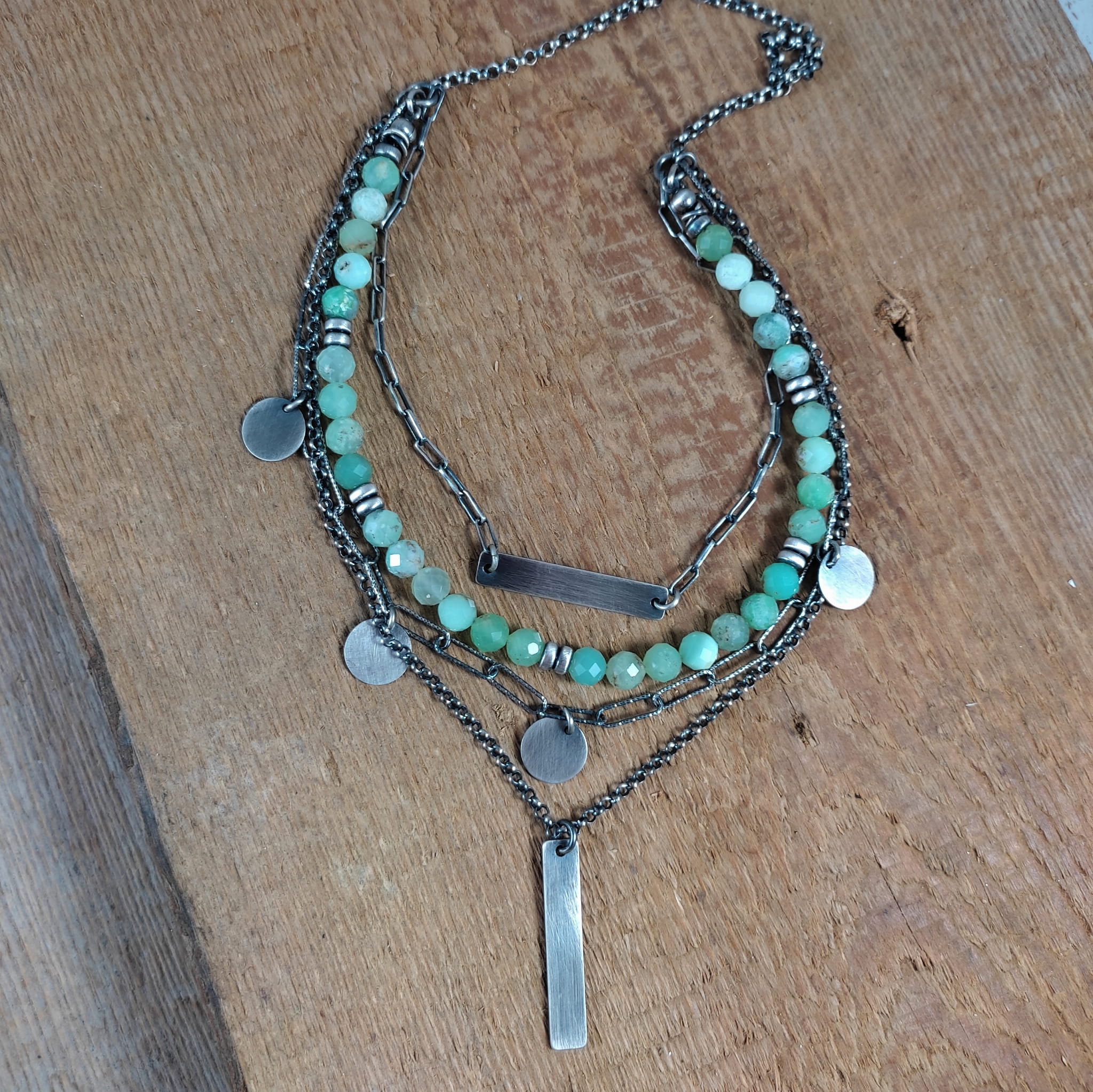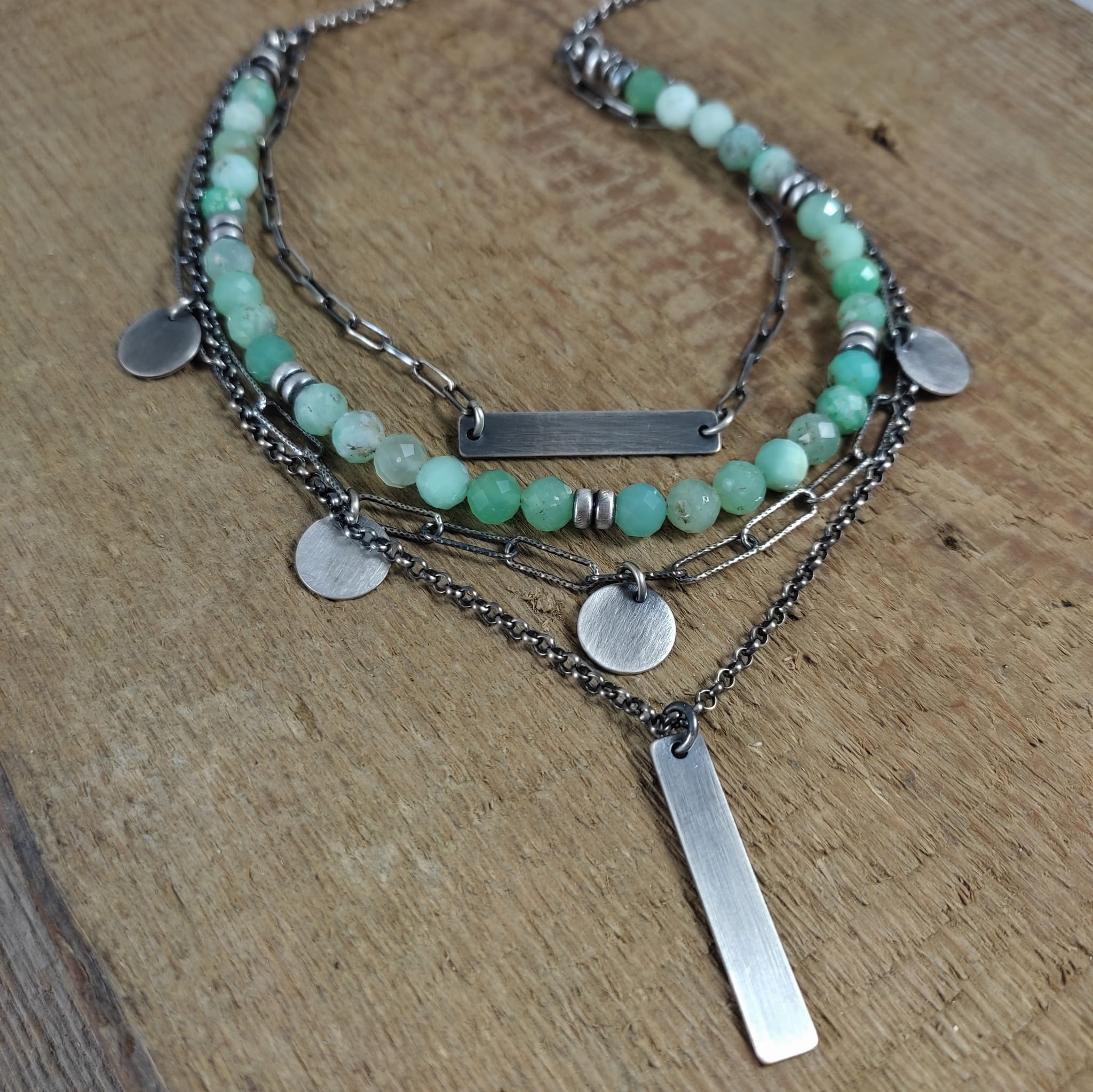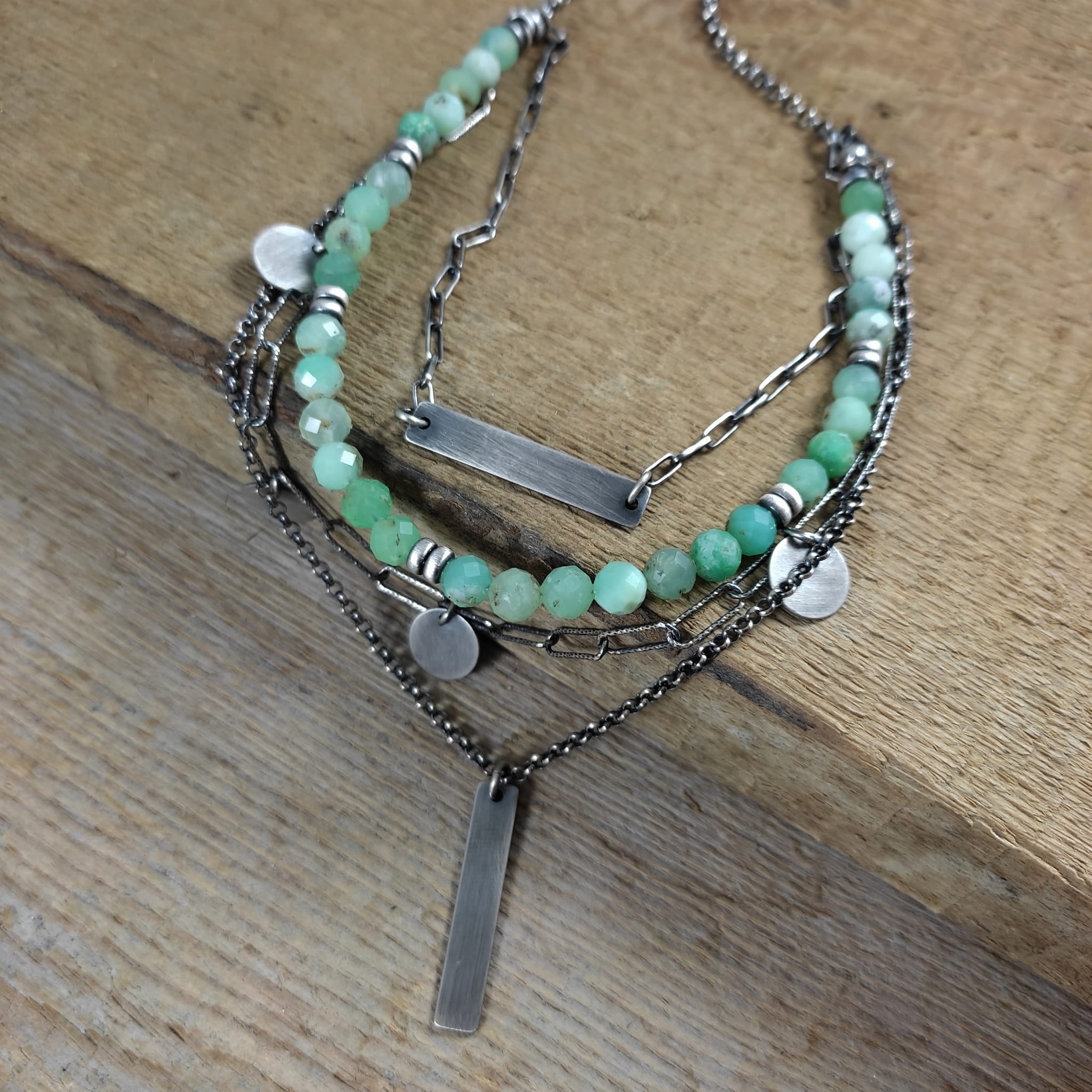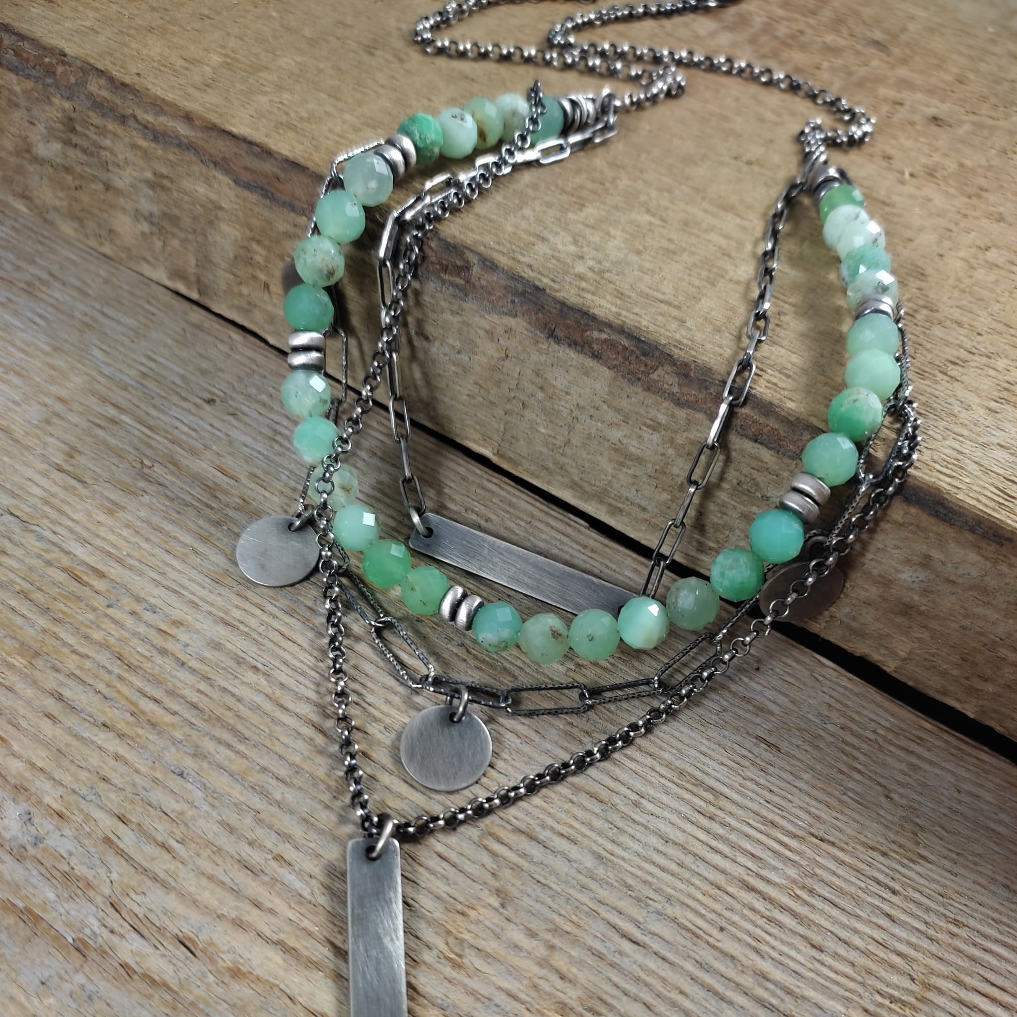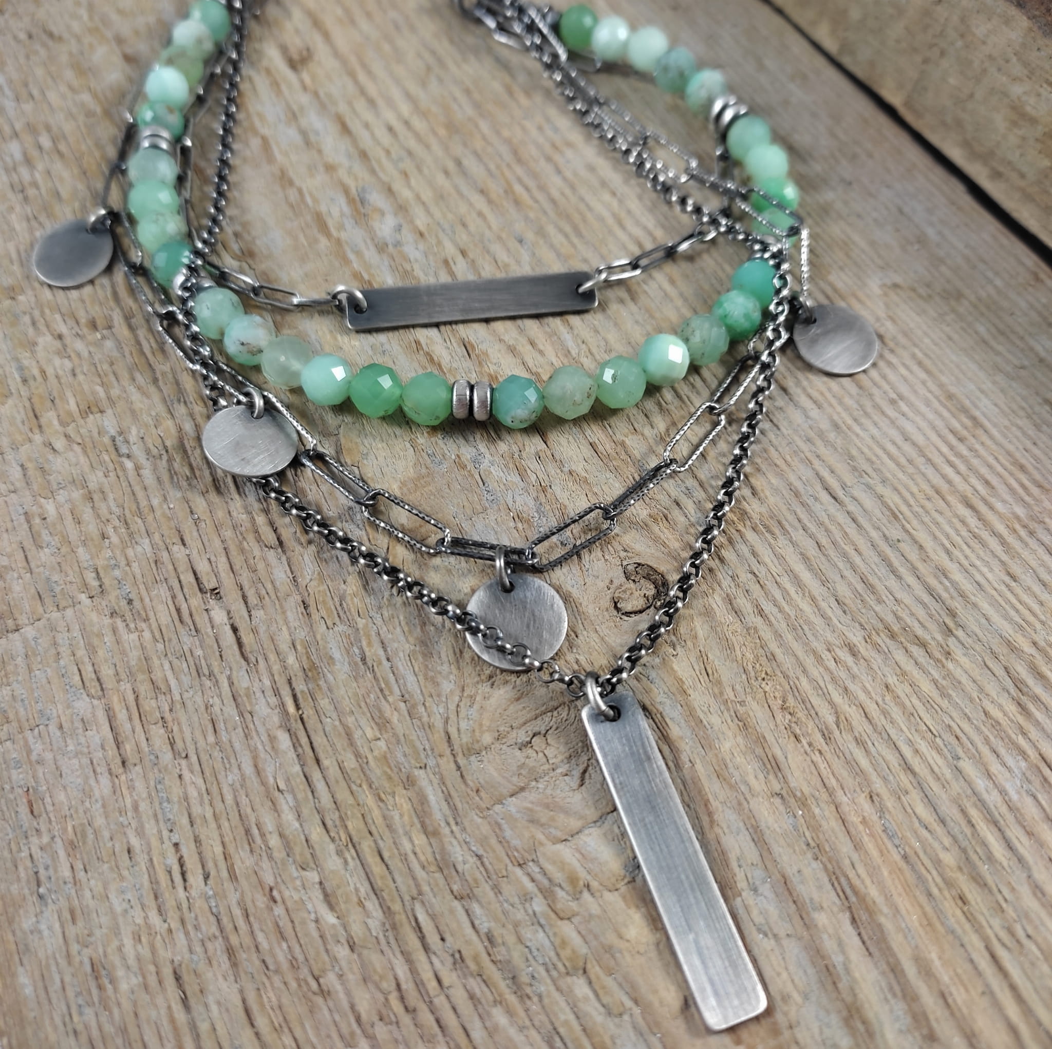 Naszyjnik wykonany z surowych kul chryzoprazu 5.5 mm. Całość wykończona w srebrze 925, oksydowanym i wypolerowanym. Długość naszyjnika wynosi ok. 40/45/50 cm, plus łańcuszek regulacyjny 5 cm. (Proszę wpisać w komentarzu, w przypadku braku wysyłamy 45 cm).