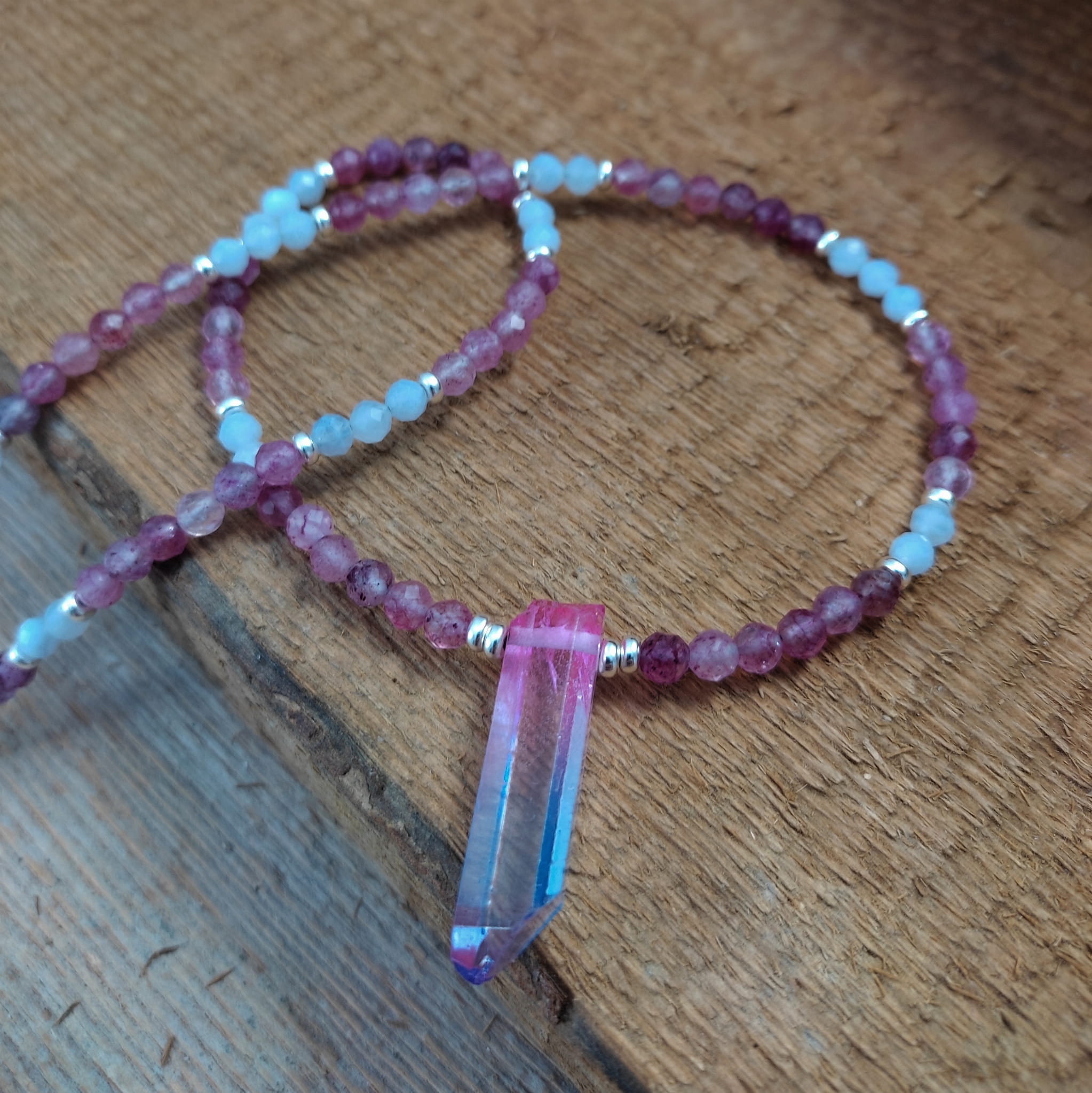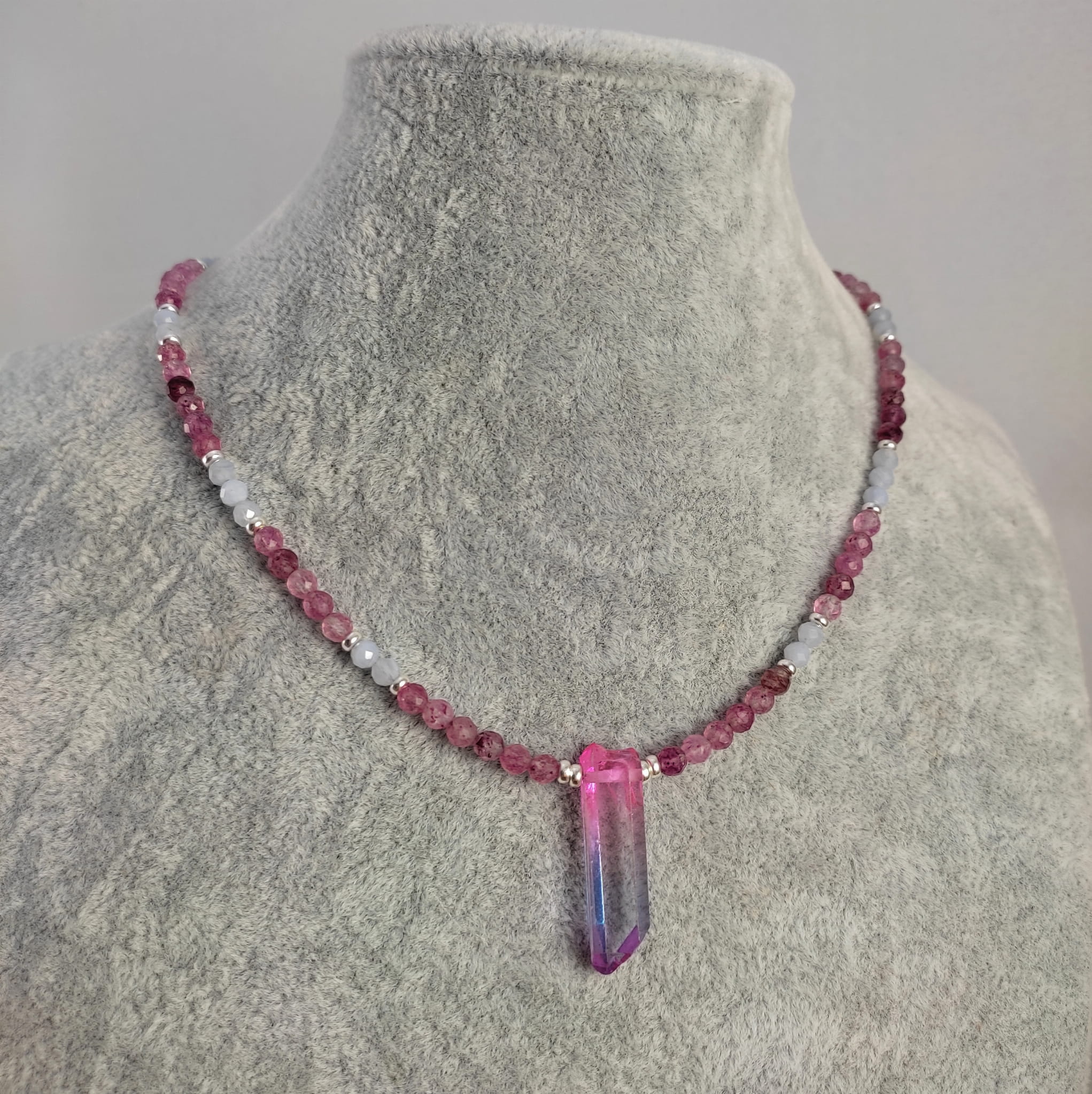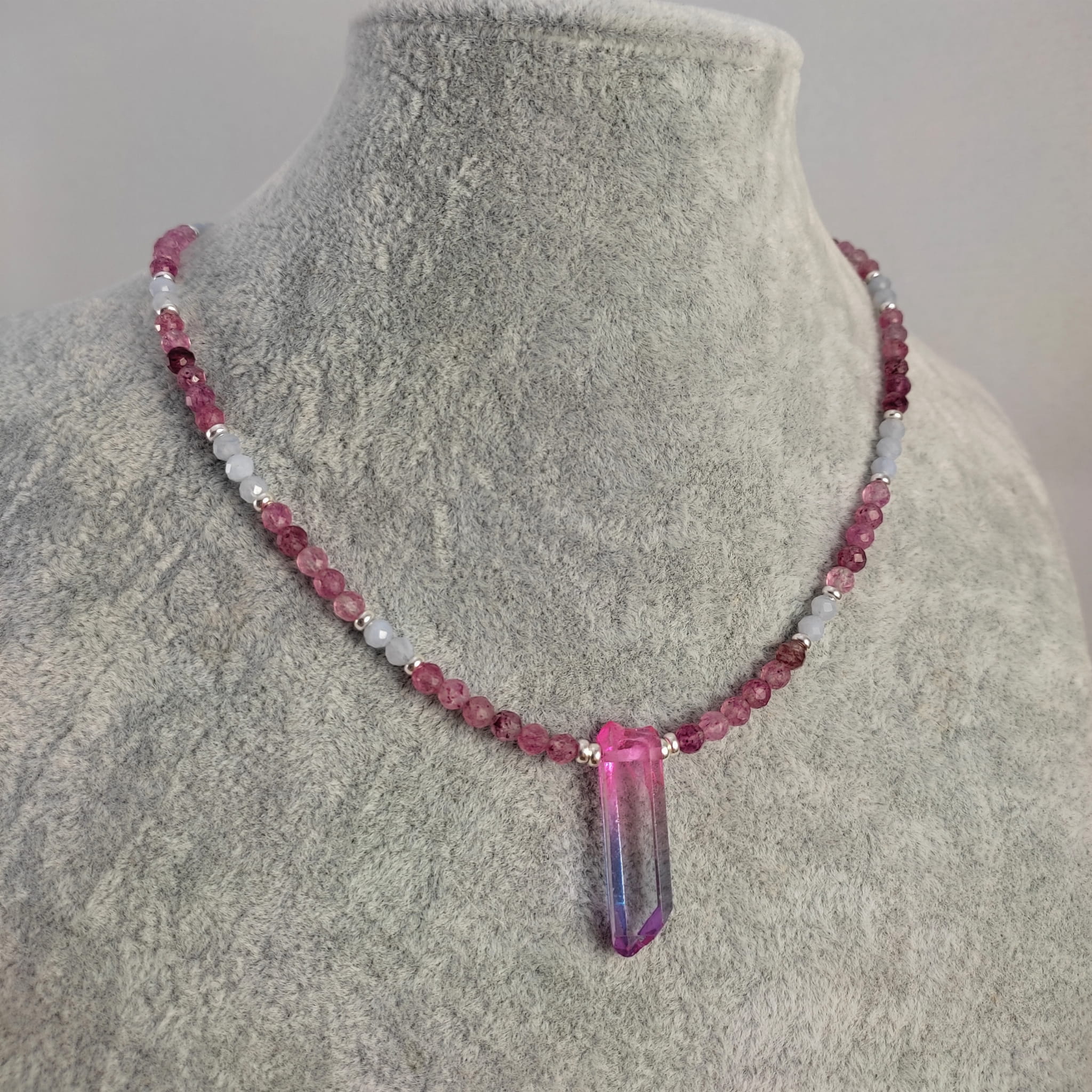 Naszyjnik wykonany z fasetowanych kul kwarcu i chalcedonu ok 4 mm oraz surowego sopla kwarcu ok. 0,9/3,2 cm. Całość dopełniona srebrem 925, oksydowanym i wypolerowanym. Długość naszyjnika wynosi ok. 42,5 cm, plus łańcuszek regulacyjny 5 cm. Elegancko zapakowany. Kamienie posiadają delikatne niedoskonałości, ryski.