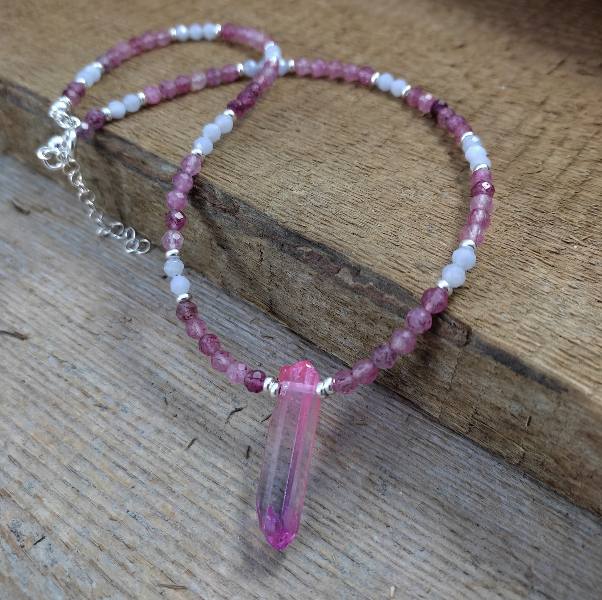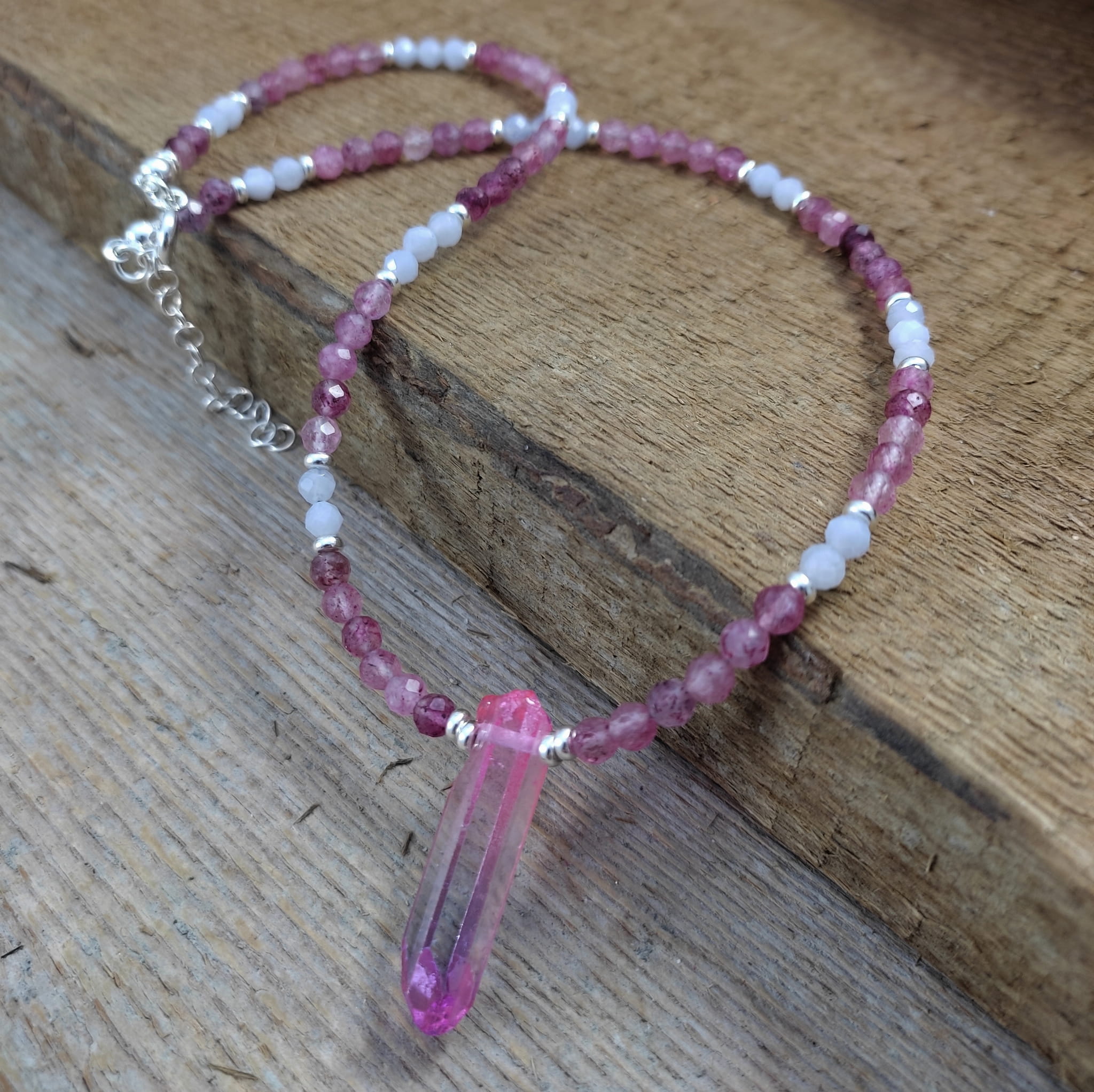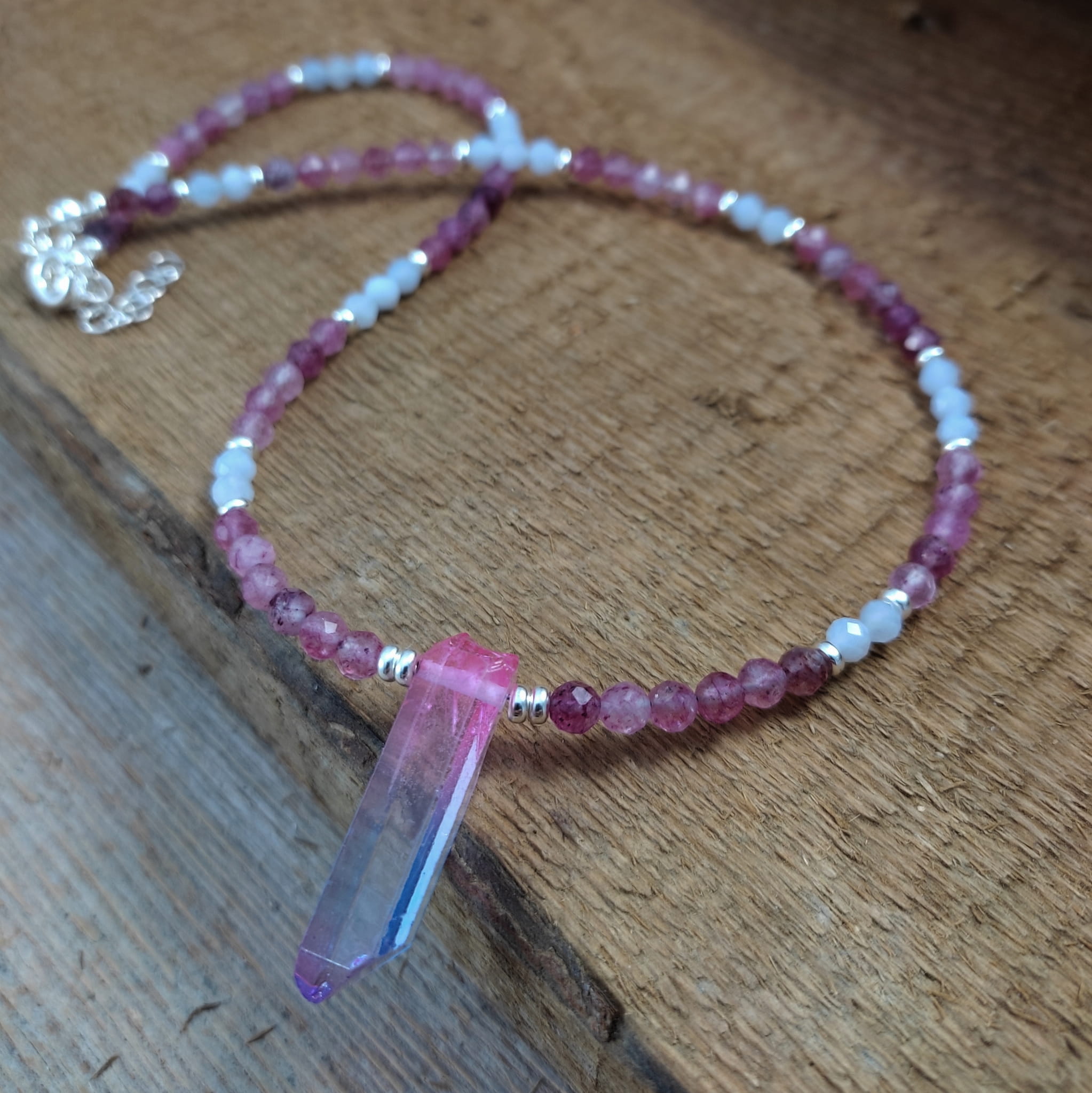 Naszyjnik wykonany z fasetowanych kul kwarcu i chalcedonu ok 4 mm oraz surowego sopla kwarcu ok. 0,9/3,2 cm. Całość dopełniona srebrem 925, oksydowanym i wypolerowanym. Długość naszyjnika wynosi ok. 42,5 cm, plus łańcuszek regulacyjny 5 cm. Elegancko zapakowany. Kamienie posiadają delikatne niedoskonałości, ryski.