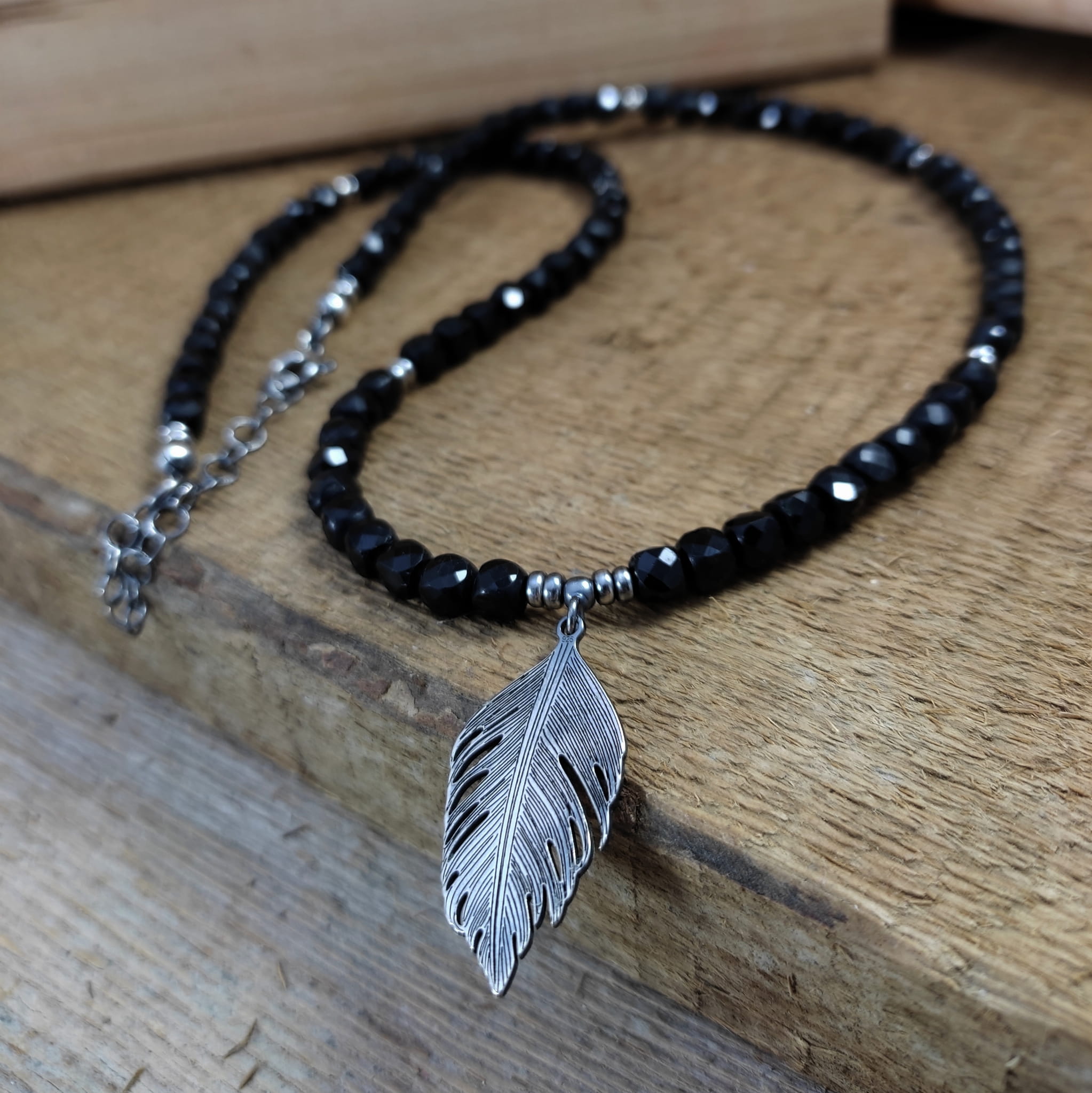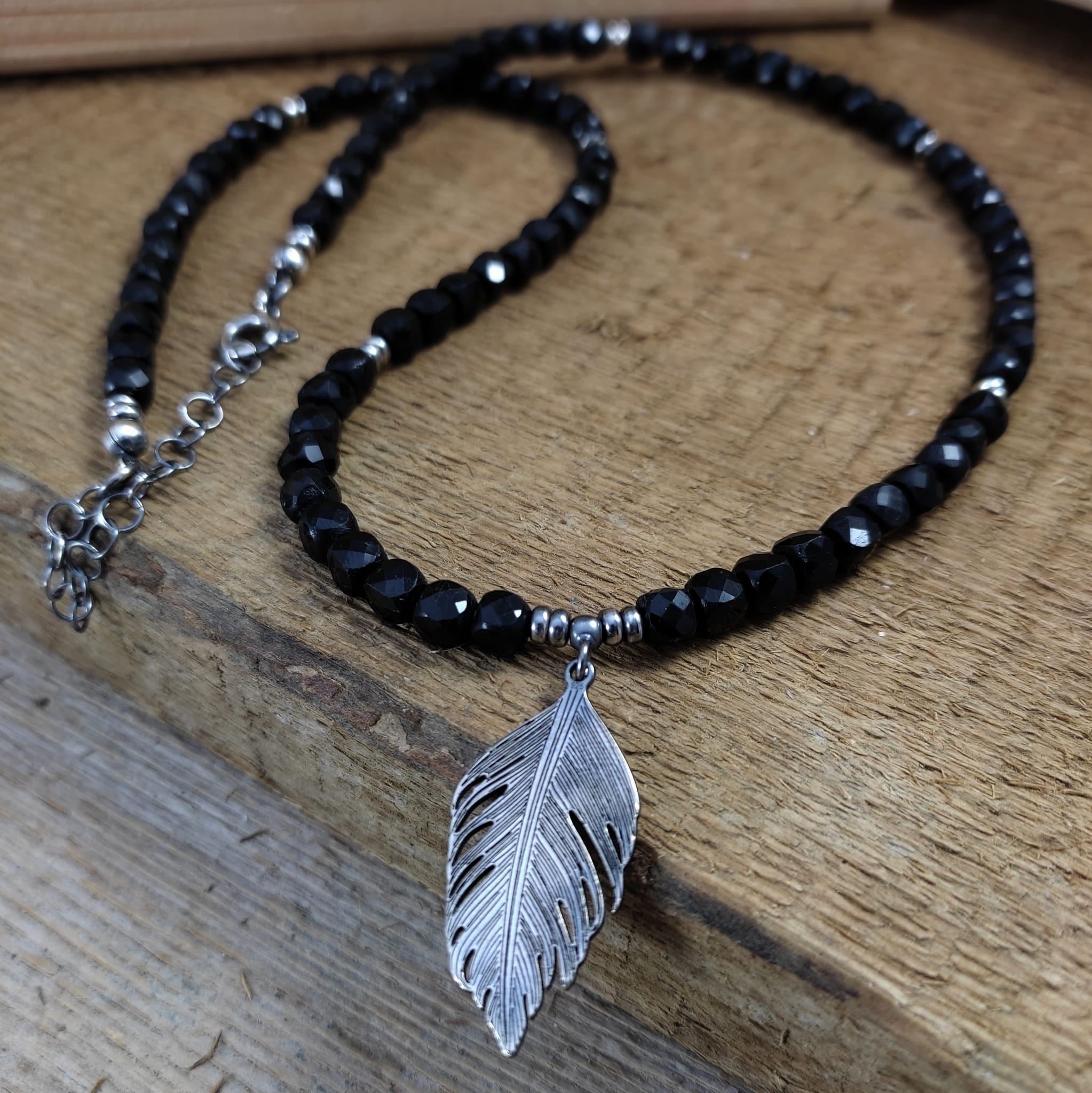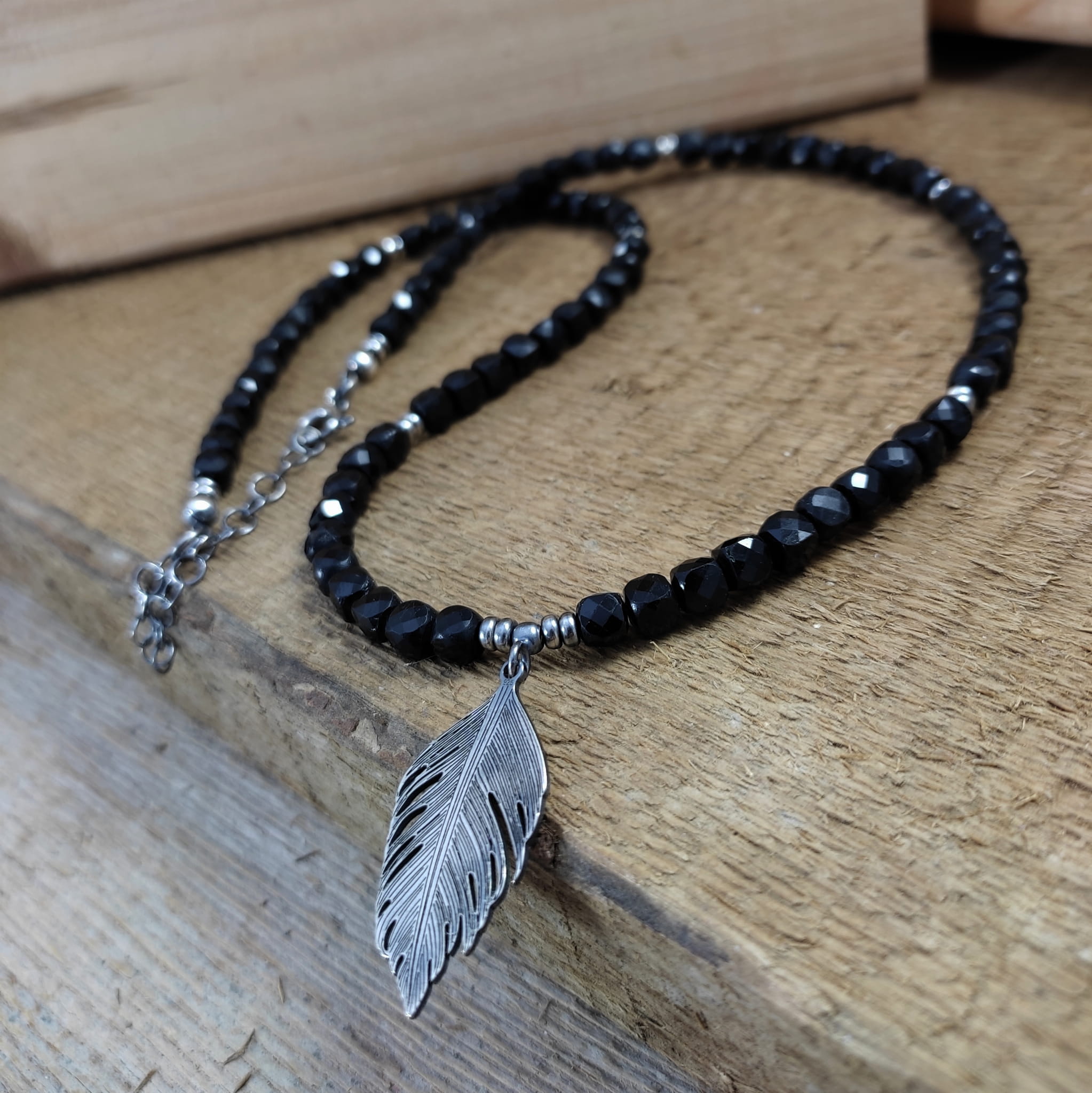 Naszyjnik wykonany z fasetowanych sześcianów turmalinu 4 mm. Całość dopełniona srebrem 925, oksydowanym i wypolerowanym. Długość naszyjnika wynosi ok. 47,5 cm, długość zawieszki, piórka wynosi ok. 30,2/14,8/0,8 mm. Elegancko zapakowany. Kamienie posiadają delikatne niedoskonałości, ryski.