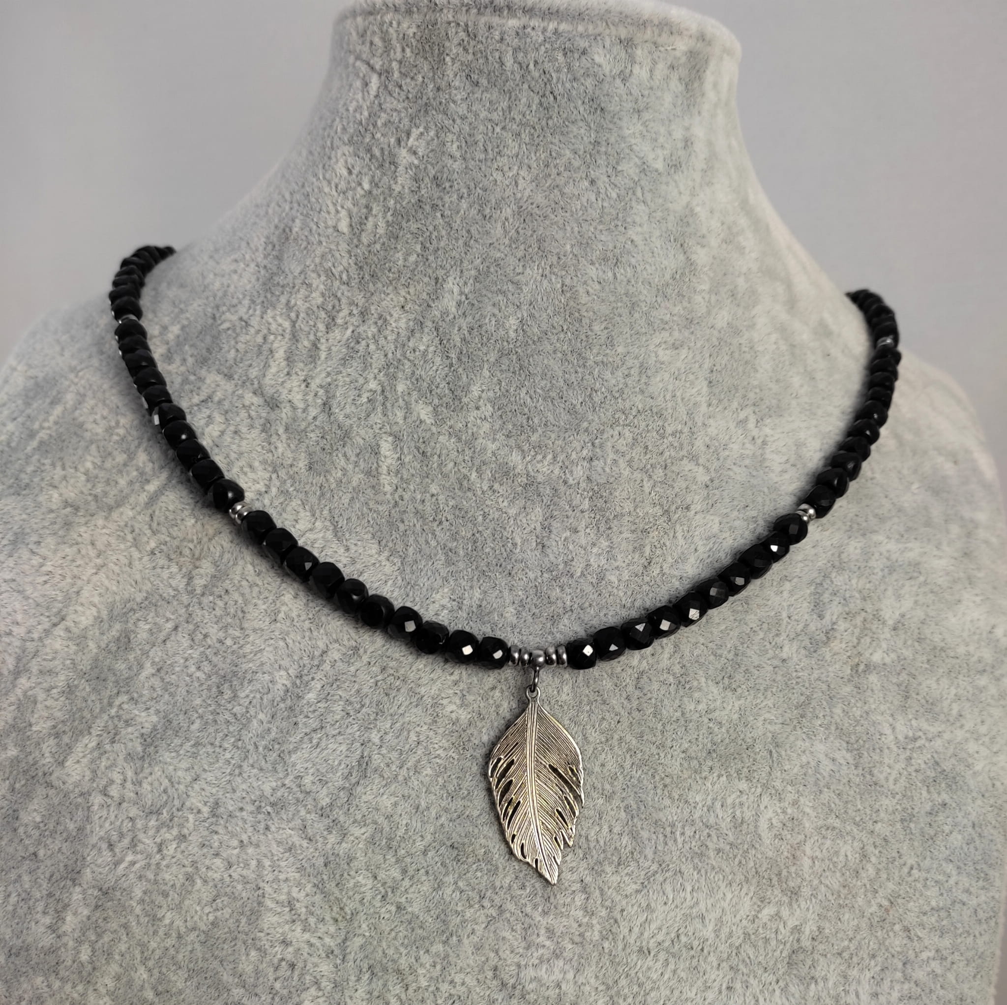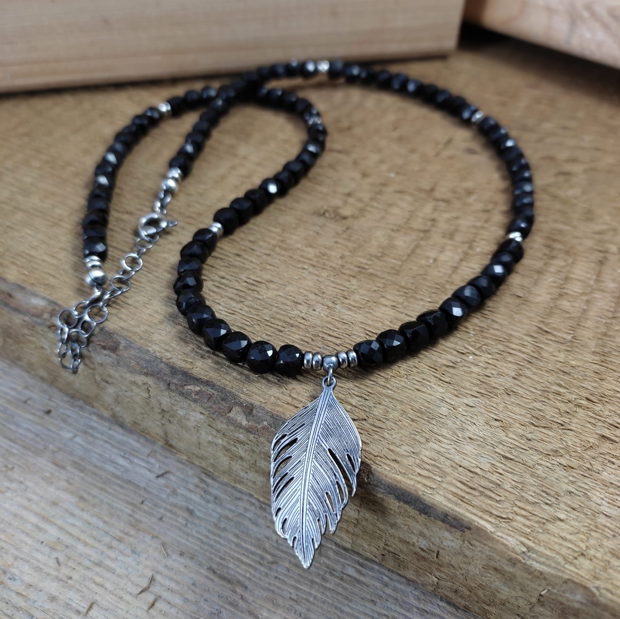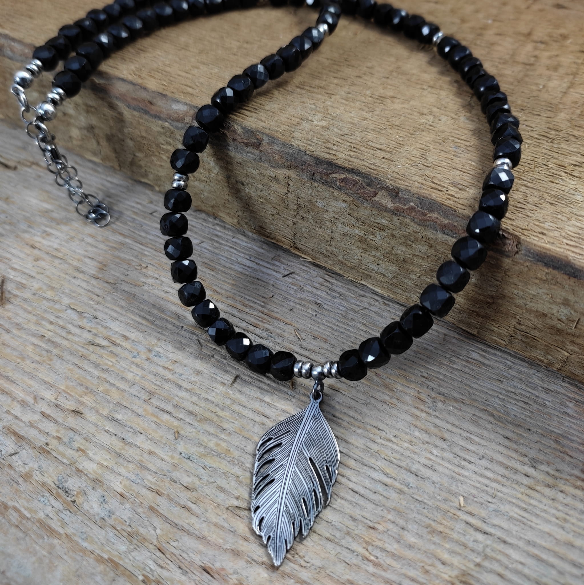 Naszyjnik wykonany z fasetowanych sześcianów turmalinu 4 mm. Całość dopełniona srebrem 925, oksydowanym i wypolerowanym. Długość naszyjnika wynosi ok. 47,5 cm, długość zawieszki, piórka wynosi ok. 30,2/14,8/0,8 mm. Elegancko zapakowany. Kamienie posiadają delikatne niedoskonałości, ryski.