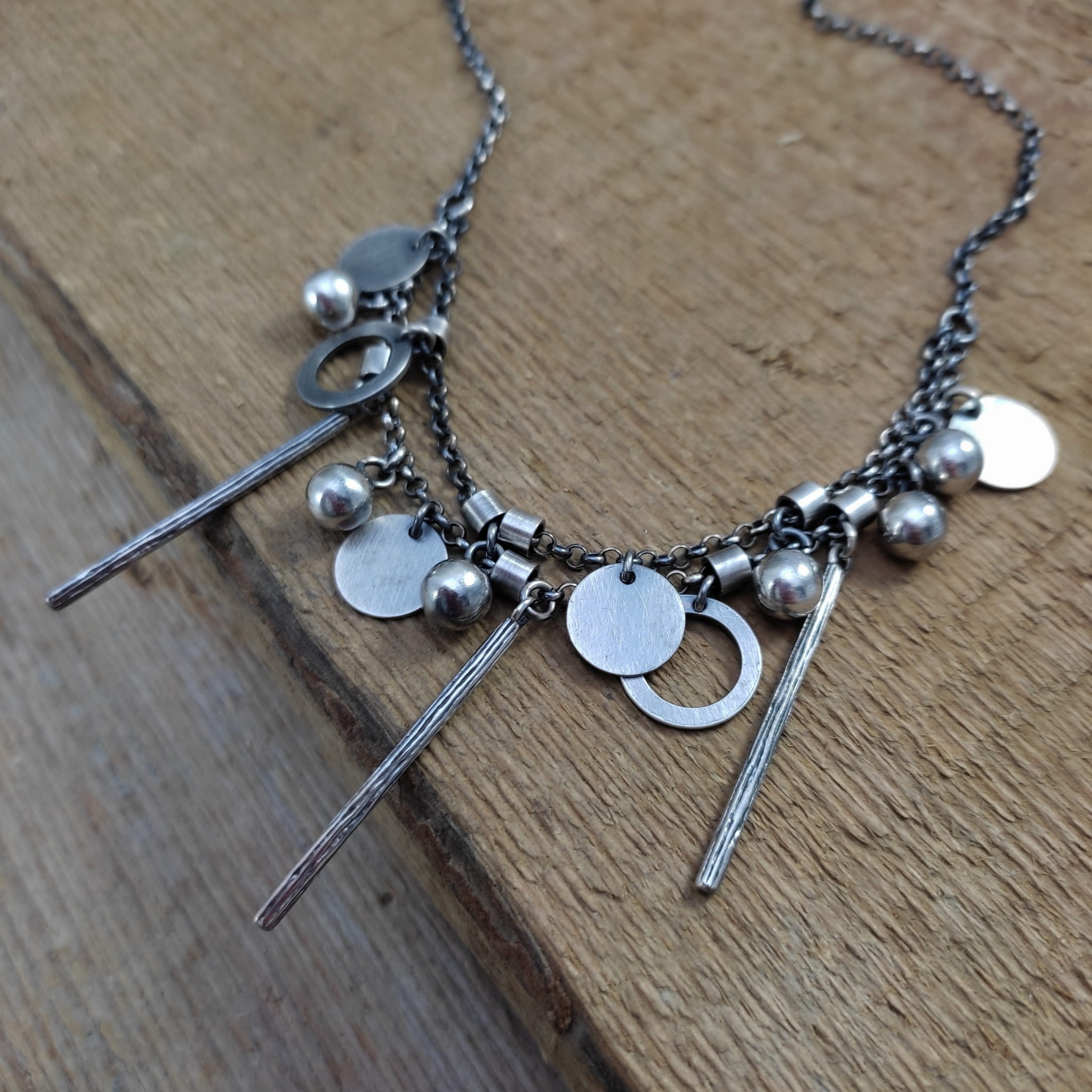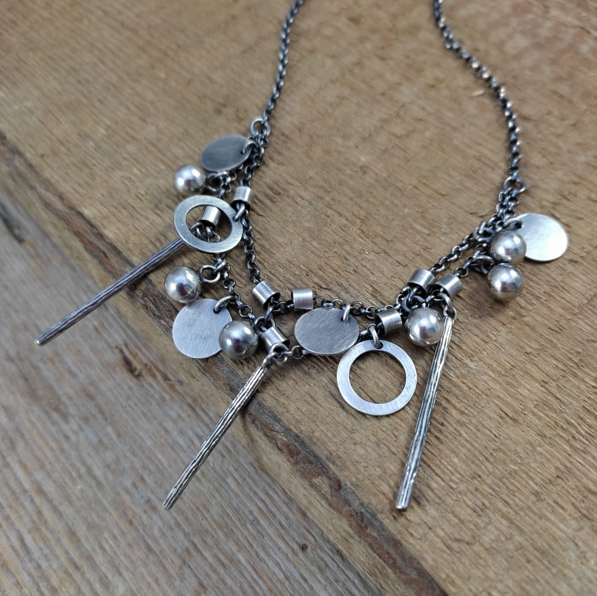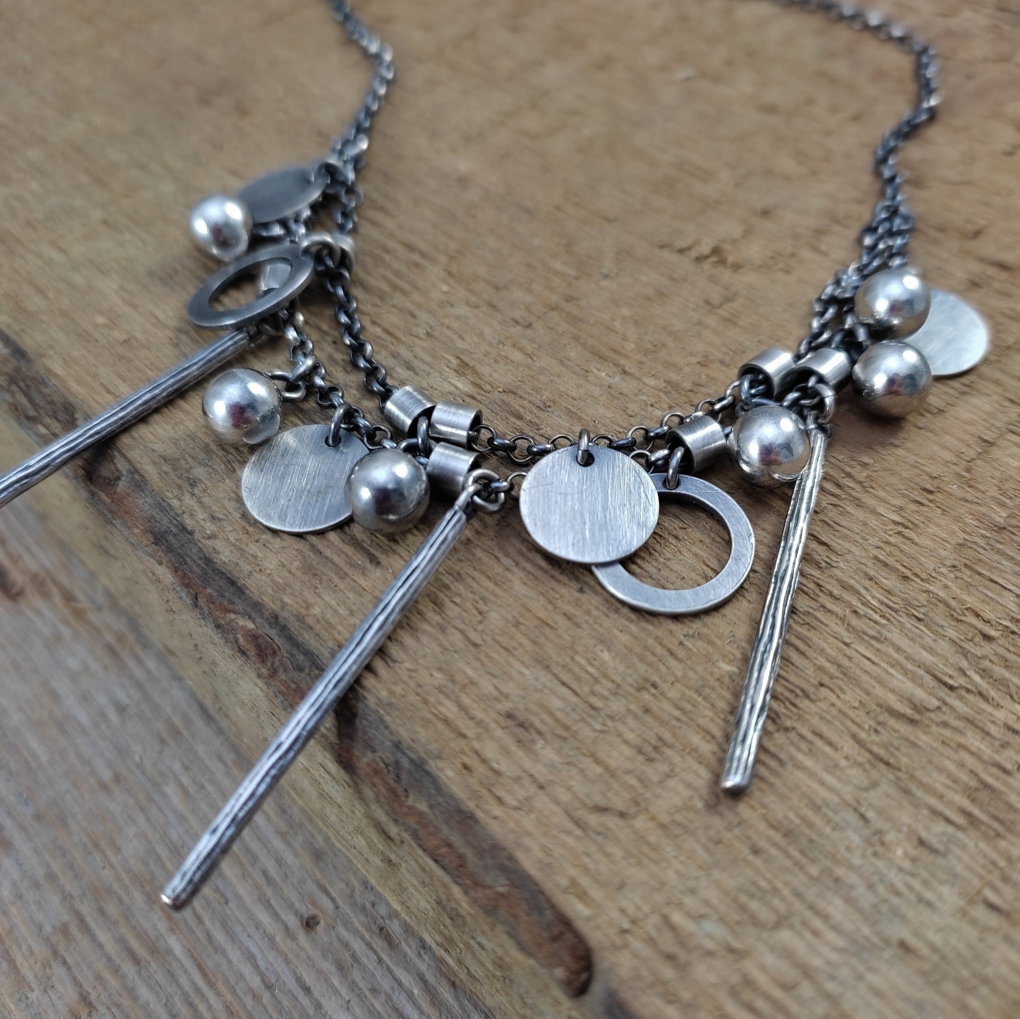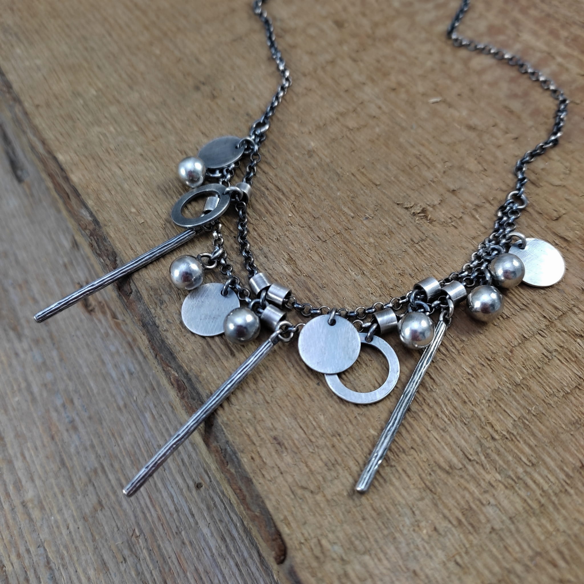 Naszyjnik wykonany ze srebra 925, oksydowanego i wypolerowanego (w tym kółka i blaszki 10-12 mm, kule 6 mm, patyczki 33,5 mm).