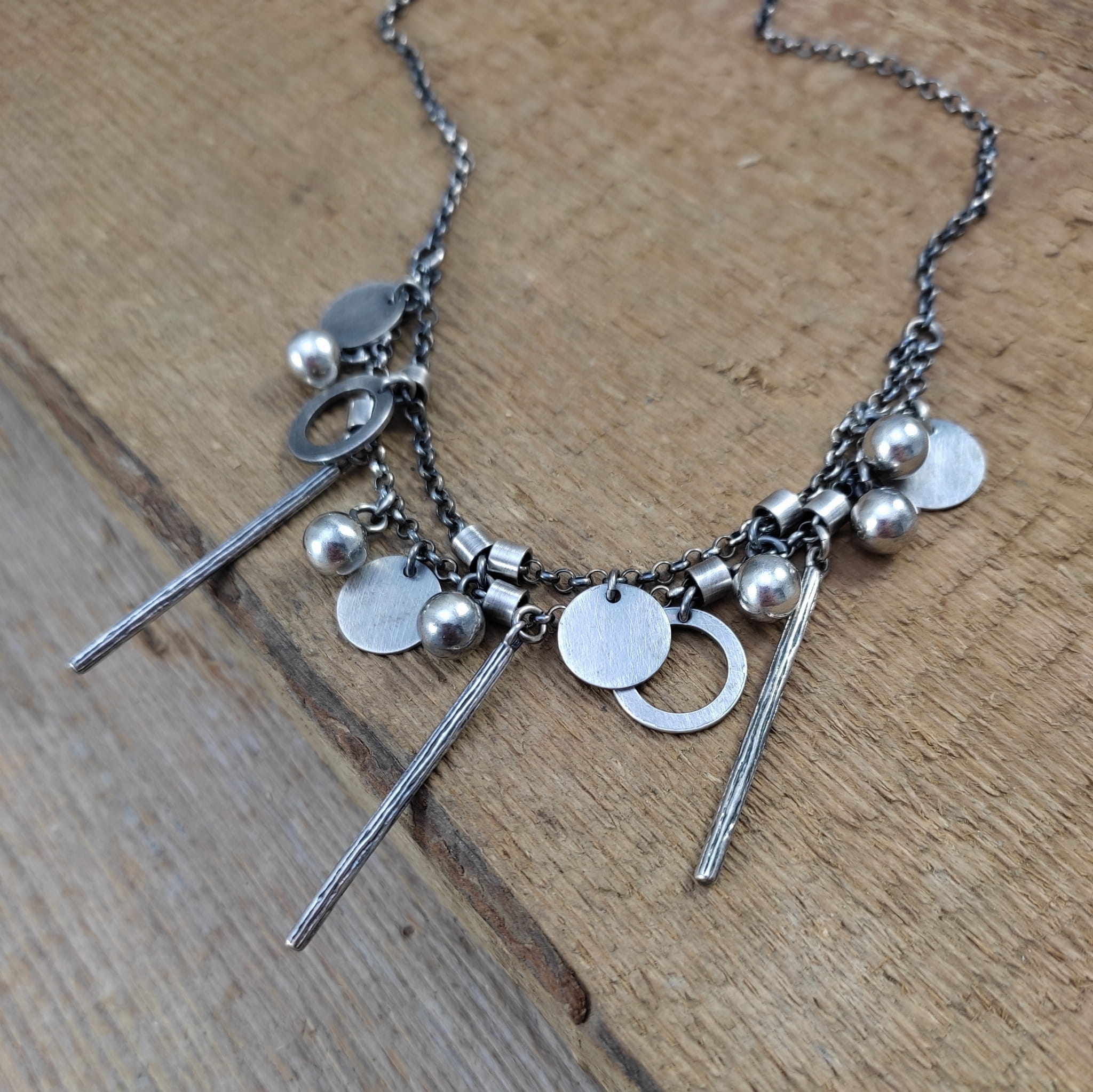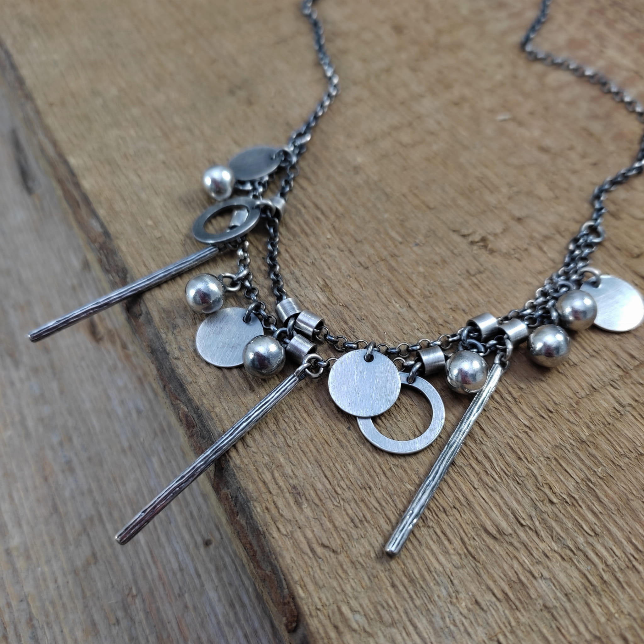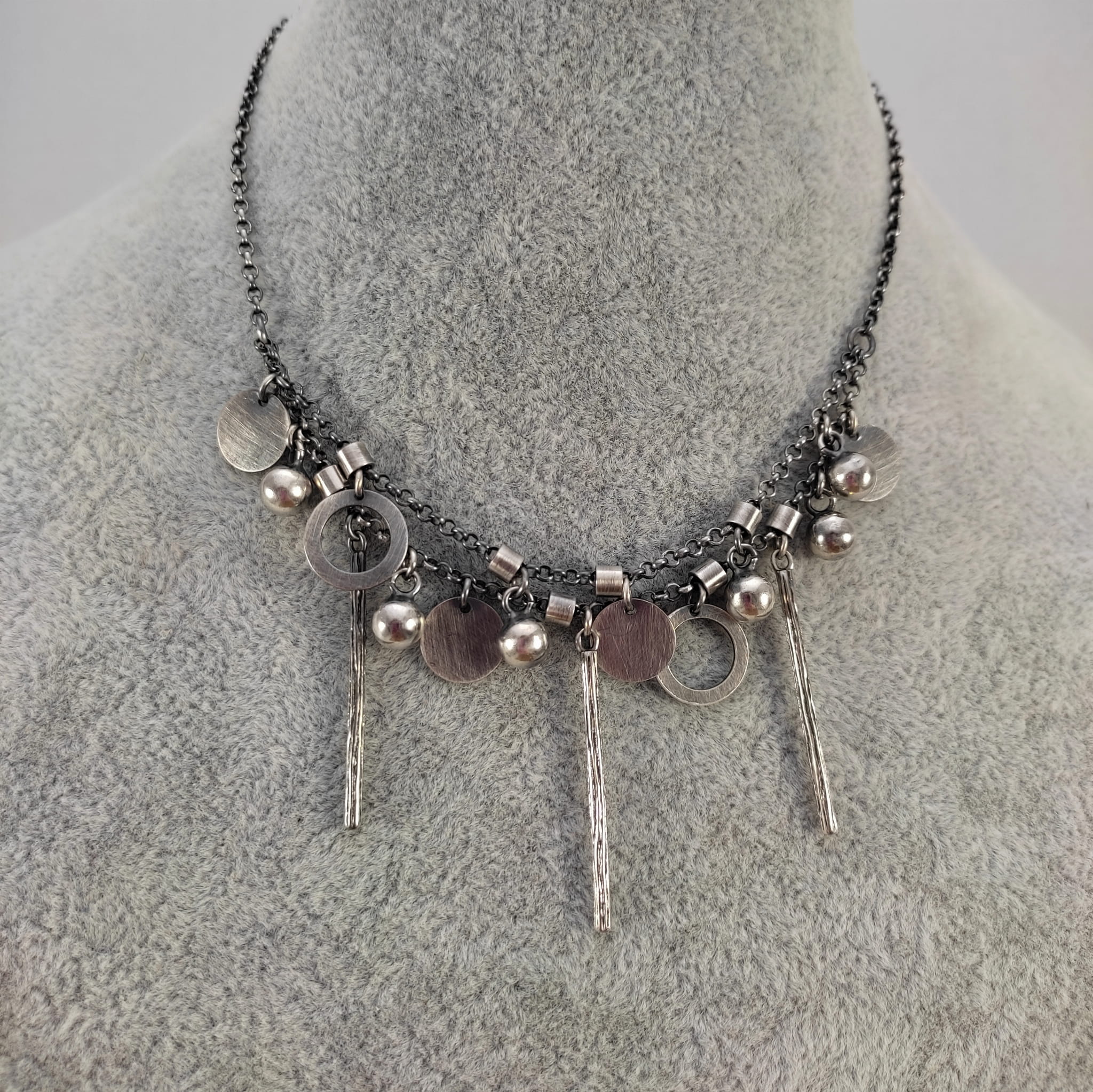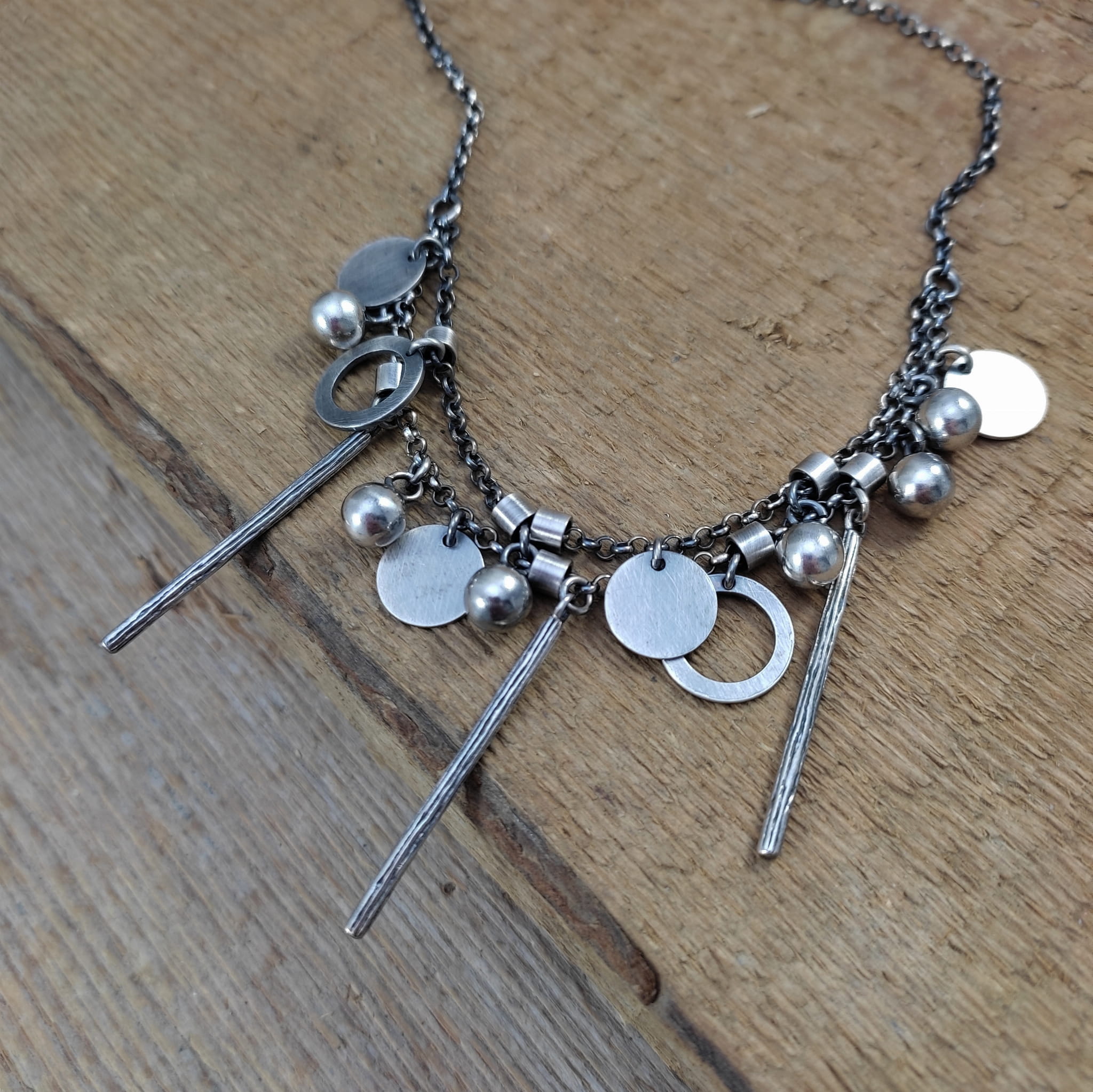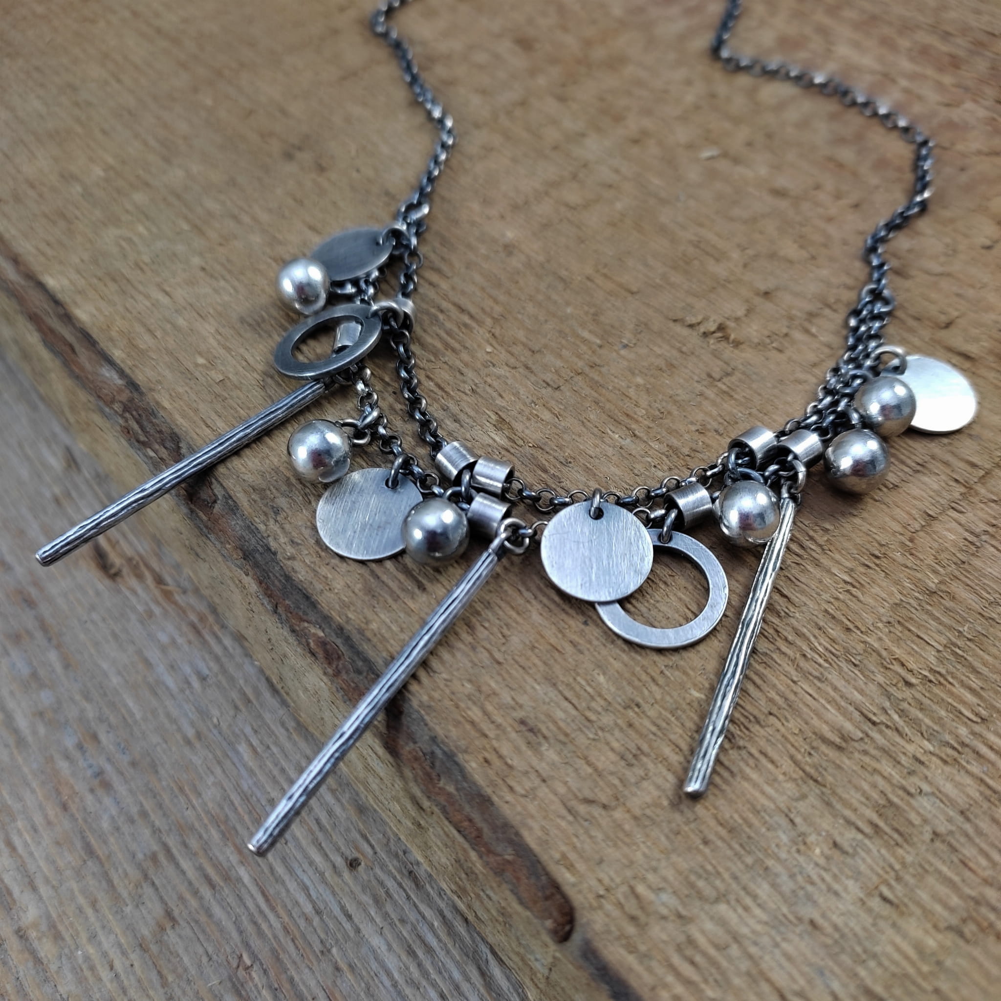 Naszyjnik wykonany ze srebra 925, oksydowanego i wypolerowanego (w tym kółka i blaszki 10-12 mm, kule 6 mm, patyczki 33,5 mm).