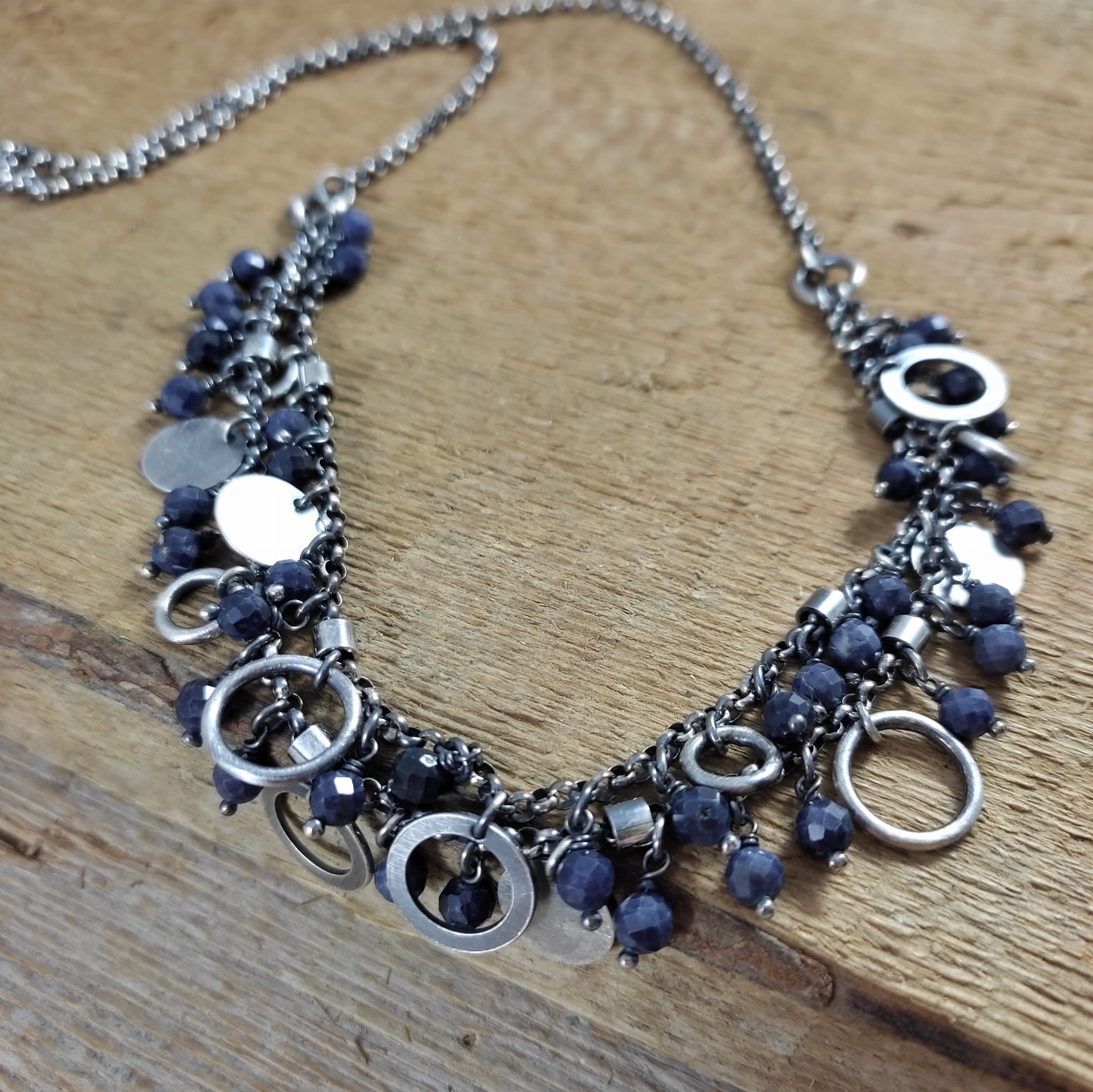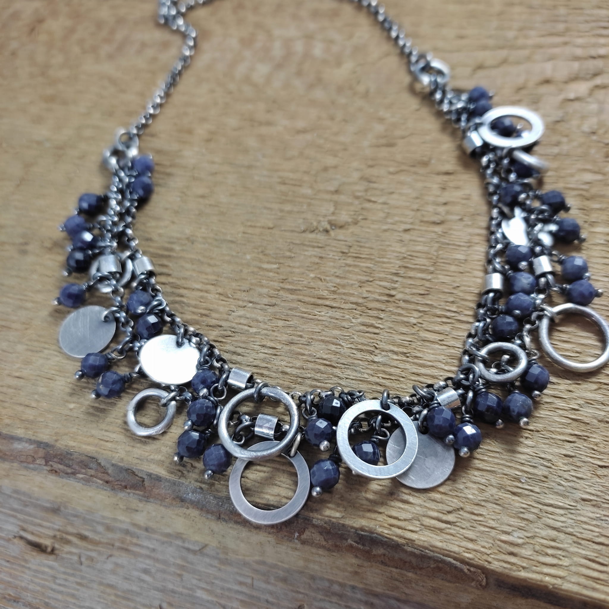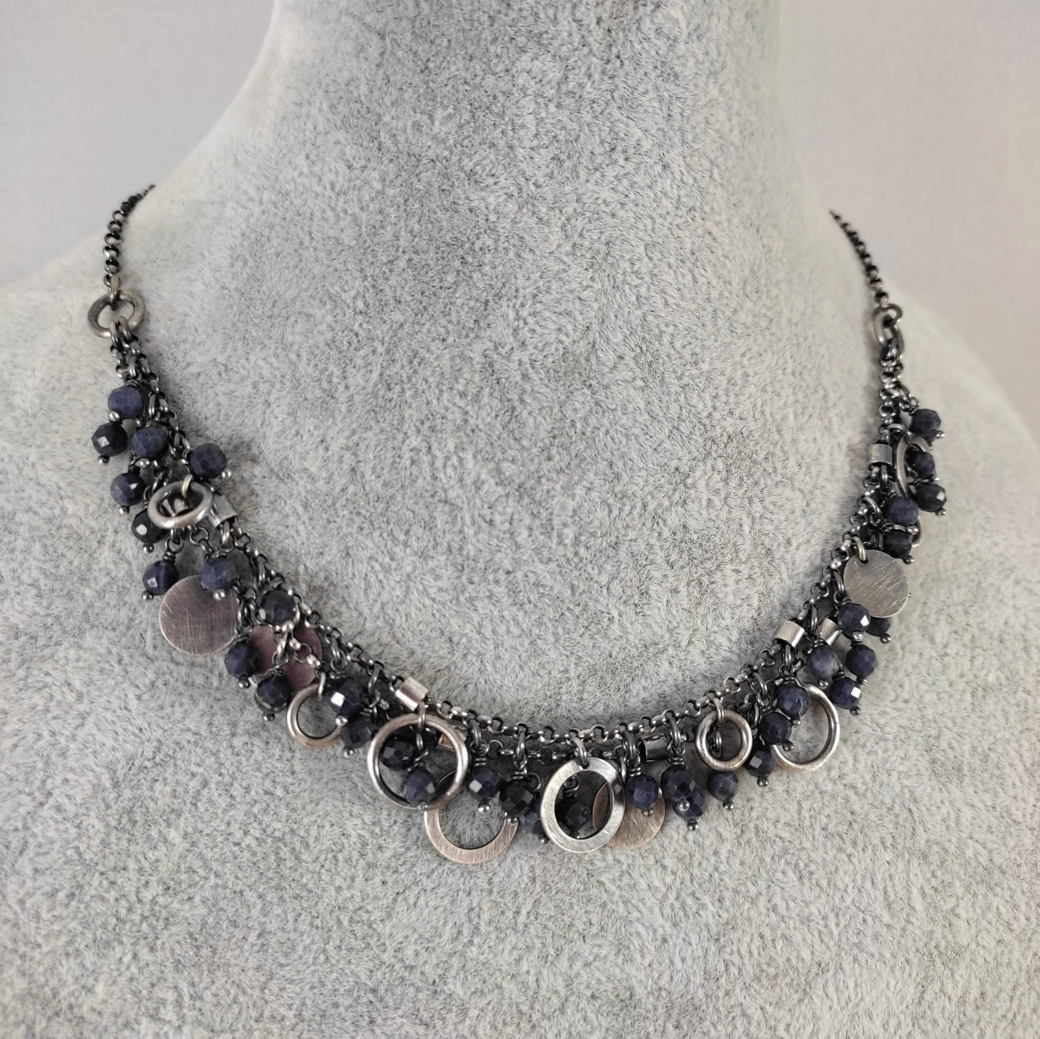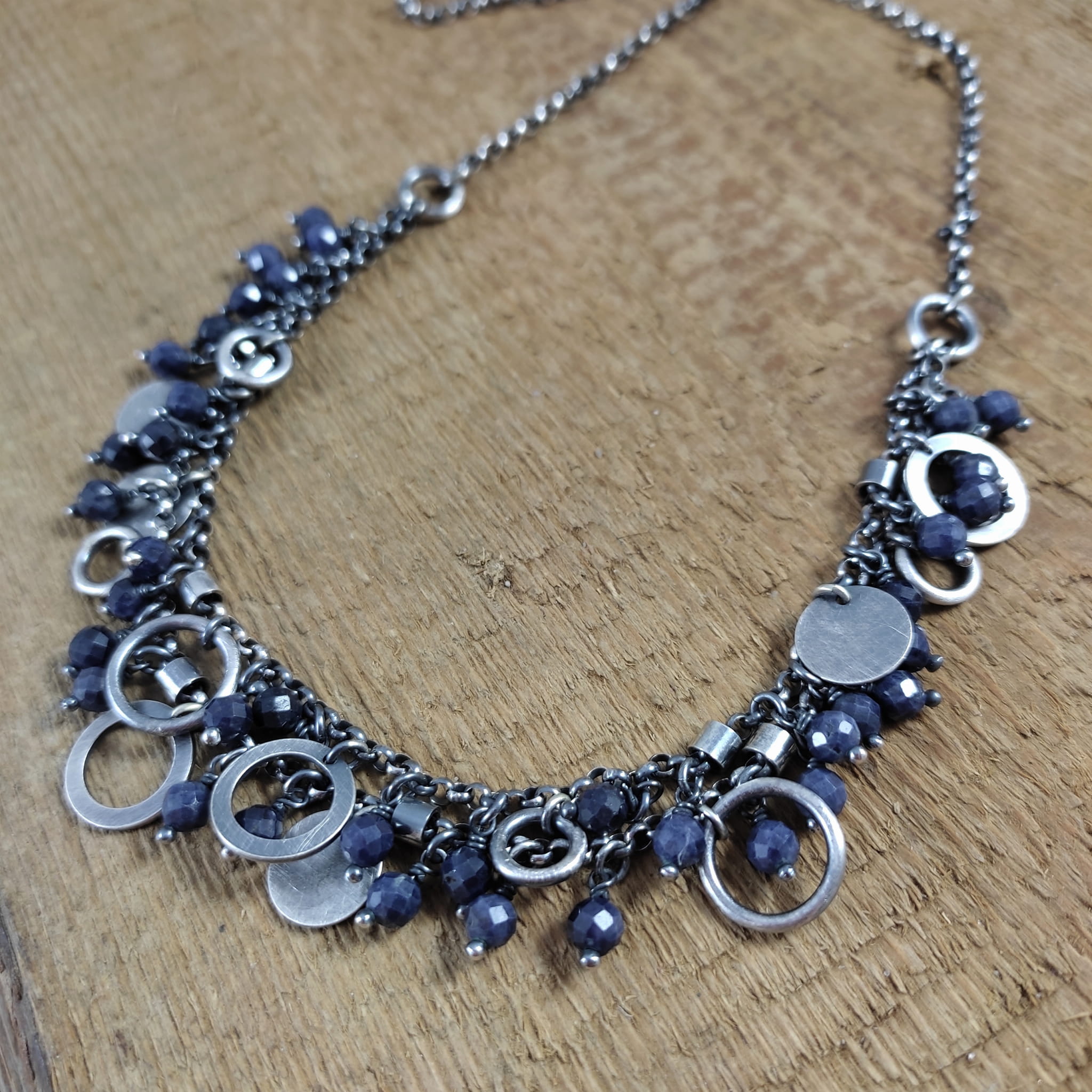 Naszyjnik wykonany z fasetowanych kul szafiru 4 mm. Całość dopełniona srebrem 925, oksydowanym i wypolerowanym.