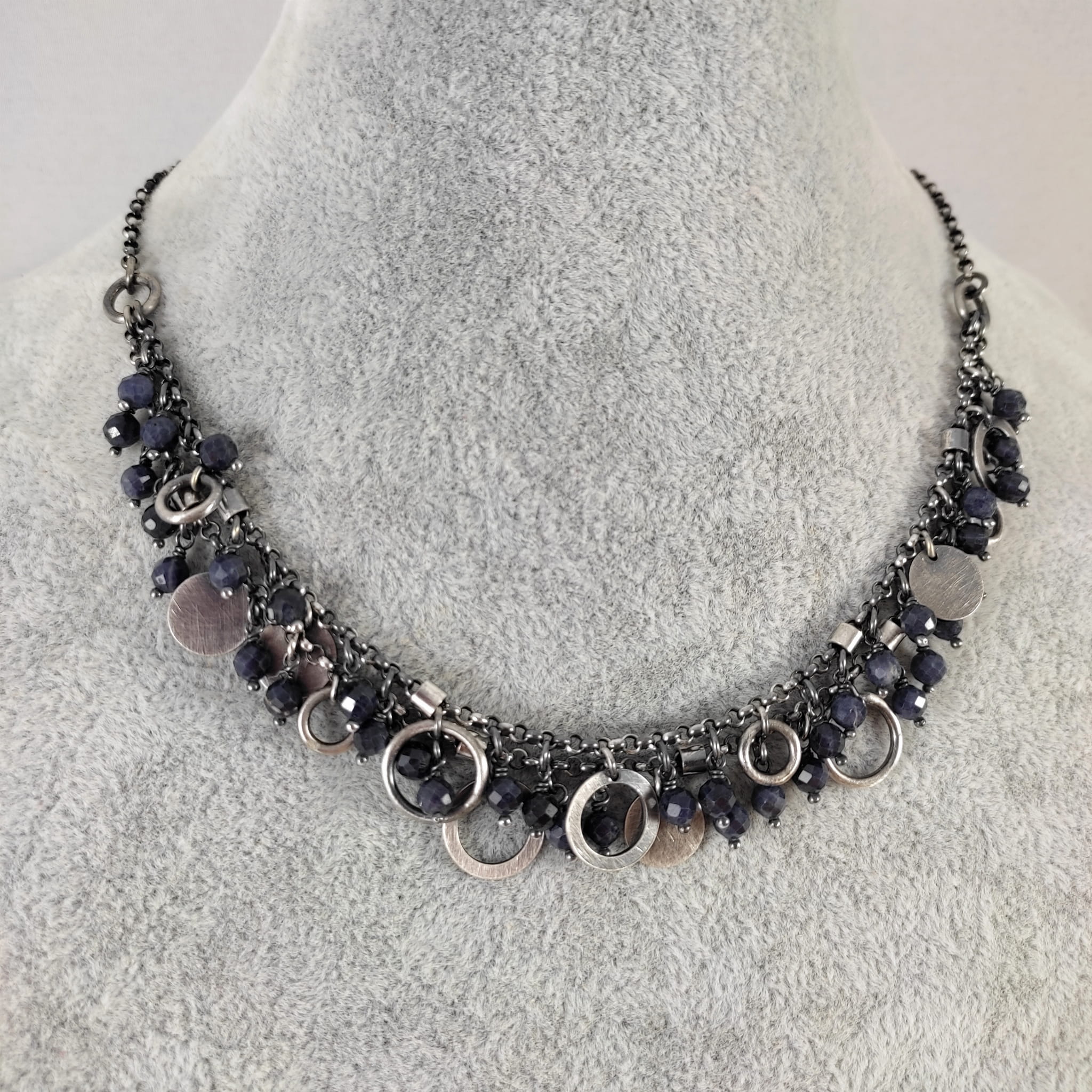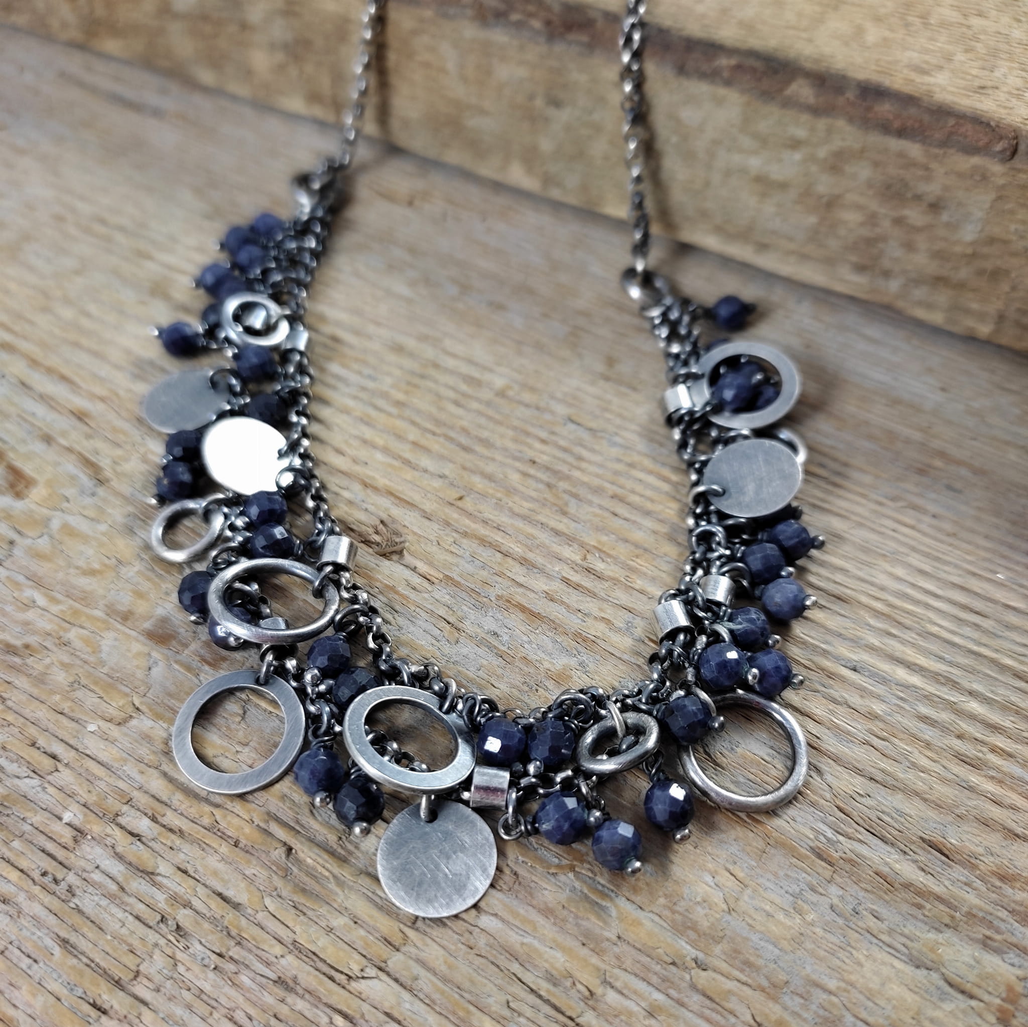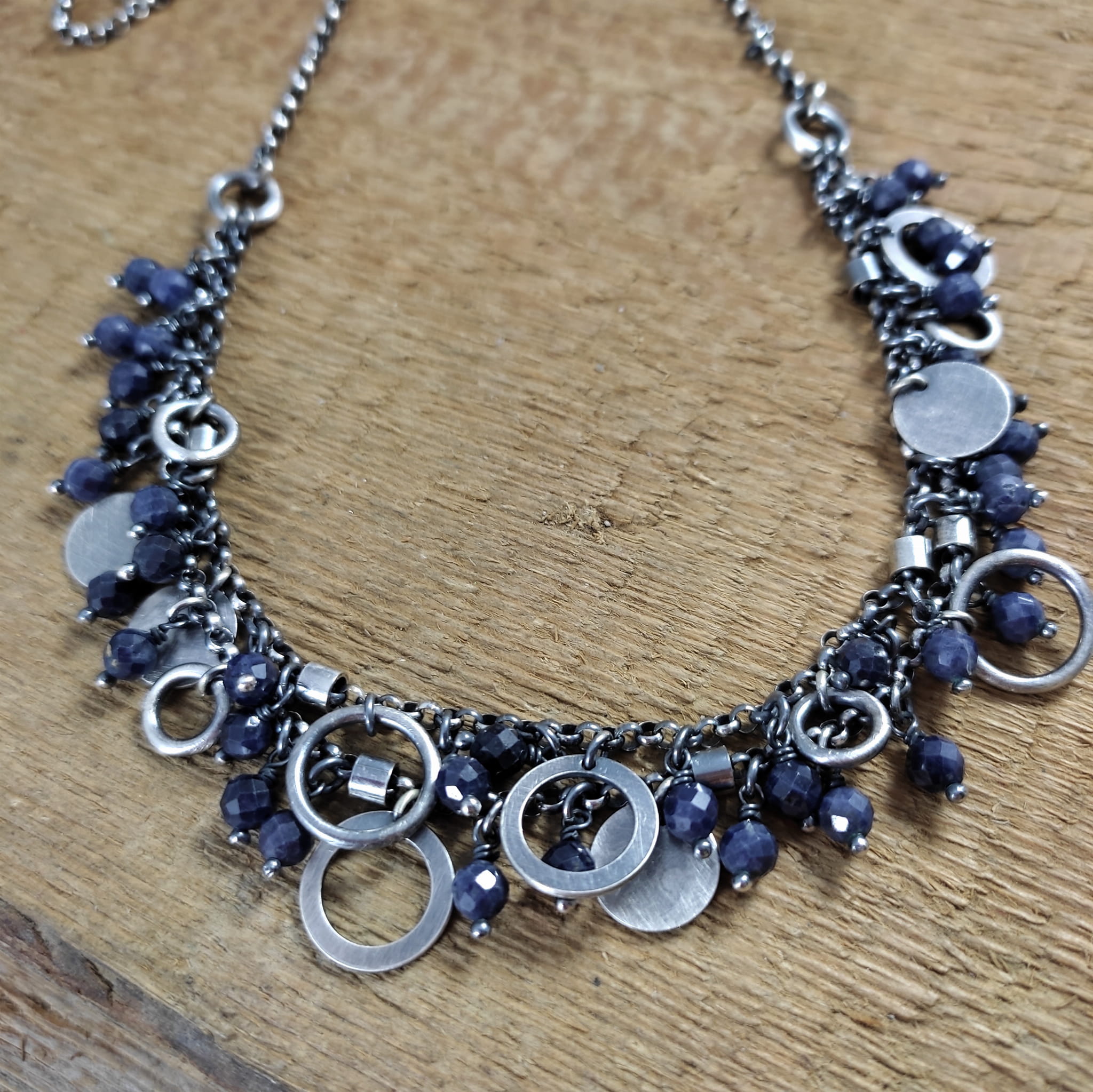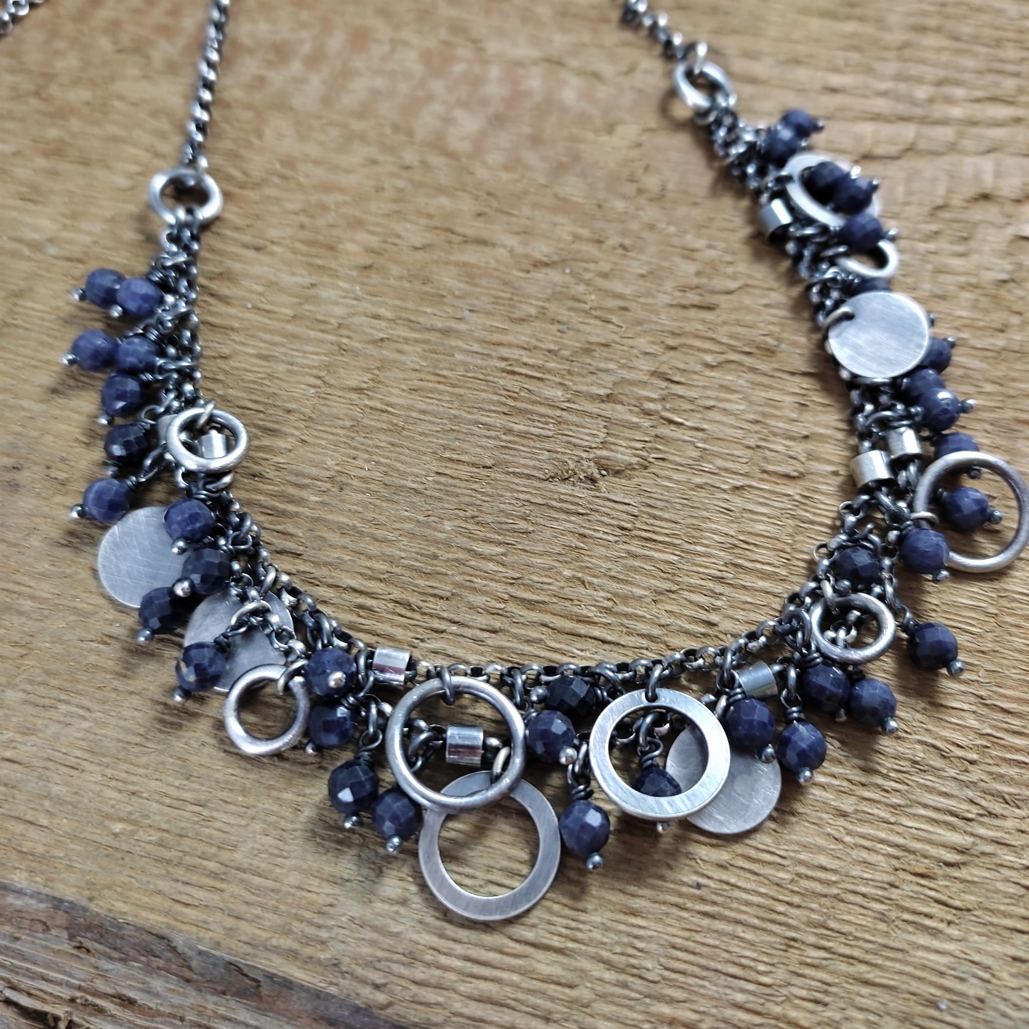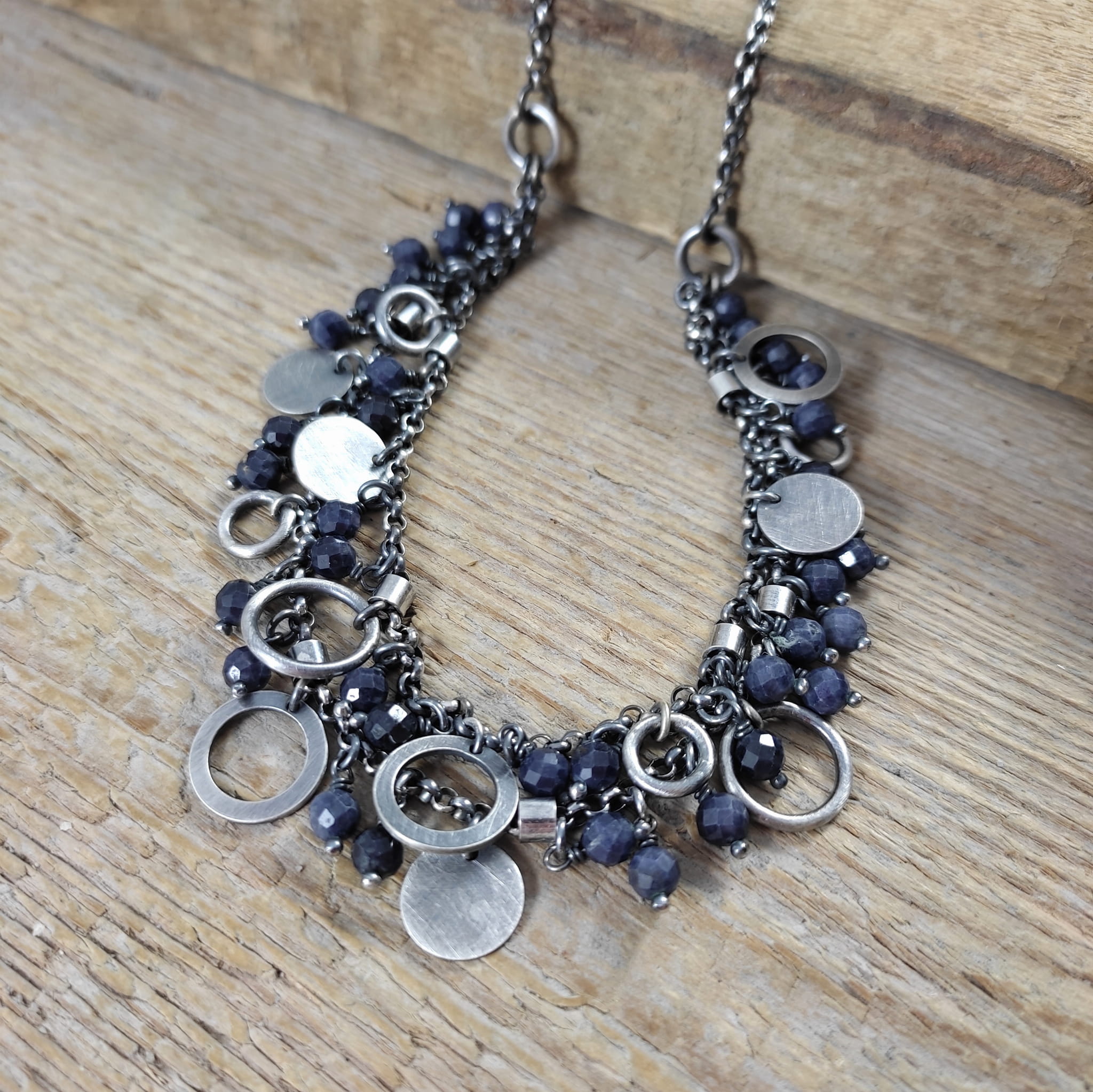 Naszyjnik wykonany z fasetowanych kul szafiru 4 mm. Całość dopełniona srebrem 925, oksydowanym i wypolerowanym.