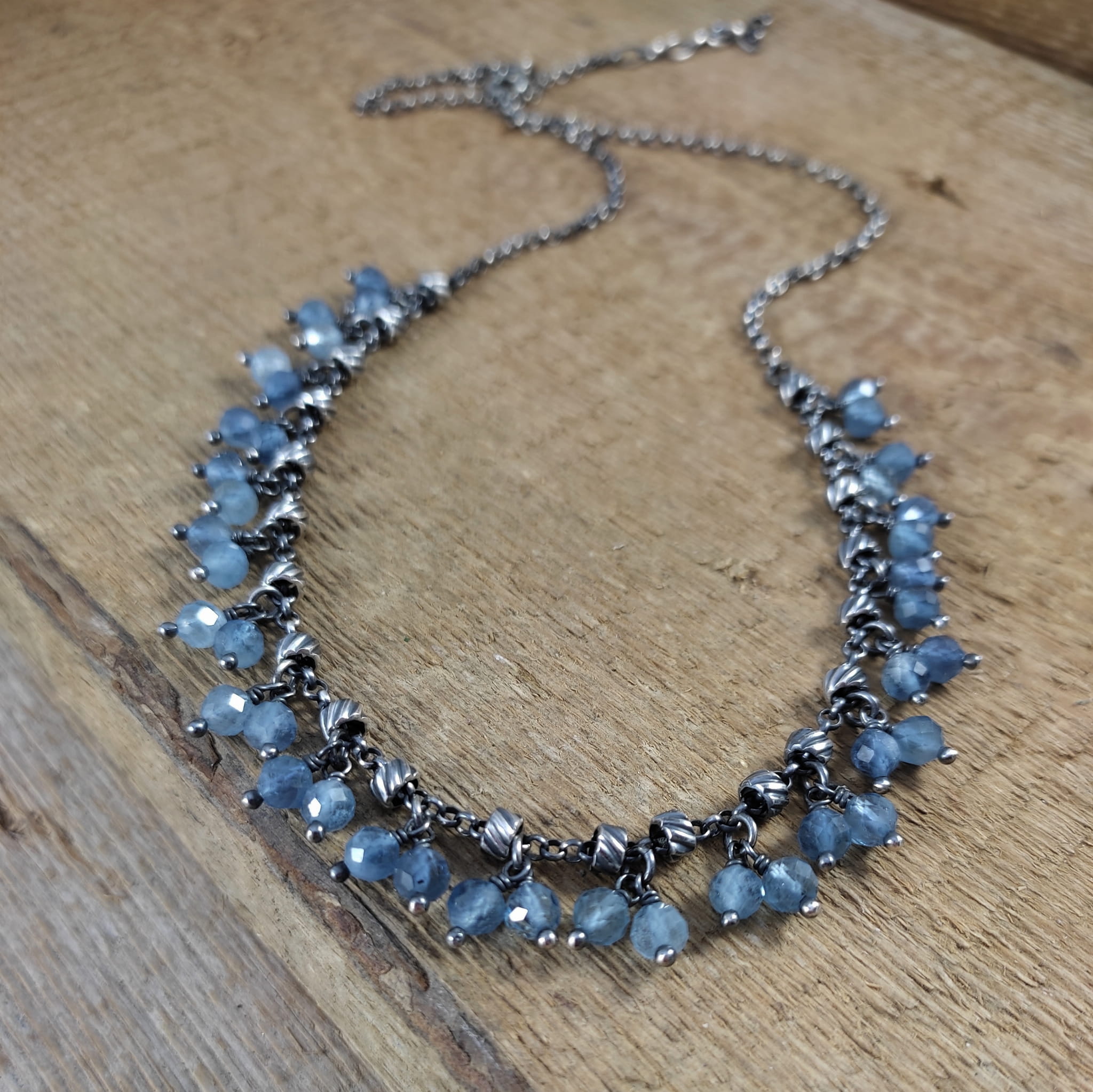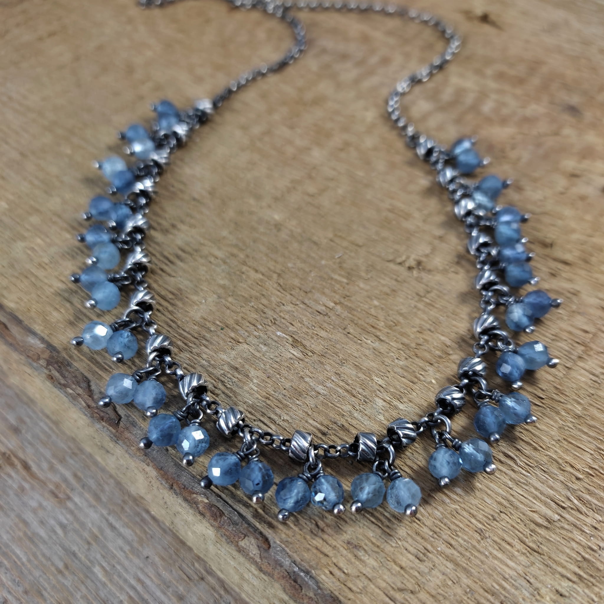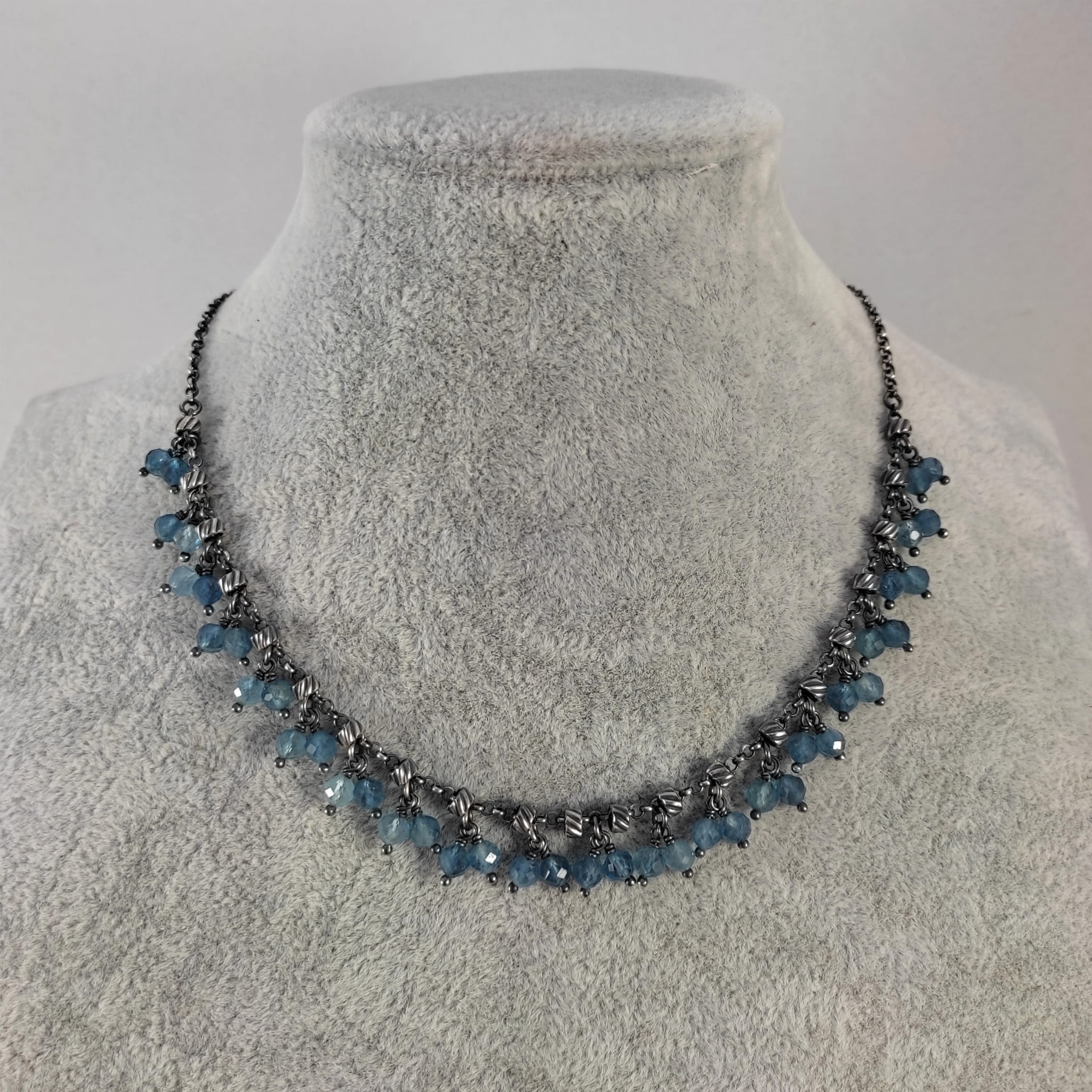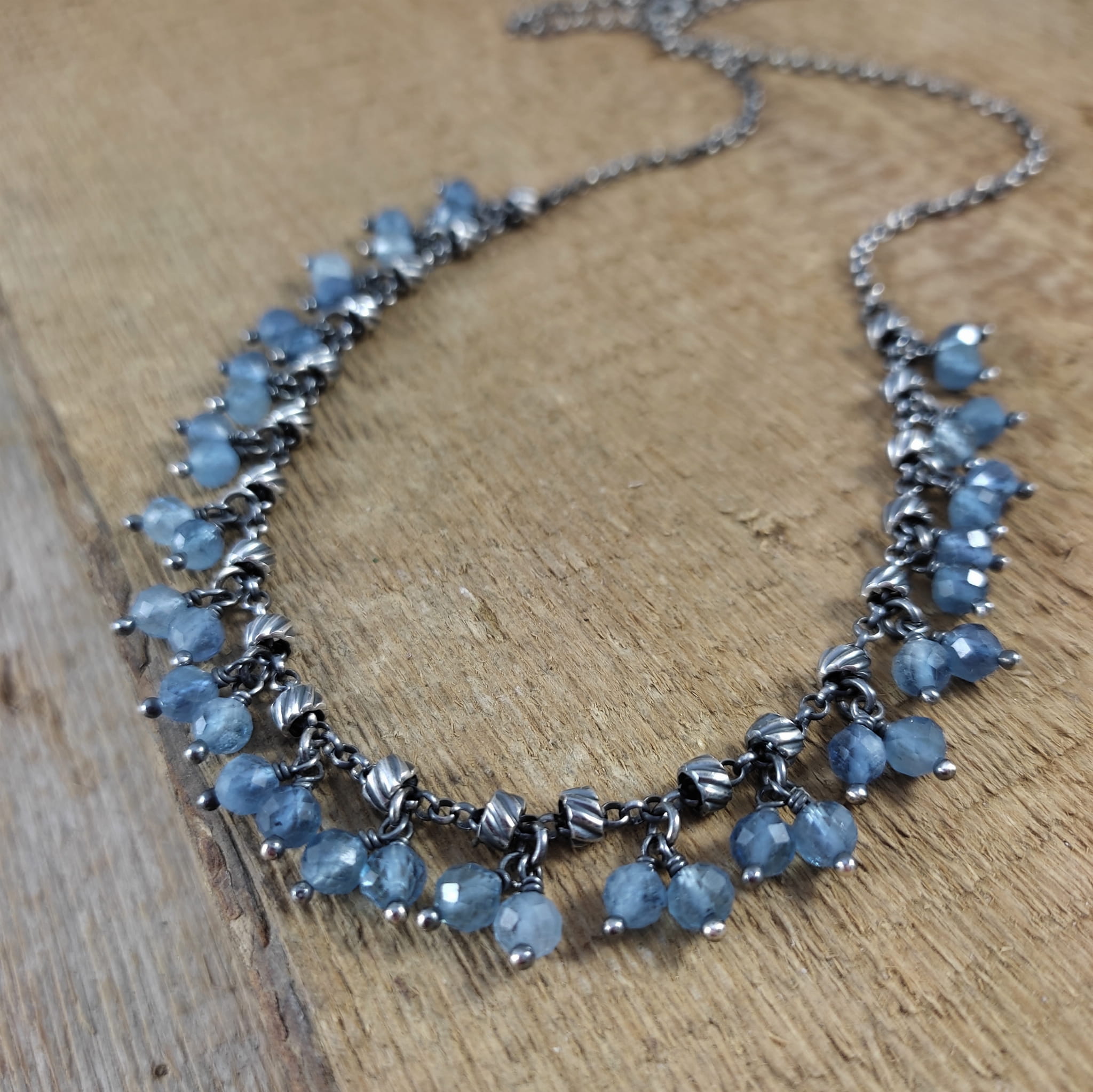 Naszyjnik wykonany z fasetowanych kul akwamarynu 4.5 mm. Całość dopełniona srebrem 925, oksydowanym i wypolerowanym.
