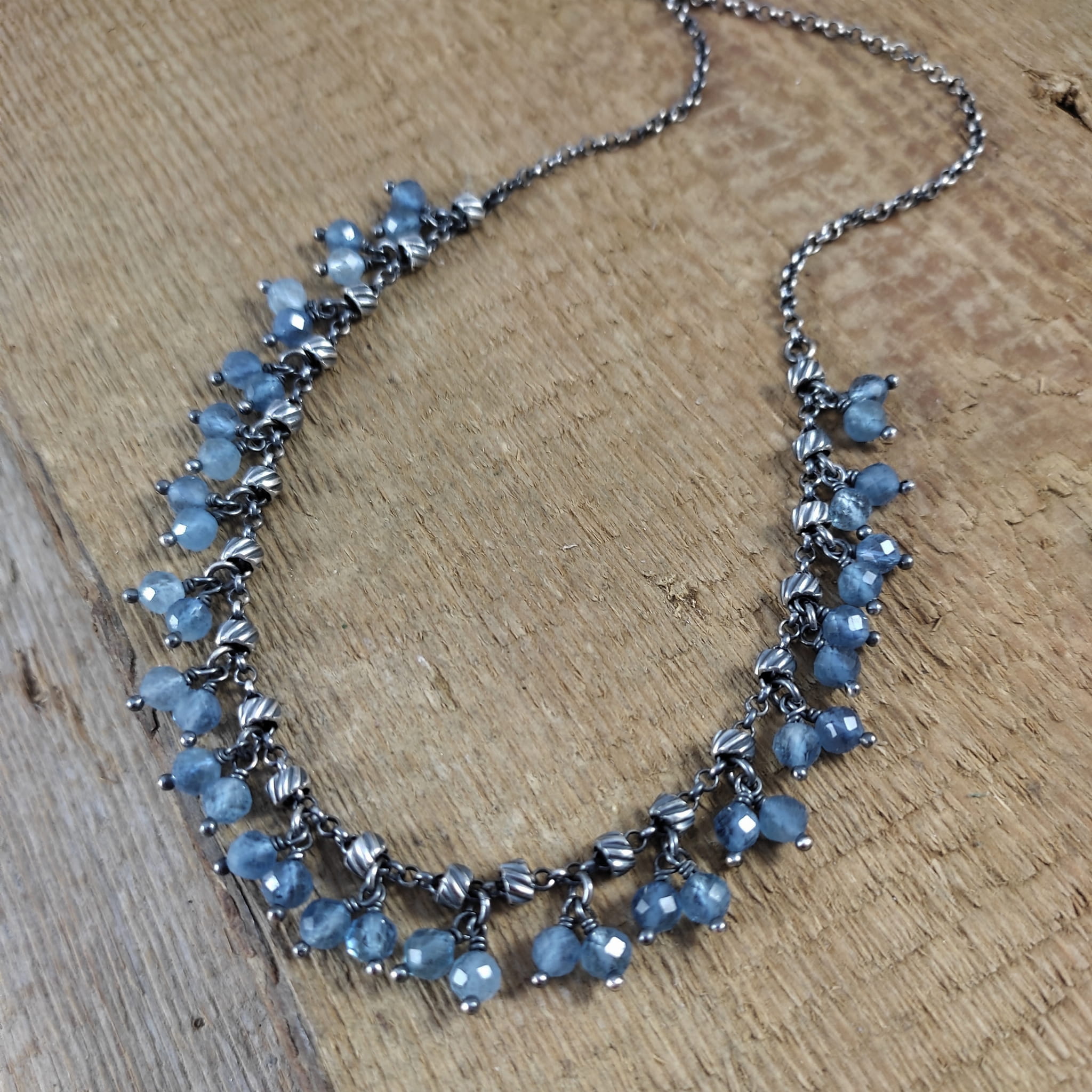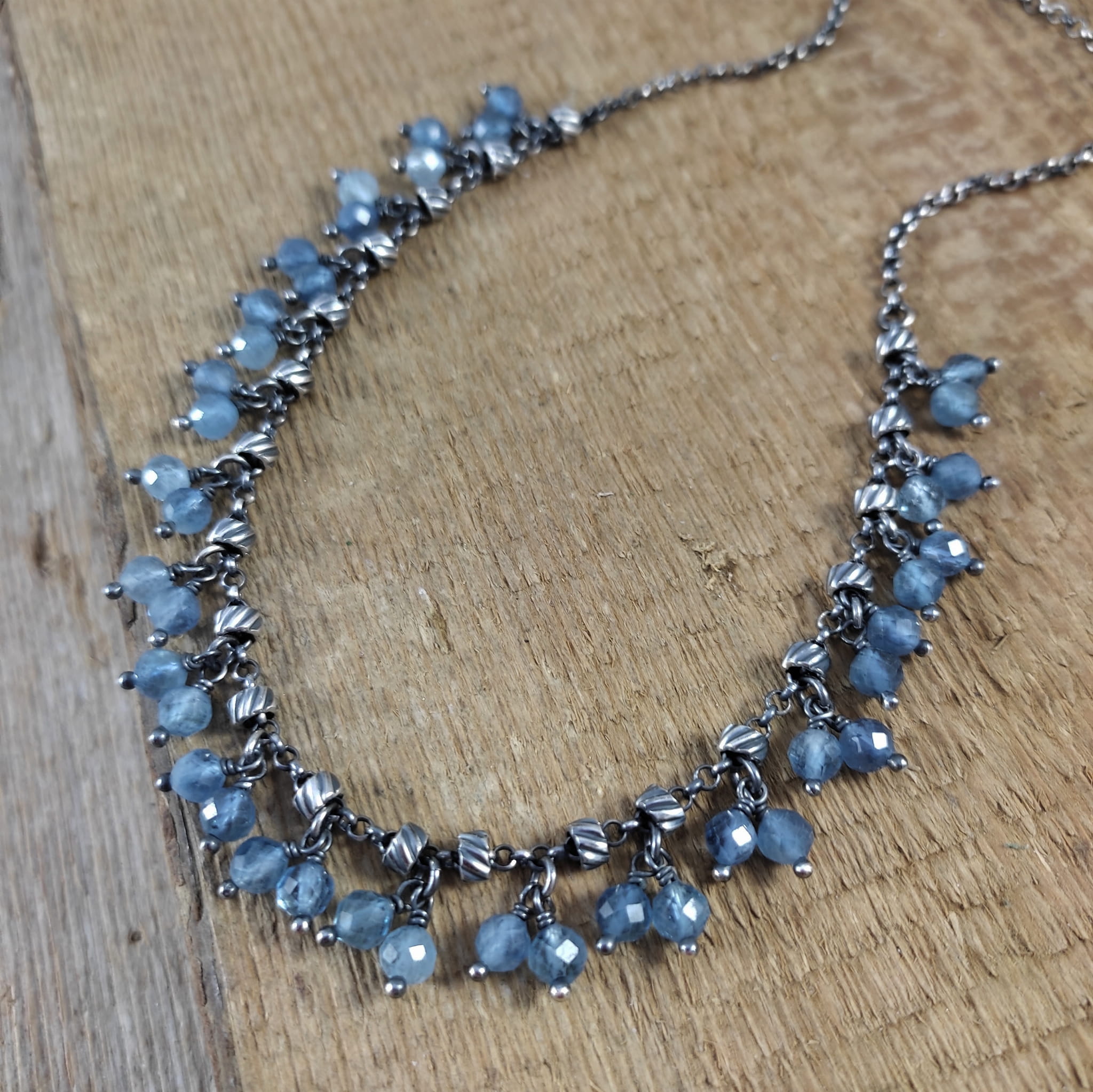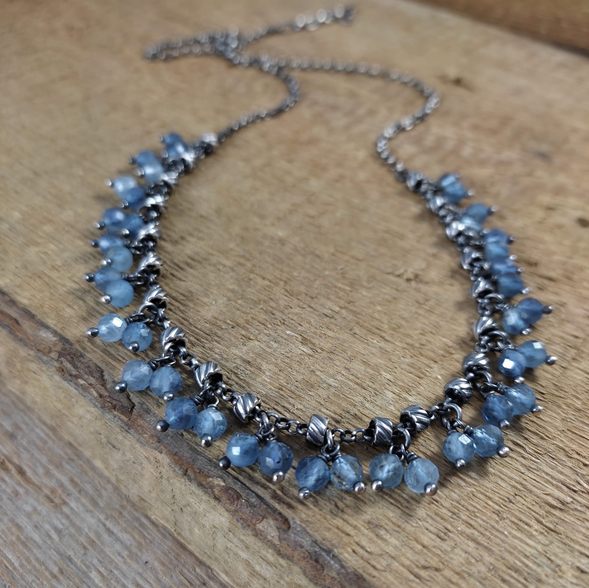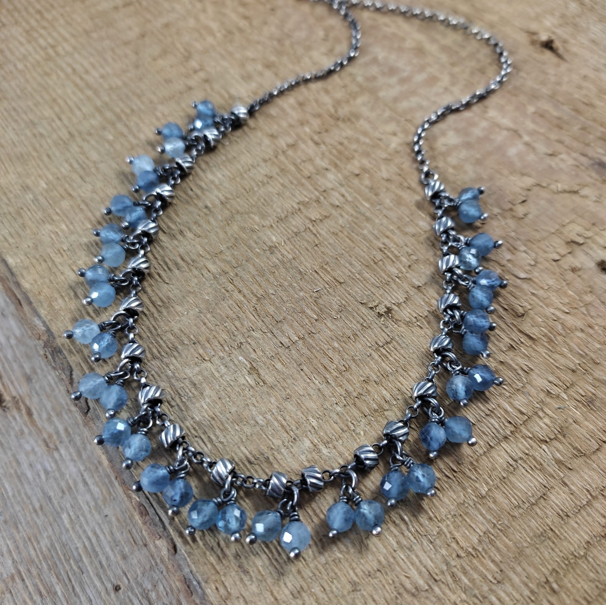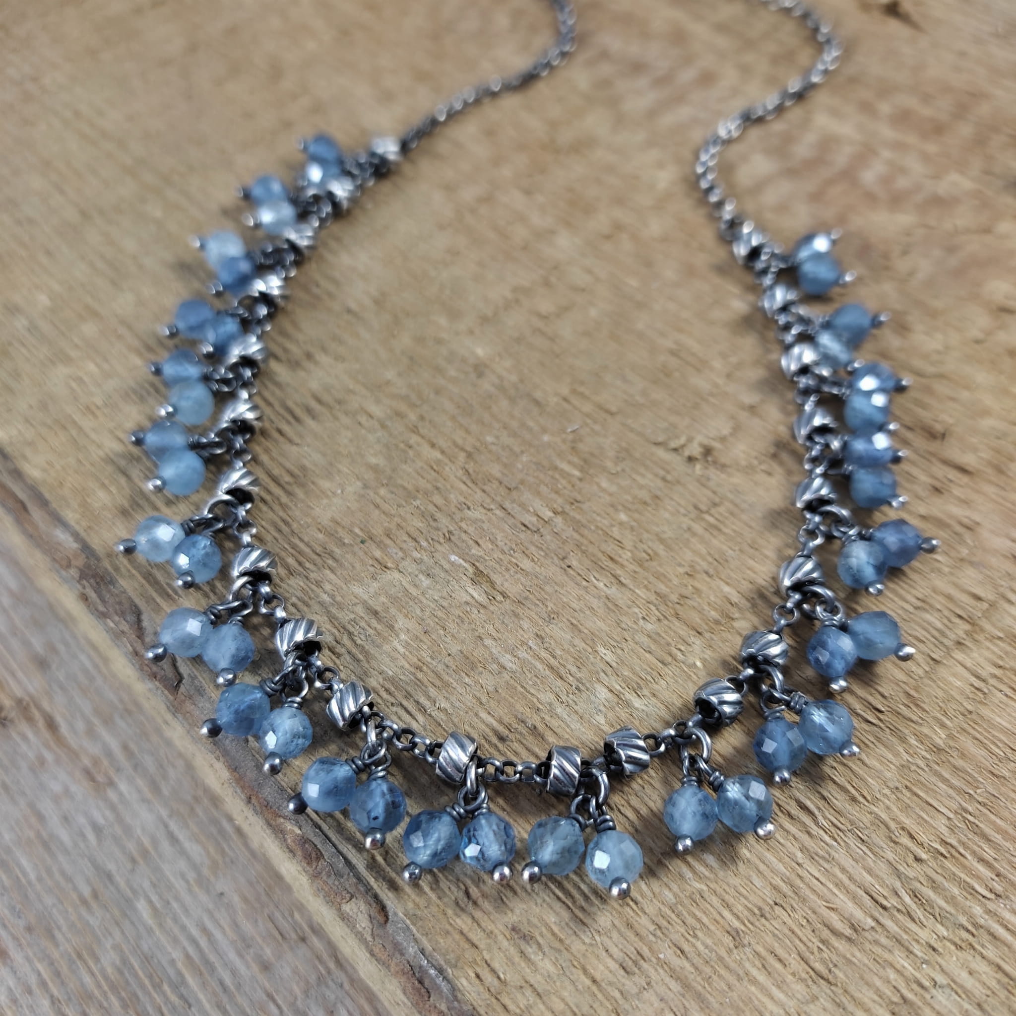 Naszyjnik wykonany z fasetowanych kul akwamarynu 4.5 mm. Całość dopełniona srebrem 925, oksydowanym i wypolerowanym.