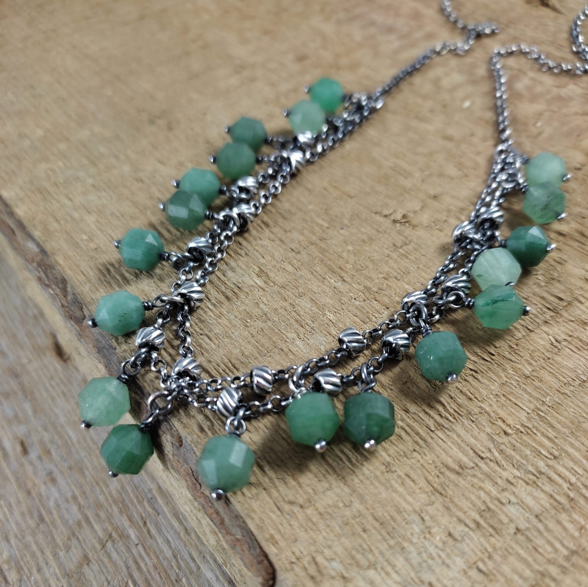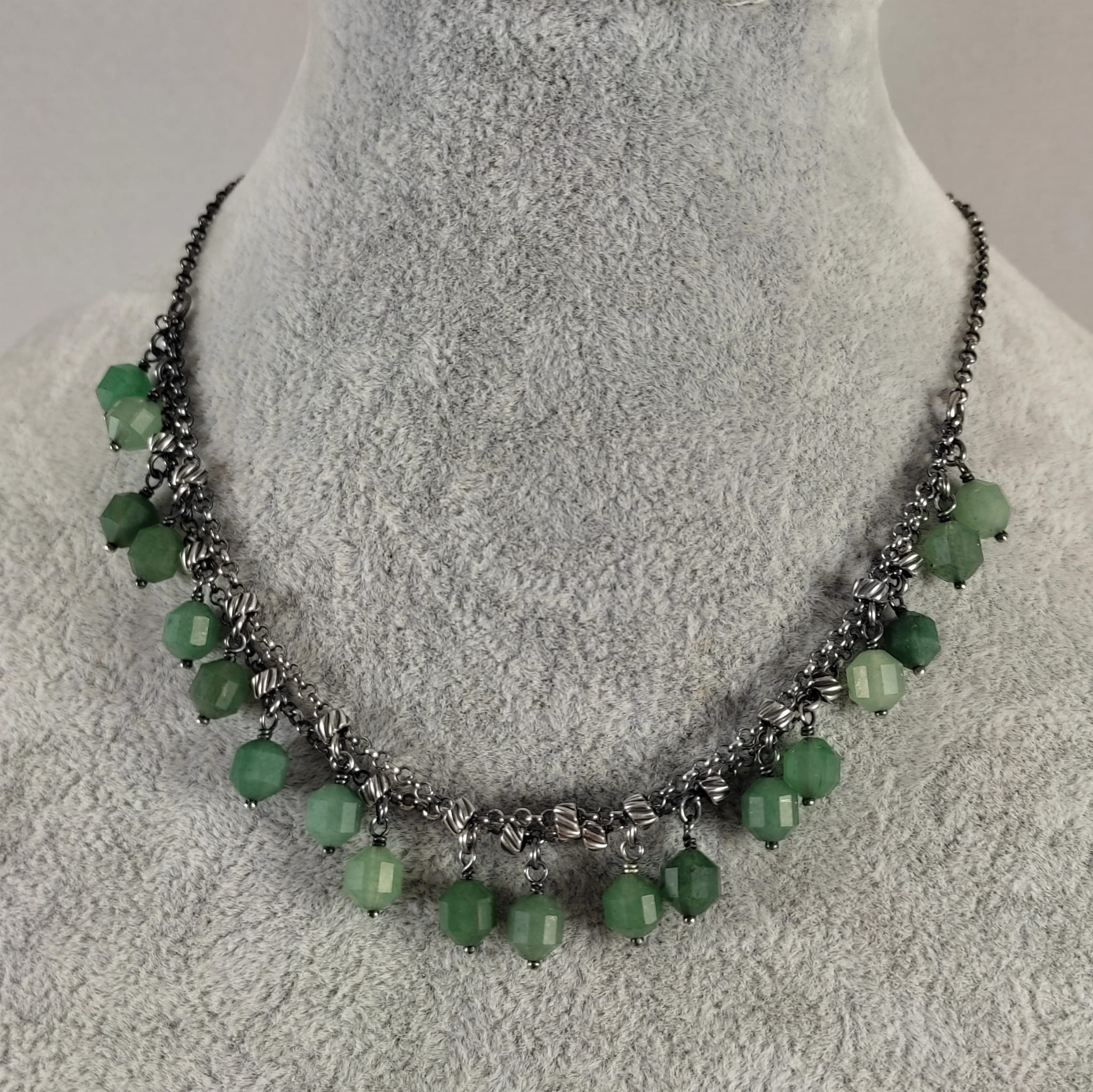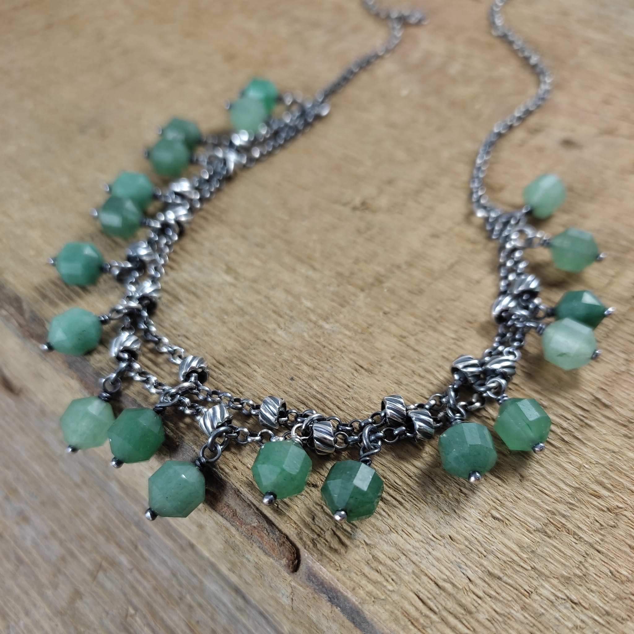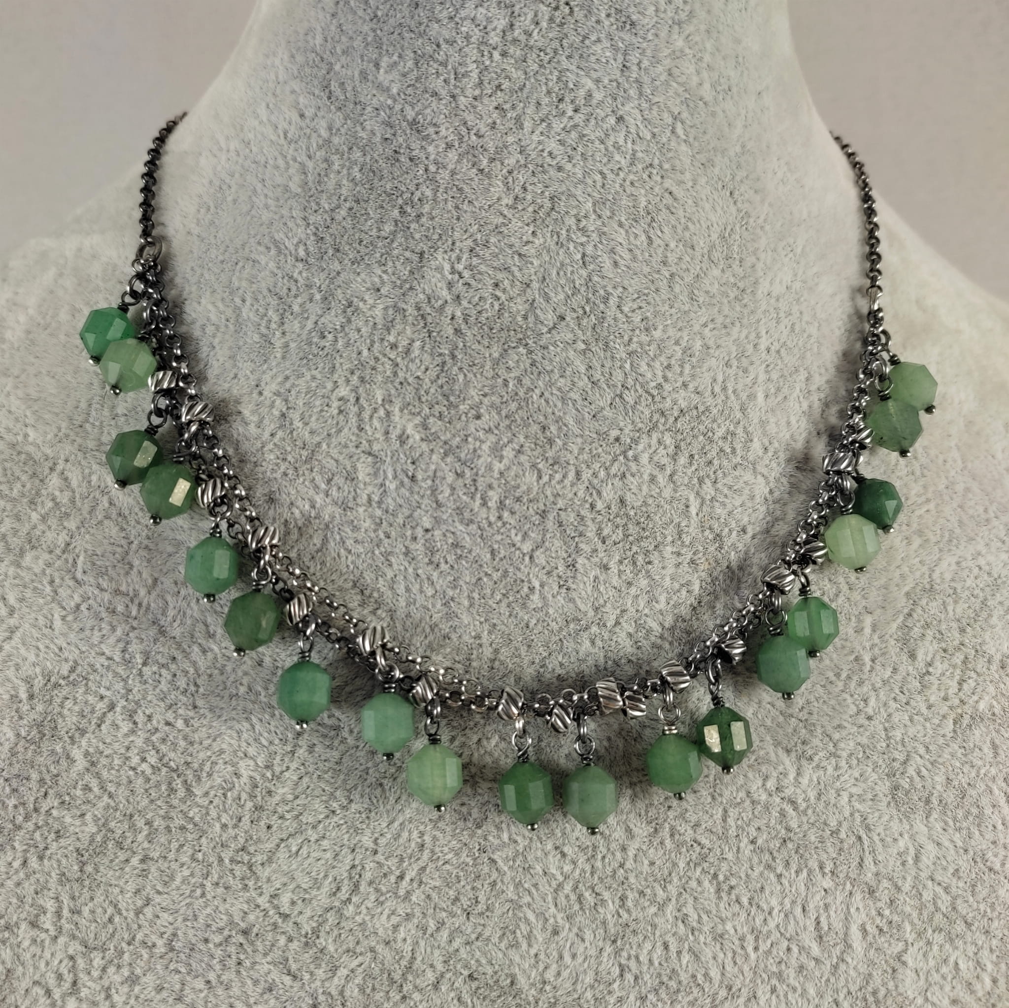 Naszyjnik wykonany z fasetowanych bryłek awenturynu ok. 6,5/8 mm. Całość wykończona w srebrze 925, oksydowanym i wypolerowanym. Długość naszyjnika wynosi ok. 40/45/50 cm, plus łańcuszek regulacyjny 5 cm. (Proszę wpisać w komentarzu, w przypadku braku wysyłamy 45 cm).