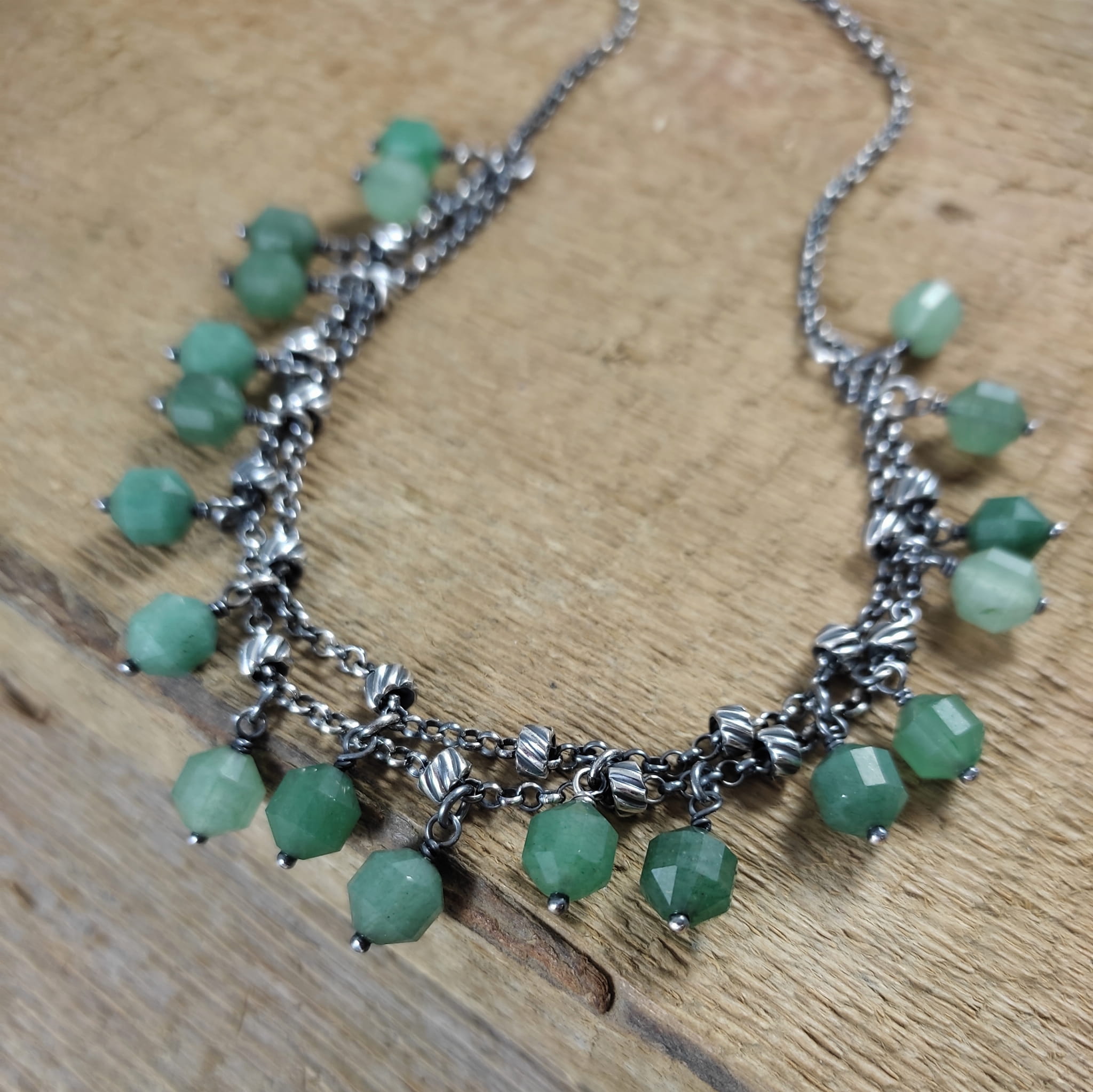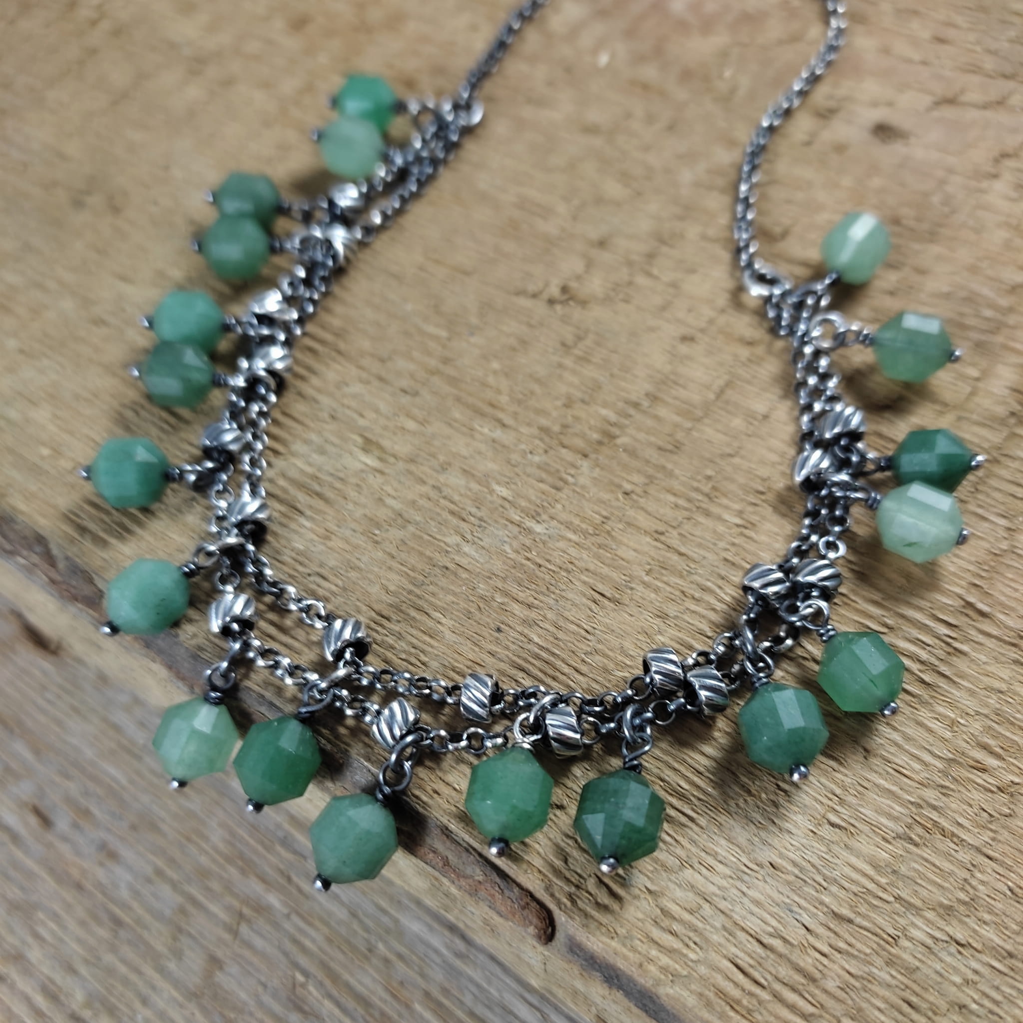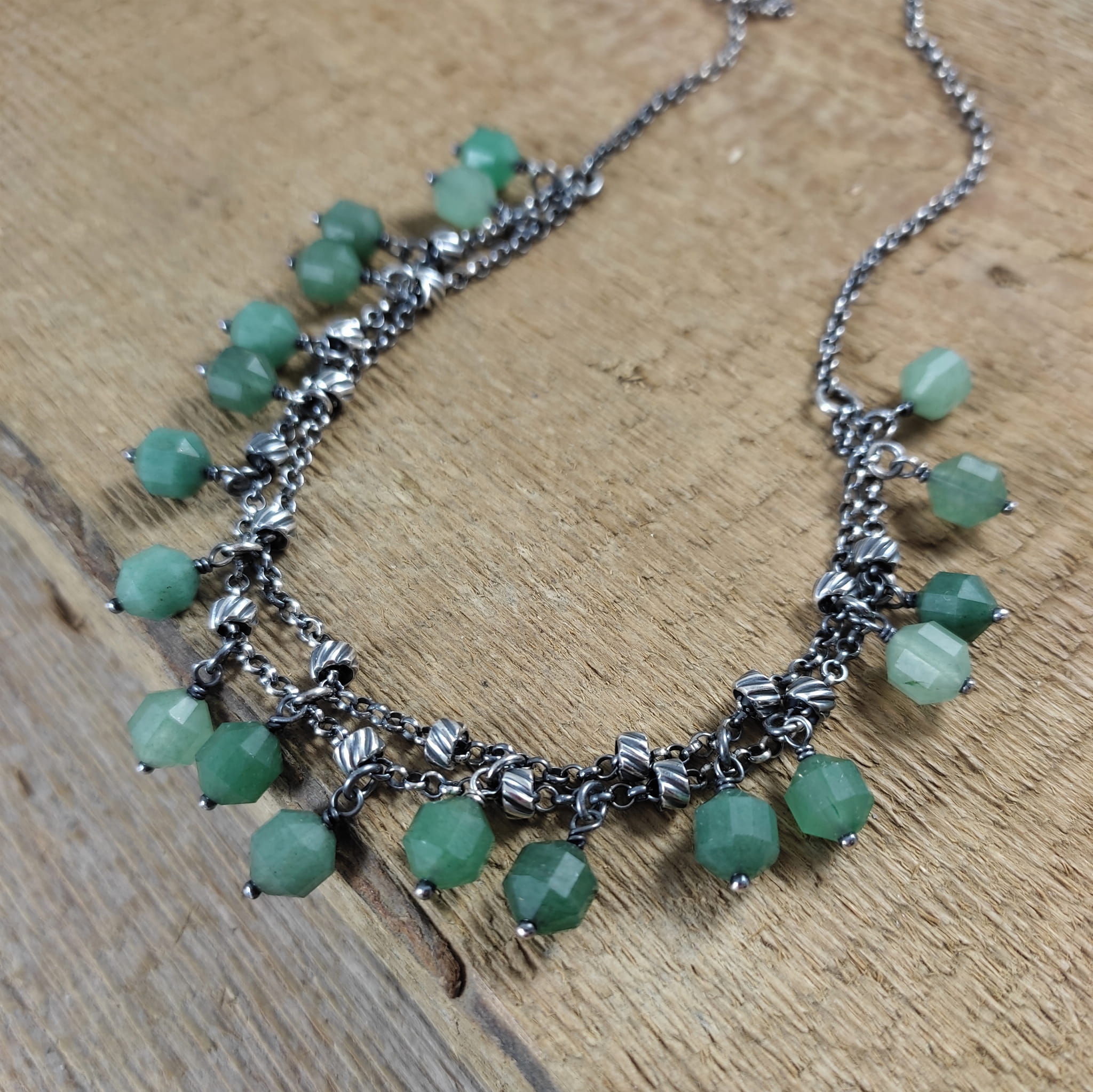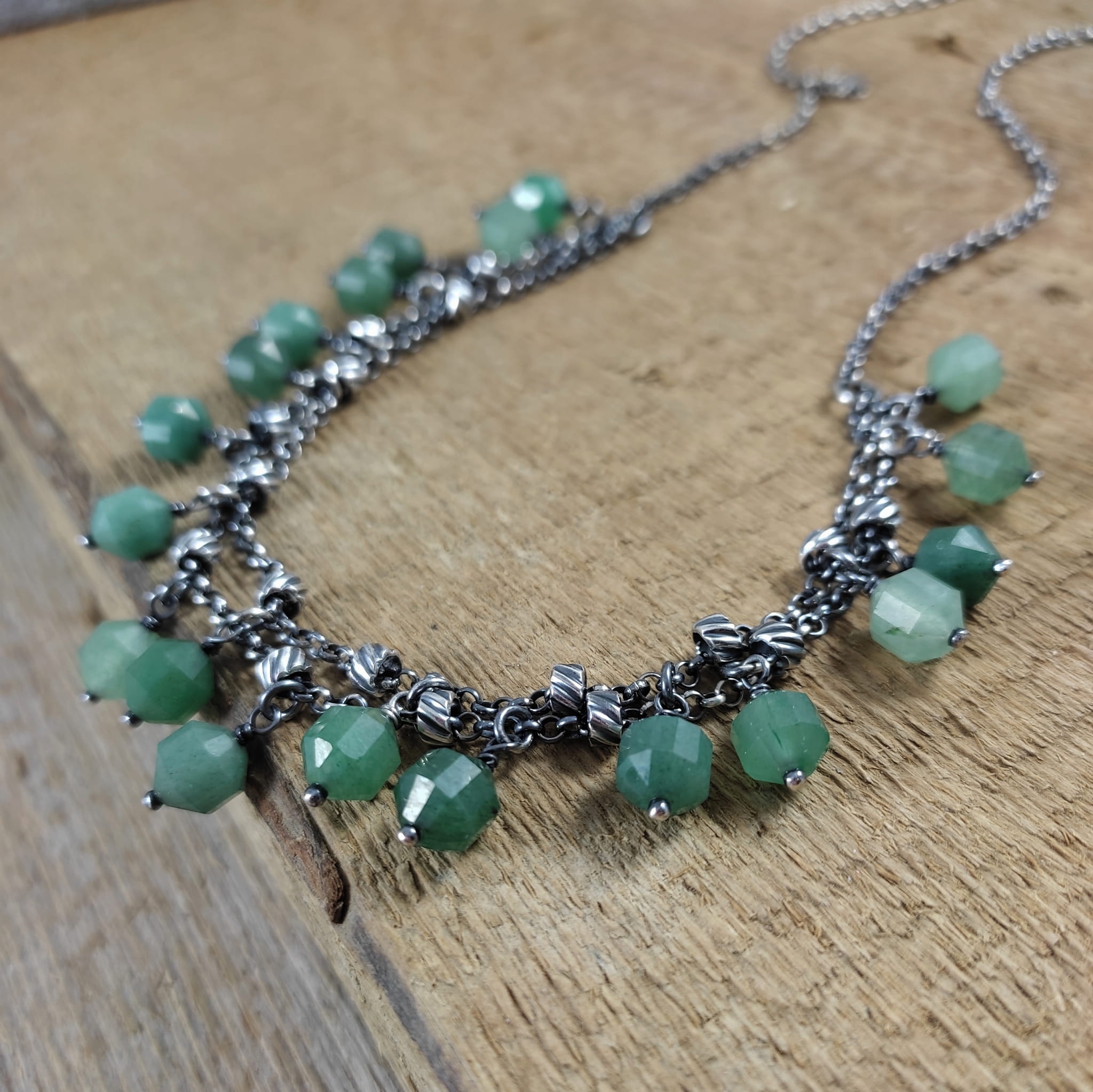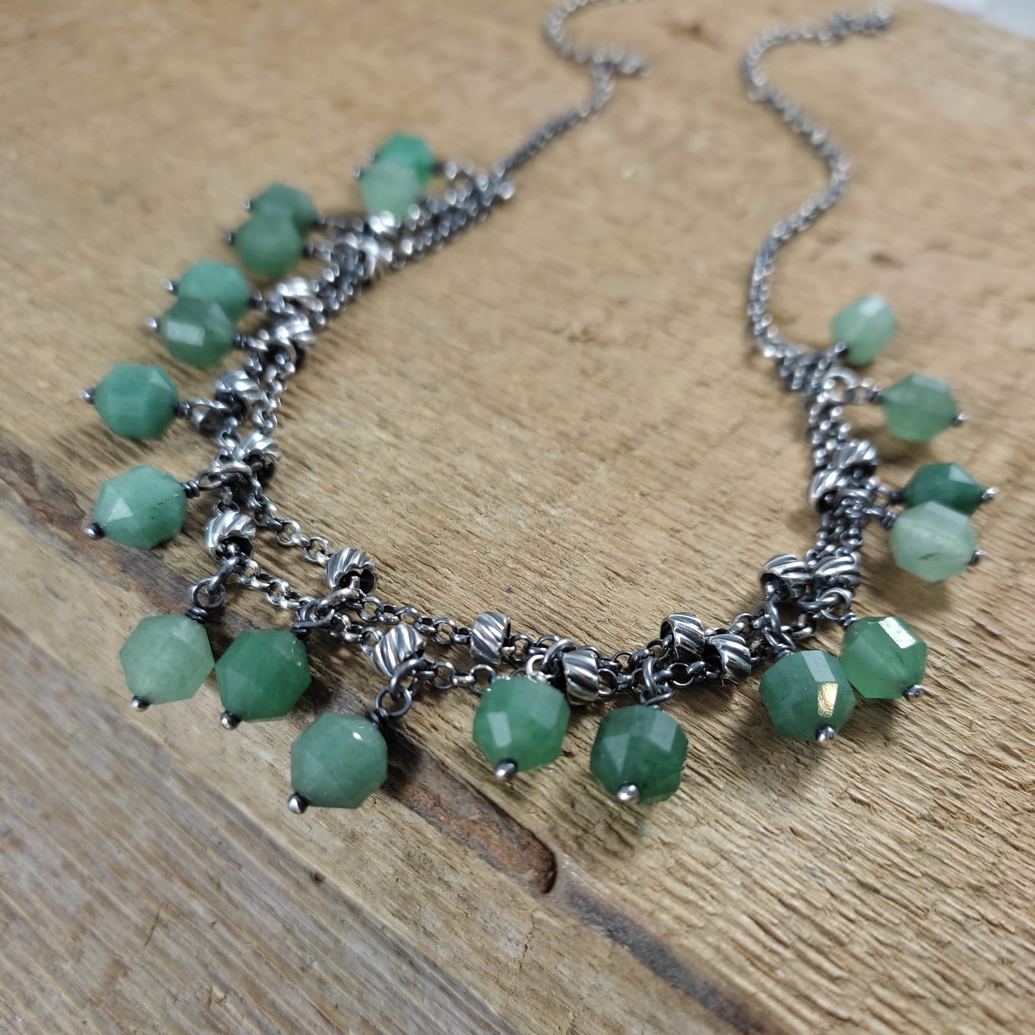 Naszyjnik wykonany z fasetowanych bryłek awenturynu ok. 6,5/8 mm. Całość wykończona w srebrze 925, oksydowanym i wypolerowanym. Długość naszyjnika wynosi ok. 40/45/50 cm, plus łańcuszek regulacyjny 5 cm. (Proszę wpisać w komentarzu, w przypadku braku wysyłamy 45 cm).