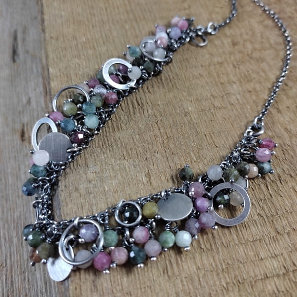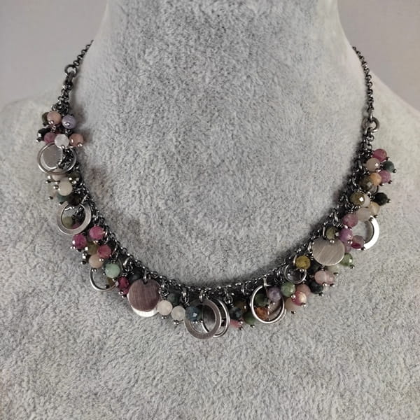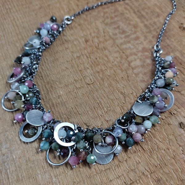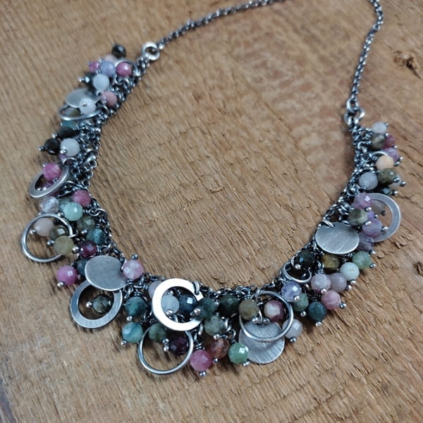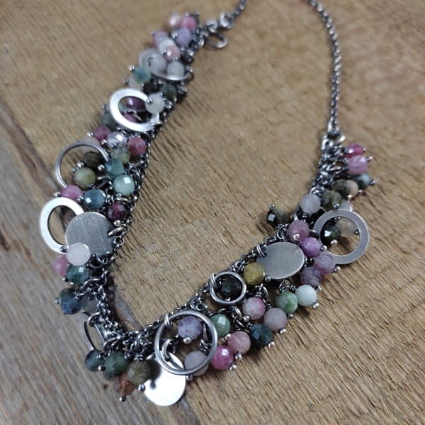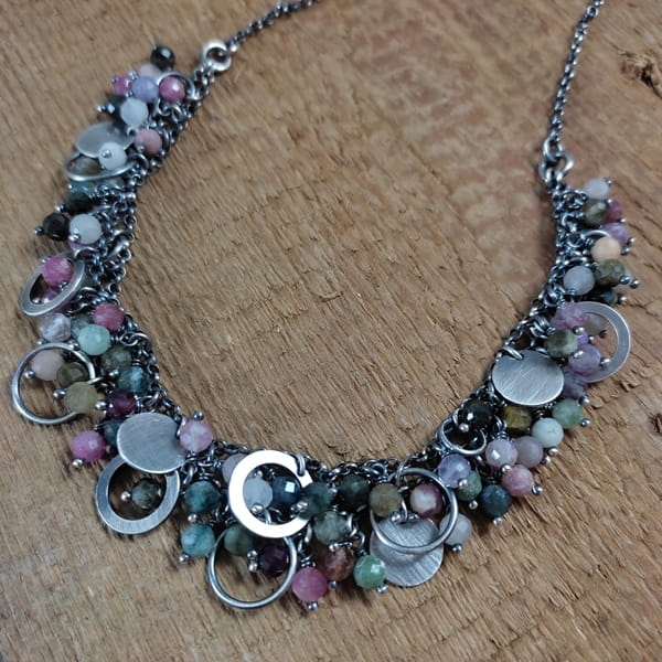 Naszyjnik wykonany z fasetowanych kul turmalinu 5 mm. Całość dopełniona srebrem 925, oksydowanym i wypolerowanym.
